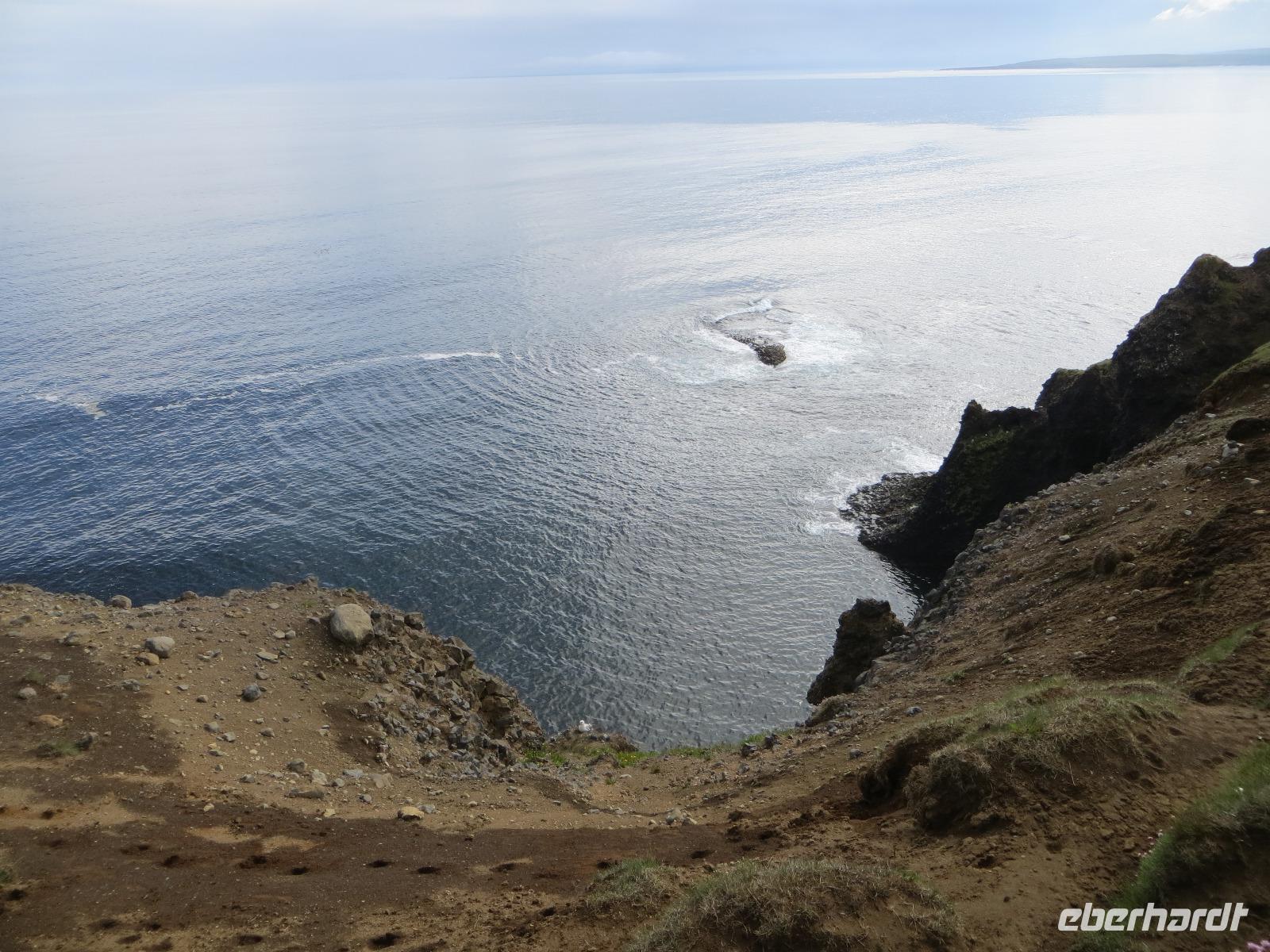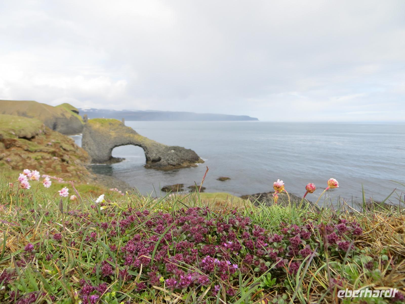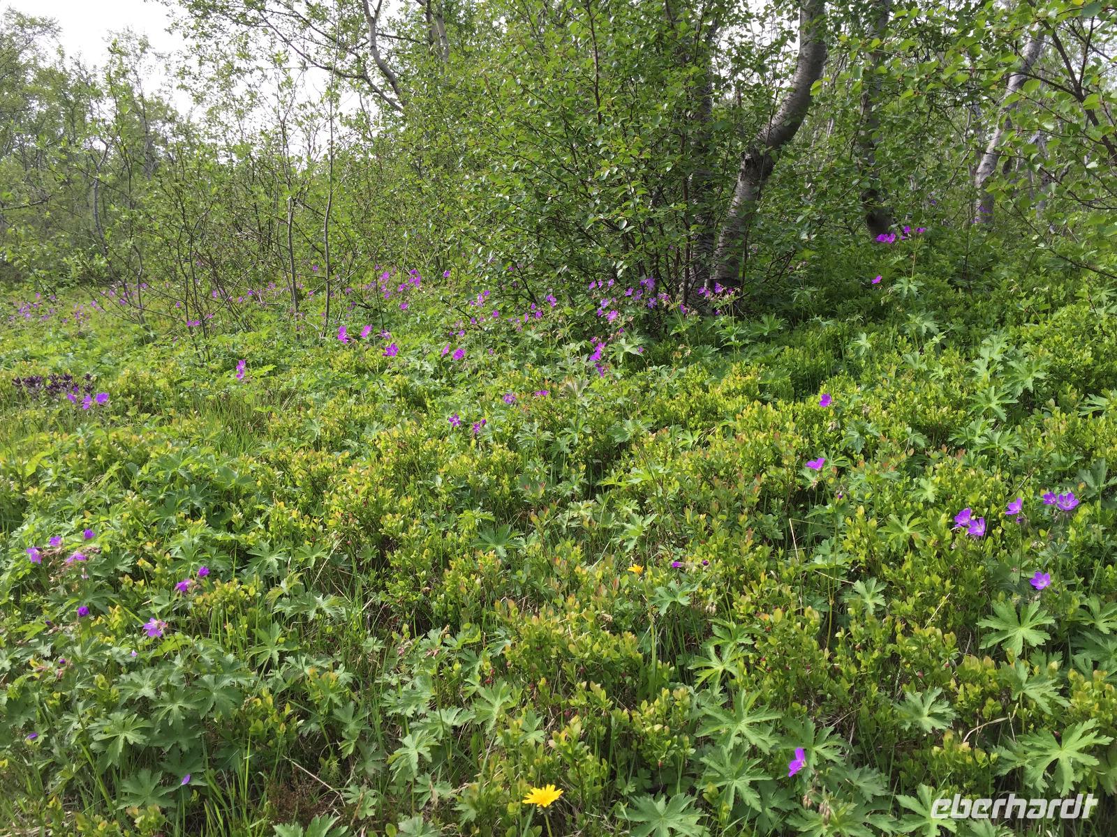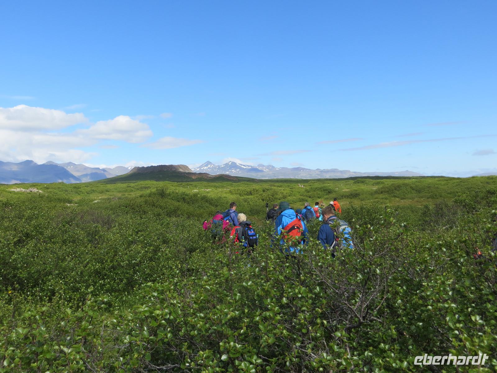 Am frühen Morgen fahren wir nach Husavik, In Europas Hauptstadt für Walbeobachtungen möchten auch wir die Chance ergreifen, die imposanten Meerestiere zu sehen. So besteigen wir unser restauriertes, traditionelles Fischerboot aus Eichenholz namens „Bjössi Sör" , werden warm eingekleidet und starten. Bald wird Husavik hinter uns immer kleiner und die in der Bucht gegenüberliegenden über 1.000 m hohen Kinn-Berge immer höher. Wir werden in die Positionsbestimmung eingewiesen, gesichtete Wale werden in Uhrzeiten angesagt und schnell haben wir das Prinzip verinnerlicht, als der erste Ruf des Skippers erschallt: 1 Uhr. Es wird spannend und wir haben wirklich Glück, sehen wir doch etliche Buckel- und Zwergwale (auch in Gruppen) und einen Schweinswal. Glücklich machen wir usn auf die Rückfahrt nach Husavik und werden noch mit einem heißen Kakao und einer leckeren Zimtschnecke an Bord verwöhnt. Nach unserer Ankunft bummeln wir noch etwas durch den Ort und fahren dann weiter entlang der Halbinsel Tjörnes. Unterwegs sehen wir bei einem Fotostopp unsere ersten Papageientaucher. Es gibt sie wirklich ... nicht nur als Plüschtiere :-) Unser nächstes Ziel ist das Besucherzentrum, von wo wir aus, nach einer kurzen Besichtigung, unsere Wanderung zur hufeisenförmigen Schlucht Asbyrgi starten. Wir wandern unterhalb der steil aufragenden Basaltwände und genießen besonders die Pflanzenwelt mit Teppichen aus Frauenmantel, Storchschnabel, Blaubeeren und auch einigen Orchideen können wir entdecken. Dann kommen wir zum Ende der Schlucht mit einem kleinen See und einem Wasserfall OHNE Wasser. Auch das gibt es in Island. Dieses Phänomen wird ab sofort von uns „Haraldfoss" genannt. Wir genießen hier ein Weilchen die Natur und lauschen wiedermal der Sagenwelt, denn der Legende nach soll das achtbeinige Pferd Odins hier auf der Erde so aufgetreten sein, dass sich dieses hufeisenförmige Tal gebildet hat. Danach geht es zu unserem heutigen Übernachtungsort Raufarhöfn, von hier aus sind es nur noch ca. 15 km bis zum nördlichsten Punkt auf dem Festland. Mit ca. 150 Einwohnern ist es das Dienstleistungszentrum für diese abgelegene Gegend und verfügt über Kirche, Kindergarten, Grundschule, Tankstelle, Bank, Islandpferde und unser einfaches Hotel. Am Abend, als wir zum Leuchtturm spazieren, treffen wir jedoch niemanden an. Es herrscht eine fast unheimliche Ruhe. Hier oben, fast am Polarkreis, erleben wir Mitte Juni nun auch das Phänomen, dass die Sonne gar nicht untergeht.