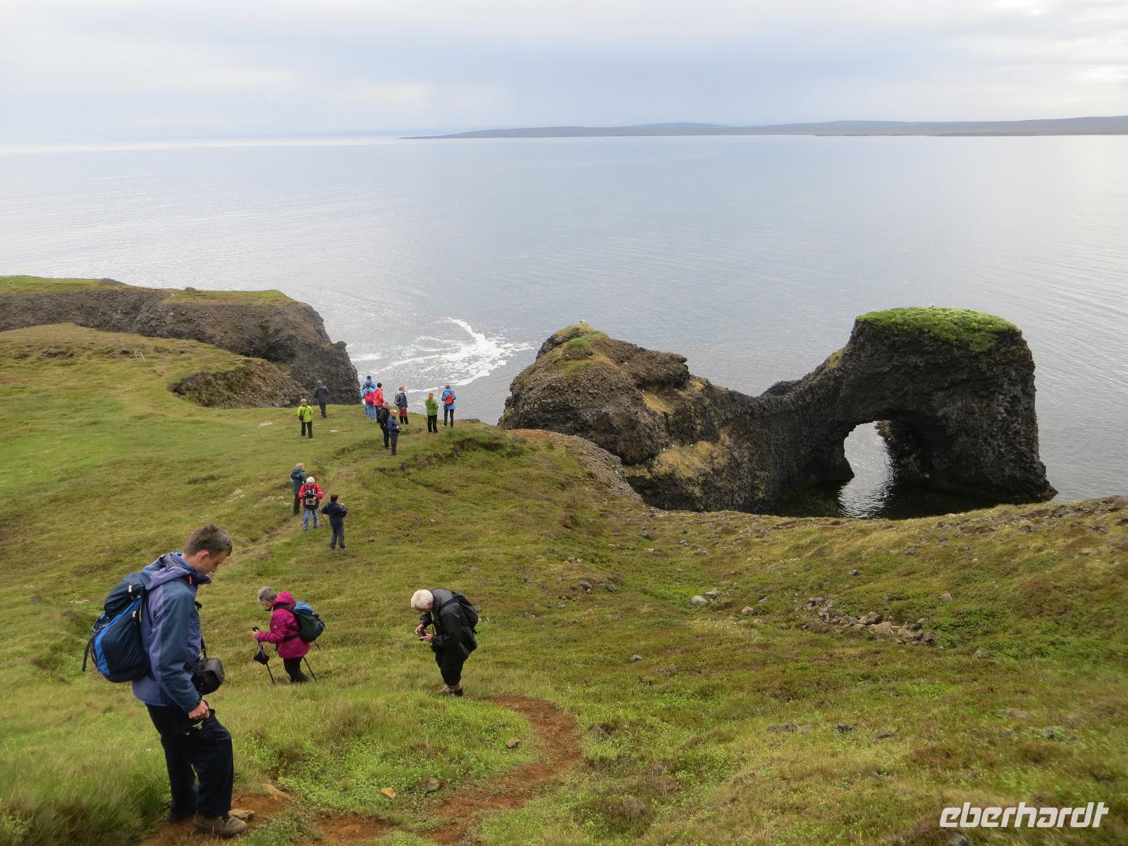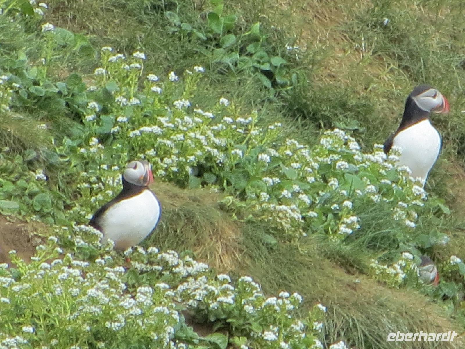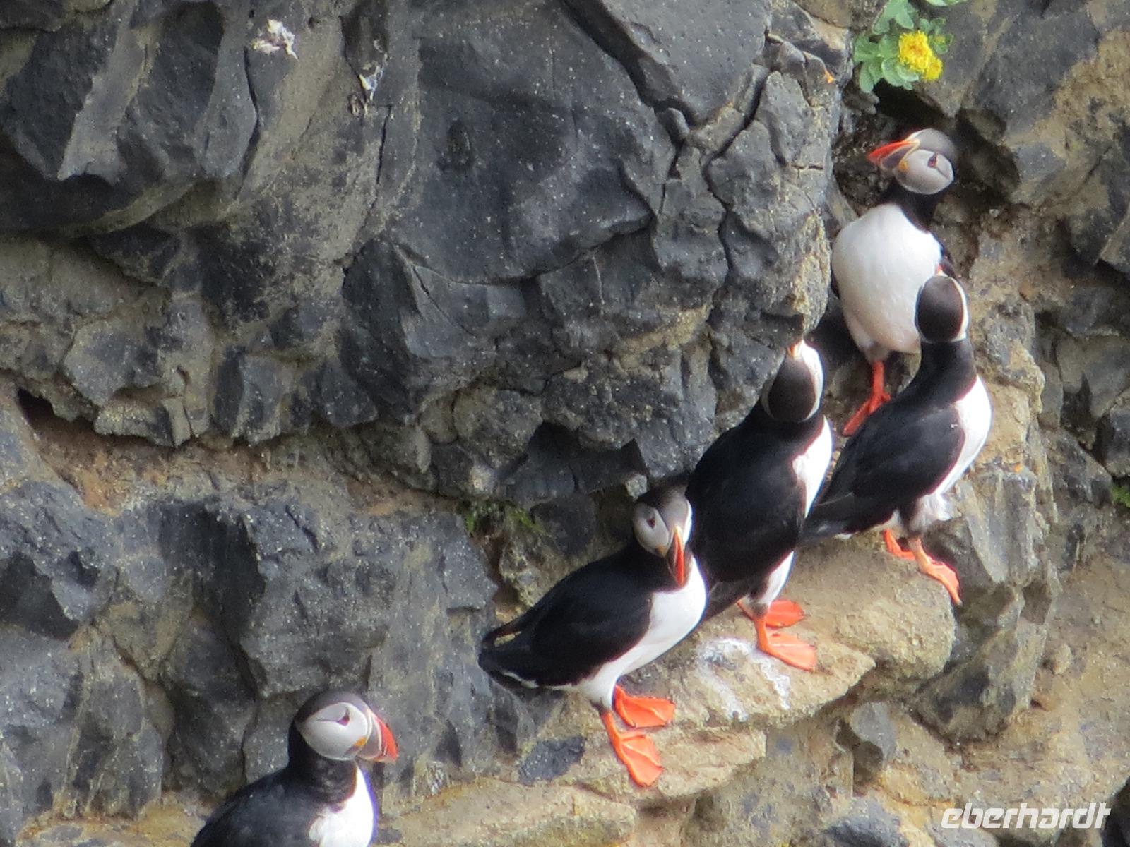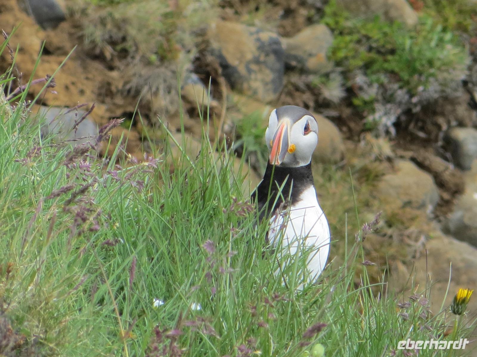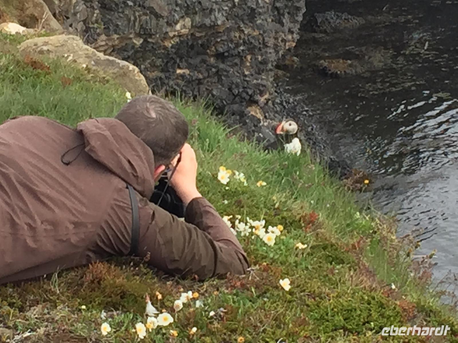 Nach dem Frühstück (liebe Mitreisende - Ihr erinnert Euch?) verlassen wir „unser Ende Islands" und gelangen nach Raudanes. Hier wandern wir entlang der Küste, die geprägt ist durch zahlreiche vulkanische Basaltsäulen, vom Meer ausgewaschene Höhlen und Torbögen. Unterwegs ist es soweit: eine ganze Kolonie der possierlichen Papageientaucher wartet auf uns auf den Klippen vor ihren Erdhöhlen. Harald robbt sich sogar bis auf einen Meter für DAS Foto an eines der Puffins ran. Wir machen unzählige Fotos und sind glücklich. Auf unserer weiteren Wanderung haben wir dann noch einmal das Glück und treffen eine weitere Kolonie an. Wir wandern mit langen Fotostopps fast 3,5 Stunden und genießen die skurillen Felsformationen und die Halbinsel Langanes. Anschließend fahren wir weiter und bis zu unseren nächsten Stopp in Vopnafjördur, wo wir in der Sonne in einem alten, aber wunderschön restaurierten, Kaufmannshaus Kaffeepause machen. Am späten Nachmittag erreichen wir unser Tagesziel Egilsstadir im Osten von Island. Wir übernachten heute im „Guesthouse Egilsstadir" direkt am See, das sehr geschmack- und liebevoll eingerichtet und dekoriert ist. Ein sehr leckeres Abendessen beendet unseren erlebnisreichen Tag.