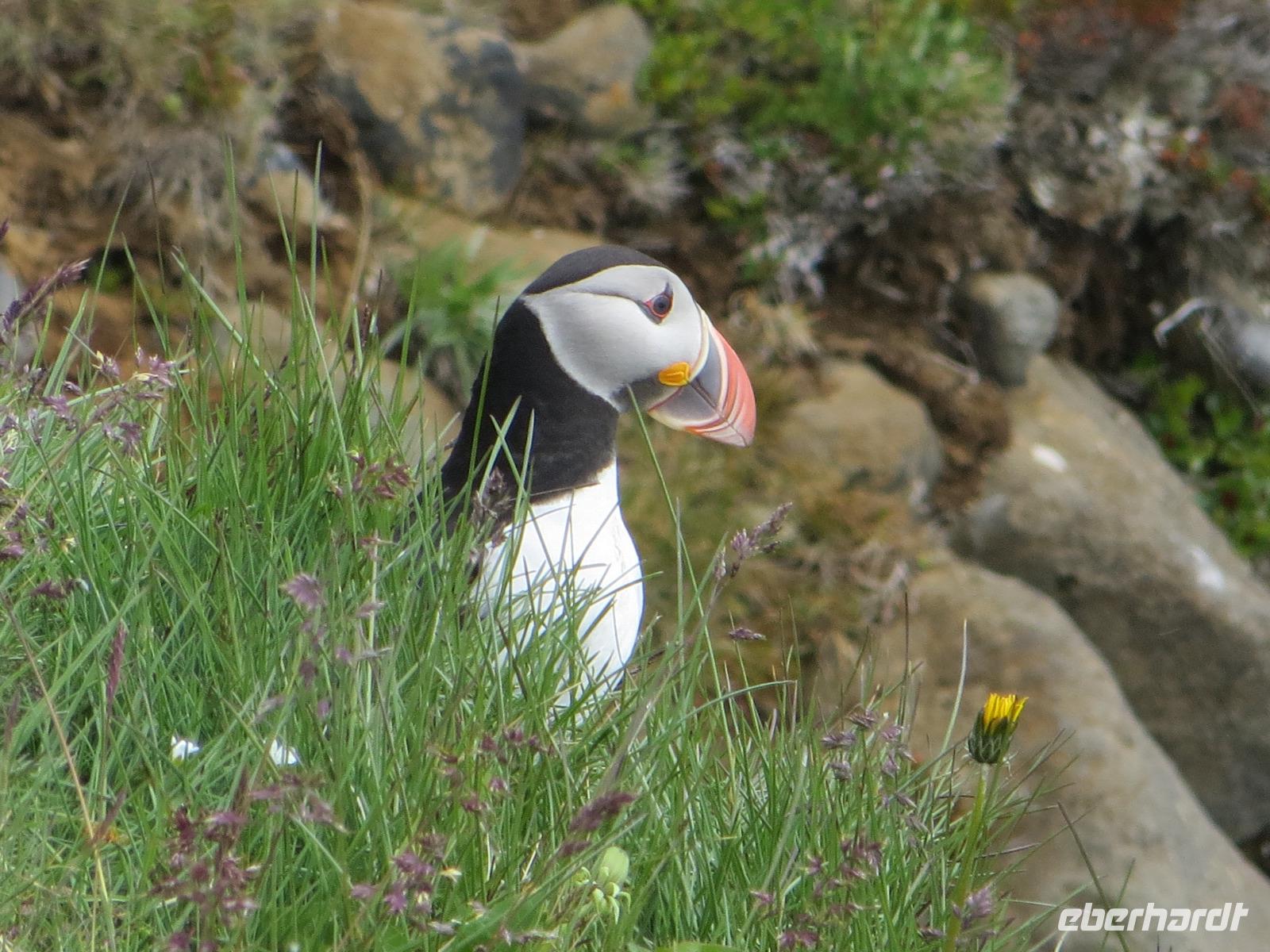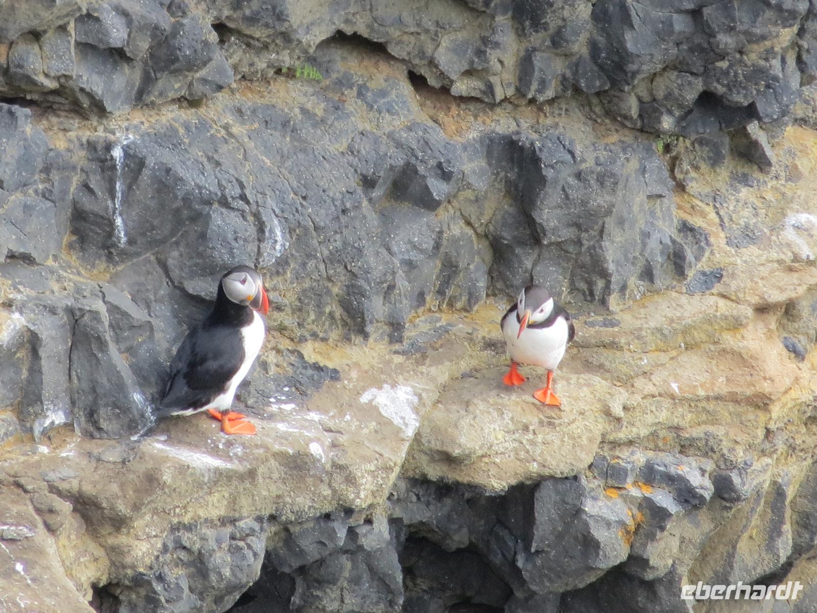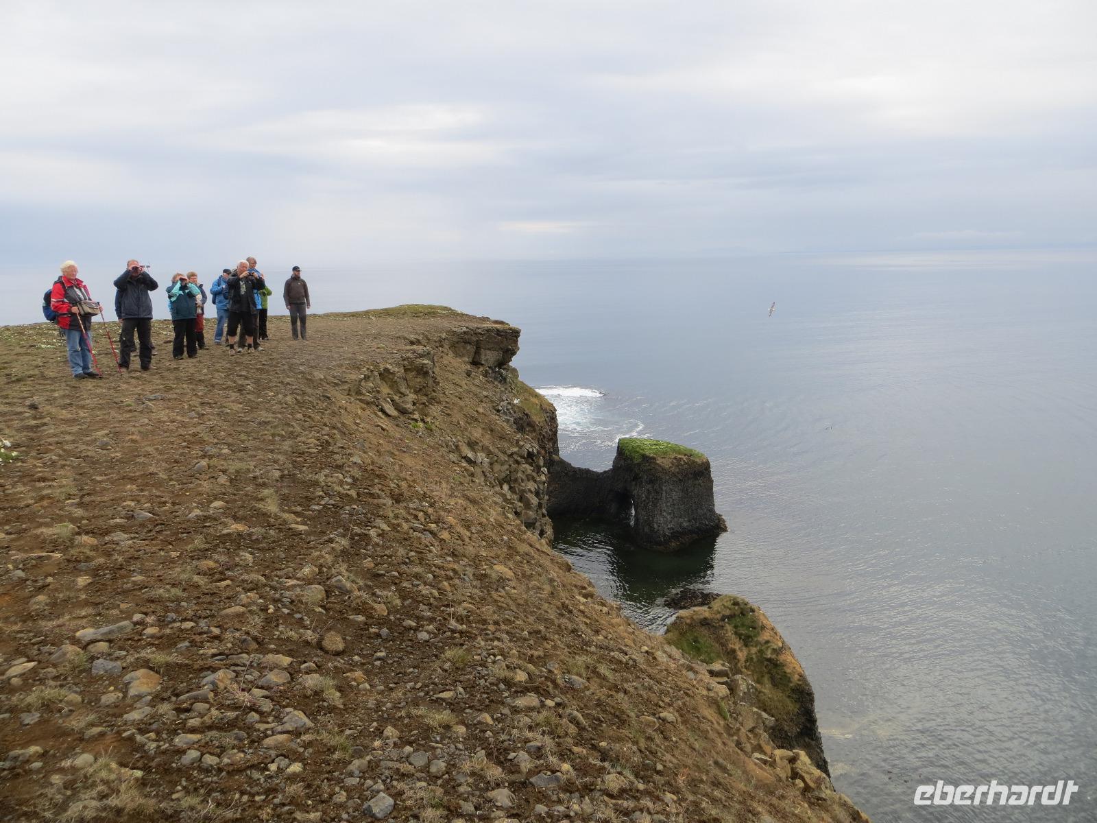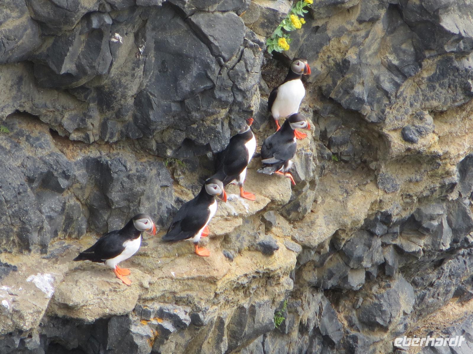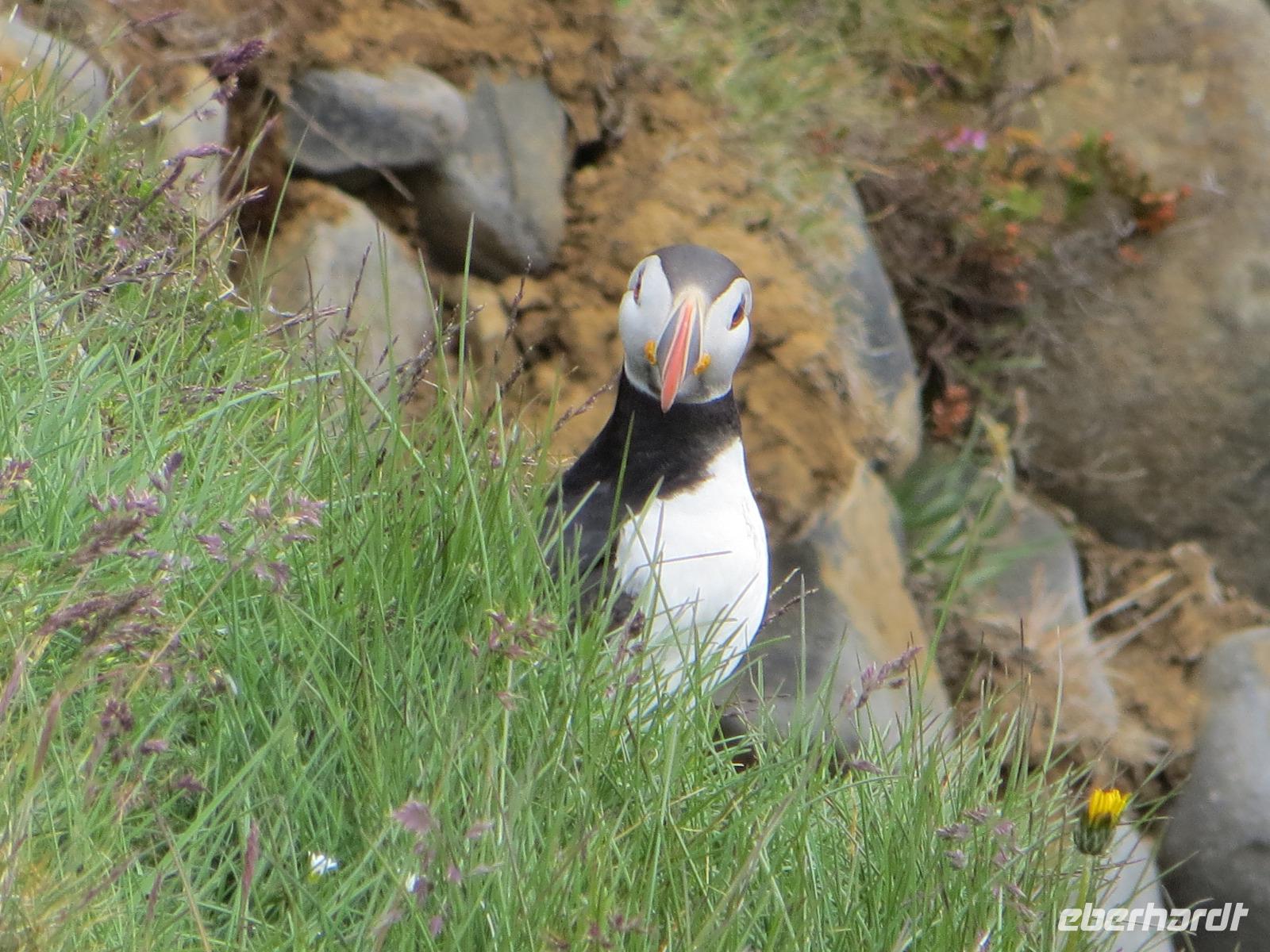 Nach dem Frühstück (liebe Mitreisende - Ihr erinnert Euch?) verlassen wir „unser Ende Islands" und gelangen nach Raudanes. Hier wandern wir entlang der Küste, die geprägt ist durch zahlreiche vulkanische Basaltsäulen, vom Meer ausgewaschene Höhlen und Torbögen. Unterwegs ist es soweit: eine ganze Kolonie der possierlichen Papageientaucher wartet auf uns auf den Klippen vor ihren Erdhöhlen. Harald robbt sich sogar bis auf einen Meter für DAS Foto an eines der Puffins ran. Wir machen unzählige Fotos und sind glücklich. Auf unserer weiteren Wanderung haben wir dann noch einmal das Glück und treffen eine weitere Kolonie an. Wir wandern mit langen Fotostopps fast 3,5 Stunden und genießen die skurillen Felsformationen und die Halbinsel Langanes. Anschließend fahren wir weiter und bis zu unseren nächsten Stopp in Vopnafjördur, wo wir in der Sonne in einem alten, aber wunderschön restaurierten, Kaufmannshaus Kaffeepause machen. Am späten Nachmittag erreichen wir unser Tagesziel Egilsstadir im Osten von Island. Wir übernachten heute im „Guesthouse Egilsstadir" direkt am See, das sehr geschmack- und liebevoll eingerichtet und dekoriert ist. Ein sehr leckeres Abendessen beendet unseren erlebnisreichen Tag.