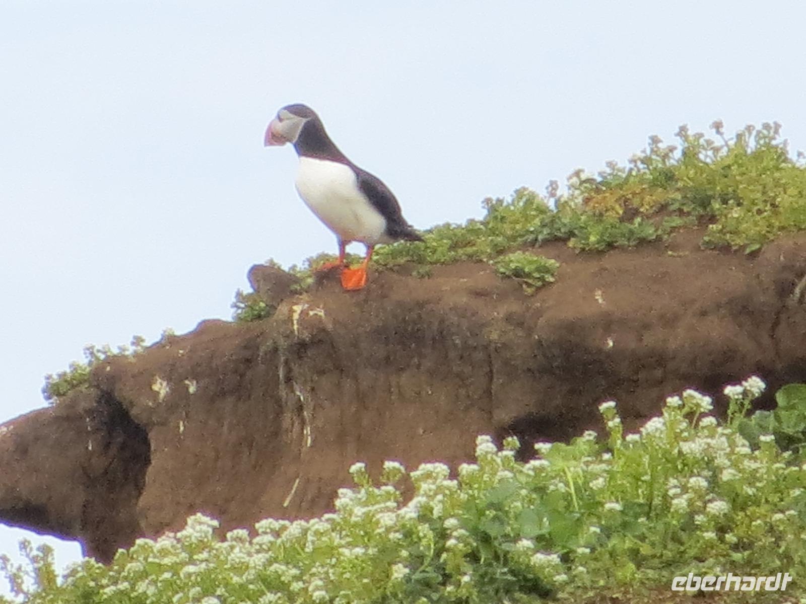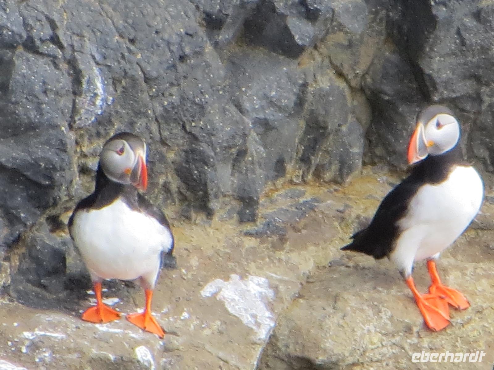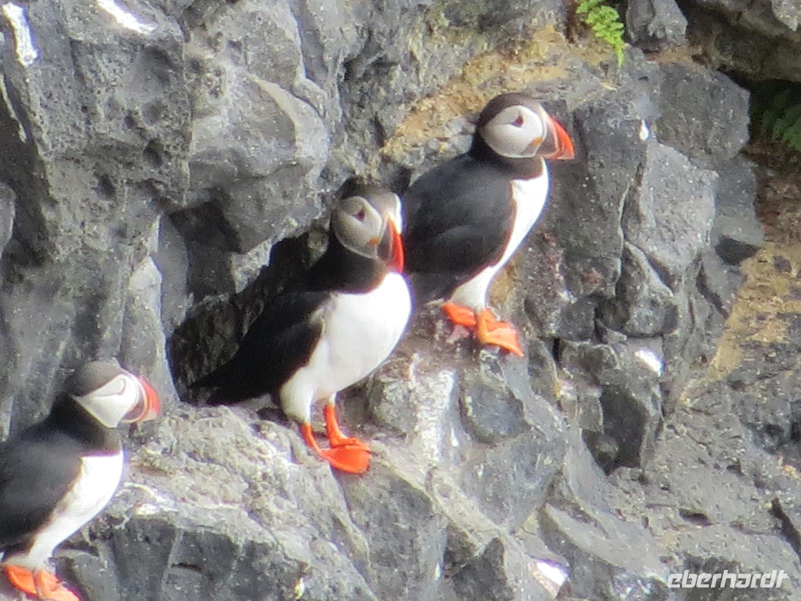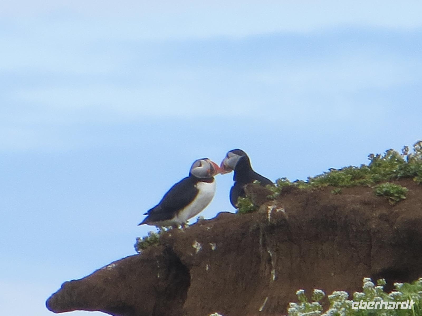 Nach dem Frühstück (liebe Mitreisende - Ihr erinnert Euch?) verlassen wir „unser Ende Islands" und gelangen nach Raudanes. Hier wandern wir entlang der Küste, die geprägt ist durch zahlreiche vulkanische Basaltsäulen, vom Meer ausgewaschene Höhlen und Torbögen. Unterwegs ist es soweit: eine ganze Kolonie der possierlichen Papageientaucher wartet auf uns auf den Klippen vor ihren Erdhöhlen. Harald robbt sich sogar bis auf einen Meter für DAS Foto an eines der Puffins ran. Wir machen unzählige Fotos und sind glücklich. Auf unserer weiteren Wanderung haben wir dann noch einmal das Glück und treffen eine weitere Kolonie an. Wir wandern mit langen Fotostopps fast 3,5 Stunden und genießen die skurillen Felsformationen und die Halbinsel Langanes. Anschließend fahren wir weiter und bis zu unseren nächsten Stopp in Vopnafjördur, wo wir in der Sonne in einem alten, aber wunderschön restaurierten, Kaufmannshaus Kaffeepause machen. Am späten Nachmittag erreichen wir unser Tagesziel Egilsstadir im Osten von Island. Wir übernachten heute im „Guesthouse Egilsstadir" direkt am See, das sehr geschmack- und liebevoll eingerichtet und dekoriert ist. Ein sehr leckeres Abendessen beendet unseren erlebnisreichen Tag.