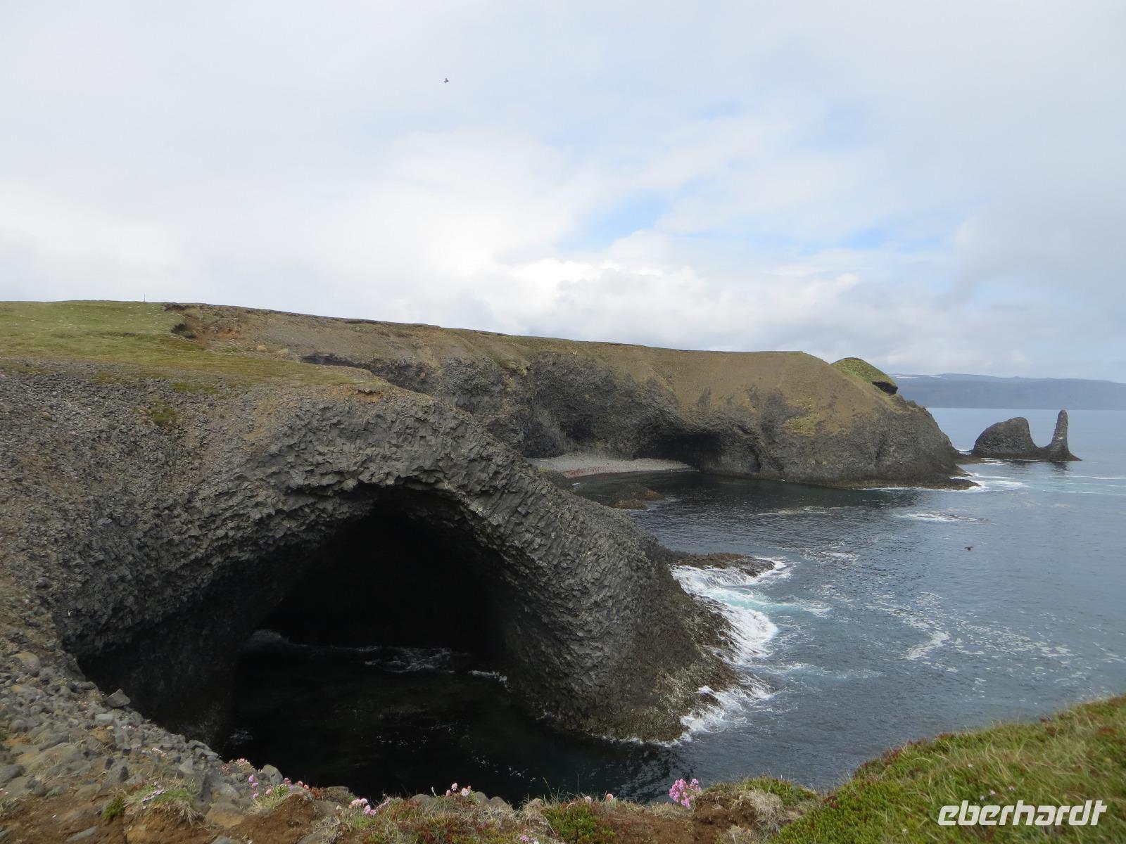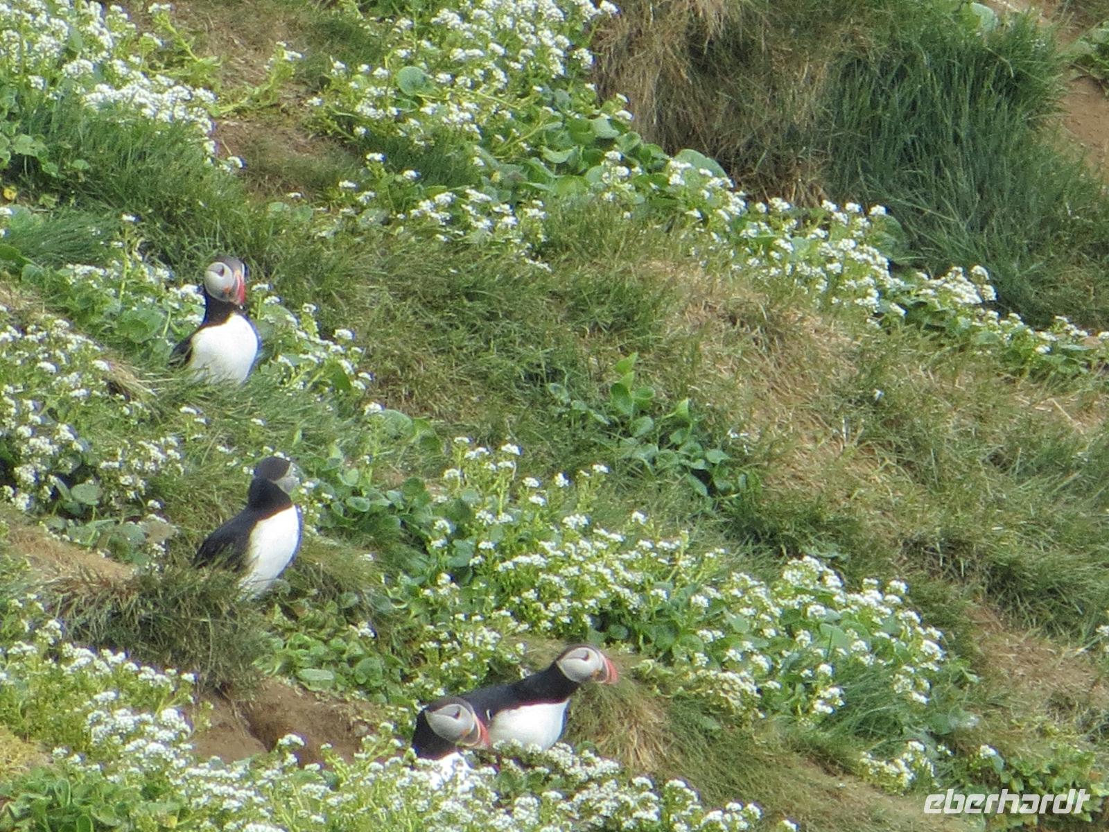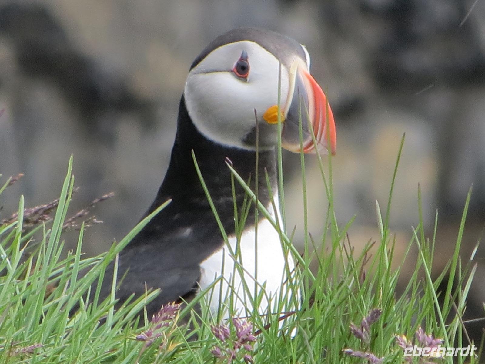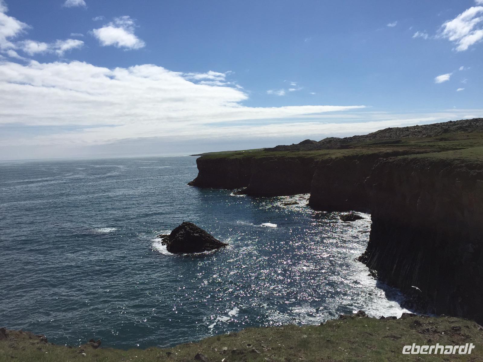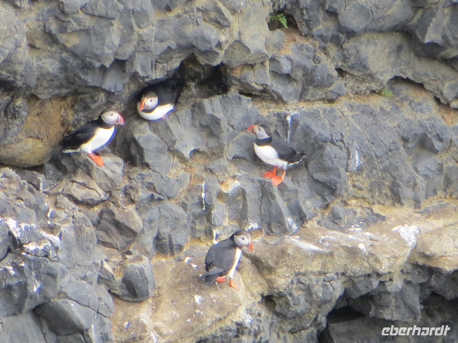 Nach dem Frühstück (liebe Mitreisende - Ihr erinnert Euch?) verlassen wir „unser Ende Islands" und gelangen nach Raudanes. Hier wandern wir entlang der Küste, die geprägt ist durch zahlreiche vulkanische Basaltsäulen, vom Meer ausgewaschene Höhlen und Torbögen. Unterwegs ist es soweit: eine ganze Kolonie der possierlichen Papageientaucher wartet auf uns auf den Klippen vor ihren Erdhöhlen. Harald robbt sich sogar bis auf einen Meter für DAS Foto an eines der Puffins ran. Wir machen unzählige Fotos und sind glücklich. Auf unserer weiteren Wanderung haben wir dann noch einmal das Glück und treffen eine weitere Kolonie an. Wir wandern mit langen Fotostopps fast 3,5 Stunden und genießen die skurillen Felsformationen und die Halbinsel Langanes. Anschließend fahren wir weiter und bis zu unseren nächsten Stopp in Vopnafjördur, wo wir in der Sonne in einem alten, aber wunderschön restaurierten, Kaufmannshaus Kaffeepause machen. Am späten Nachmittag erreichen wir unser Tagesziel Egilsstadir im Osten von Island. Wir übernachten heute im „Guesthouse Egilsstadir" direkt am See, das sehr geschmack- und liebevoll eingerichtet und dekoriert ist. Ein sehr leckeres Abendessen beendet unseren erlebnisreichen Tag.