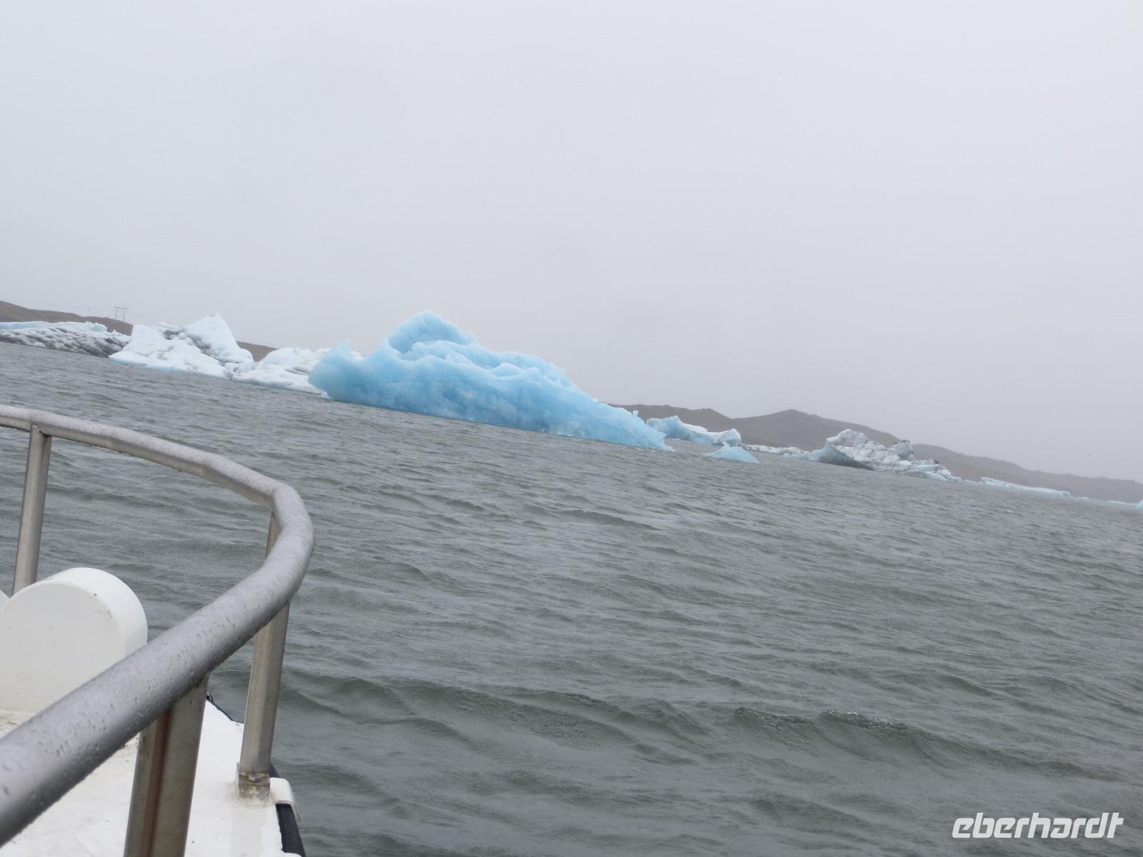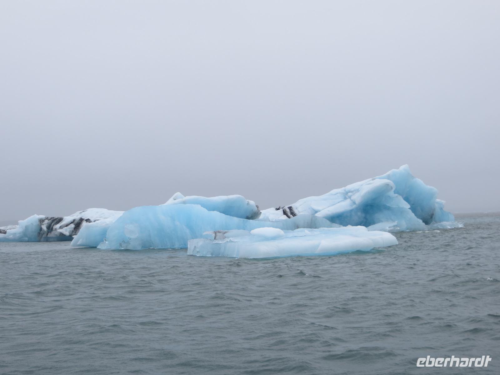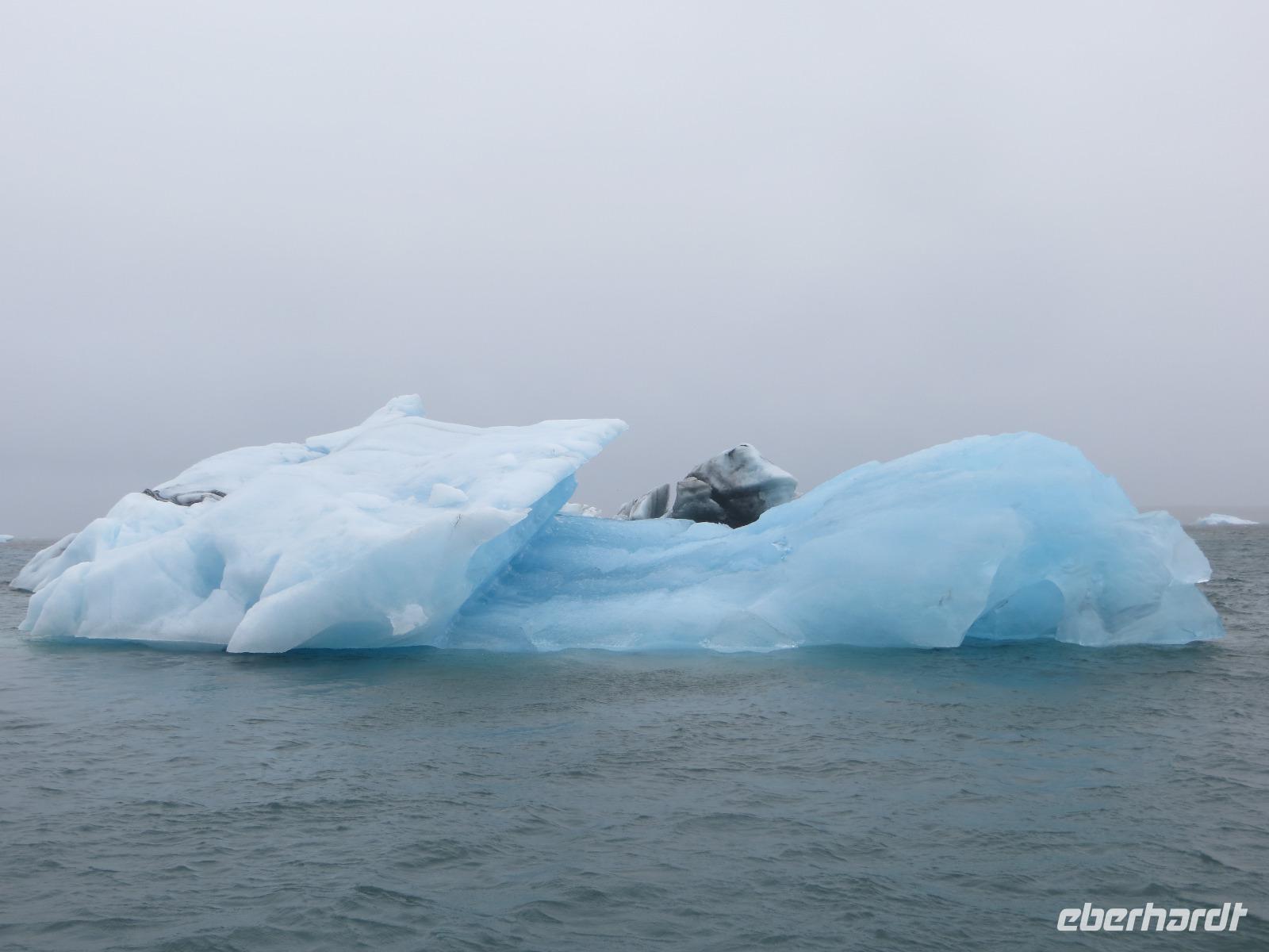 Heute früh hat uns dir Sonne erstmals verlassen. Wir fahren zunächst im Nebel und können die stark gegliederten, wilden Küstenlandschaft nur erahnen. Wir trösten uns, folgen Haralds Tipp und genießen leckeres Eis (z.B. Löwenzahn mit Honig) beim Biobauern. Danach geht es weiter zur beeindruckenden Gletscherlagune Jökulsarlon. Schon vom Parkplatz aus sehen wir die ersten Eisberge im Wasser. Wir unternehmen eine feuchte Bootsfahrt mit dem Amphibienfahrzeug und kommen den Eisbergen ganz nah. Während der Tour erfahren wir viel Interessantes u.a. zur Farbgebung der Eisberge und verkosten erneut ... nun Gletschereis.