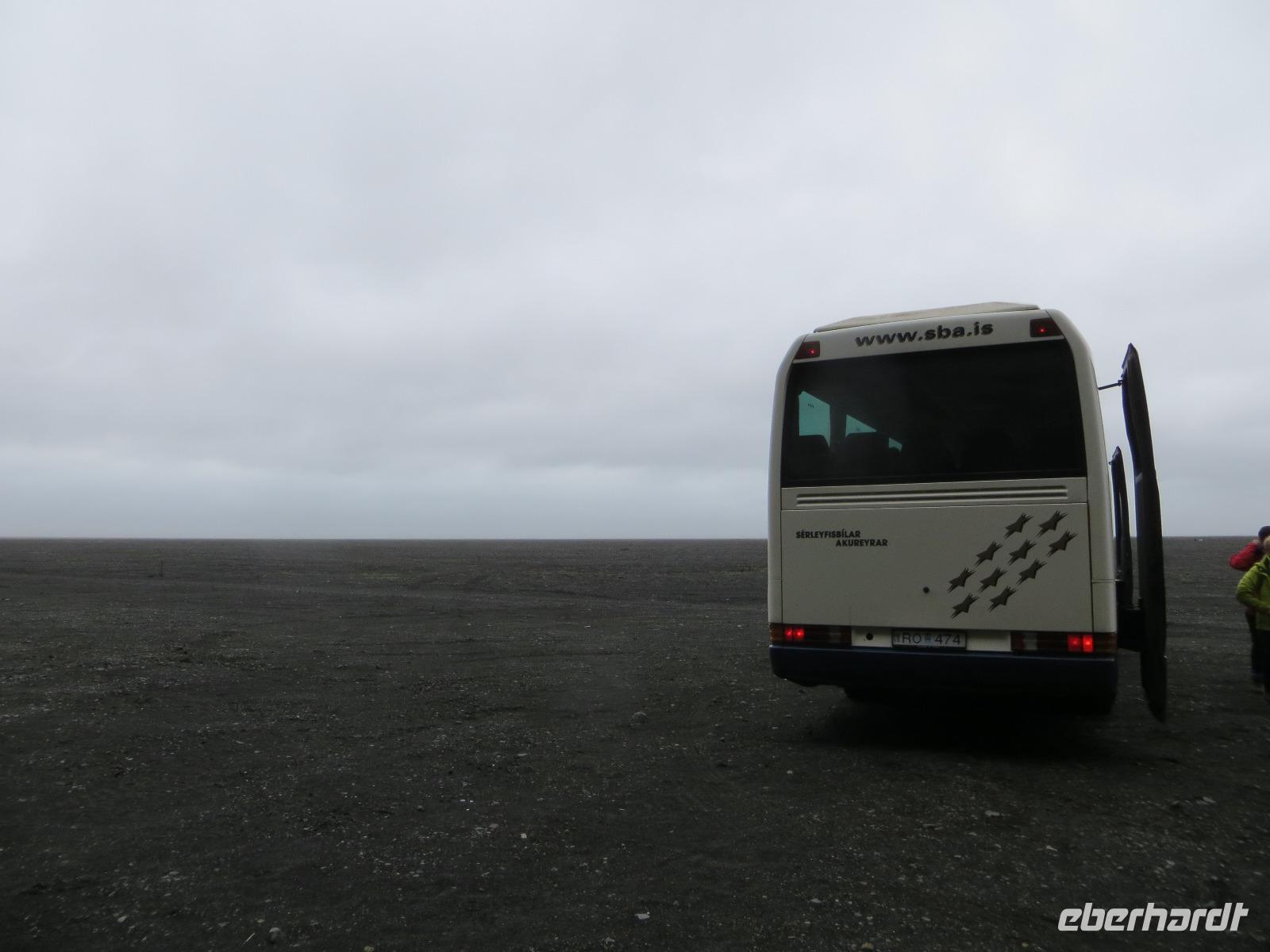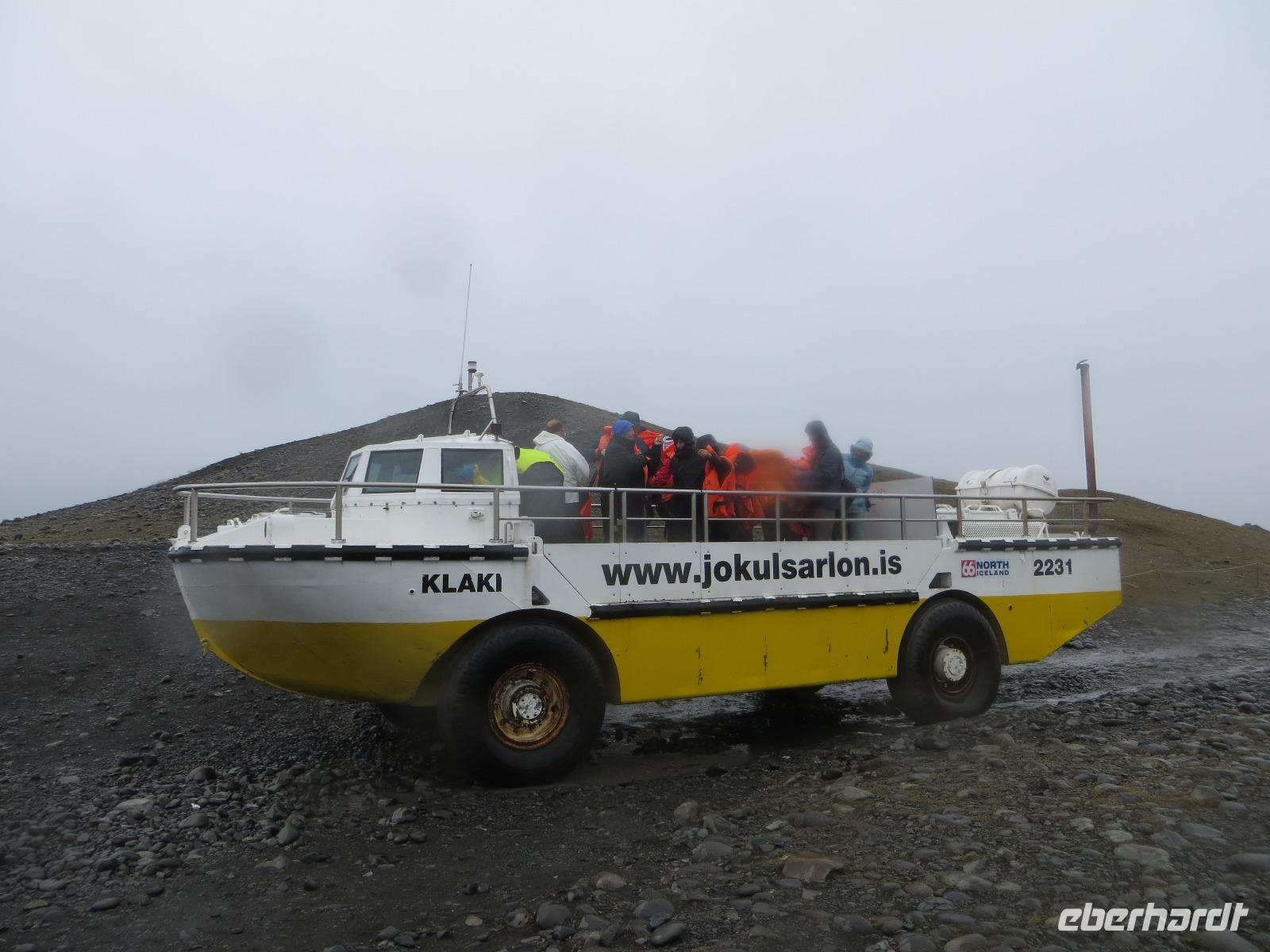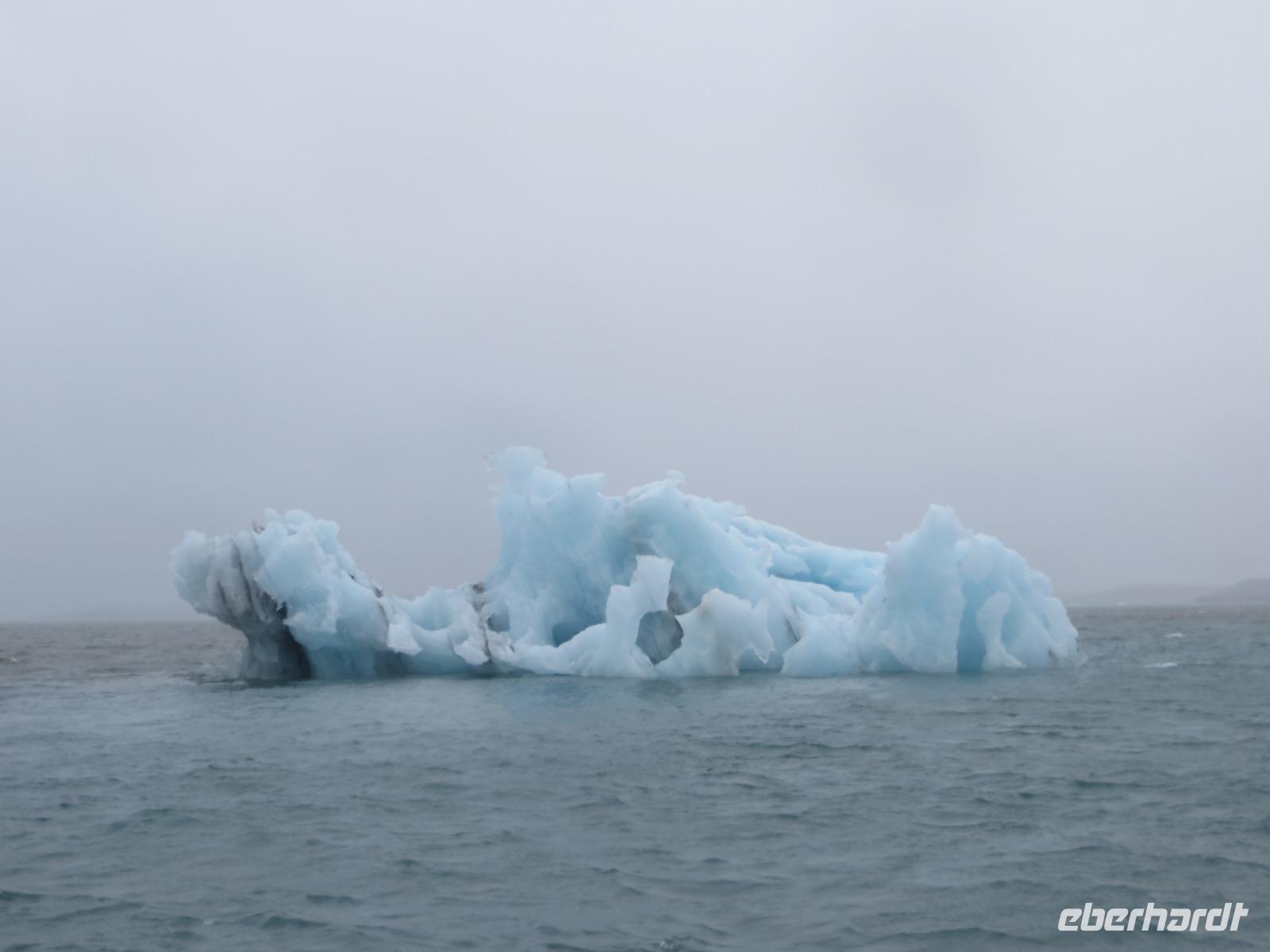 Heute früh hat uns dir Sonne erstmals verlassen. Wir fahren zunächst im Nebel und können die stark gegliederten, wilden Küstenlandschaft nur erahnen. Wir trösten uns, folgen Haralds Tipp und genießen leckeres Eis (z.B. Löwenzahn mit Honig) beim Biobauern. Danach geht es weiter zur beeindruckenden Gletscherlagune Jökulsarlon. Schon vom Parkplatz aus sehen wir die ersten Eisberge im Wasser. Wir unternehmen eine feuchte Bootsfahrt mit dem Amphibienfahrzeug und kommen den Eisbergen ganz nah. Während der Tour erfahren wir viel Interessantes u.a. zur Farbgebung der Eisberge und verkosten erneut ... nun Gletschereis.