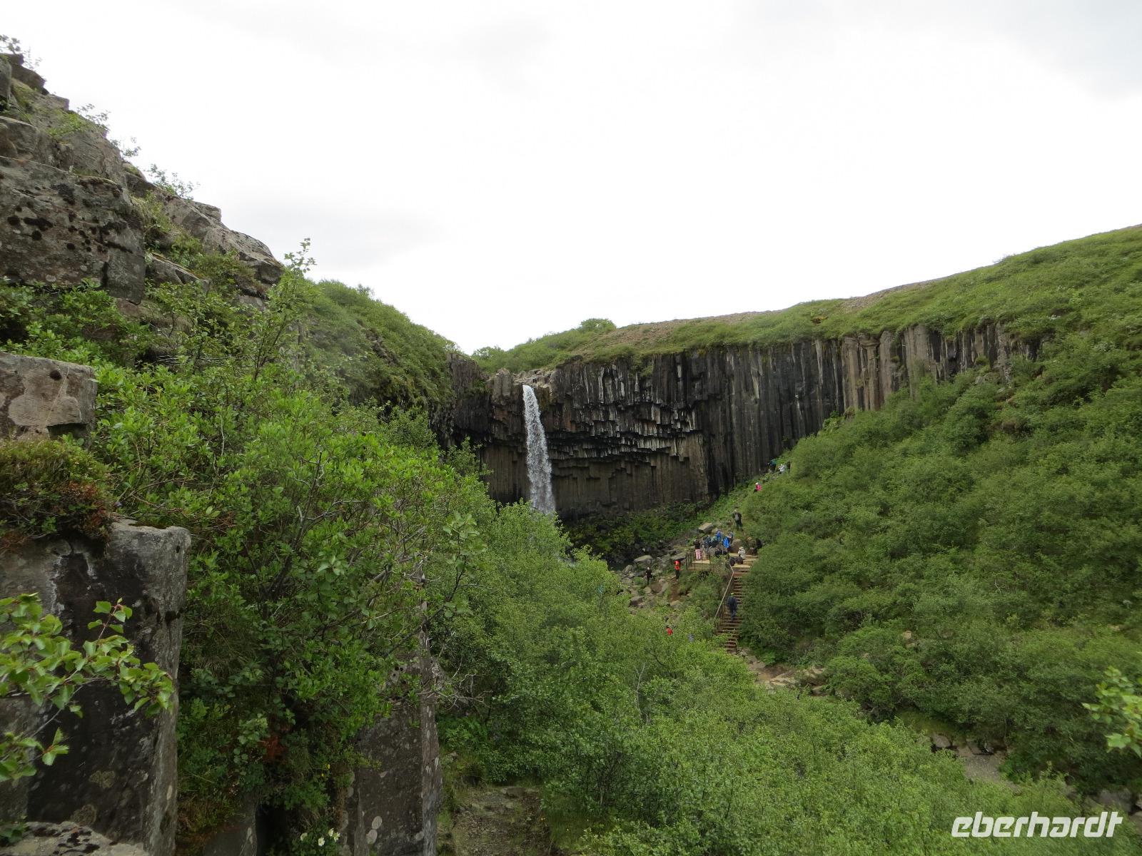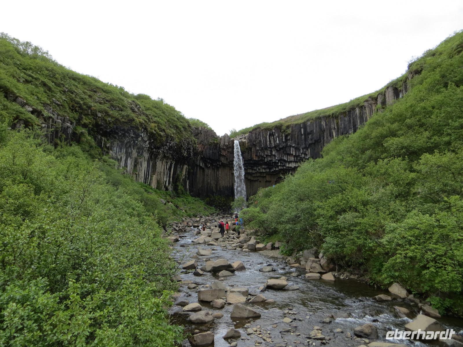 Anschließend, das Wetter hat sich längste gebessert, gelangen wir in den Nationalpark Skaftafell. Zum Mittag stärken wir uns bei einem rustikalen Picknick mit Moosbrot, Lachs, Lamm und Blaubeerkuchen! Zur Verdauung verkosten wir den typischen Brennevin, den isländischen Kümmelschnaps. Danach wandern wir immer bergauf zum Wasserfall Svartifoss. Klein, aber fein mit all den gleichmäßigen Basaltsäulen als Umrahmung. Am Abend erreichen wir unseren Übernachtungsort Kirkjubaejarklaustur (oder auf deutsch Kirche vorm Kloster). Leider ist es hier im Südosten Islands sehr stürmig und für den kommenden Tag gibt es Unwetterwarnungen, so dass leider die geplante Gletscherwanderung ausfallen muss.