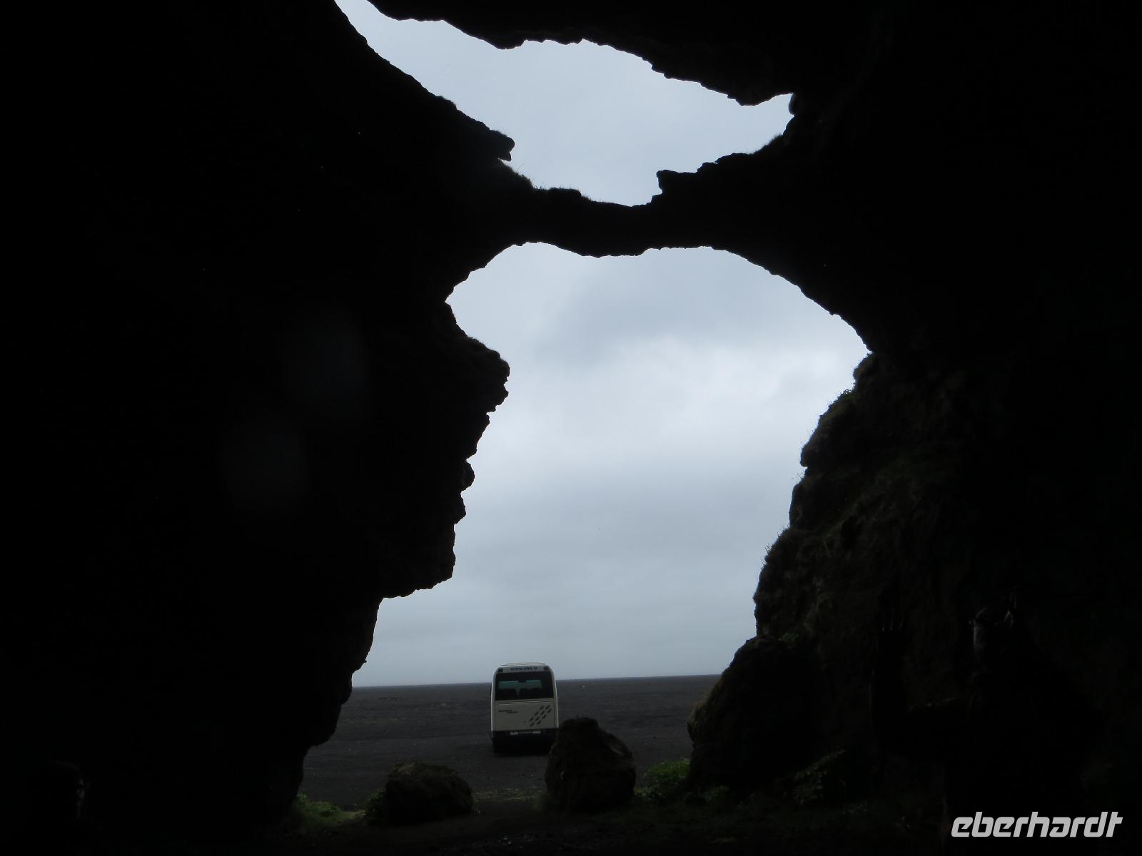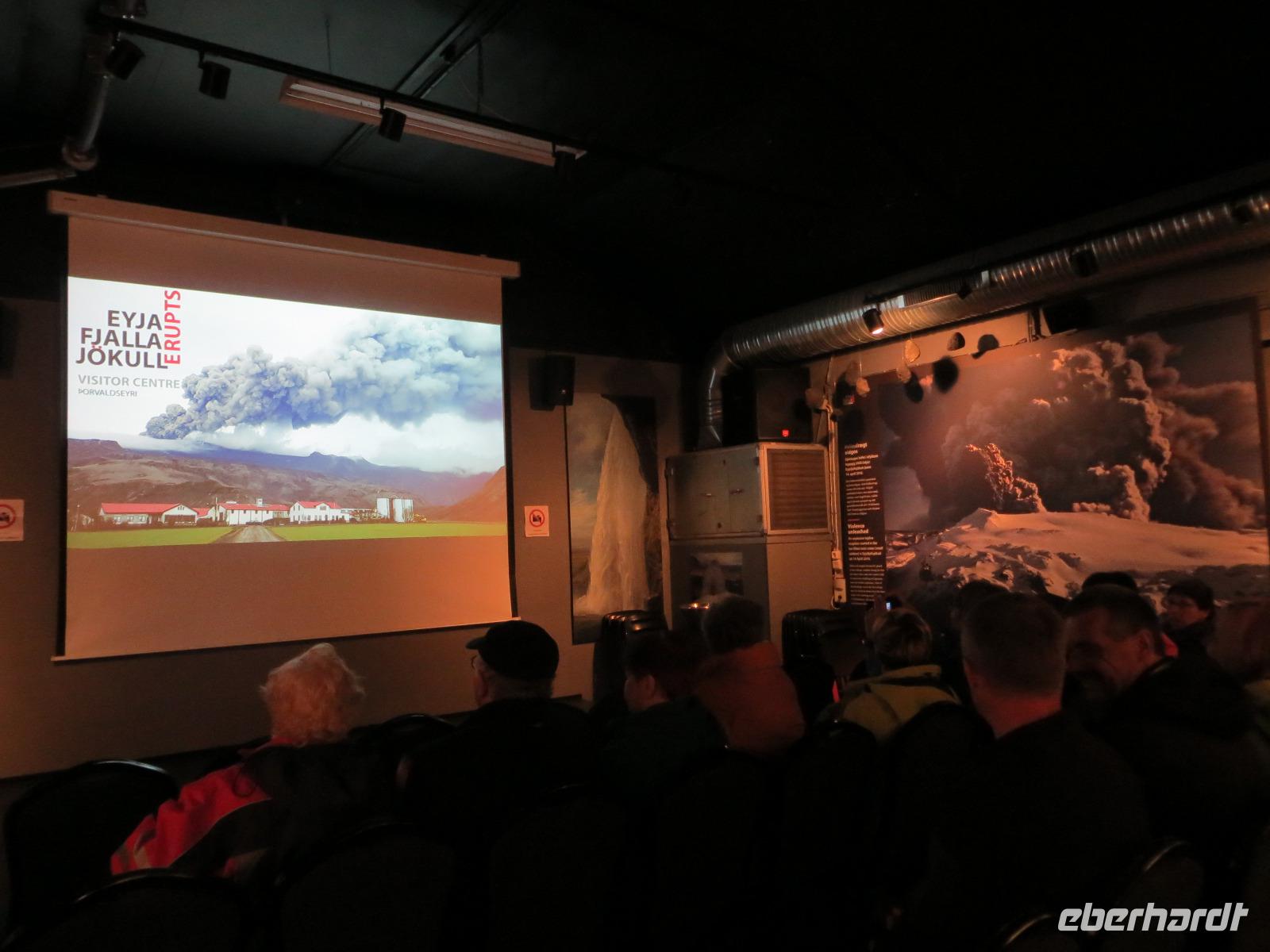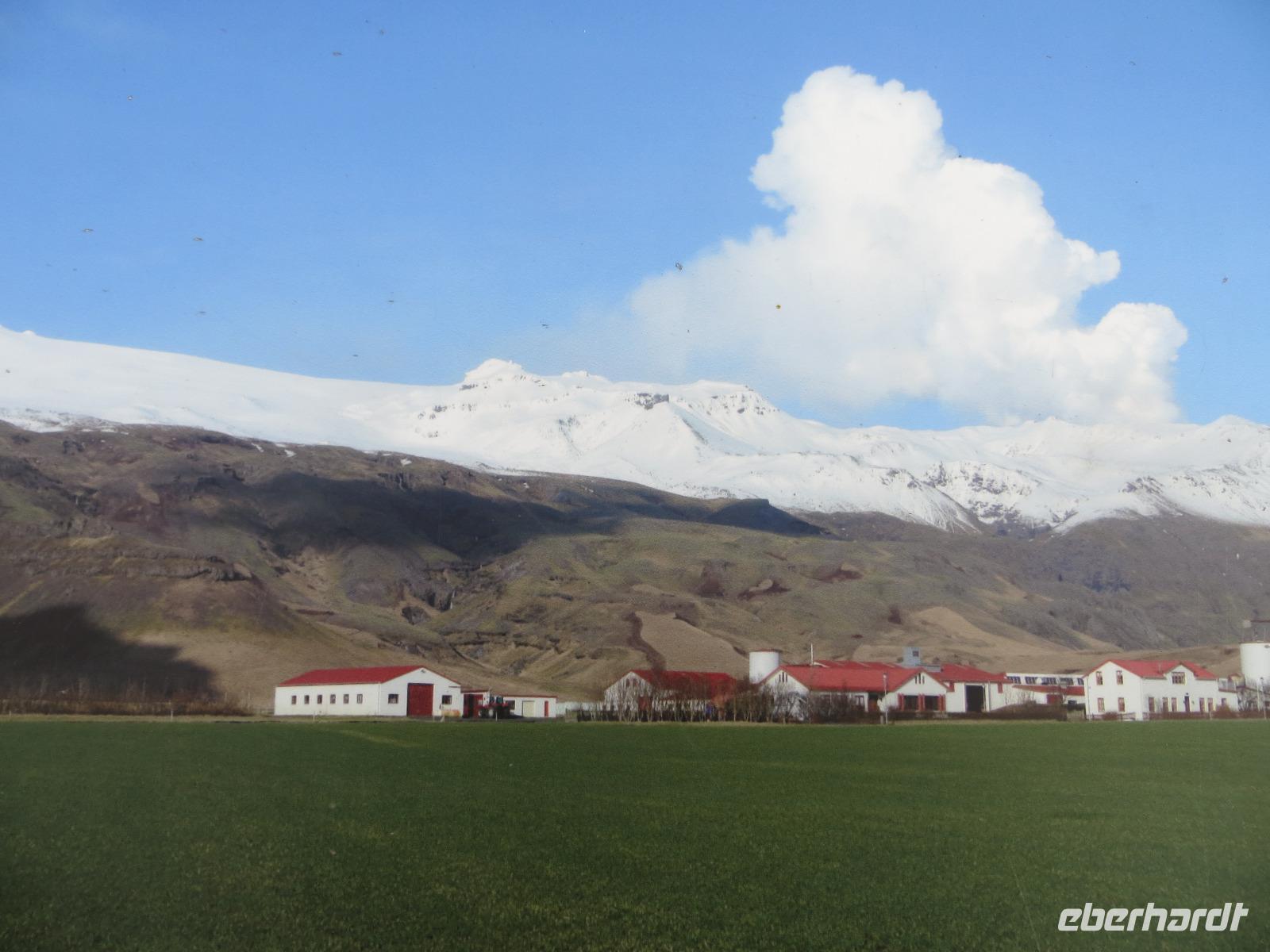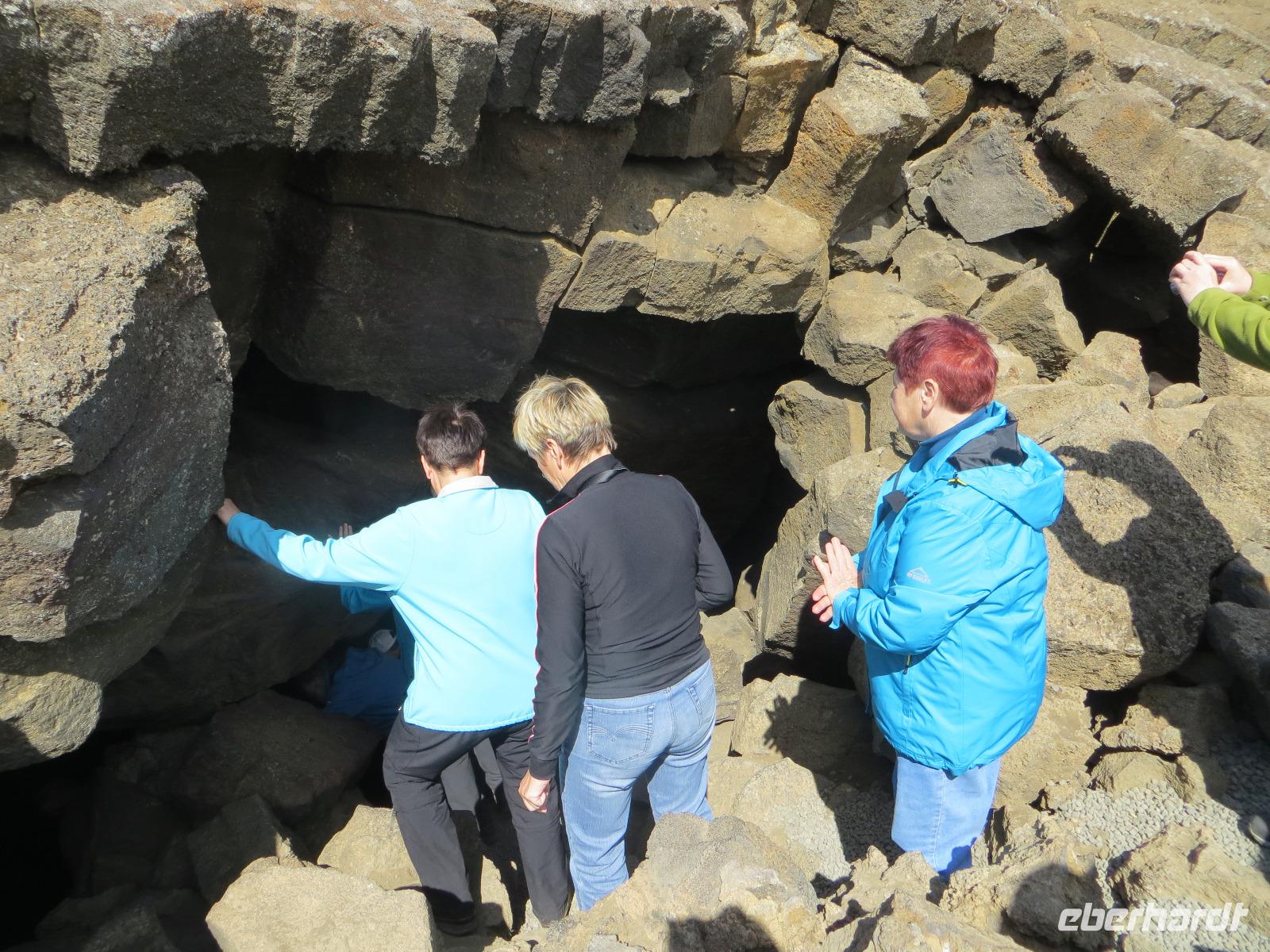 Anschließen fahren wir weiter durch eines der größten Lavafelder Islands bis nach Vik, dem südlichsten Ort Islands, der für seine schwarzen Lavastrände berühmt ist. Von Weitem erblicken wir die sagenumwobenen Felsnadeln Reynisdrangar: den Überlieferungen nach, sollen Trolle versucht haben, einen Dreimaster an Land zu ziehen und sind dabei bei Sonnenaufgang versteinert. Leider sind aufgrund des Sturmes die Strände und auch die Paßstrasse gesperrt, so dass wir erst einmal in dem knapp 300 Einwohner zählenden Ort festsitzen. Nachdem wir uns im gemütlichen „Halldorskaffi" gestärkt und uns in der örtliche „Wollfabrik" mit Souvenirs eindeckt haben fuhren wir etwas zurück und besuchten eine kleine Höhle im „Niemandsland". Später wurde der Paß wieder geöffnet und wir setzten unser Programm fort. Als erstes besuchten wir den Skogafoss, den 60 m hohen „Waldwasserfall" und danach den Seljalandsfoss. Einige von uns nutzen die Möglichkeit und spazierten hinter dem Wasserfall entlang. Ganz in der Nähe befindet sich der berühmte „Aschewolkevulkan" Eyjafjallajökull, der im Jahr 2010 für weltweite Aufregung sorgte, indem er nahezu den ganzen Flugverkehr Europas für einige Tage lahm legte. Wir stoppen und stehen gegenüber dem Bauernhof Thorvaldseyri, der direkt unterhalb des Vulkanes liegt. Die Familien hat ein Besucherzentrum errichtet und wir schauen uns eine 20 minütige, sehr interessante Dokumentation zum Vulkanausbruch an. Wir sind alle nachhaltig beeindruckt von den Bildern des gewaltigen Naturereignisses. Am Abend erreichen wir den Ort Hella, wo wir die kommenden 2 Tage übernachten werden.