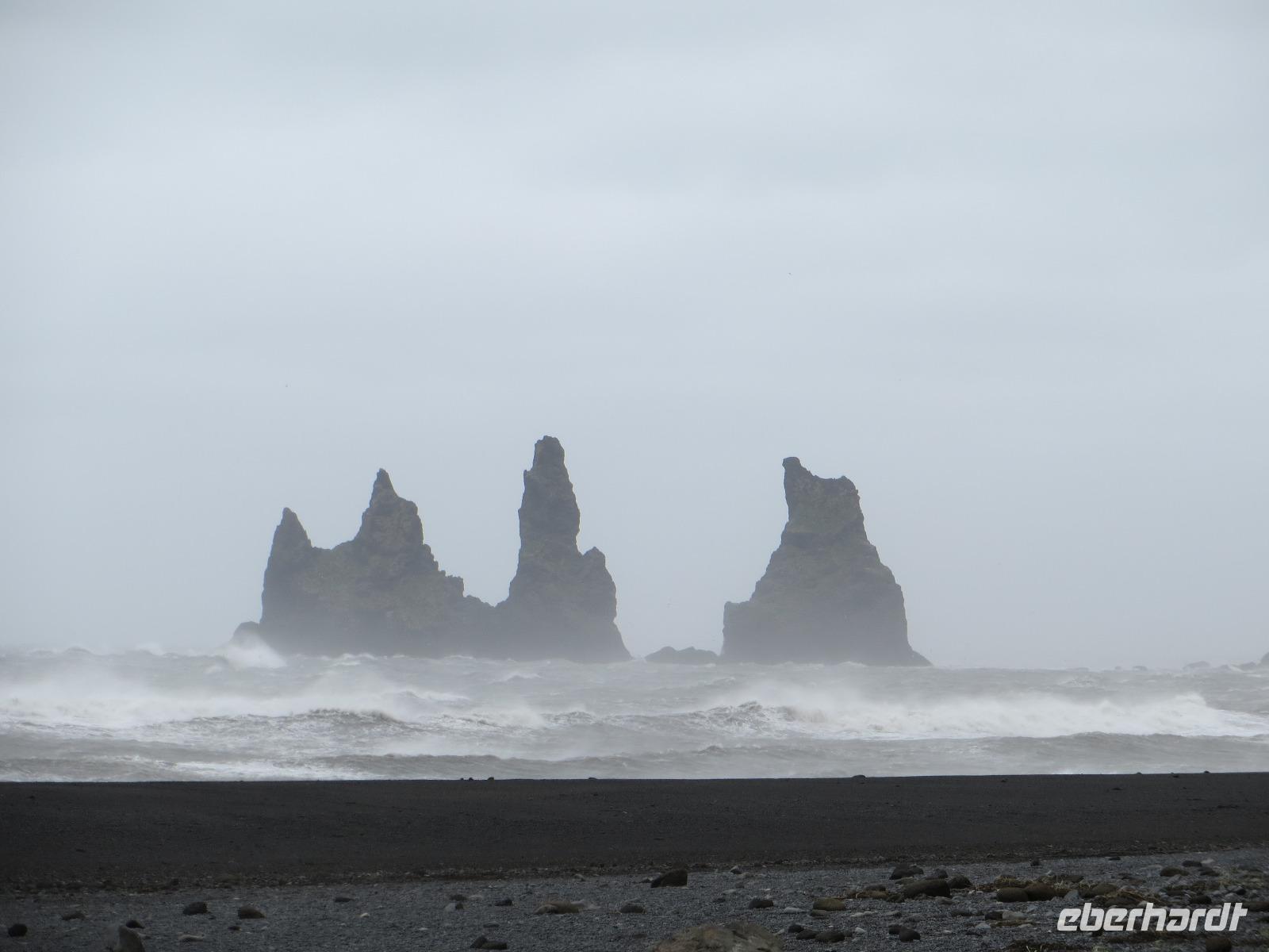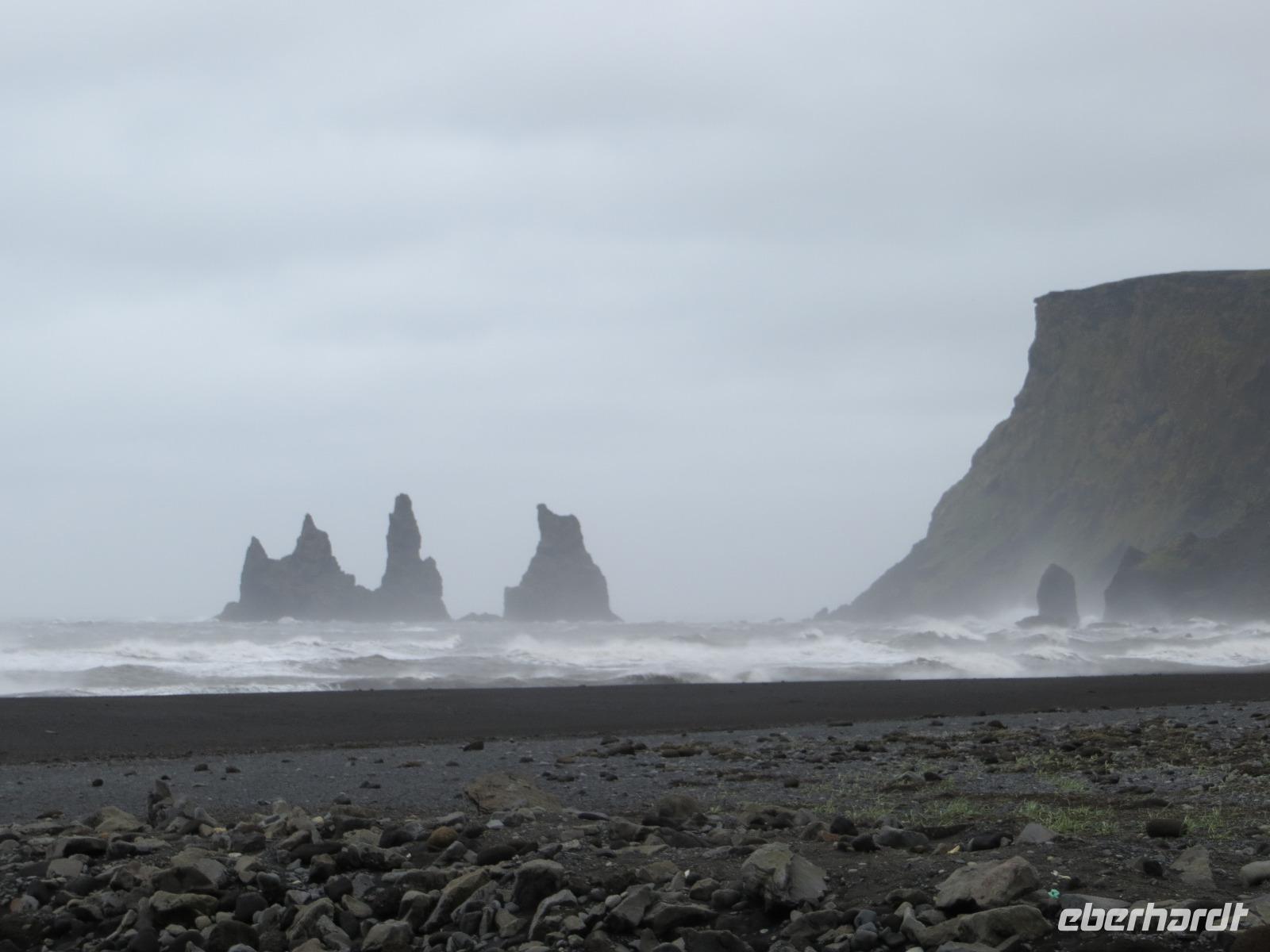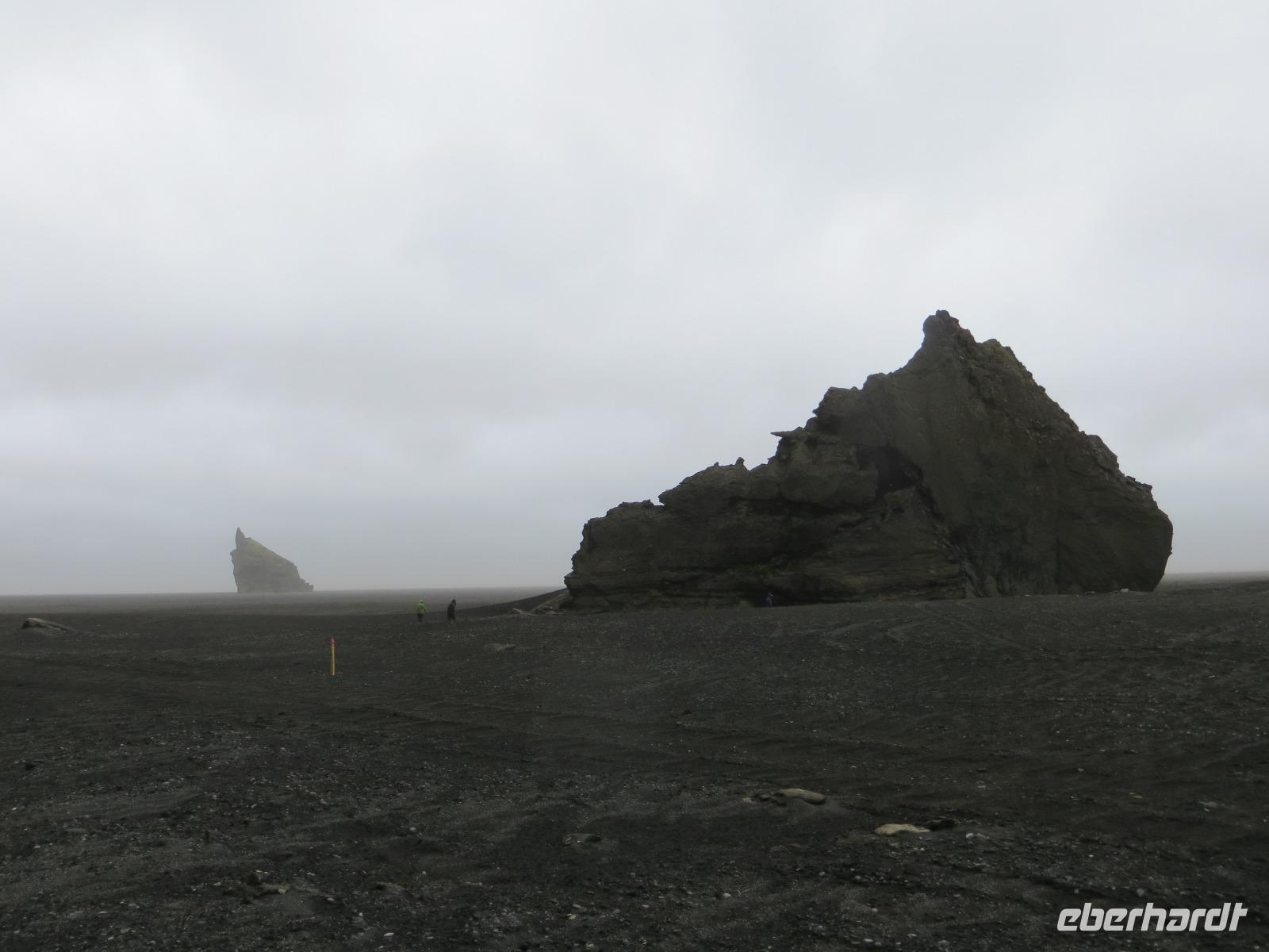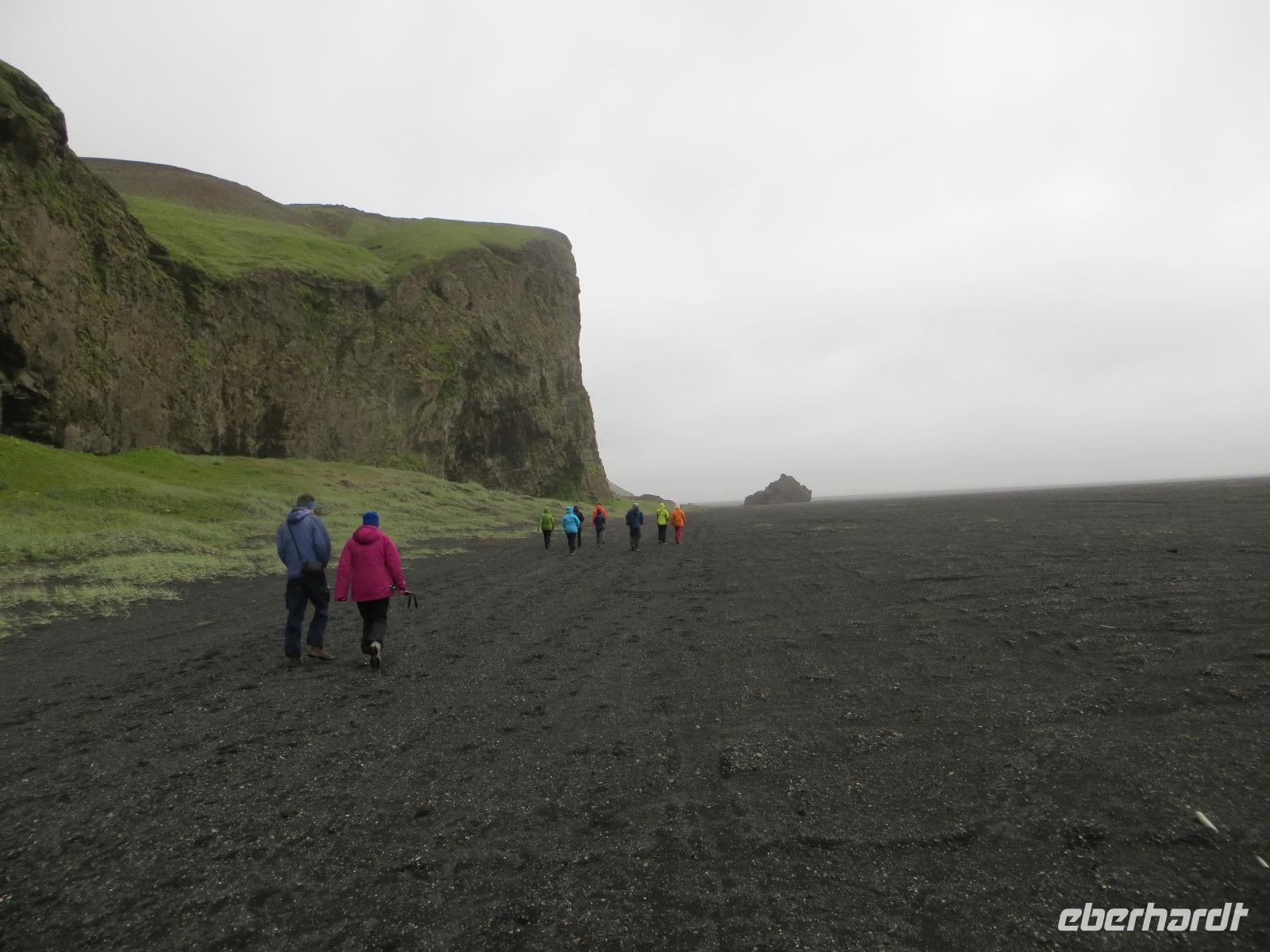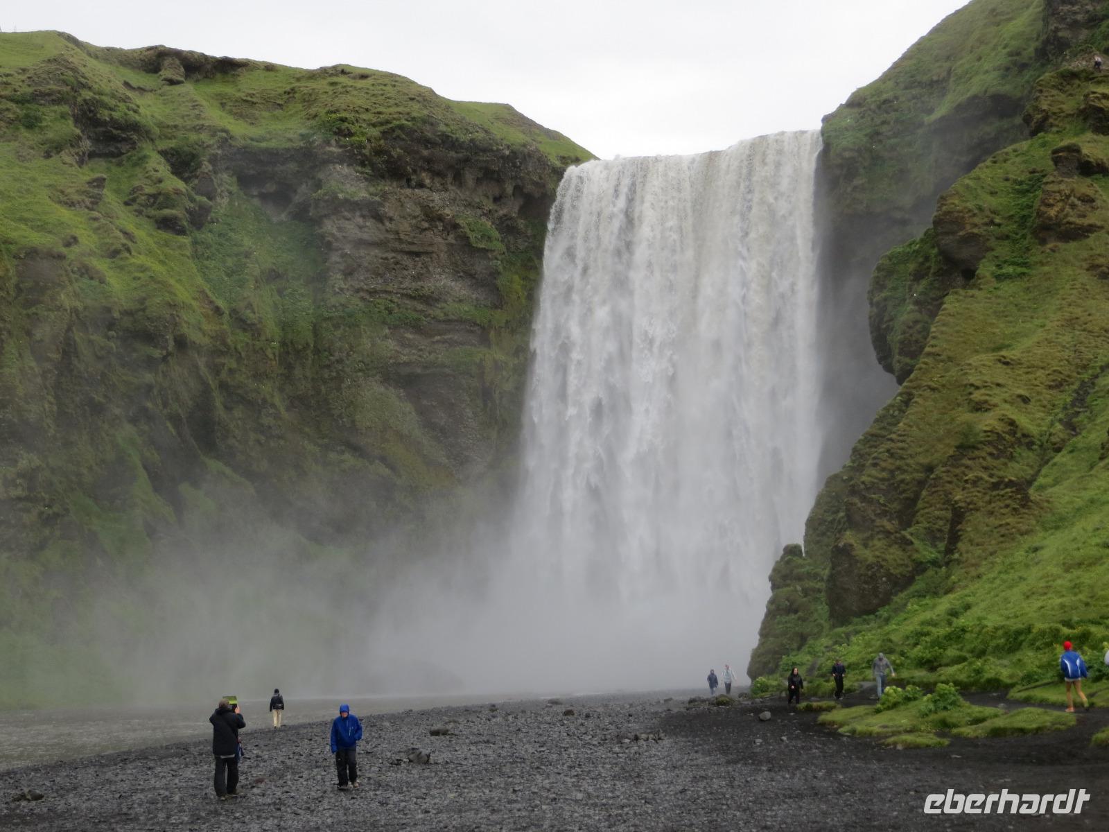 Anschließen fahren wir weiter durch eines der größten Lavafelder Islands bis nach Vik, dem südlichsten Ort Islands, der für seine schwarzen Lavastrände berühmt ist. Von Weitem erblicken wir die sagenumwobenen Felsnadeln Reynisdrangar: den Überlieferungen nach, sollen Trolle versucht haben, einen Dreimaster an Land zu ziehen und sind dabei bei Sonnenaufgang versteinert. Leider sind aufgrund des Sturmes die Strände und auch die Paßstrasse gesperrt, so dass wir erst einmal in dem knapp 300 Einwohner zählenden Ort festsitzen. Nachdem wir uns im gemütlichen „Halldorskaffi" gestärkt und uns in der örtliche „Wollfabrik" mit Souvenirs eindeckt haben fuhren wir etwas zurück und besuchten eine kleine Höhle im „Niemandsland". Später wurde der Paß wieder geöffnet und wir setzten unser Programm fort. Als erstes besuchten wir den Skogafoss, den 60 m hohen „Waldwasserfall" und danach den Seljalandsfoss. Einige von uns nutzen die Möglichkeit und spazierten hinter dem Wasserfall entlang. Ganz in der Nähe befindet sich der berühmte „Aschewolkevulkan" Eyjafjallajökull, der im Jahr 2010 für weltweite Aufregung sorgte, indem er nahezu den ganzen Flugverkehr Europas für einige Tage lahm legte. Wir stoppen und stehen gegenüber dem Bauernhof Thorvaldseyri, der direkt unterhalb des Vulkanes liegt. Die Familien hat ein Besucherzentrum errichtet und wir schauen uns eine 20 minütige, sehr interessante Dokumentation zum Vulkanausbruch an. Wir sind alle nachhaltig beeindruckt von den Bildern des gewaltigen Naturereignisses. Am Abend erreichen wir den Ort Hella, wo wir die kommenden 2 Tage übernachten werden.