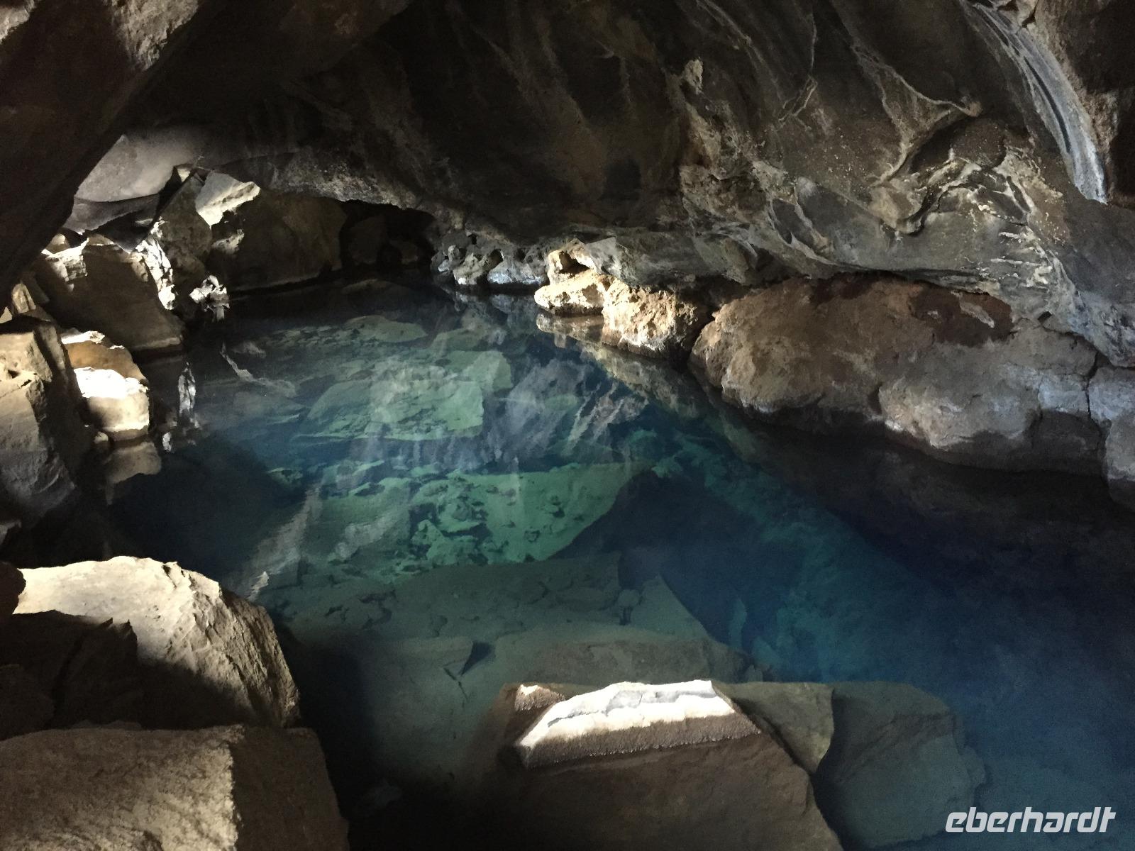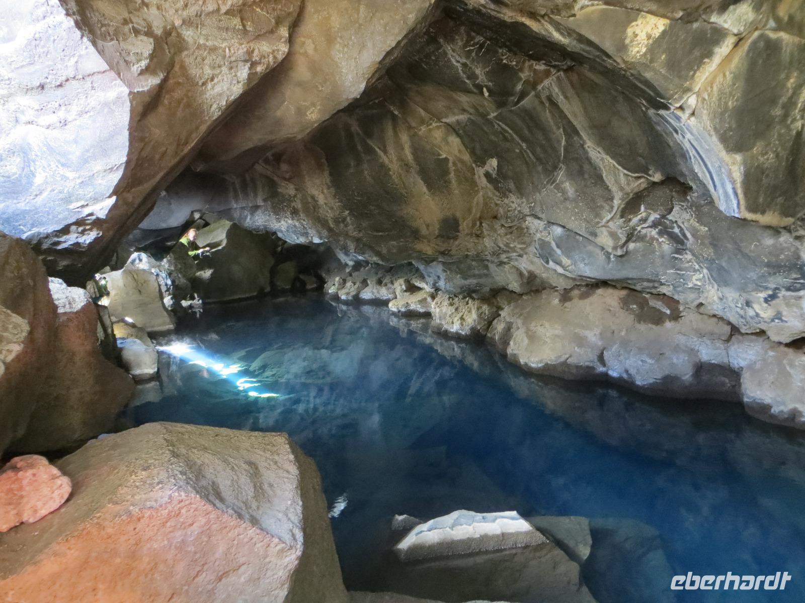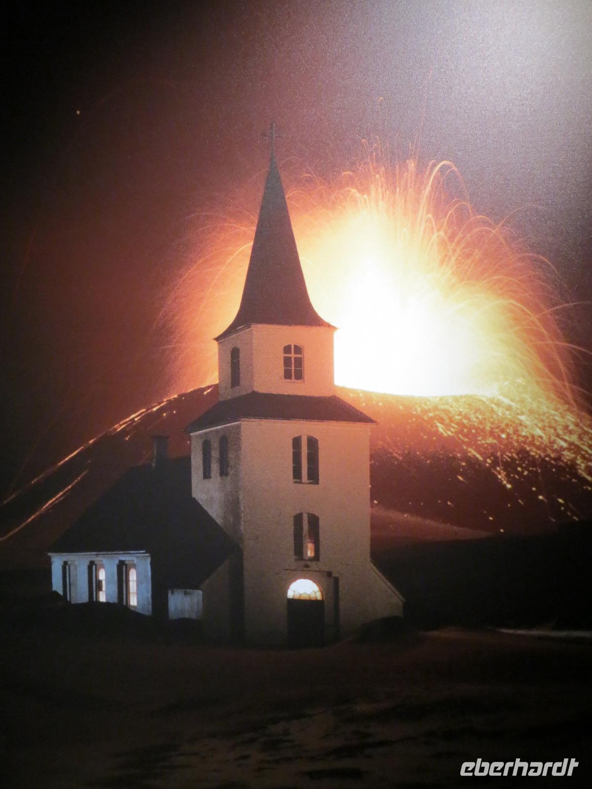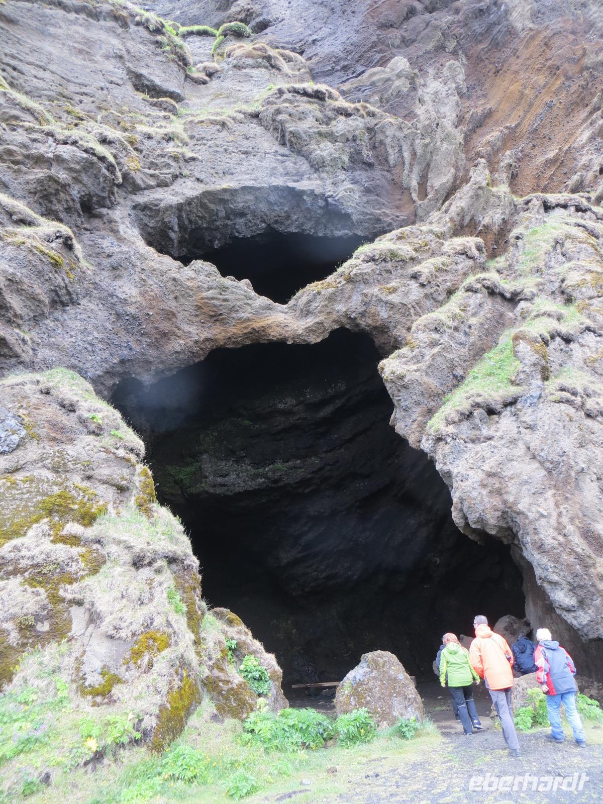 Anschließen fahren wir weiter durch eines der größten Lavafelder Islands bis nach Vik, dem südlichsten Ort Islands, der für seine schwarzen Lavastrände berühmt ist. Von Weitem erblicken wir die sagenumwobenen Felsnadeln Reynisdrangar: den Überlieferungen nach, sollen Trolle versucht haben, einen Dreimaster an Land zu ziehen und sind dabei bei Sonnenaufgang versteinert. Leider sind aufgrund des Sturmes die Strände und auch die Paßstrasse gesperrt, so dass wir erst einmal in dem knapp 300 Einwohner zählenden Ort festsitzen. Nachdem wir uns im gemütlichen „Halldorskaffi" gestärkt und uns in der örtliche „Wollfabrik" mit Souvenirs eindeckt haben fuhren wir etwas zurück und besuchten eine kleine Höhle im „Niemandsland". Später wurde der Paß wieder geöffnet und wir setzten unser Programm fort. Als erstes besuchten wir den Skogafoss, den 60 m hohen „Waldwasserfall" und danach den Seljalandsfoss. Einige von uns nutzen die Möglichkeit und spazierten hinter dem Wasserfall entlang. Ganz in der Nähe befindet sich der berühmte „Aschewolkevulkan" Eyjafjallajökull, der im Jahr 2010 für weltweite Aufregung sorgte, indem er nahezu den ganzen Flugverkehr Europas für einige Tage lahm legte. Wir stoppen und stehen gegenüber dem Bauernhof Thorvaldseyri, der direkt unterhalb des Vulkanes liegt. Die Familien hat ein Besucherzentrum errichtet und wir schauen uns eine 20 minütige, sehr interessante Dokumentation zum Vulkanausbruch an. Wir sind alle nachhaltig beeindruckt von den Bildern des gewaltigen Naturereignisses. Am Abend erreichen wir den Ort Hella, wo wir die kommenden 2 Tage übernachten werden.