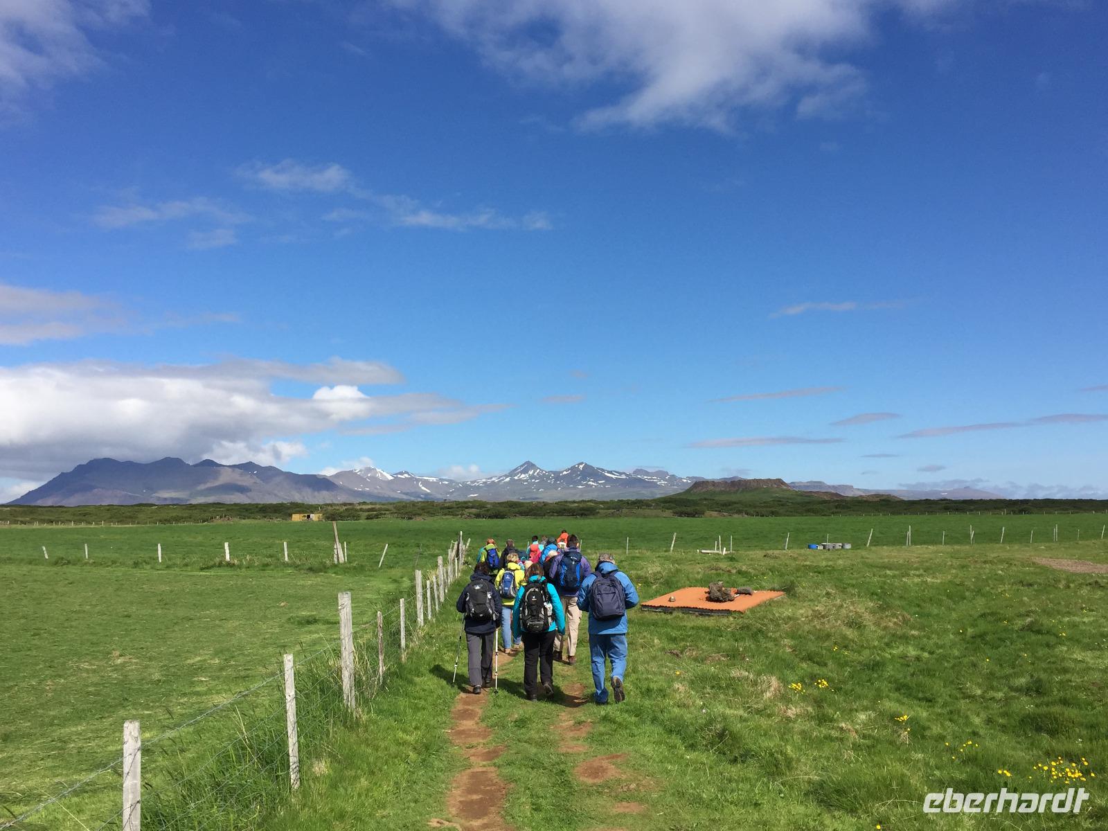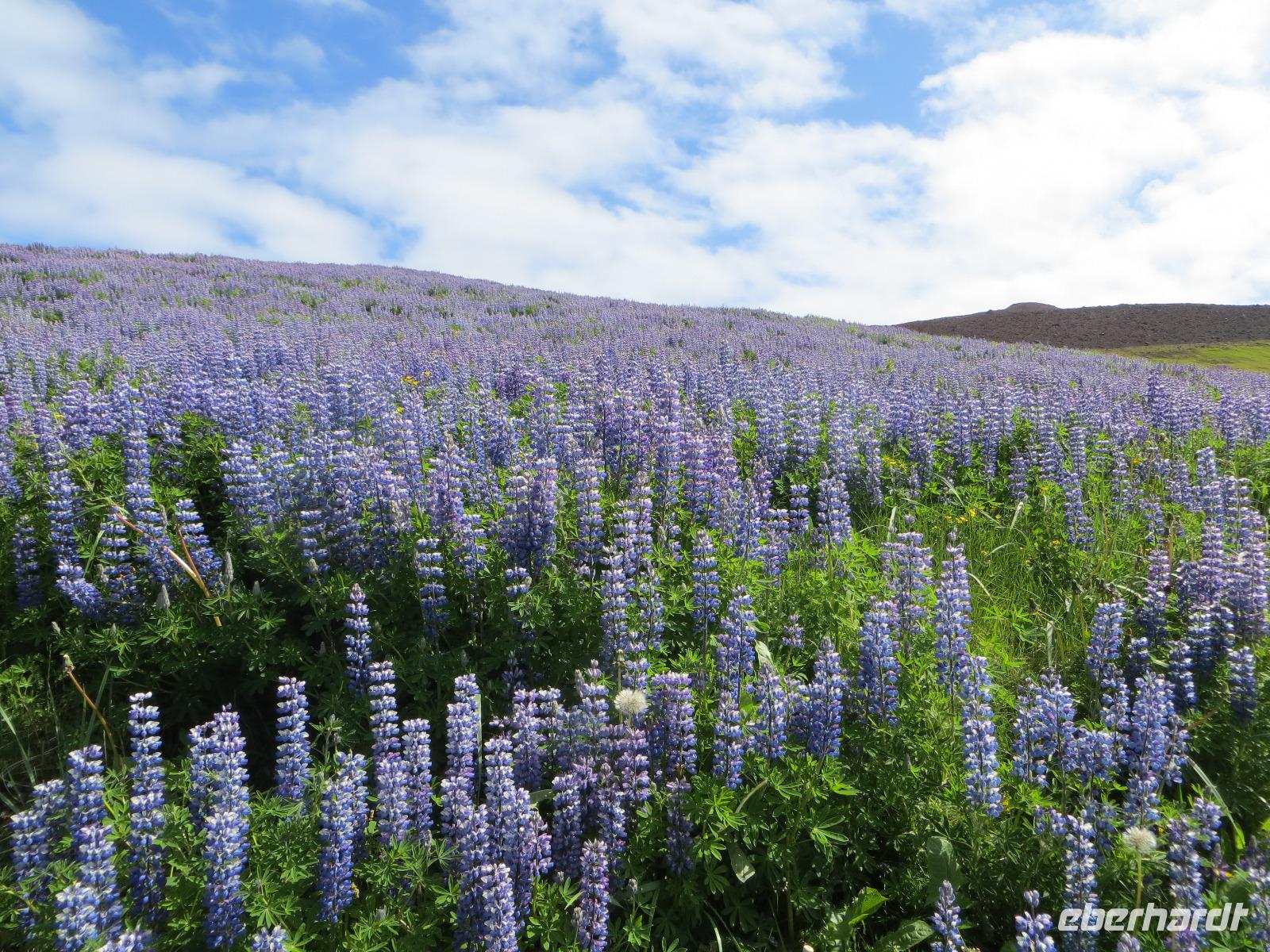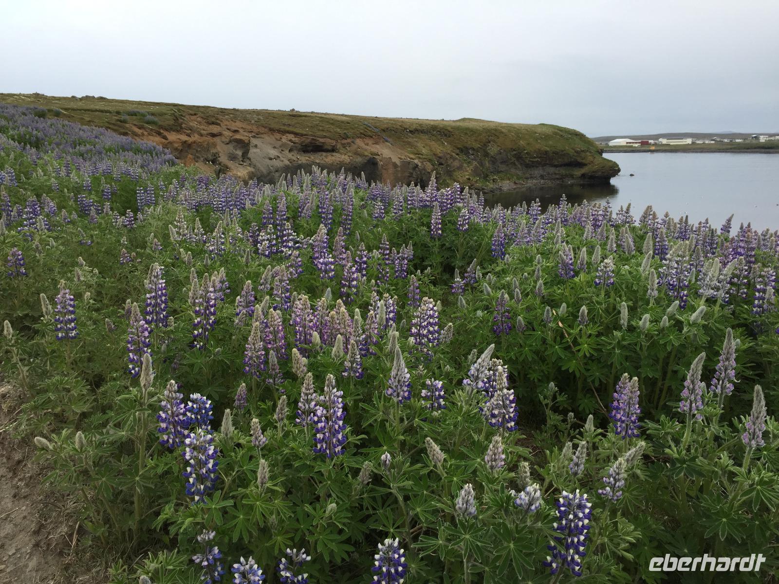 Am Vormittag trafen wir, 17 reiselustige Gäste, uns am Flughafen Berlin-Schönefeld. Pünktlich startete um 12:40 Uhr unser Flug mit WOW Air nach Keflavik und bereits nach knapp 4 Stunden erreichten wir die Vulkaninsel, die wir die kommenden 12 Tage zu Fuß und mit dem Bus erkunden wollten. Vor Ort erwartete uns bereits Harald, der uns in den kommenden Tagen als Reiseleiter seine Wahlheimat zeigen würde. Auf der Fahrt nach Reykjavik sahen wir schon schneebedeckte Gipfel in der Ferne und die ersten endlosen blauen Lupinenfelder, die uns die ganze Reise begleiten würden. Nach ca. 45 Minuten erreichten wir unser Hotel und machten uns nach einer kurzen Pause zu Fuß auf, die isländische Hauptstadt zu erkunden. Wir bummelten am Parlament vorbei, besichtigten im Rathaus die Modelle der gestalterischen Planungen für die kommenden Jahre, spazieren entlang der Einkaufsstrasse Laugavegur bis zur Hallgrimskirkja, der imposanten Kirche, die zugleich das höchste Gebäude Islands ist. Weiter ging es zum Höfði, wo sich 1986 Ronald Reagan und Michail Gorbatschow zum Islandgipfel trafen, zur Küstenstraße Sæbraut, wo sich die bekannte Skulptur „Sonnenfahrt", die ein Wikingerschiff darstellt, befindet. Zum Abschluss sahen wir noch das Konzerthaus Harpa am Hafen. Zum Abendessen erwartete uns ein leckeres Buffet im Fischrestaurant „Reykjavik. Nach dem Abendessen bummelten einige von uns weiter durch die Stadt oder nahmen Platz beim Public Viewing genau vor unserem Hotel: denn das erste Gruppenspiel unserer Mannschaft bei der Fußball-EM 2016 fand heute statt.