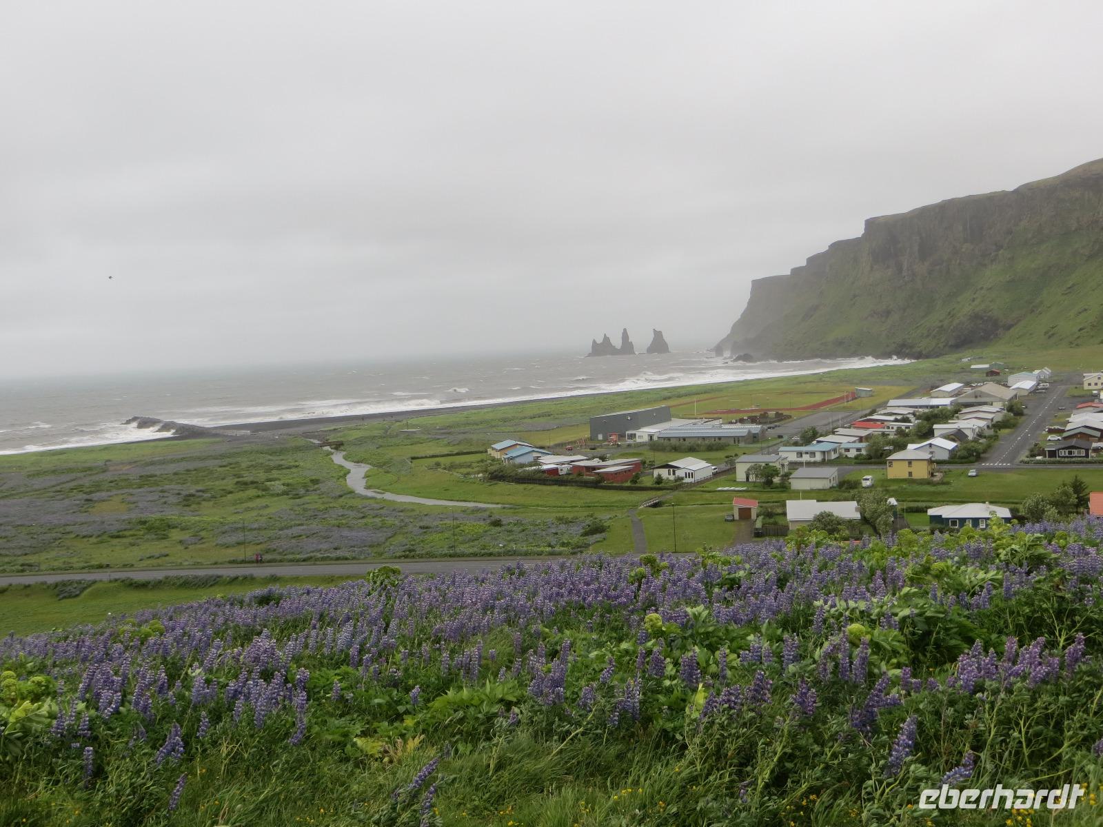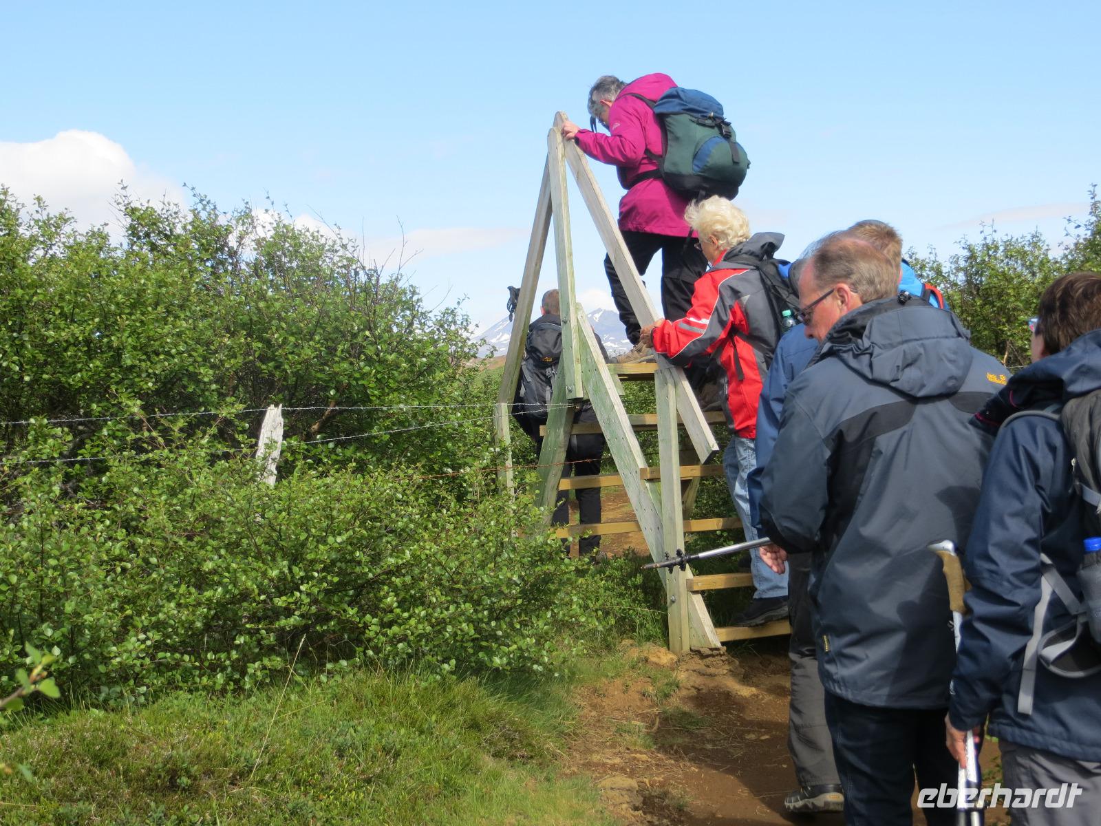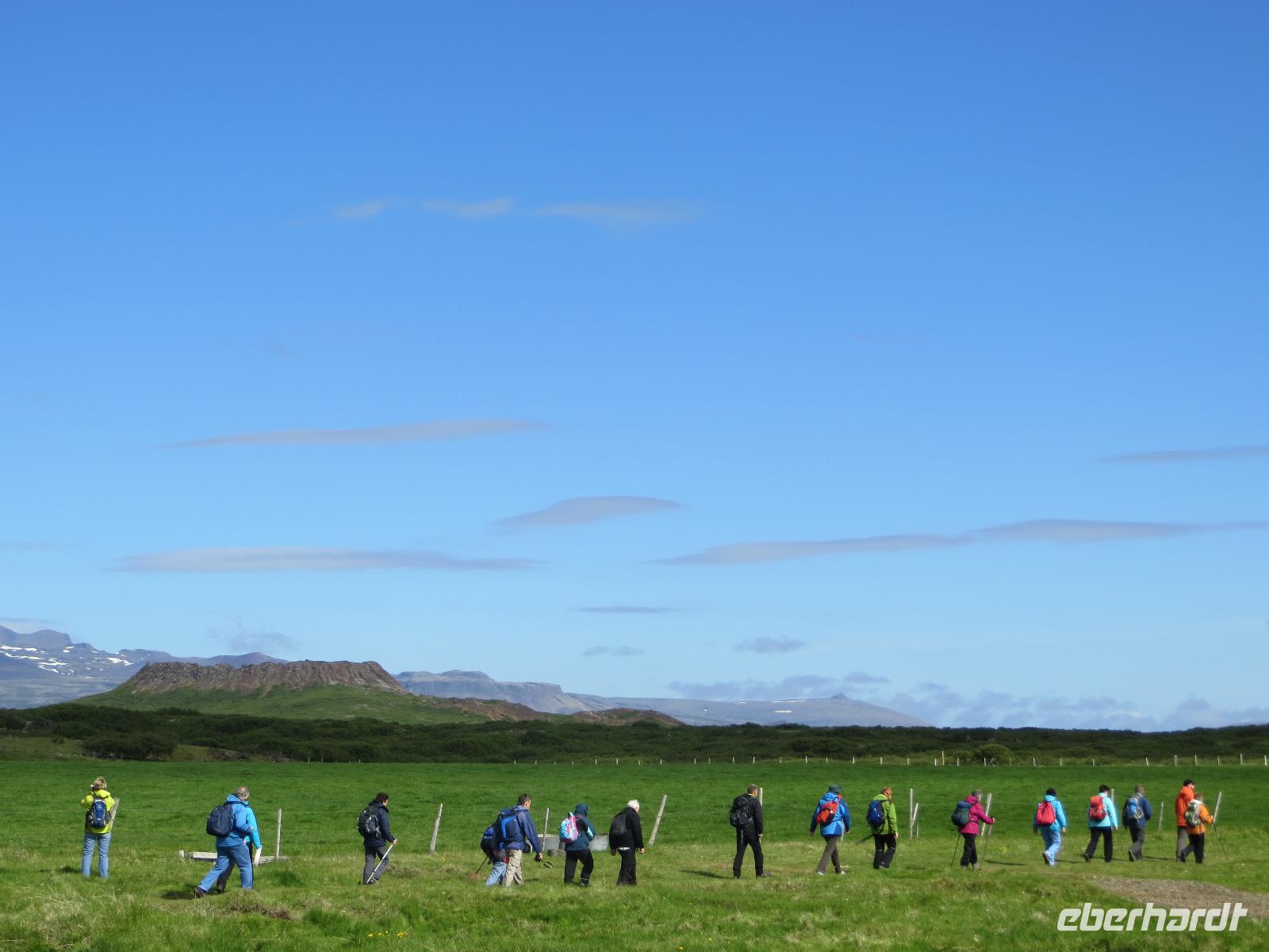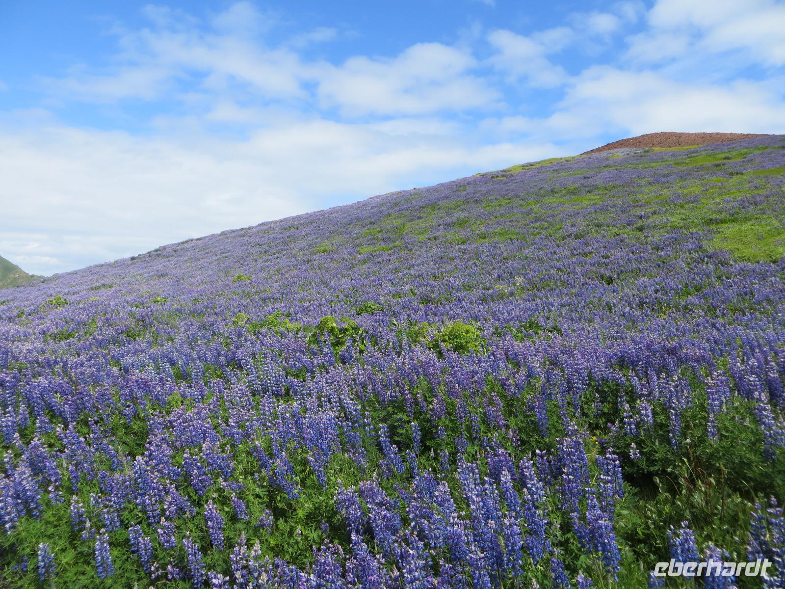 Am Vormittag trafen wir, 17 reiselustige Gäste, uns am Flughafen Berlin-Schönefeld. Pünktlich startete um 12:40 Uhr unser Flug mit WOW Air nach Keflavik und bereits nach knapp 4 Stunden erreichten wir die Vulkaninsel, die wir die kommenden 12 Tage zu Fuß und mit dem Bus erkunden wollten. Vor Ort erwartete uns bereits Harald, der uns in den kommenden Tagen als Reiseleiter seine Wahlheimat zeigen würde. Auf der Fahrt nach Reykjavik sahen wir schon schneebedeckte Gipfel in der Ferne und die ersten endlosen blauen Lupinenfelder, die uns die ganze Reise begleiten würden. Nach ca. 45 Minuten erreichten wir unser Hotel und machten uns nach einer kurzen Pause zu Fuß auf, die isländische Hauptstadt zu erkunden. Wir bummelten am Parlament vorbei, besichtigten im Rathaus die Modelle der gestalterischen Planungen für die kommenden Jahre, spazieren entlang der Einkaufsstrasse Laugavegur bis zur Hallgrimskirkja, der imposanten Kirche, die zugleich das höchste Gebäude Islands ist. Weiter ging es zum Höfði, wo sich 1986 Ronald Reagan und Michail Gorbatschow zum Islandgipfel trafen, zur Küstenstraße Sæbraut, wo sich die bekannte Skulptur „Sonnenfahrt", die ein Wikingerschiff darstellt, befindet. Zum Abschluss sahen wir noch das Konzerthaus Harpa am Hafen. Zum Abendessen erwartete uns ein leckeres Buffet im Fischrestaurant „Reykjavik. Nach dem Abendessen bummelten einige von uns weiter durch die Stadt oder nahmen Platz beim Public Viewing genau vor unserem Hotel: denn das erste Gruppenspiel unserer Mannschaft bei der Fußball-EM 2016 fand heute statt.