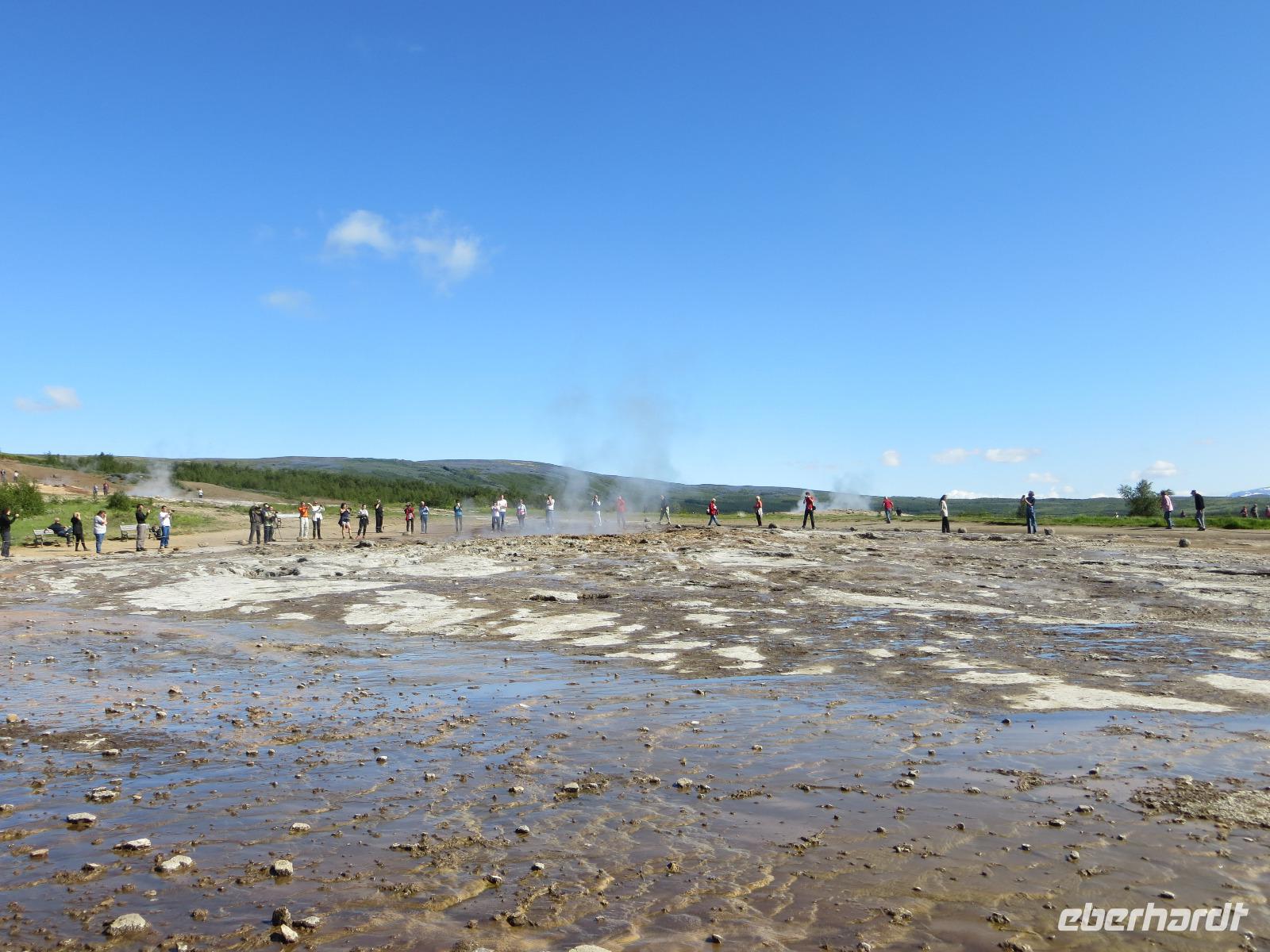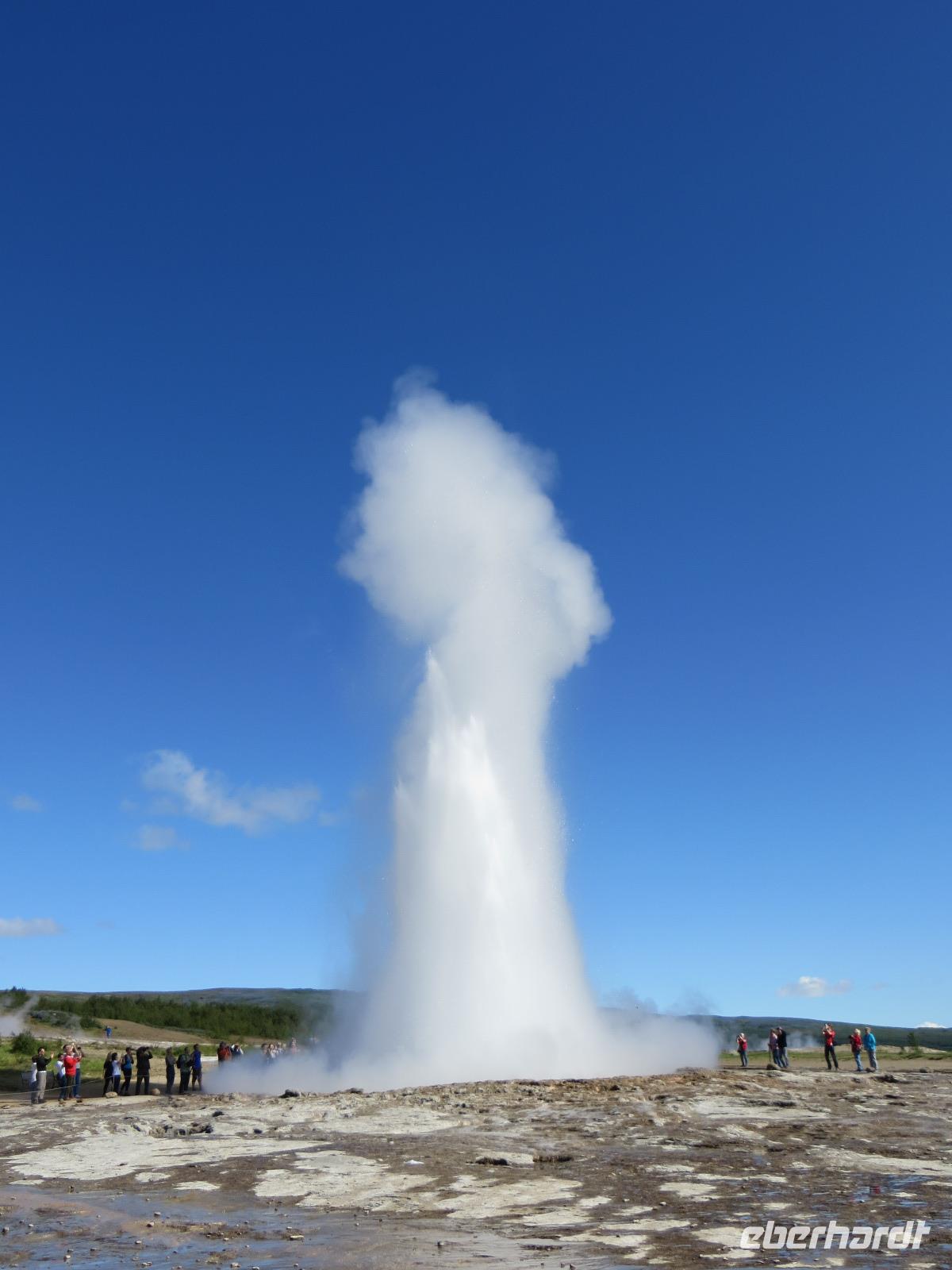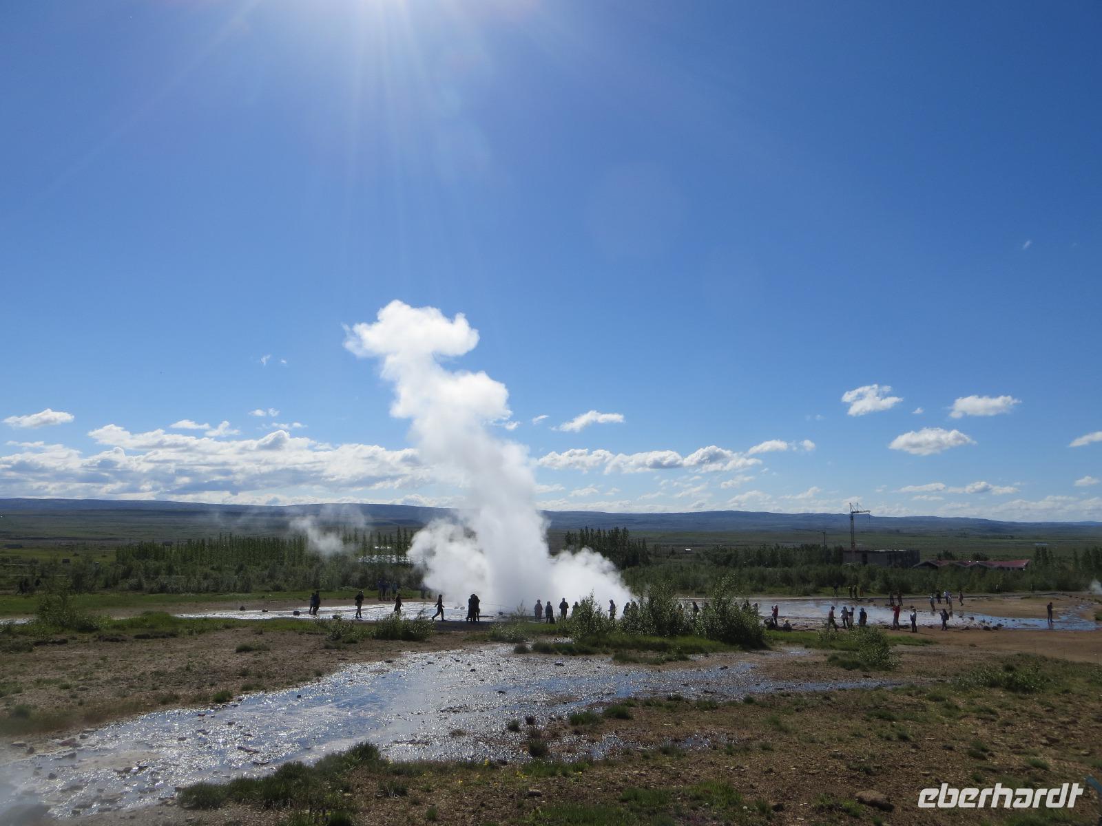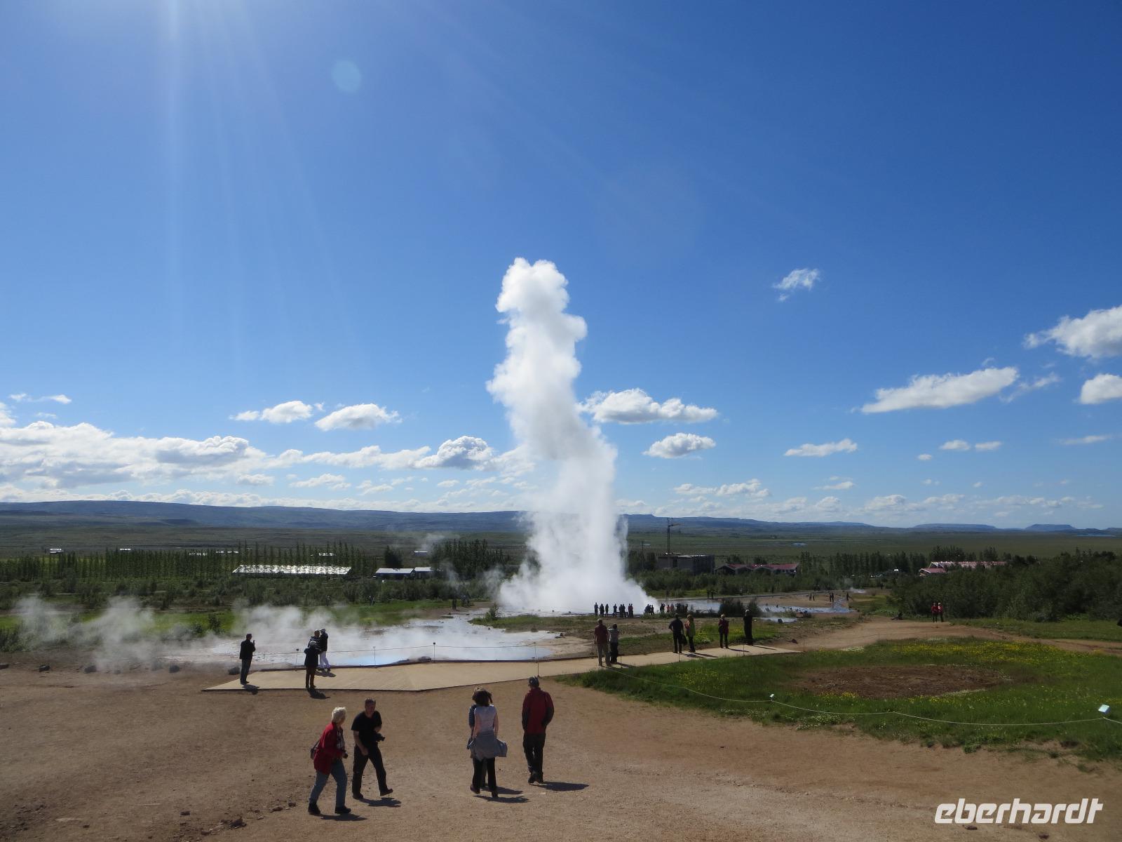 Zum Abschluss unserer Rundreise erwartet uns der sogenannte Goldene Kreis bei herrlichsten Sonnenschein (so wie schon am Vortag). Zunächst aber hat Siggi noch einen kleinen Stopp am Wasserfall Urriðafoss geplant. Obwohl er der wasserreichste Wasserfall Islands ist, ist er nur wenigen bekannt. Wir genießen die tosenden Wassermassen im Morgenlicht ganz in Ruhe und treffen einen Lachsfischer, der uns stolz seinen Fang präsentiert. Anschließend machen wir einen Kurzbesuch in Skalholt, Islands ersten Bischofssitz und dann fahren wir zum Gullfoss, dem goldenen Wasserfall. Hier spazieren wir individuell auf den verschiedenen Besucherwegen und viele von uns kosten die leckere Lammsuppe zum Mittag. Gut gestärkt erreichen wir das Geothermalgebiet Haukadalur und schon bei der Anfahrt sehen wir die hohe Wassersäule des Strokkur in die Höhe schießen. Wir haben ausreichend Zeit, mehreres dieser Ausbrüche zu erleben und die anderen farbenfrohen Quellen zu sehen.