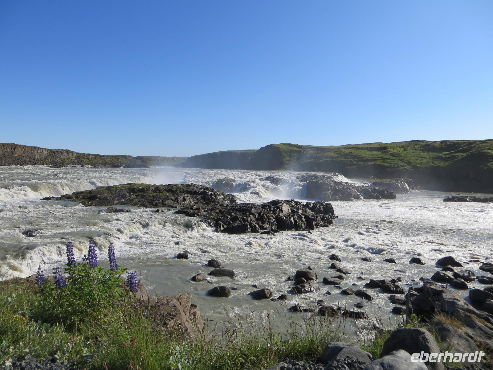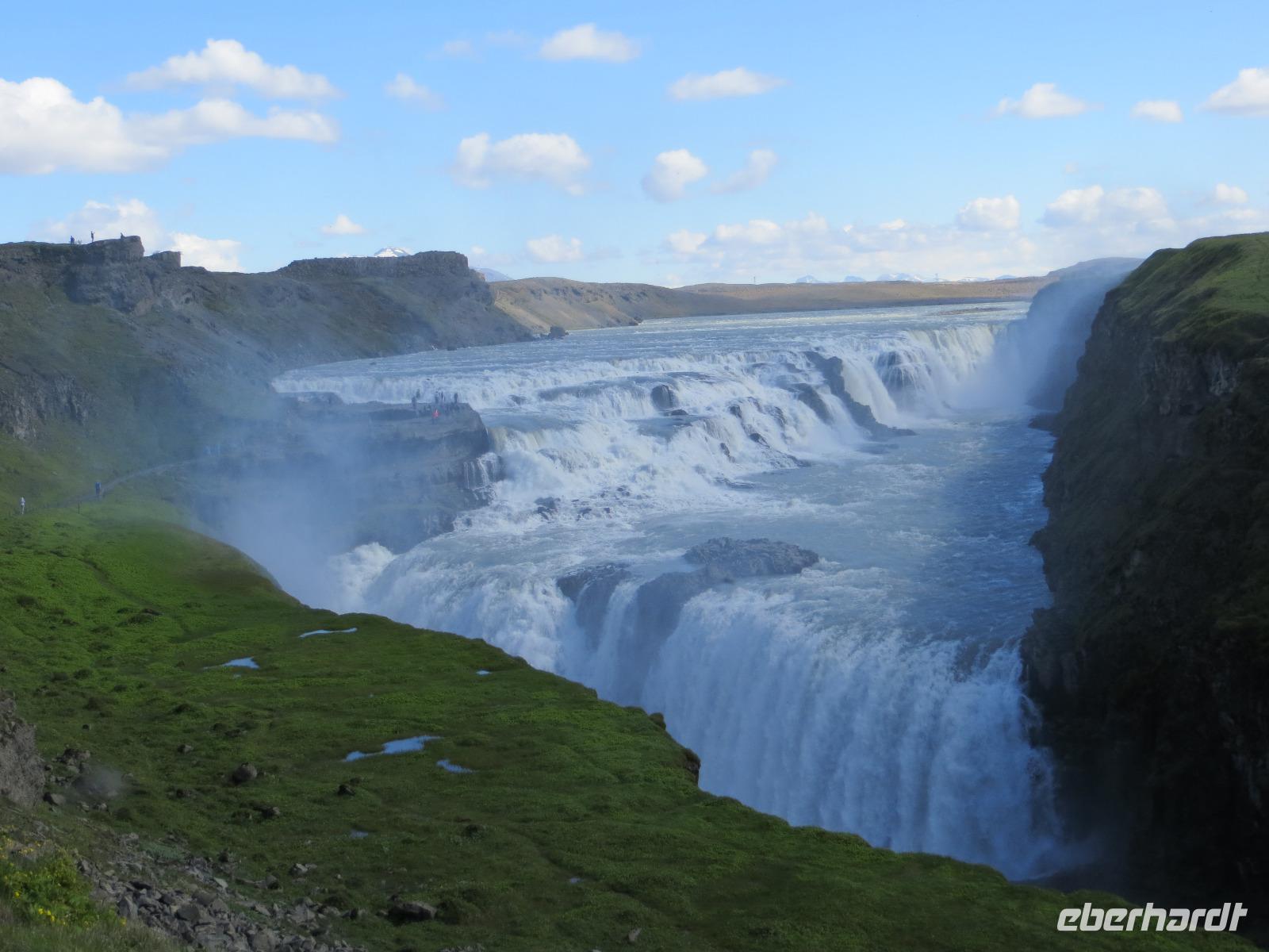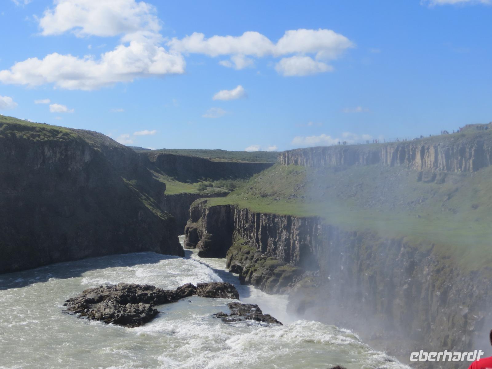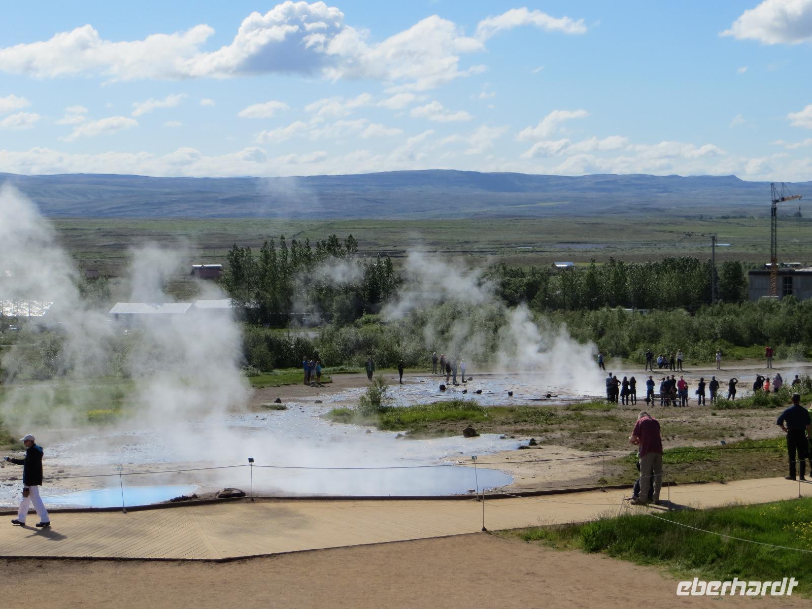 Zum Abschluss unserer Rundreise erwartet uns der sogenannte Goldene Kreis bei herrlichsten Sonnenschein (so wie schon am Vortag). Zunächst aber hat Siggi noch einen kleinen Stopp am Wasserfall Urriðafoss geplant. Obwohl er der wasserreichste Wasserfall Islands ist, ist er nur wenigen bekannt. Wir genießen die tosenden Wassermassen im Morgenlicht ganz in Ruhe und treffen einen Lachsfischer, der uns stolz seinen Fang präsentiert. Anschließend machen wir einen Kurzbesuch in Skalholt, Islands ersten Bischofssitz und dann fahren wir zum Gullfoss, dem goldenen Wasserfall. Hier spazieren wir individuell auf den verschiedenen Besucherwegen und viele von uns kosten die leckere Lammsuppe zum Mittag. Gut gestärkt erreichen wir das Geothermalgebiet Haukadalur und schon bei der Anfahrt sehen wir die hohe Wassersäule des Strokkur in die Höhe schießen. Wir haben ausreichend Zeit, mehreres dieser Ausbrüche zu erleben und die anderen farbenfrohen Quellen zu sehen.