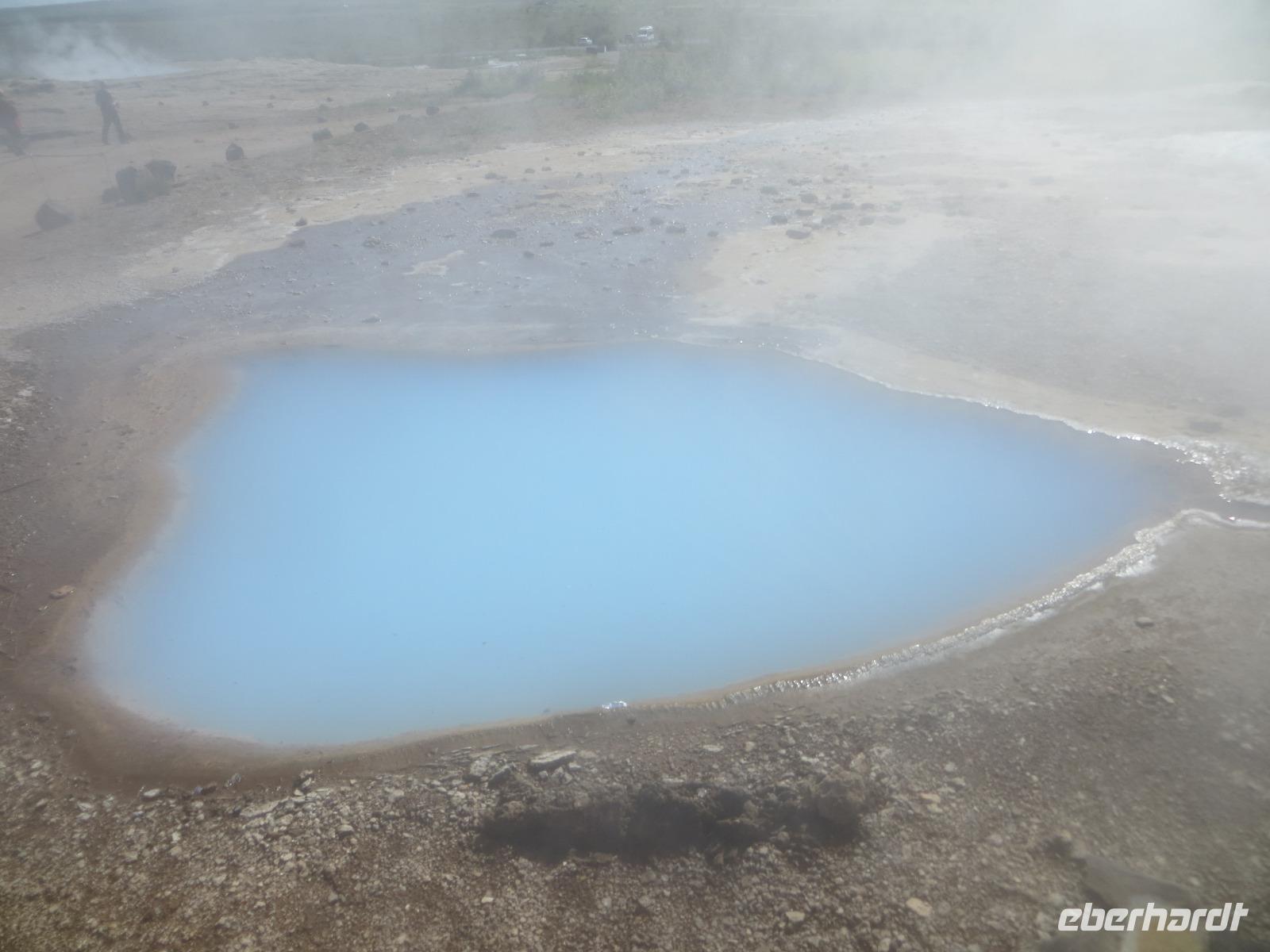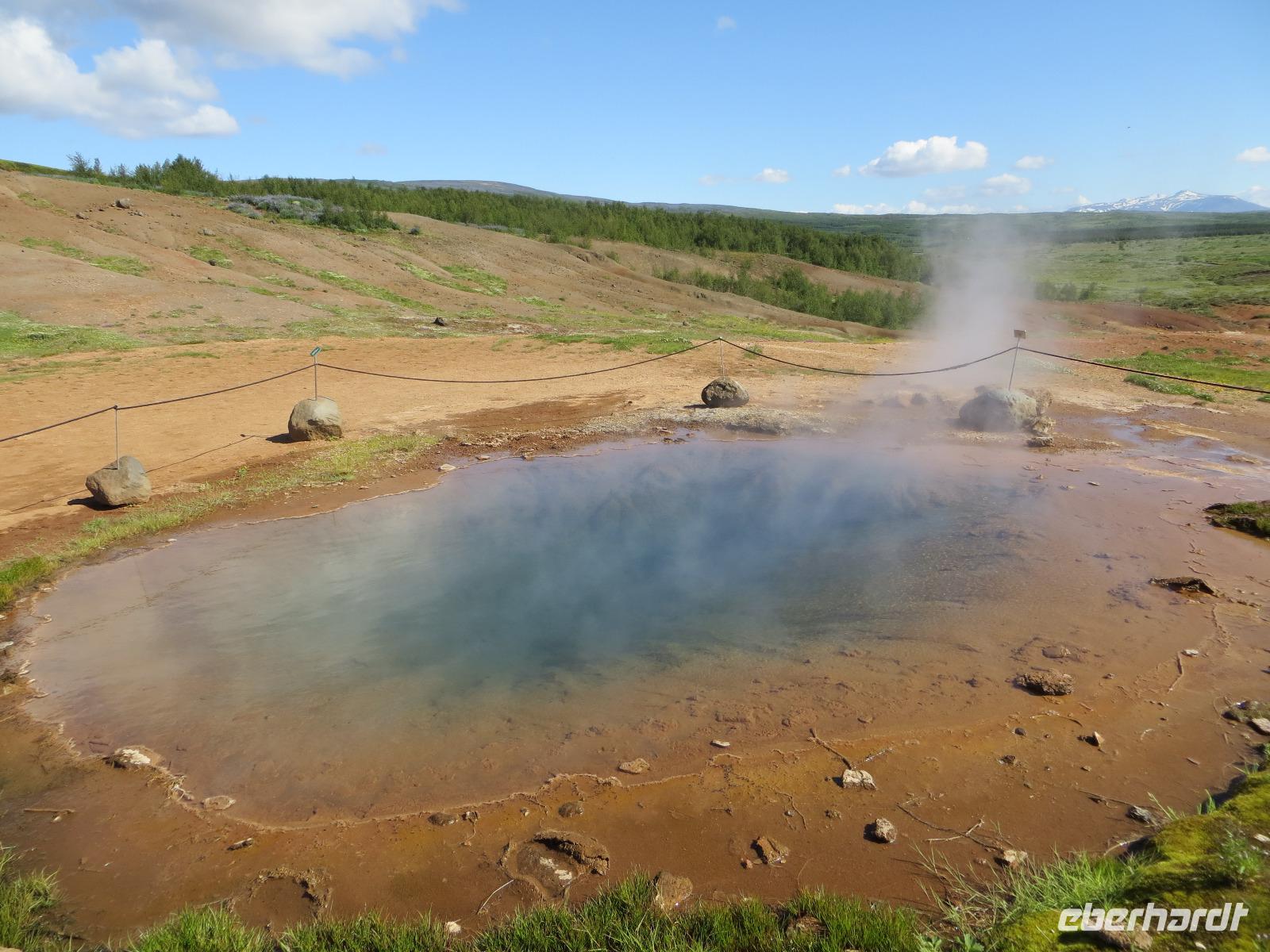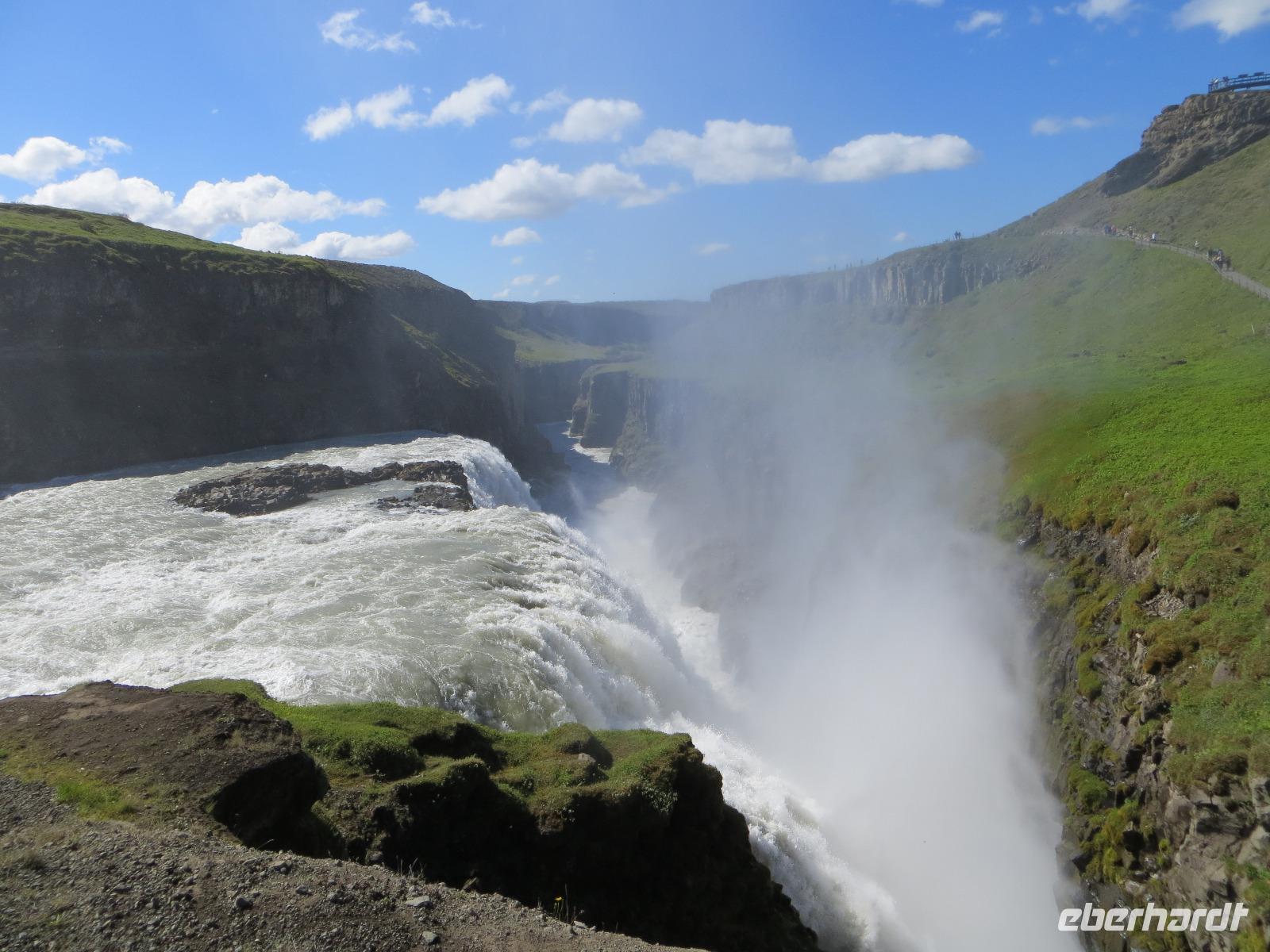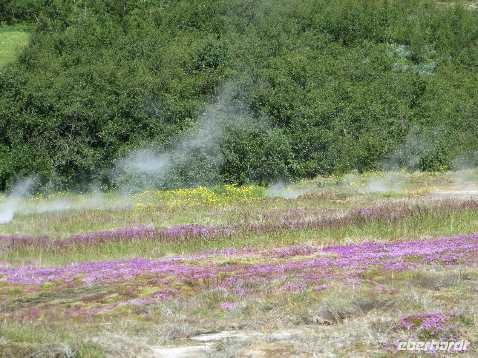 Zum Abschluss unserer Rundreise erwartet uns der sogenannte Goldene Kreis bei herrlichsten Sonnenschein (so wie schon am Vortag). Zunächst aber hat Siggi noch einen kleinen Stopp am Wasserfall Urriðafoss geplant. Obwohl er der wasserreichste Wasserfall Islands ist, ist er nur wenigen bekannt. Wir genießen die tosenden Wassermassen im Morgenlicht ganz in Ruhe und treffen einen Lachsfischer, der uns stolz seinen Fang präsentiert. Anschließend machen wir einen Kurzbesuch in Skalholt, Islands ersten Bischofssitz und dann fahren wir zum Gullfoss, dem goldenen Wasserfall. Hier spazieren wir individuell auf den verschiedenen Besucherwegen und viele von uns kosten die leckere Lammsuppe zum Mittag. Gut gestärkt erreichen wir das Geothermalgebiet Haukadalur und schon bei der Anfahrt sehen wir die hohe Wassersäule des Strokkur in die Höhe schießen. Wir haben ausreichend Zeit, mehreres dieser Ausbrüche zu erleben und die anderen farbenfrohen Quellen zu sehen.