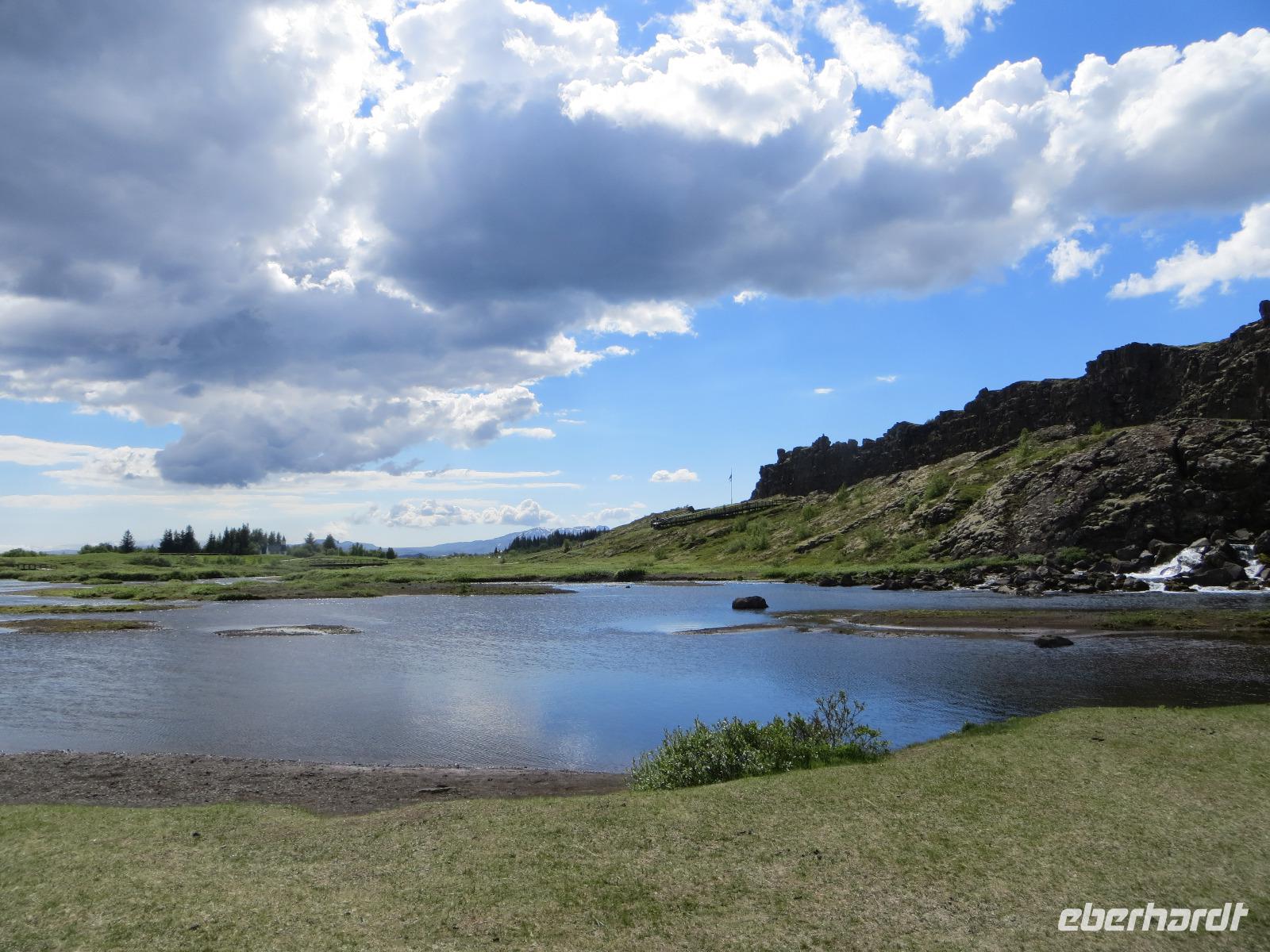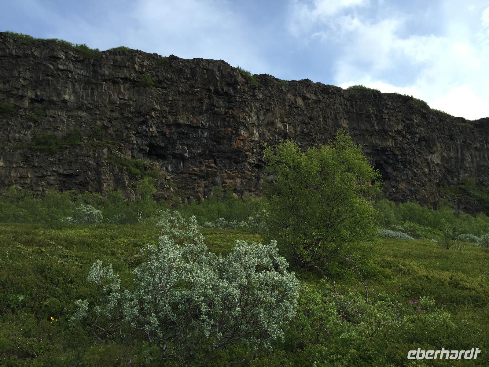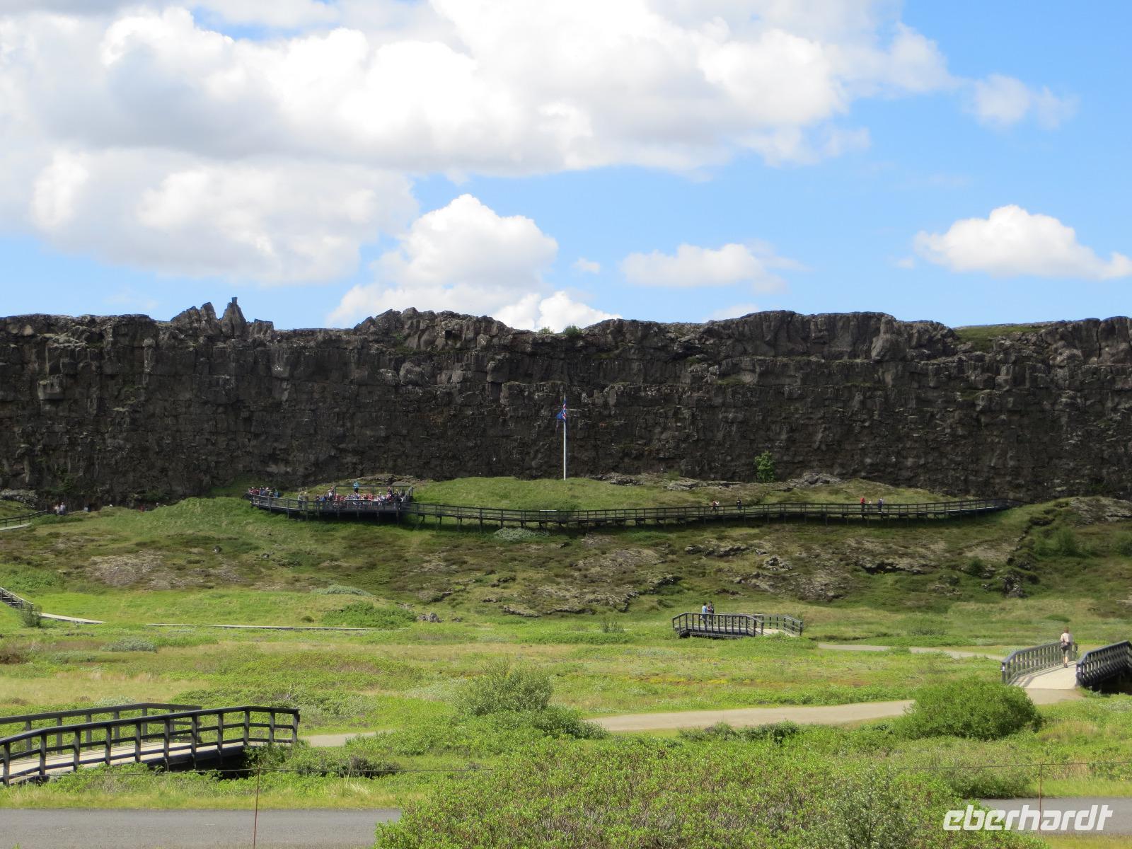 Unser letzter Besichtigungspunkt für heute bzw. der gesamten Reise ist der Nationalpark Thingvellir. Hier driften die eurasische und die nordamerikanische Kontinentalplatte auseinander. Wir wandern bis zum alten, traditionsreichen Thingplatz. Hier verspeisen wir die letzten Zimtschnecken zusammen mit einem Brennevin oder Opal. Dann spazieren wir weiter durch die Allmännerschlucht bis zur Aussichtsplattform. Per Bus gelangen wir etwas abseits der üblichen Strecken noch einmal durch das dampfende Geothermalfelder und an einem weiteren Aussichtspunkt überrascht uns Siggi mit einem kleinen Island-Gläslein als Andenken an unsere Reise ... natürlich gut gefüllt mit Brennevin.