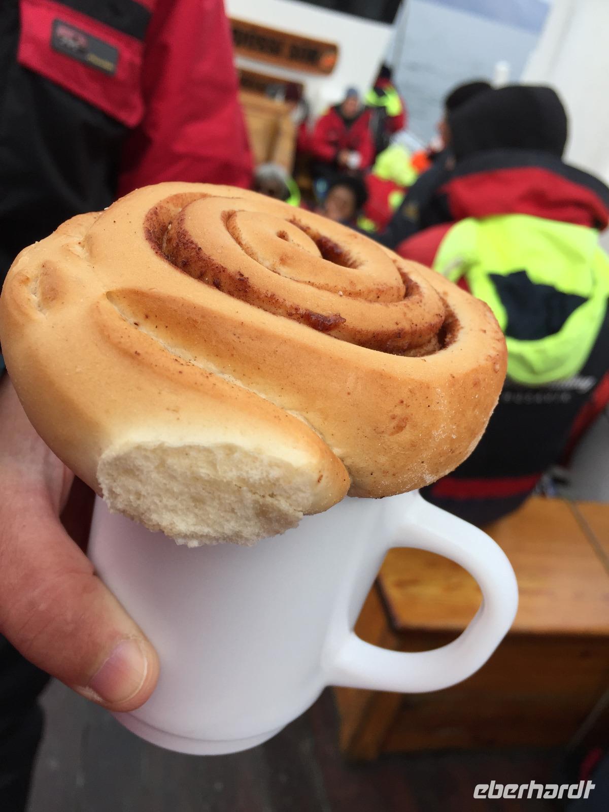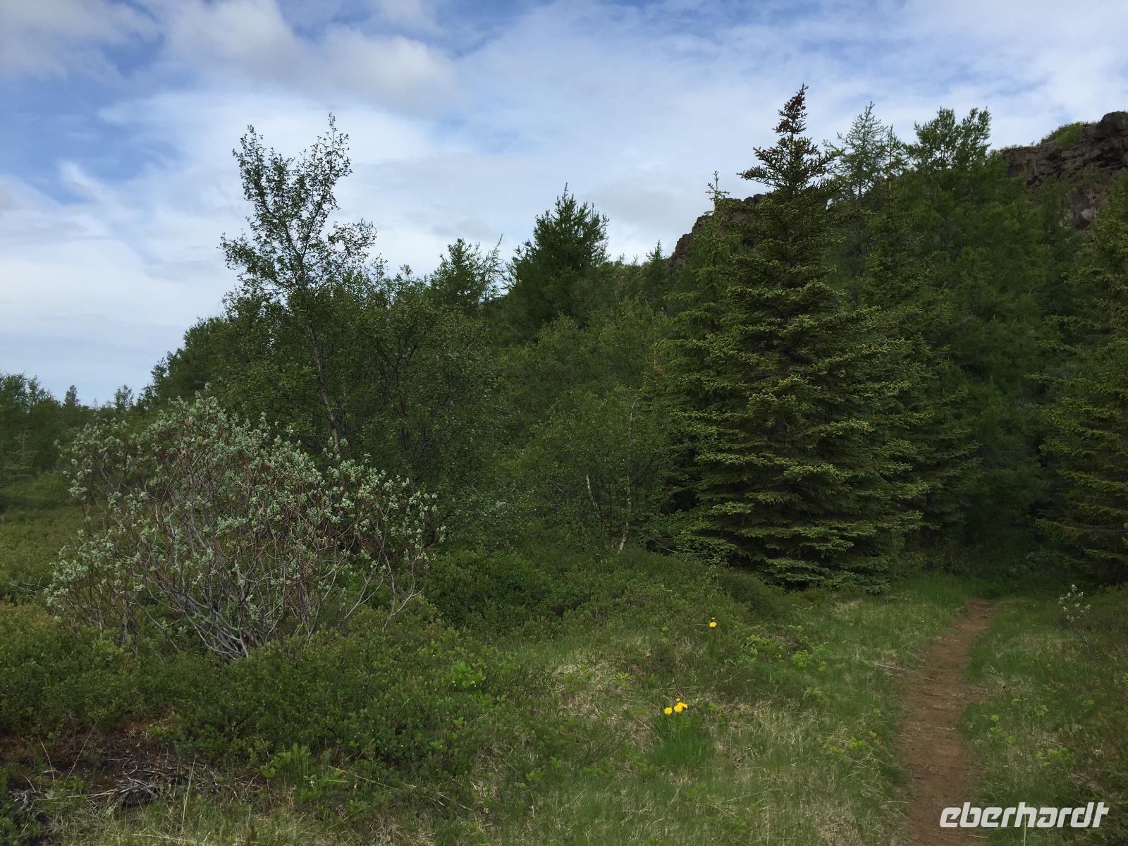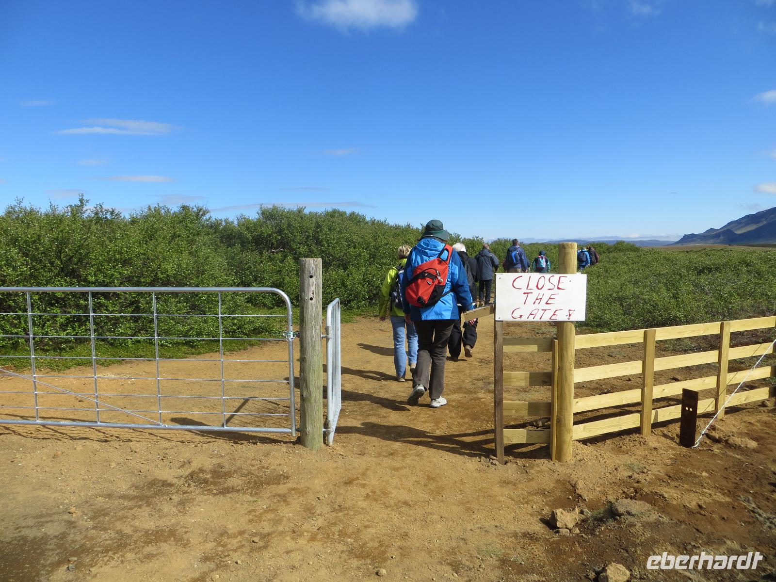 Unser letzter Besichtigungspunkt für heute bzw. der gesamten Reise ist der Nationalpark Thingvellir. Hier driften die eurasische und die nordamerikanische Kontinentalplatte auseinander. Wir wandern bis zum alten, traditionsreichen Thingplatz. Hier verspeisen wir die letzten Zimtschnecken zusammen mit einem Brennevin oder Opal. Dann spazieren wir weiter durch die Allmännerschlucht bis zur Aussichtsplattform. Per Bus gelangen wir etwas abseits der üblichen Strecken noch einmal durch das dampfende Geothermalfelder und an einem weiteren Aussichtspunkt überrascht uns Siggi mit einem kleinen Island-Gläslein als Andenken an unsere Reise ... natürlich gut gefüllt mit Brennevin.