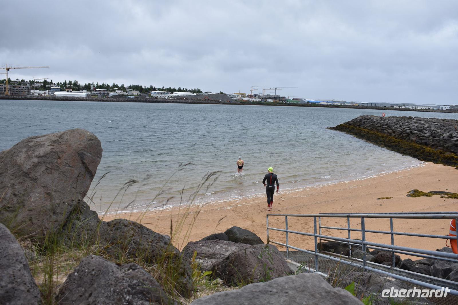 Snorre zeigte uns auch einen beliebten Badeplatz der Einheimischen, ein Strandbad Namens Nauthólsvík - soweit so gut. Doch wenn man bedenkt das ein eisiger Wind umher fegt und das Wasser maximal 11 Grad Celsius hat, überlegt man sich schon ob man da baden geht. Aber glücklicherweise haben die Isländer immer einen warmen Pool in der Nähe, der mit dem Wasser einer heißen Quelle gespeist wird. Und wie das eben ist, denn in Island kennt jeder doch so ziemlich jeden, trifft Snorre eine alte Freundin, die berühmte isländische Opernsängerin Dora, die gerade ins kalte Nass hüpft.