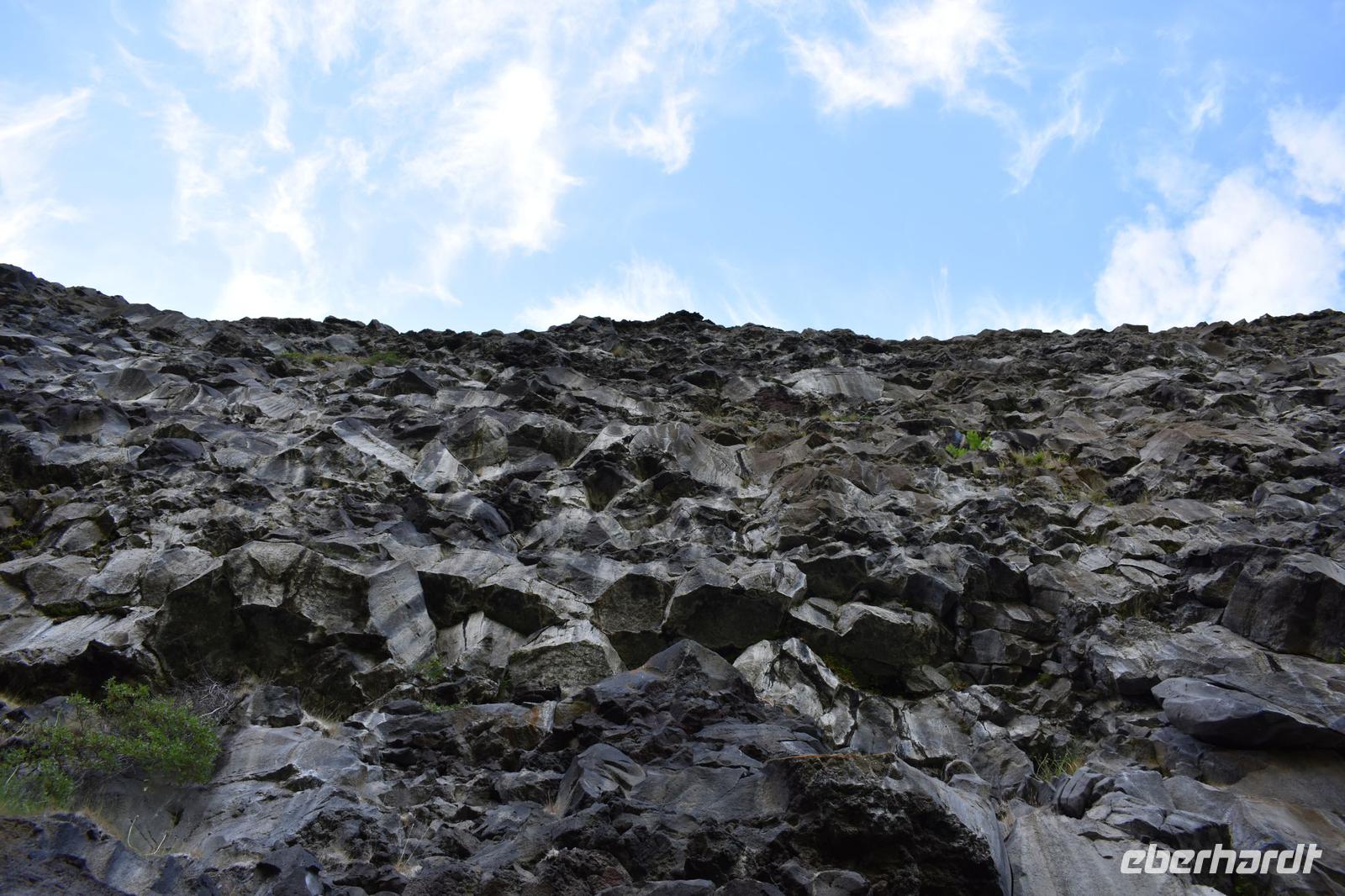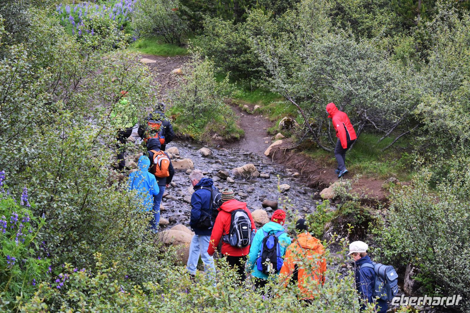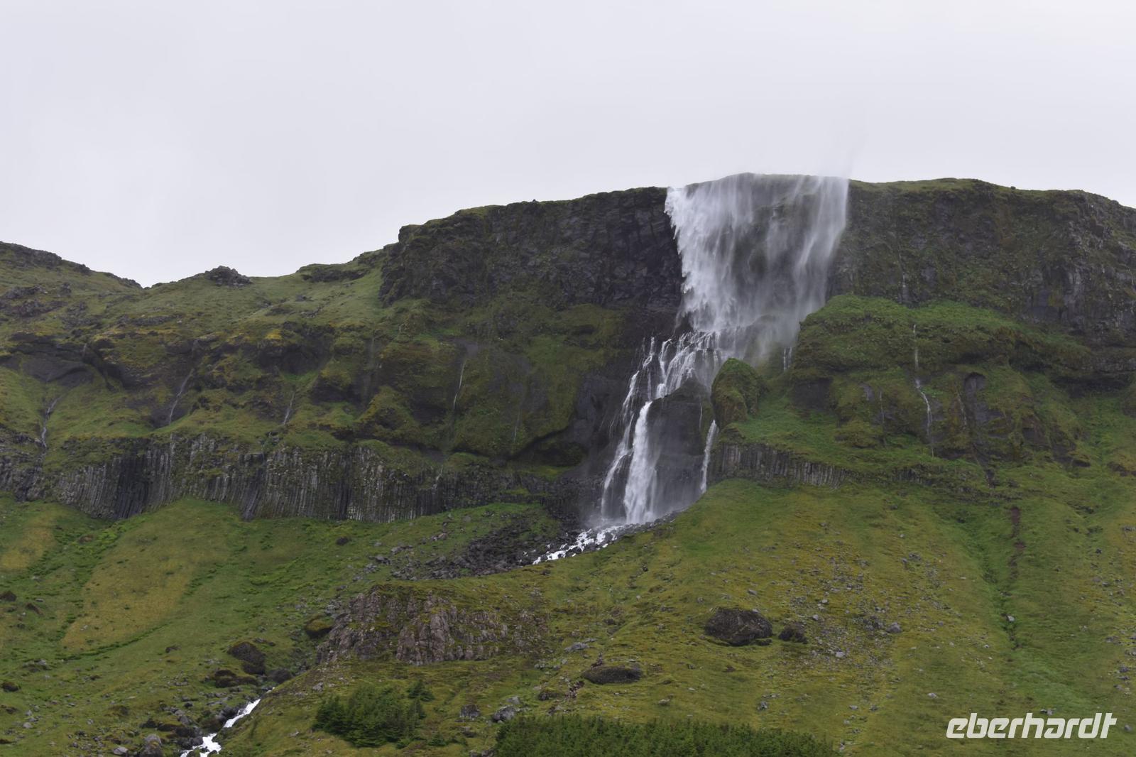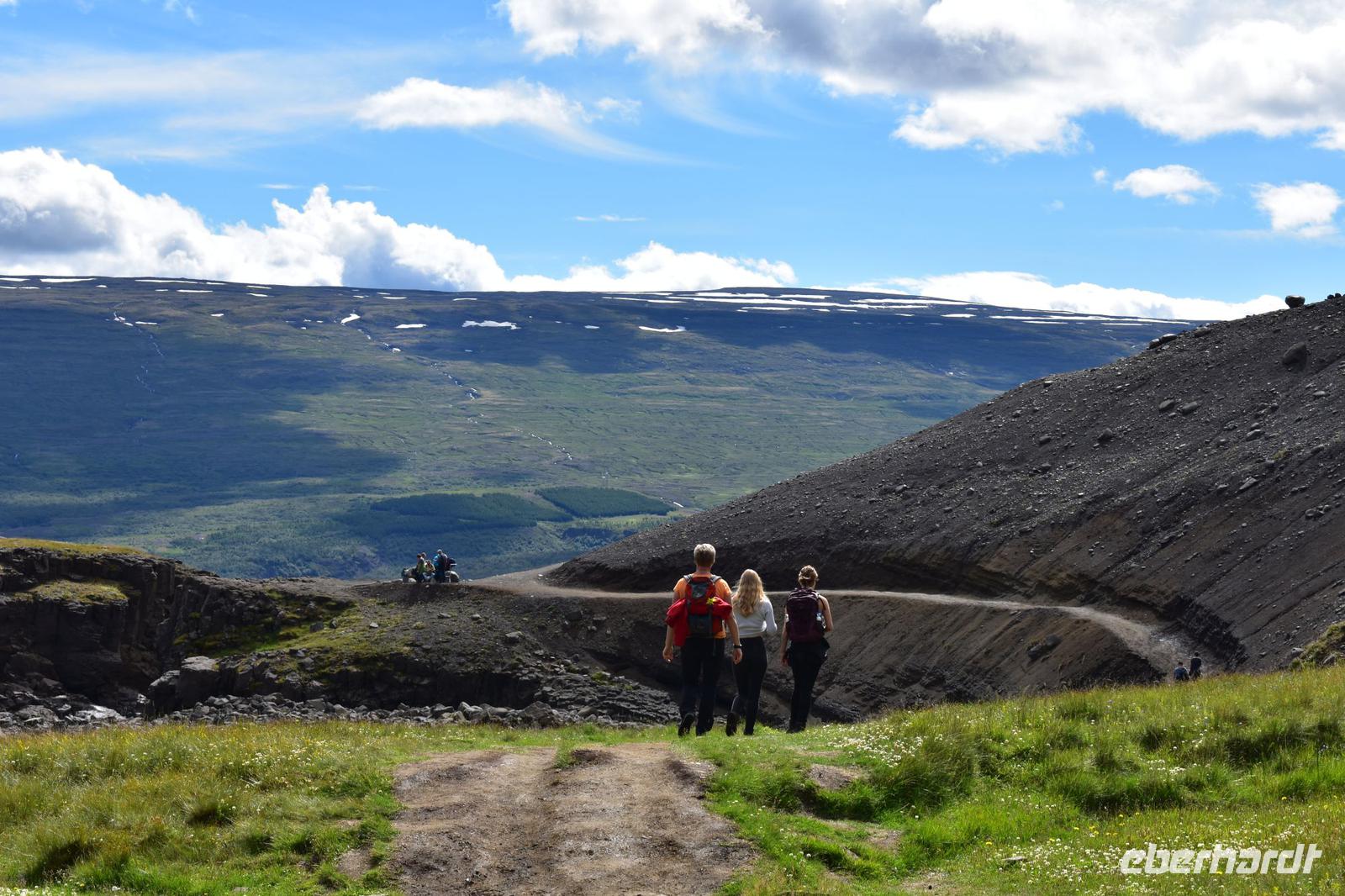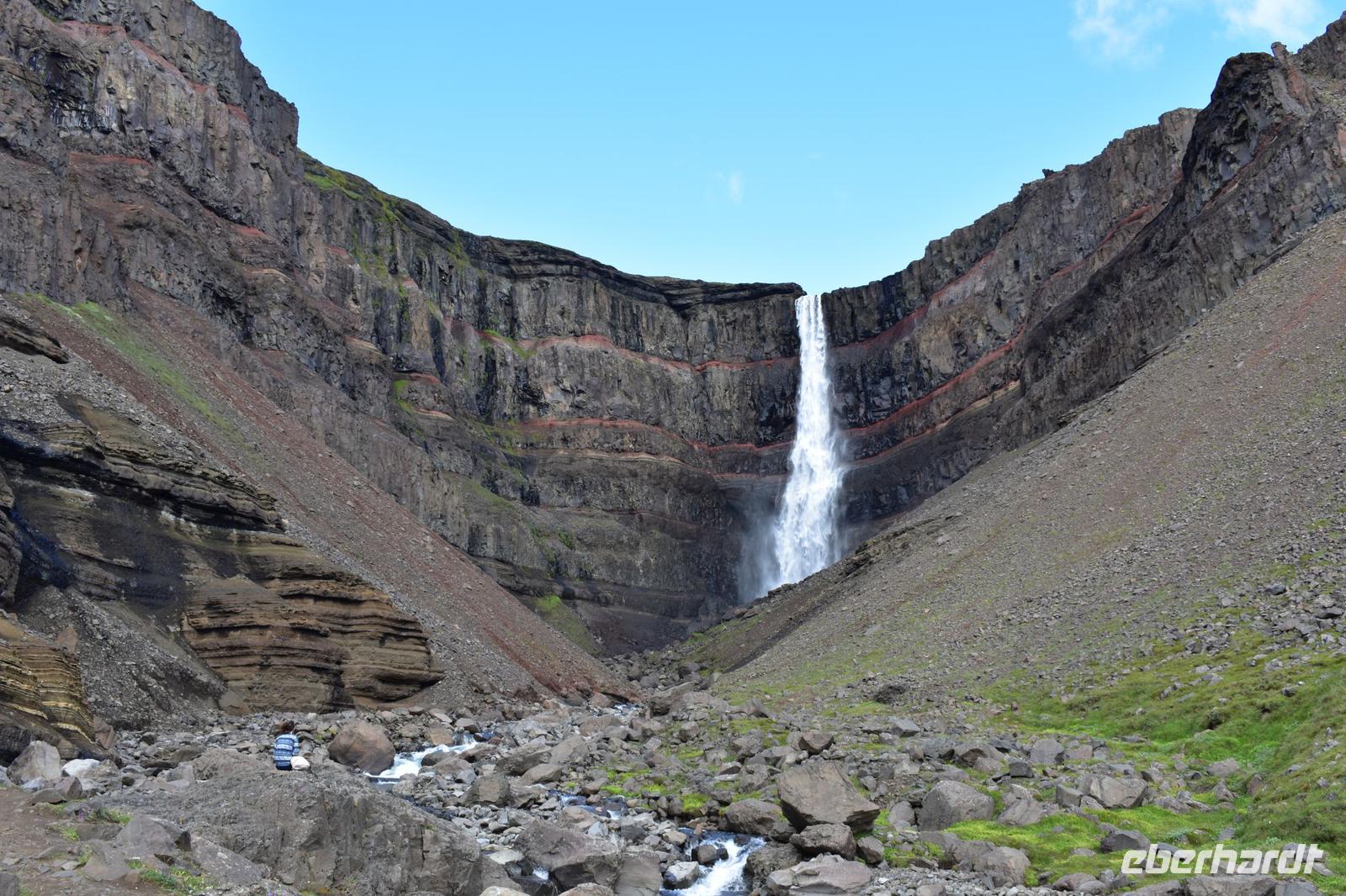Morgens ging es los und wir fuhren die halbe Stunde nach Egilsstaðir. Klara versorgte unser Fahrzeug in der Werkstatt, wir gingen in der Zeit in den Supermarkt und versorgten uns mit dem Nötigsten für die nächsten Tage. Der Bus war schnell wieder Fahrtauglich und wir setzten unsere Reise fort. Wir fuhren durch Islands größtes Waldgebiet, dem Hallormsstaðaskógur, mit rund 7,4 Quadratkilometern Fläche. Direkt am See Lögurinn gelegen war dann auch unser erster Halt zur Besichtigung. Zu Fuß ging es die Hügel hinauf. Diese Seite des Tals war wieder weniger bewaldet, aber dafür hatte man einen hervorragenden Blick. Zu erst kamen wir zum Wasserfall Litlanesfoss, der phänomenal mit kantigen Basaltsäulen eingerahmt ist. Es ging weiter nach oben bis zum Hengifoss, der wiederum intensiv-rote Ablagerungen zwischen den einzelnen Lavaschichten aufweist.