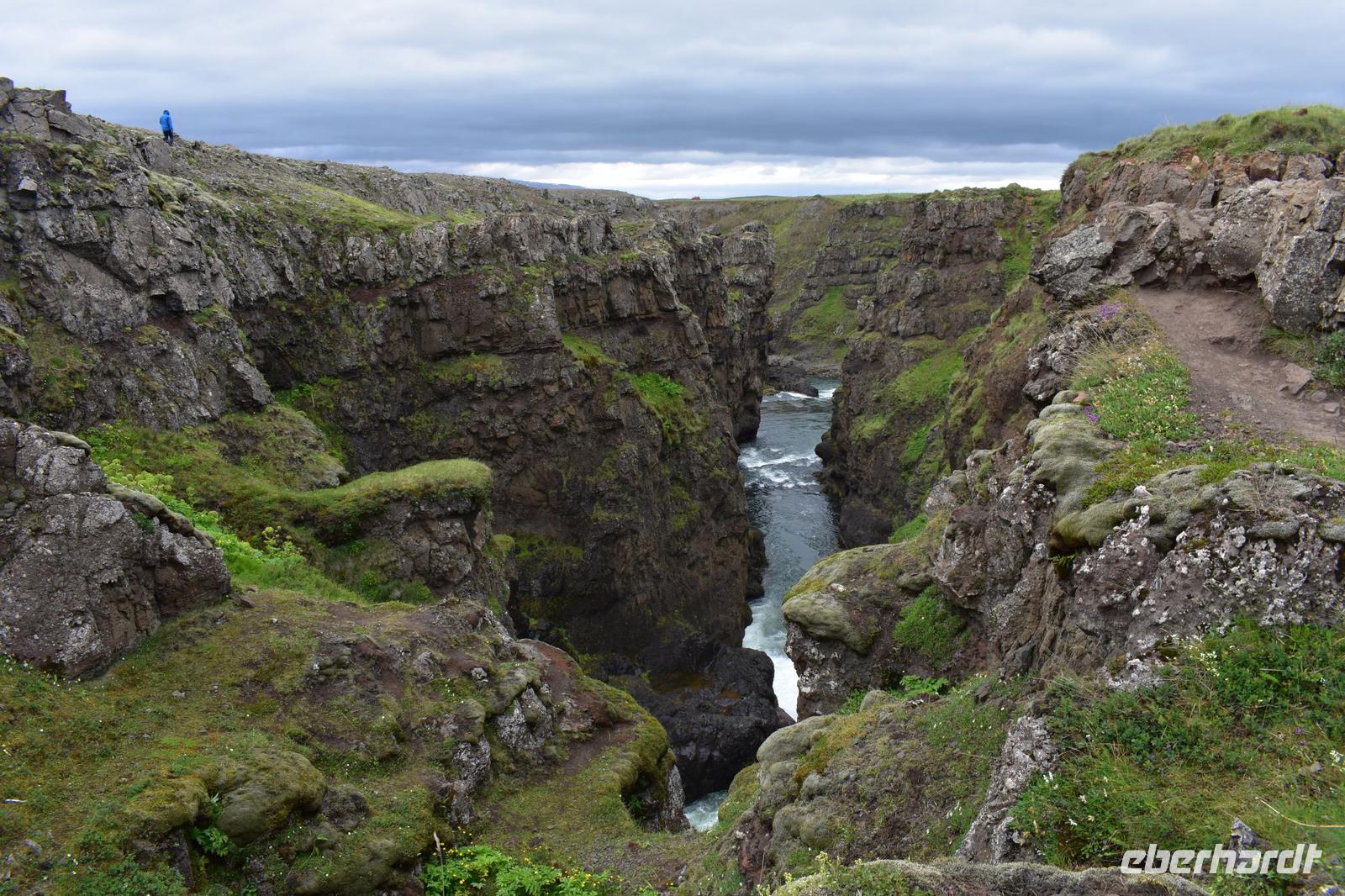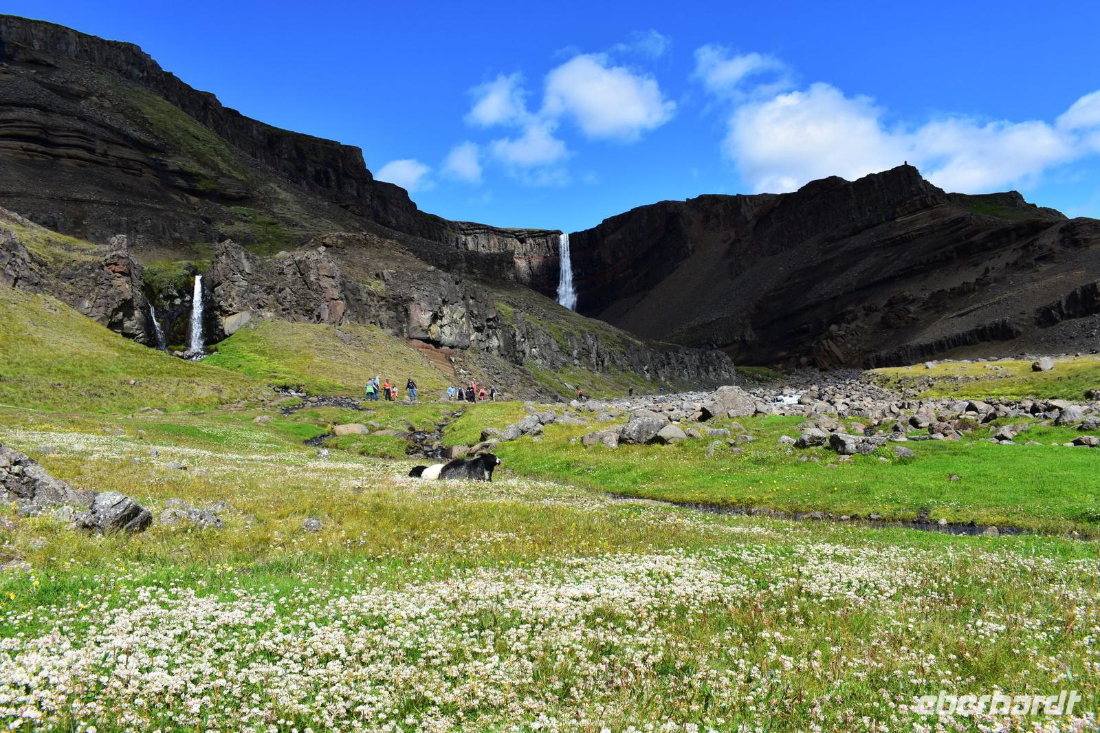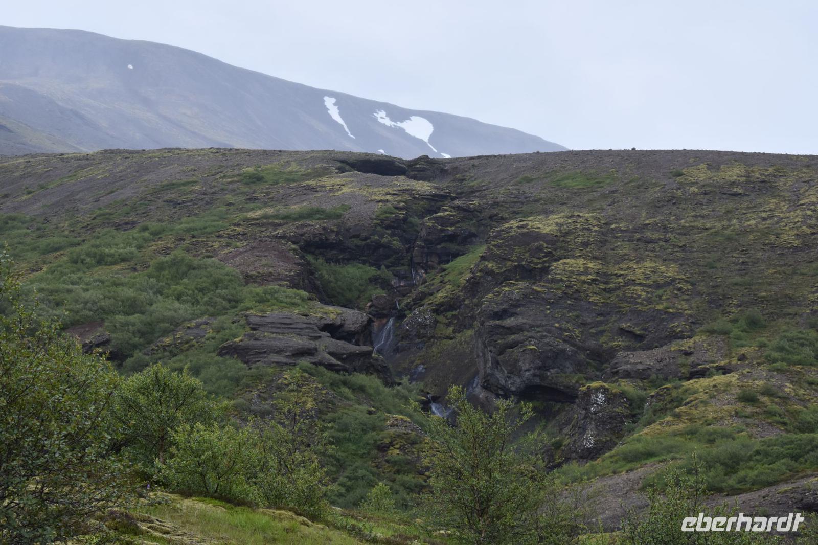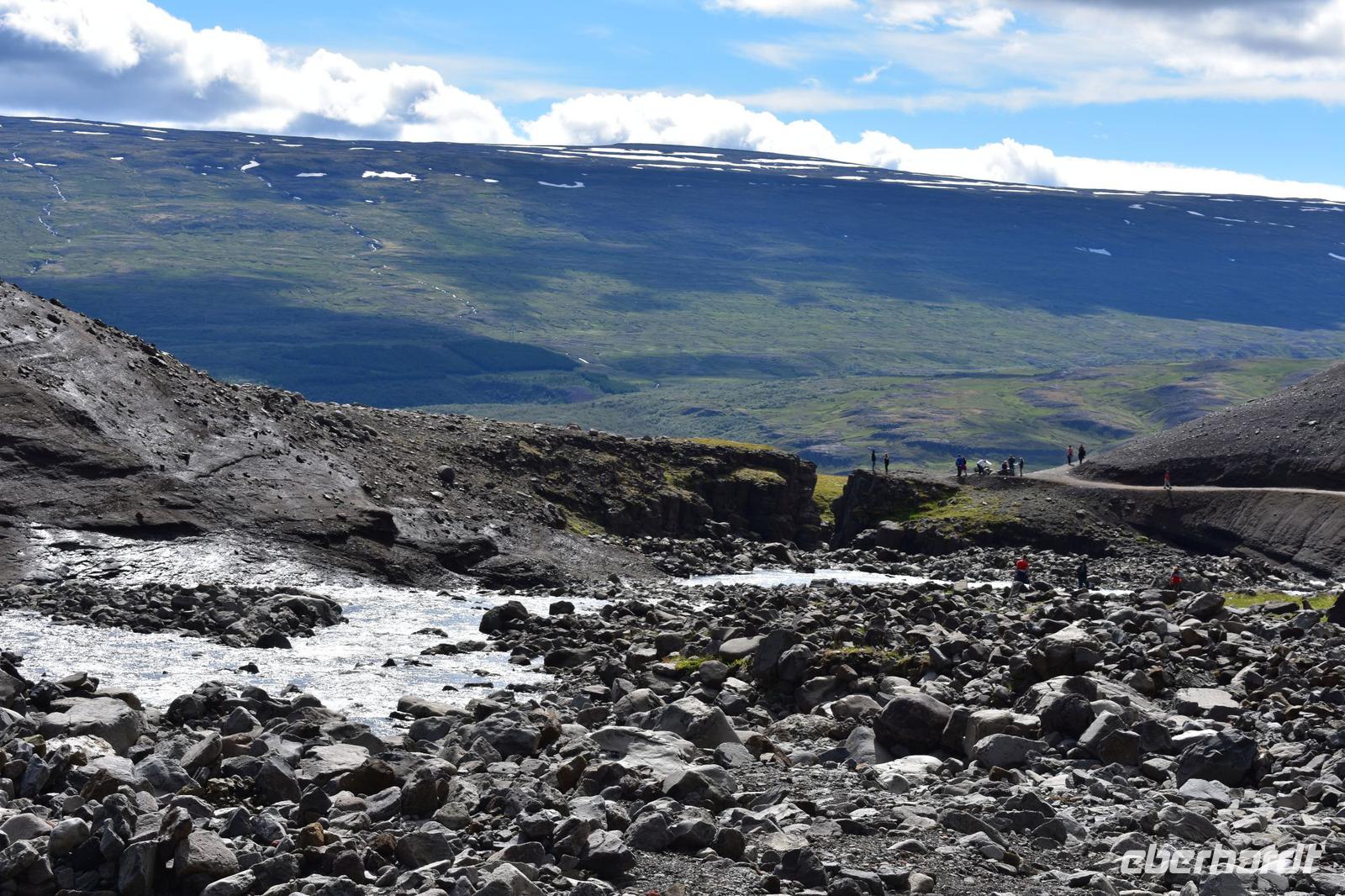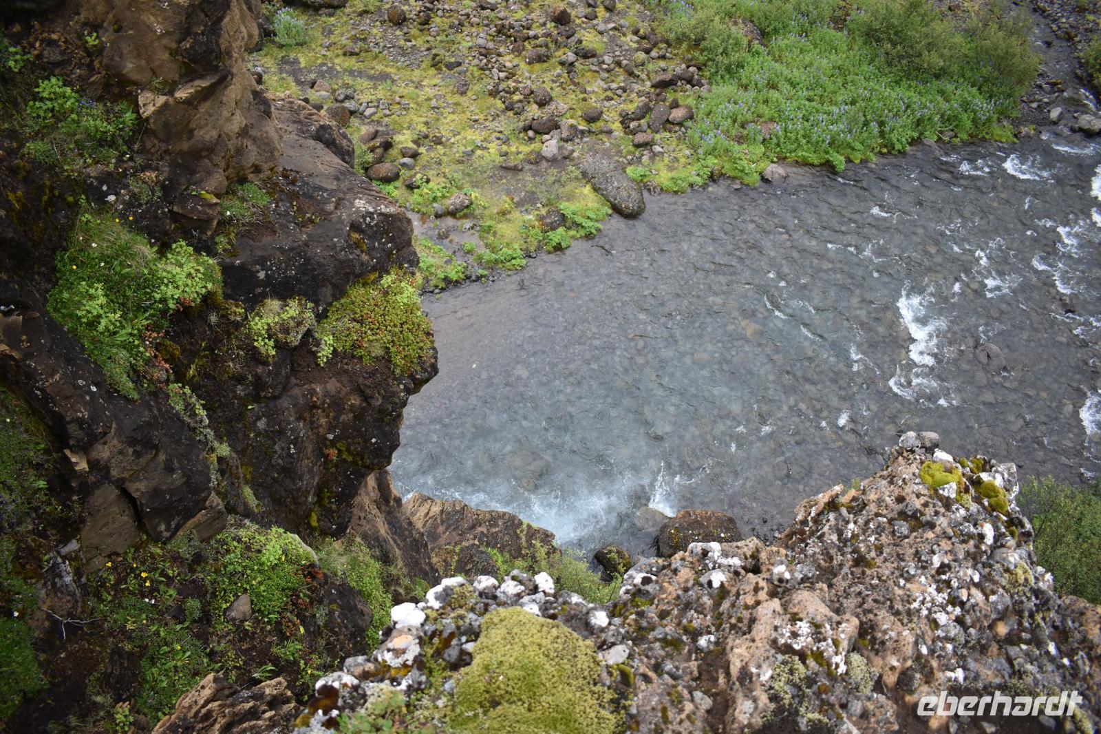 Wir verließen dieses Naturspektakel und machten einen kurzen Abstecher über unwegsames Gelände zum Hafragilsfoss. Aber die Überfahrt über den spitzen, buckeligen Berg lohnte sich. So hatten wir noch einen grandiosen Blick in den Canyon und konnten die sonderbaren violetten Vulkangesteine beobachten.