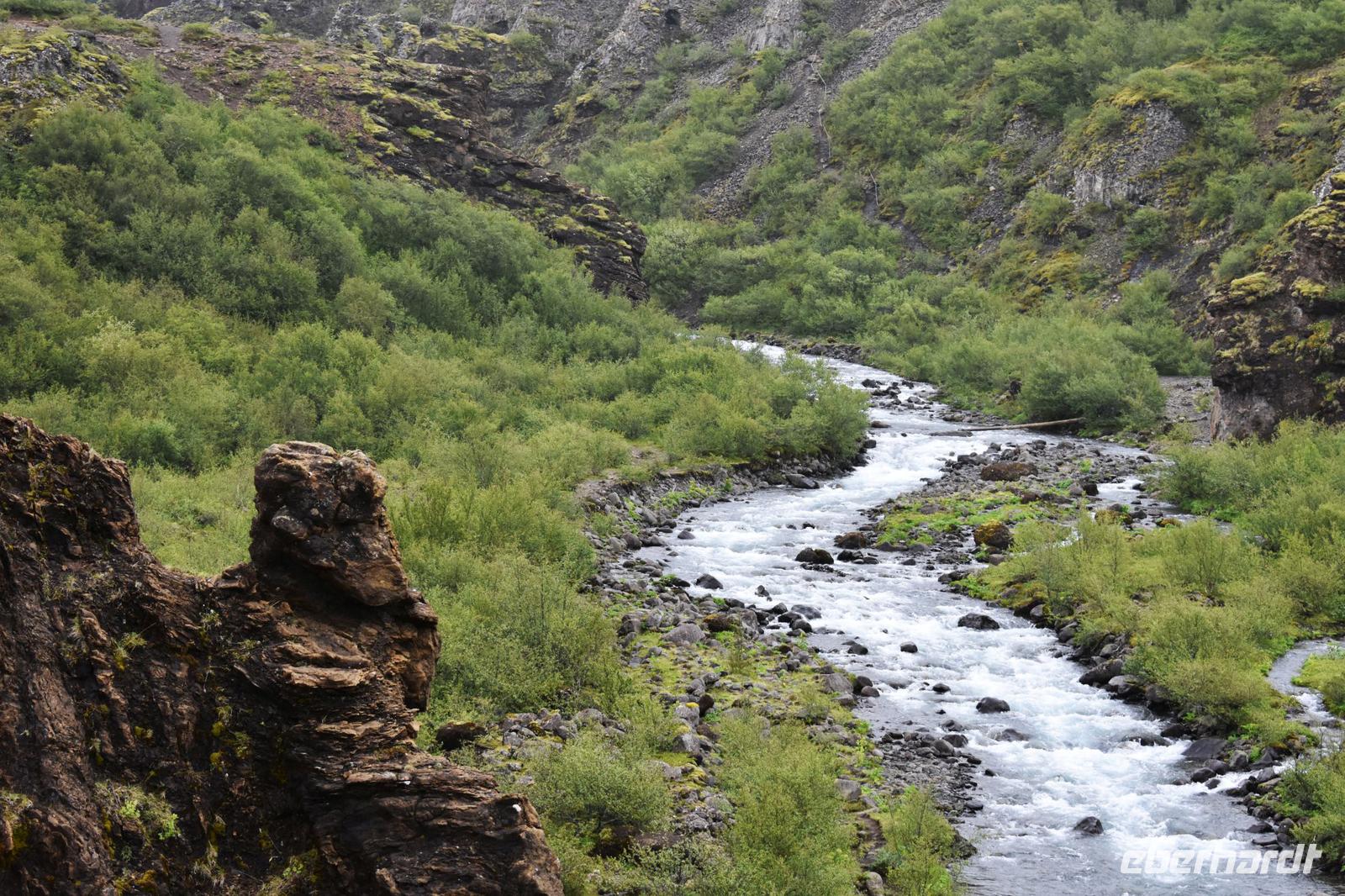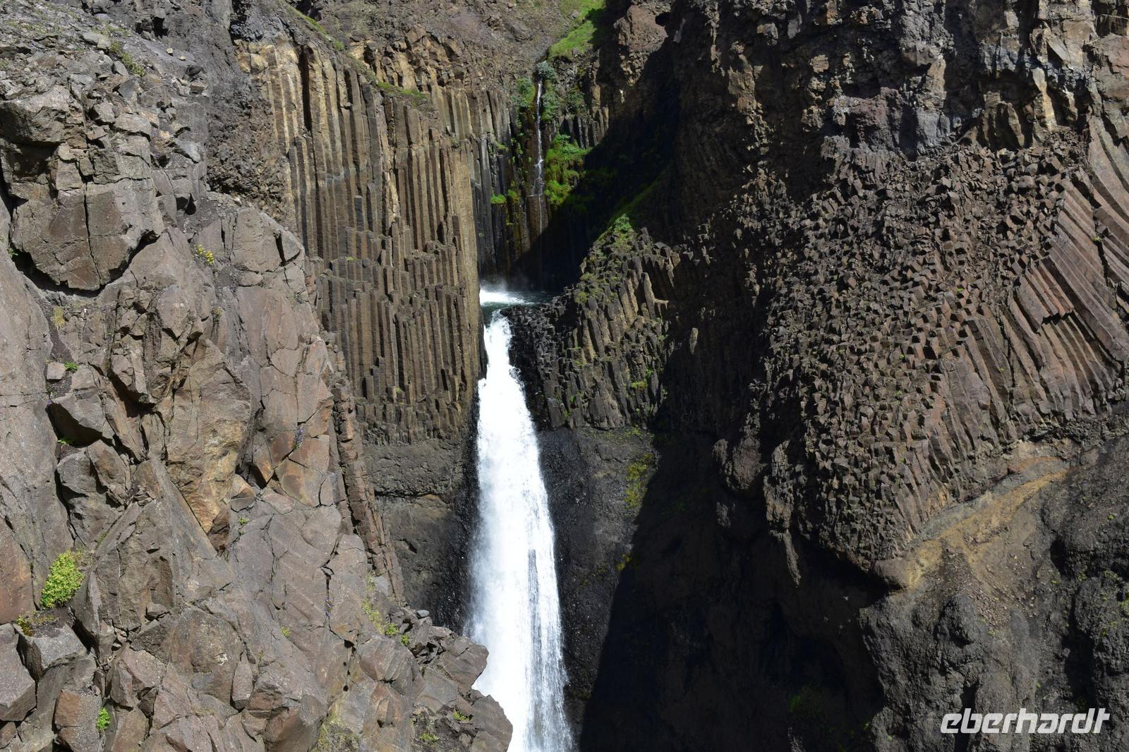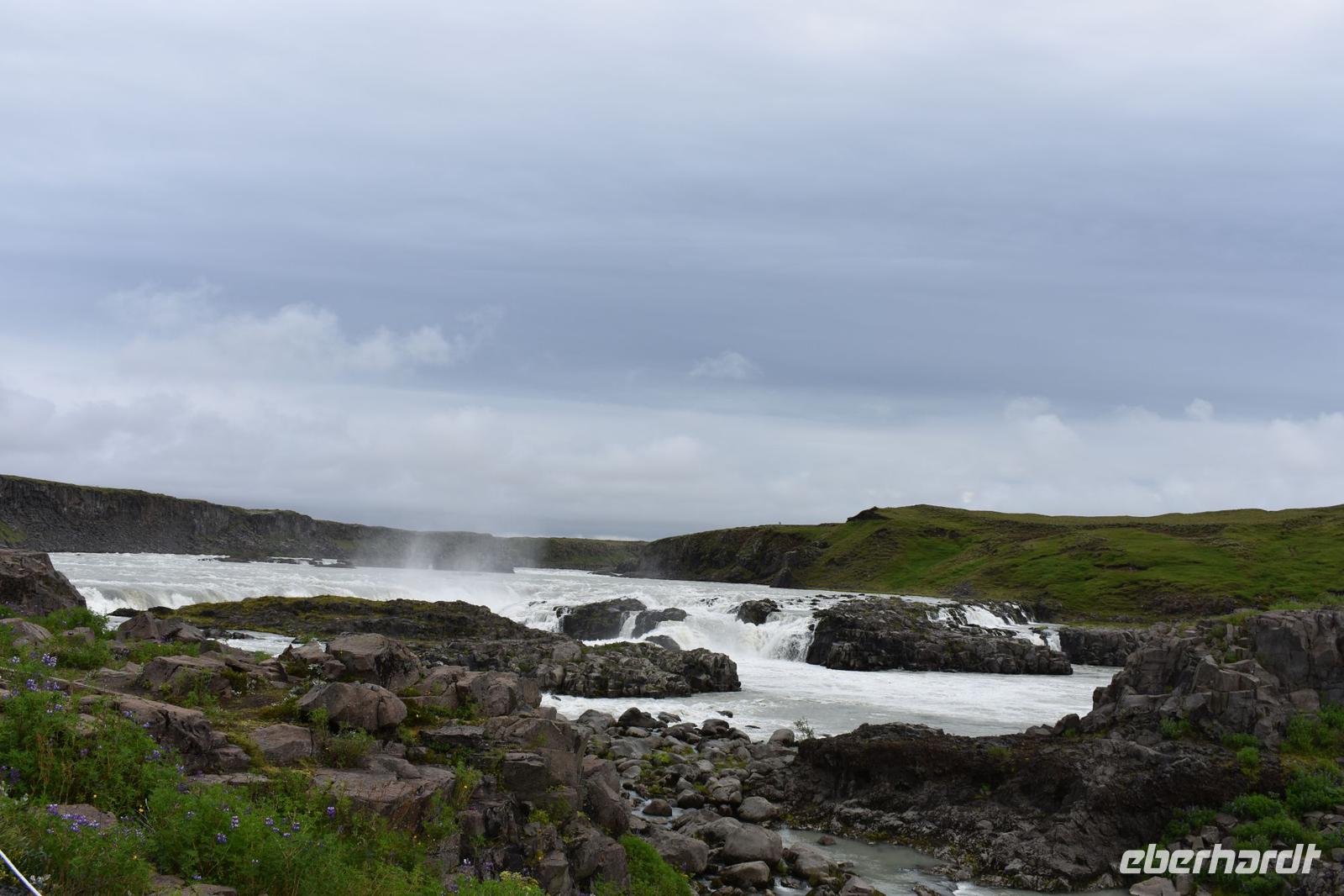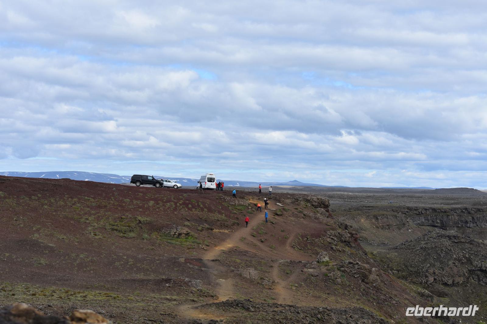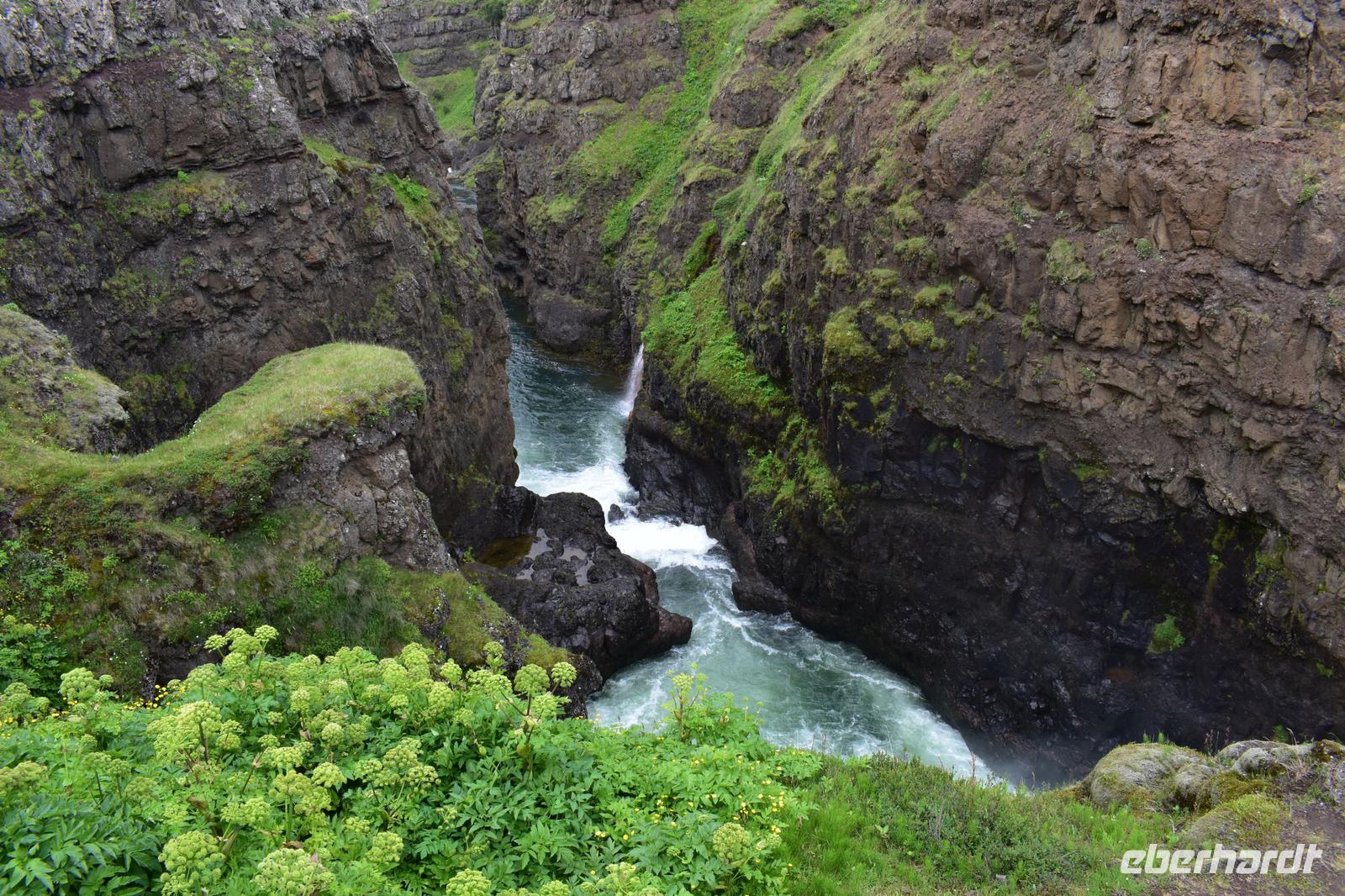 Wir verließen dieses Naturspektakel und machten einen kurzen Abstecher über unwegsames Gelände zum Hafragilsfoss. Aber die Überfahrt über den spitzen, buckeligen Berg lohnte sich. So hatten wir noch einen grandiosen Blick in den Canyon und konnten die sonderbaren violetten Vulkangesteine beobachten.