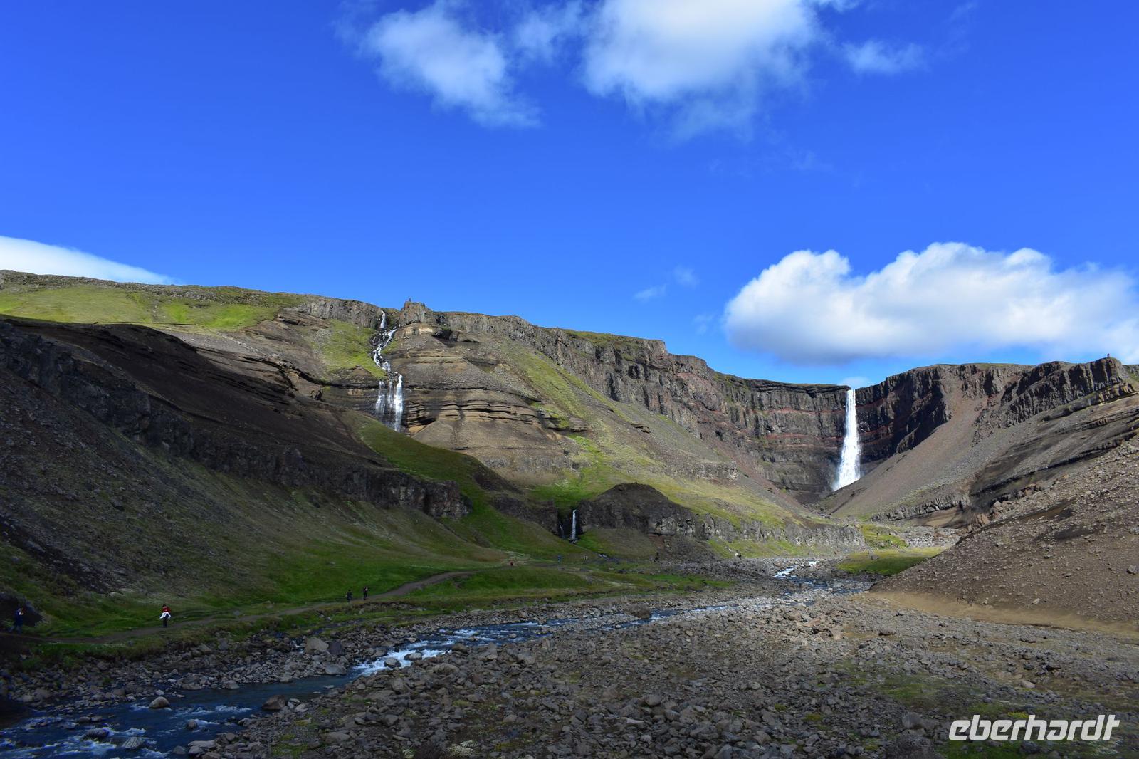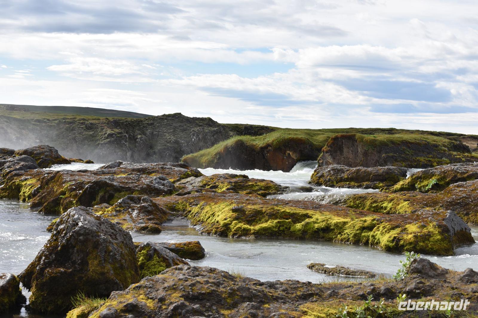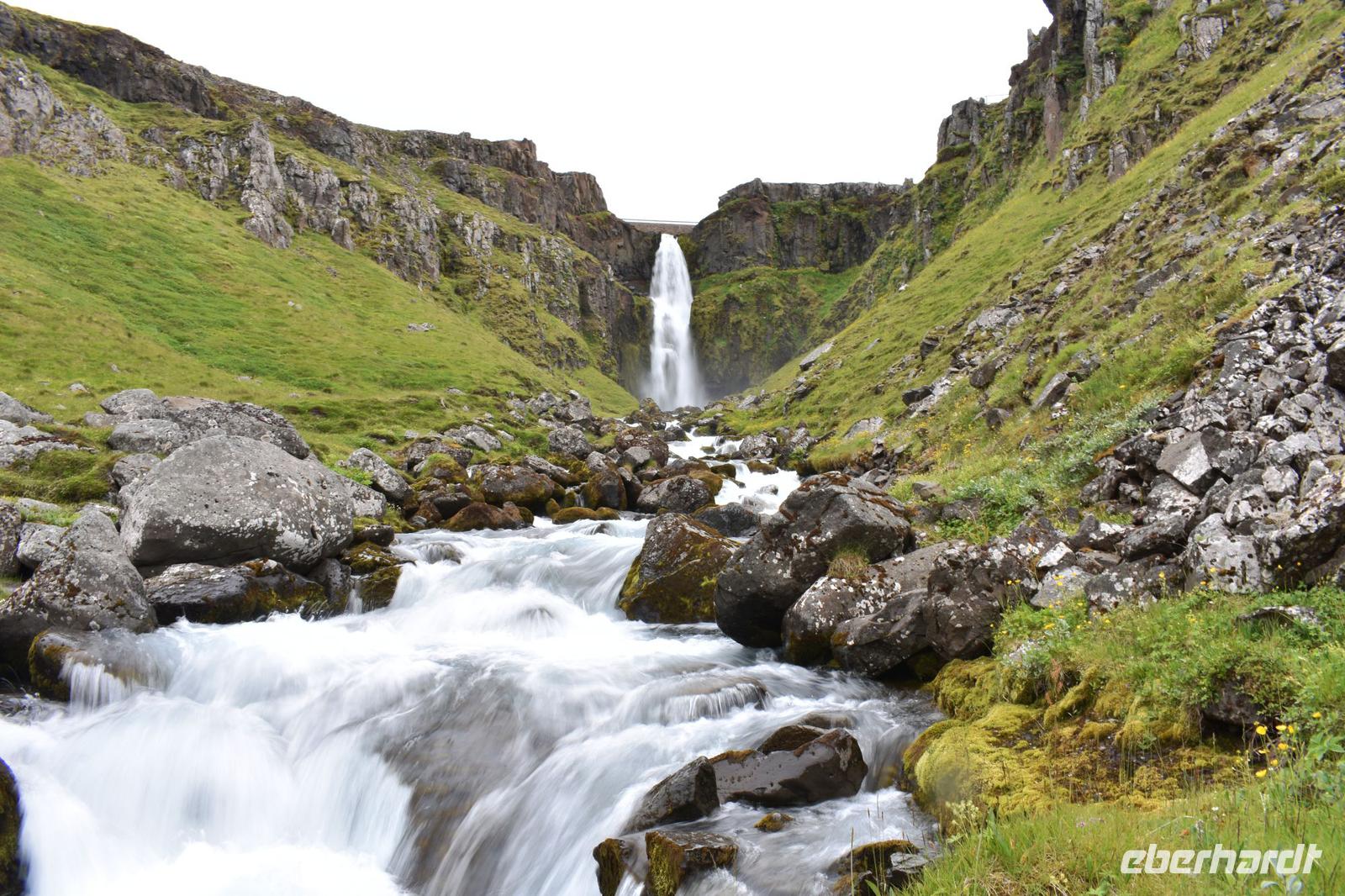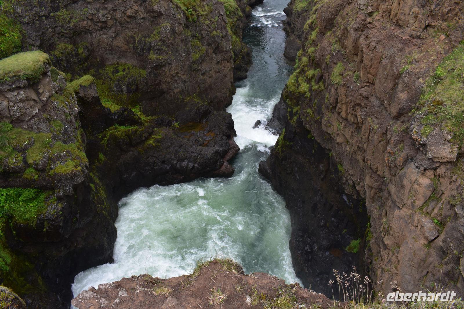Wir verließen dieses Naturspektakel und machten einen kurzen Abstecher über unwegsames Gelände zum Hafragilsfoss. Aber die Überfahrt über den spitzen, buckeligen Berg lohnte sich. So hatten wir noch einen grandiosen Blick in den Canyon und konnten die sonderbaren violetten Vulkangesteine beobachten.