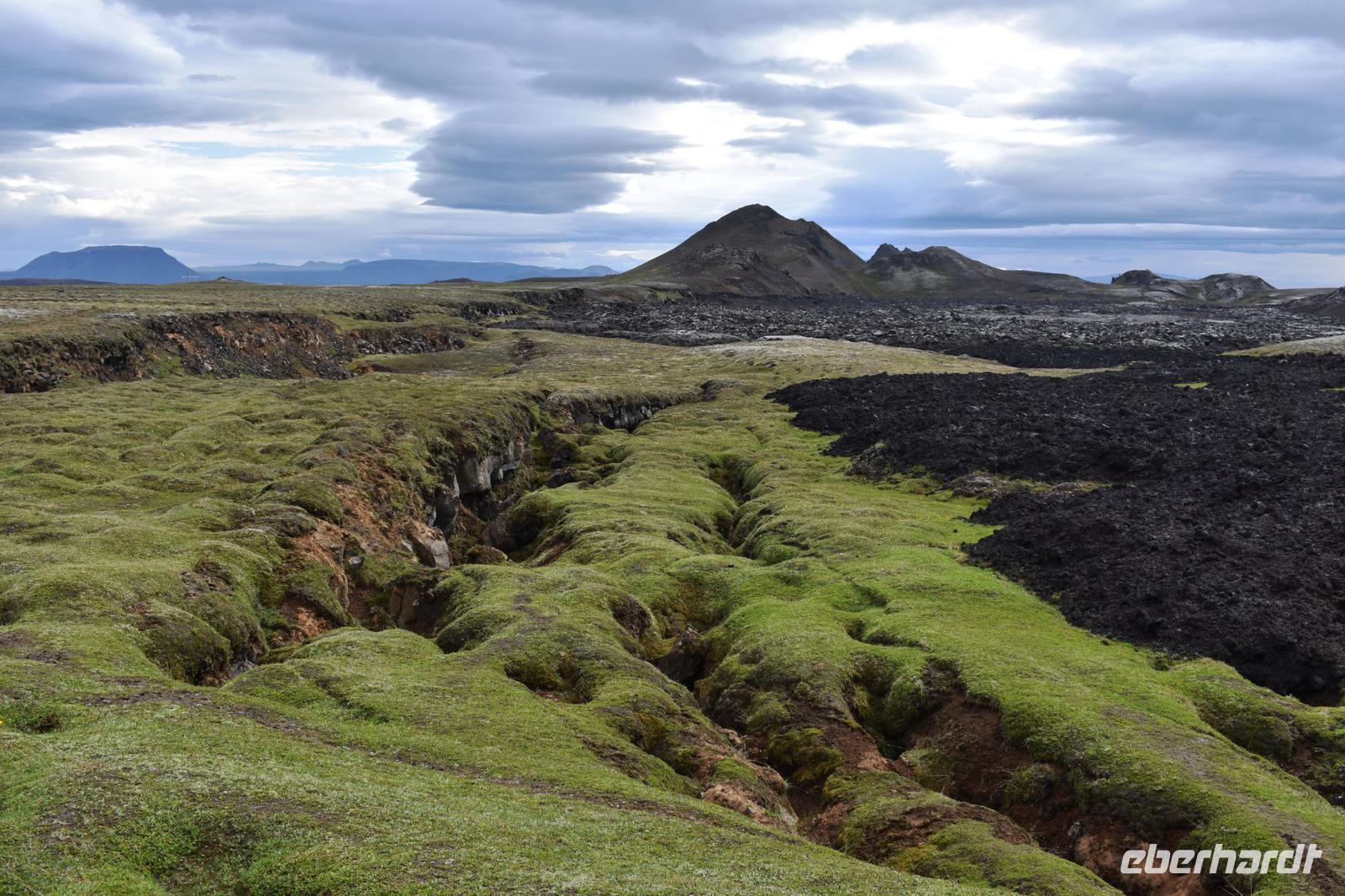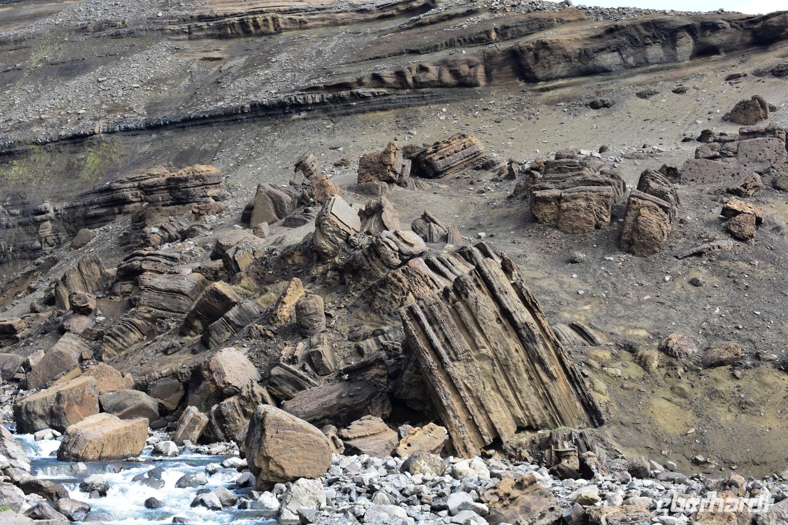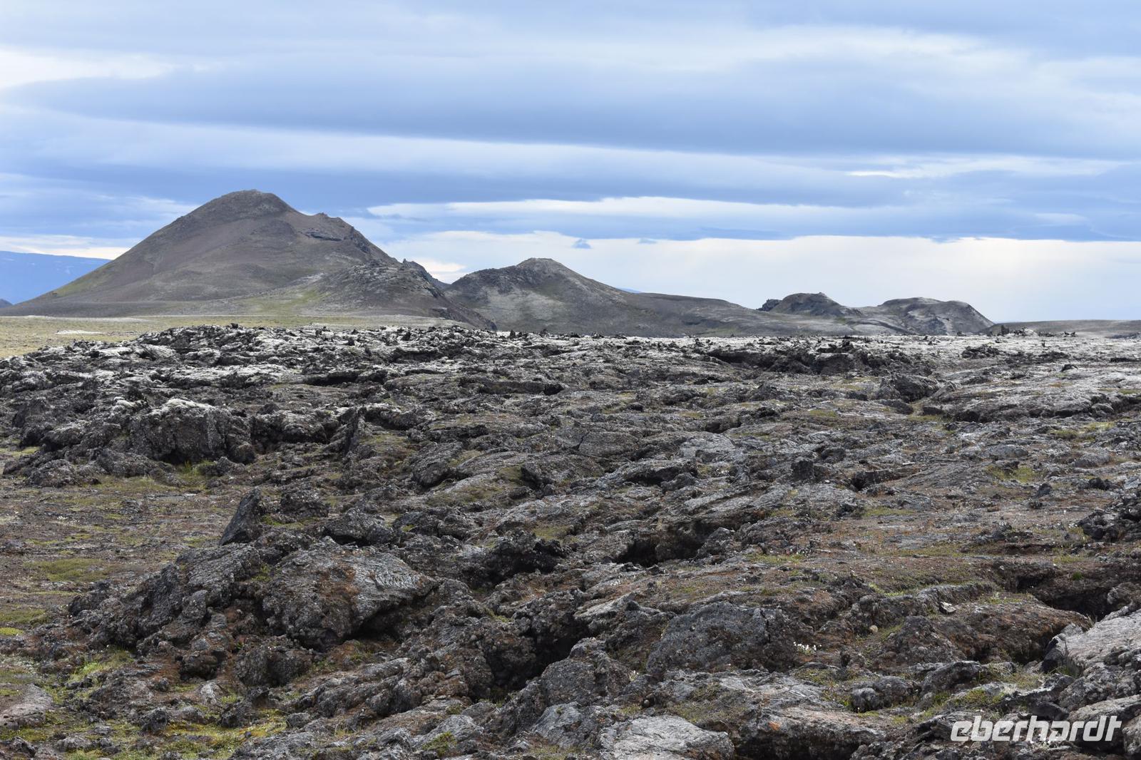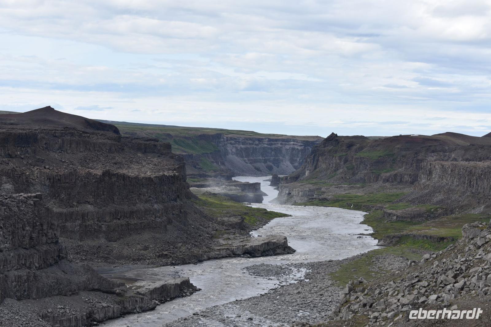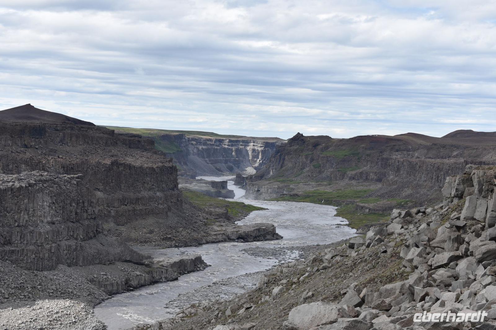 Wir verließen dieses Naturspektakel und machten einen kurzen Abstecher über unwegsames Gelände zum Hafragilsfoss. Aber die Überfahrt über den spitzen, buckeligen Berg lohnte sich. So hatten wir noch einen grandiosen Blick in den Canyon und konnten die sonderbaren violetten Vulkangesteine beobachten.