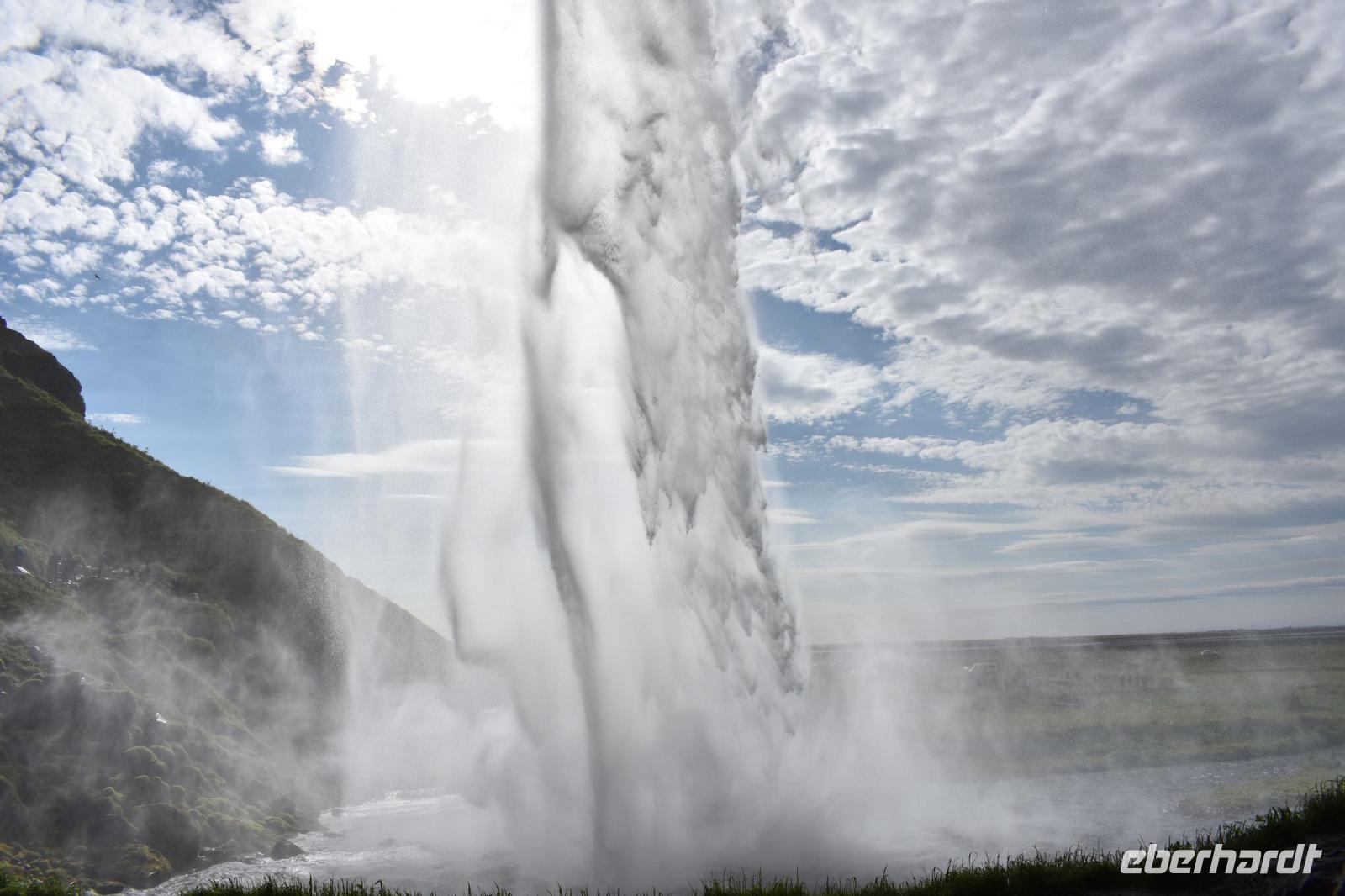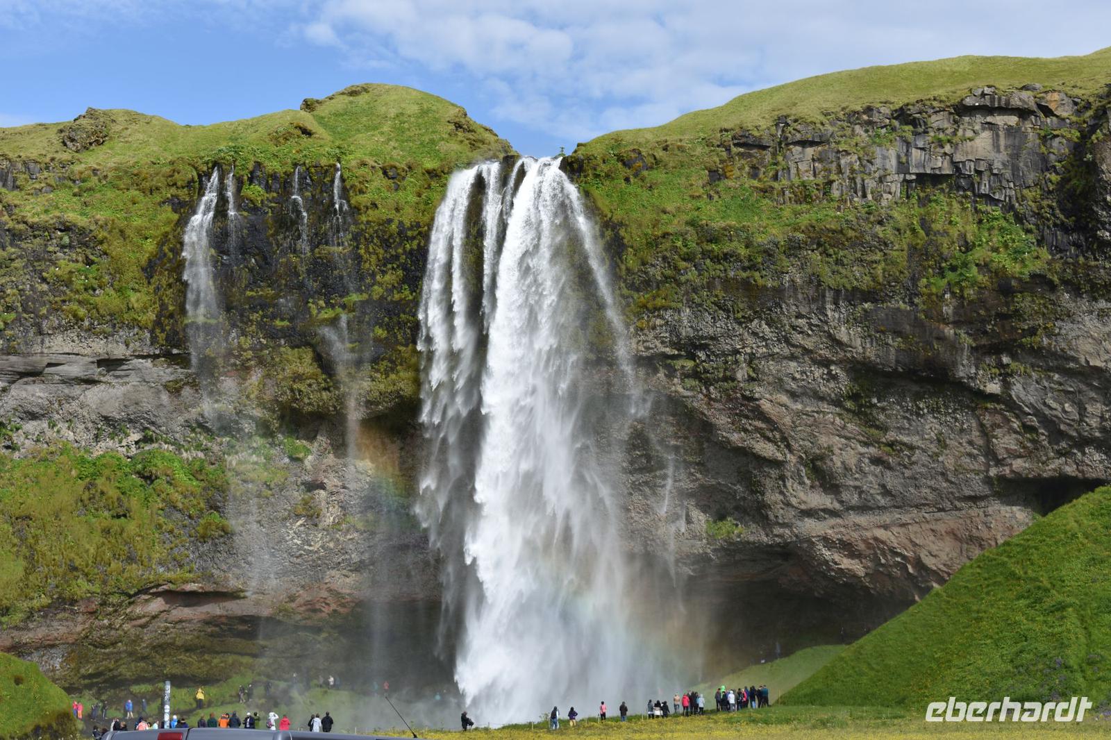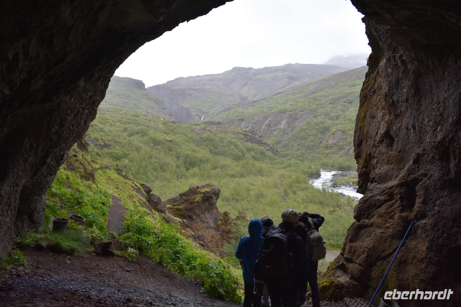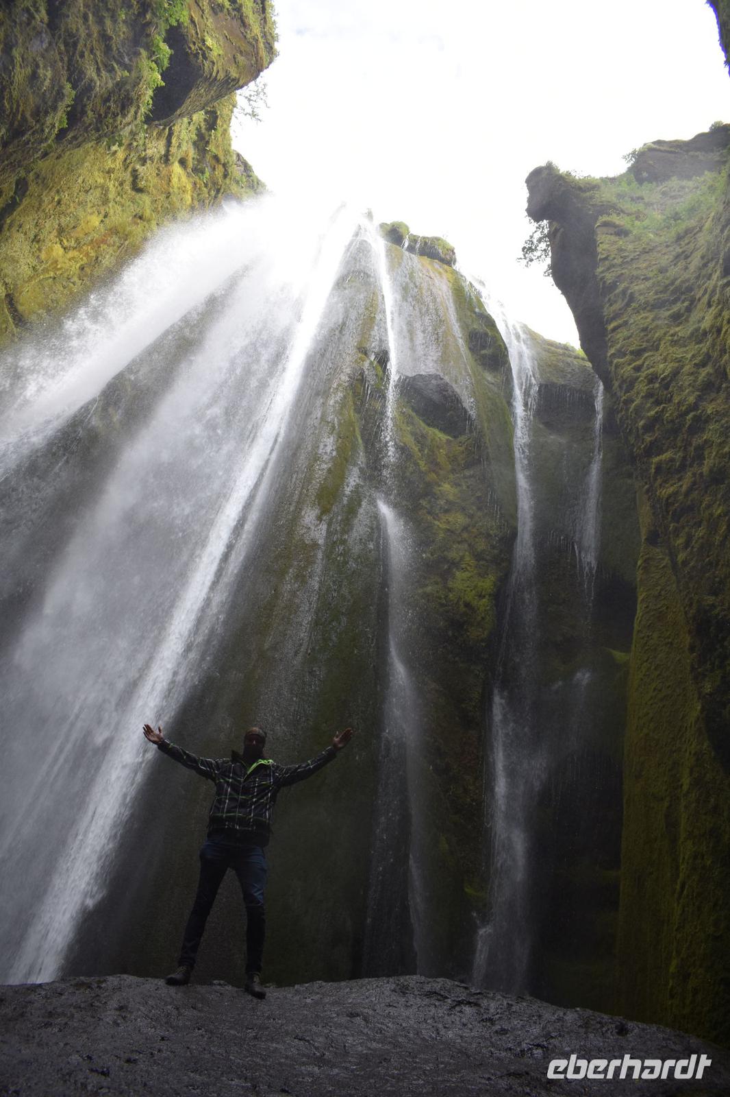 Wir erklommen also den frischen Asche-Lava-Haufen der rund zweihundert Meter aus dem Wasser ragt. Es war sehr windig dort oben, aber der Vulkan ließ uns immer noch, 45 Jahre später, seine Energie spüren. Eine englische Schülergruppe erhitze ihr Toastbrot, welches in Alufolie gewickelt war, in einer kleinen Felsspalte. Danach besichtigten wir den beschaulichen Ort oder sahen uns das Museum Eldheimar an, dass die Ausmaße des Pompejis des Nordens von 1973 veranschaulichte. Dann kehrten wir wieder auf Islands Festland zurück und konnten natürlich nicht an den Wasserfällen vorbeifahren, die schon aus der Ferne zu erahnen waren. Wir besichtigten den Gljúfrabúi. Er war etwas nach hinten im Fels versetzt und nur über ein paar wackelige Steine im Wasser zu erreichen. Ein ziemlich nasses Spektakel, aber definitiv lohnenswert! Dann auch noch der Seljalandsfoss, den man sogar von hinten betrachten konnte! Aber auch hier wurde man etwas nass wenn der Wind ungünstig stand.