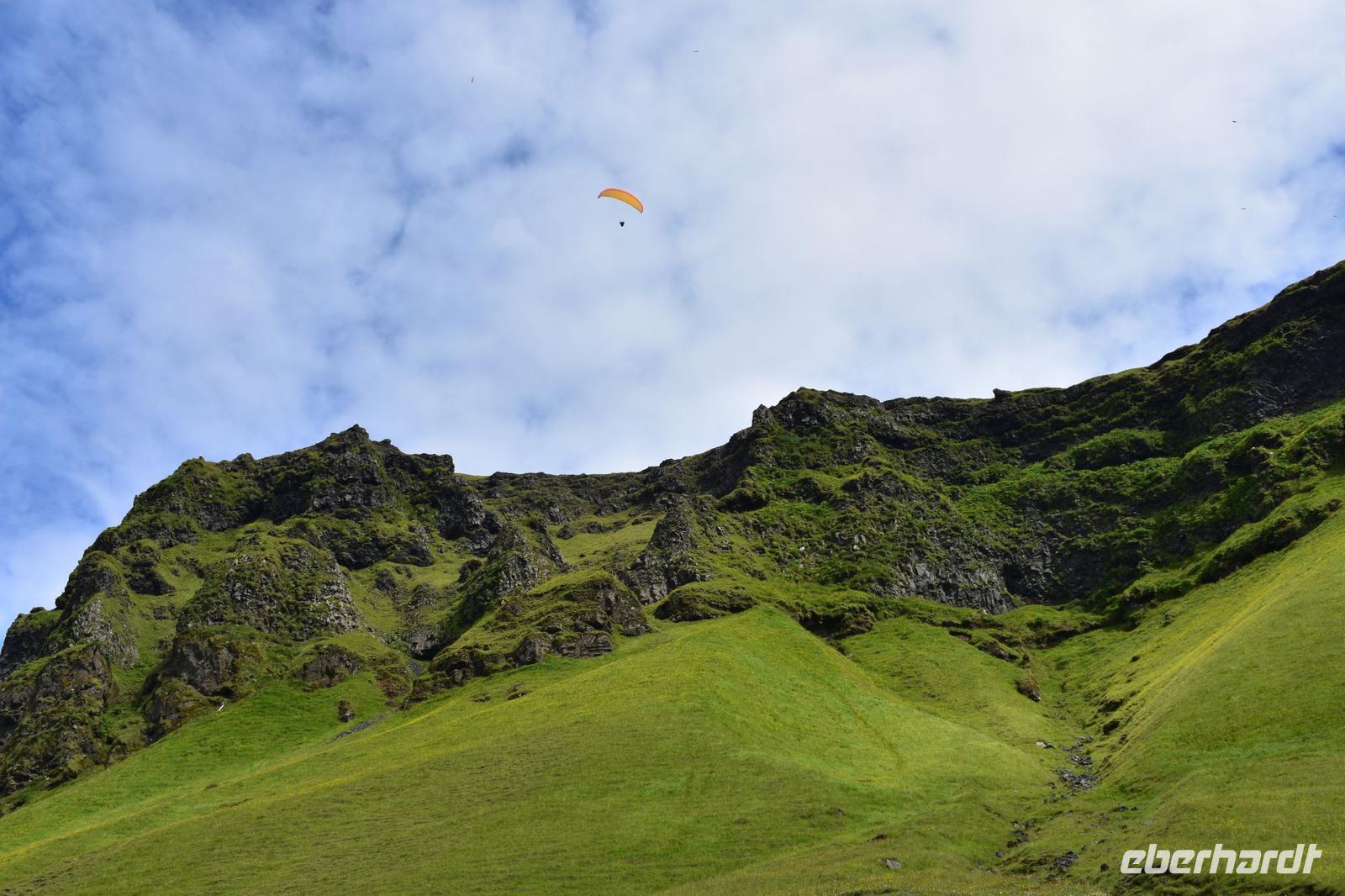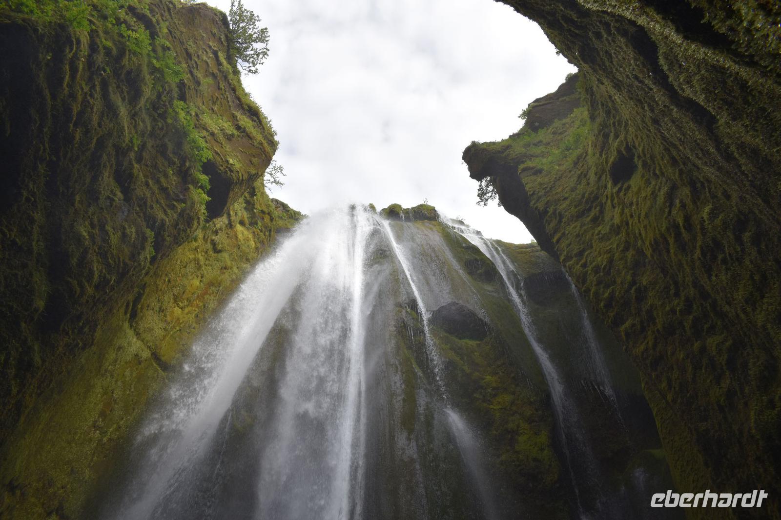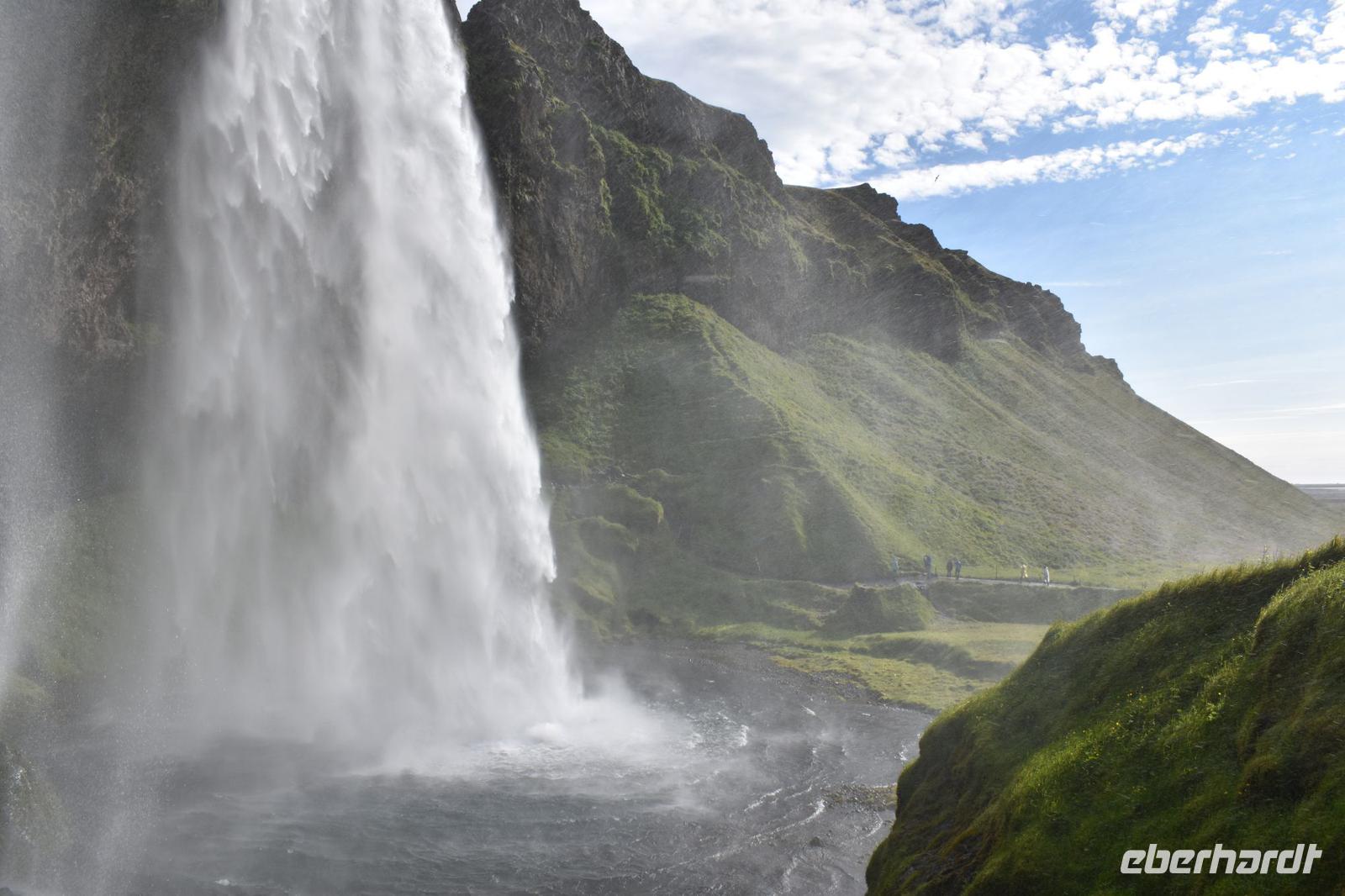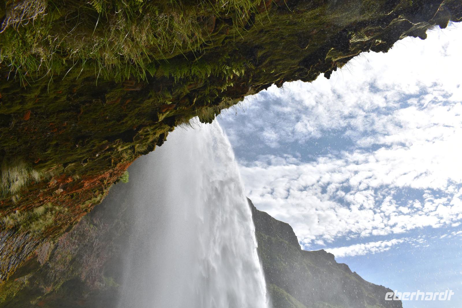 Wir erklommen also den frischen Asche-Lava-Haufen der rund zweihundert Meter aus dem Wasser ragt. Es war sehr windig dort oben, aber der Vulkan ließ uns immer noch, 45 Jahre später, seine Energie spüren. Eine englische Schülergruppe erhitze ihr Toastbrot, welches in Alufolie gewickelt war, in einer kleinen Felsspalte. Danach besichtigten wir den beschaulichen Ort oder sahen uns das Museum Eldheimar an, dass die Ausmaße des Pompejis des Nordens von 1973 veranschaulichte. Dann kehrten wir wieder auf Islands Festland zurück und konnten natürlich nicht an den Wasserfällen vorbeifahren, die schon aus der Ferne zu erahnen waren. Wir besichtigten den Gljúfrabúi. Er war etwas nach hinten im Fels versetzt und nur über ein paar wackelige Steine im Wasser zu erreichen. Ein ziemlich nasses Spektakel, aber definitiv lohnenswert! Dann auch noch der Seljalandsfoss, den man sogar von hinten betrachten konnte! Aber auch hier wurde man etwas nass wenn der Wind ungünstig stand.