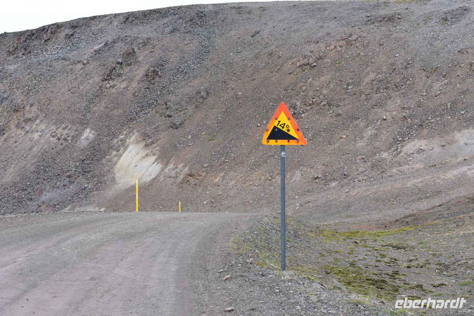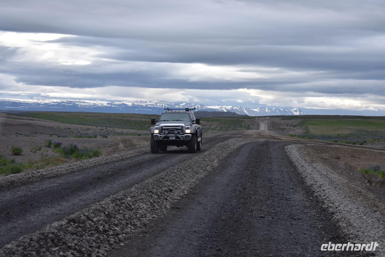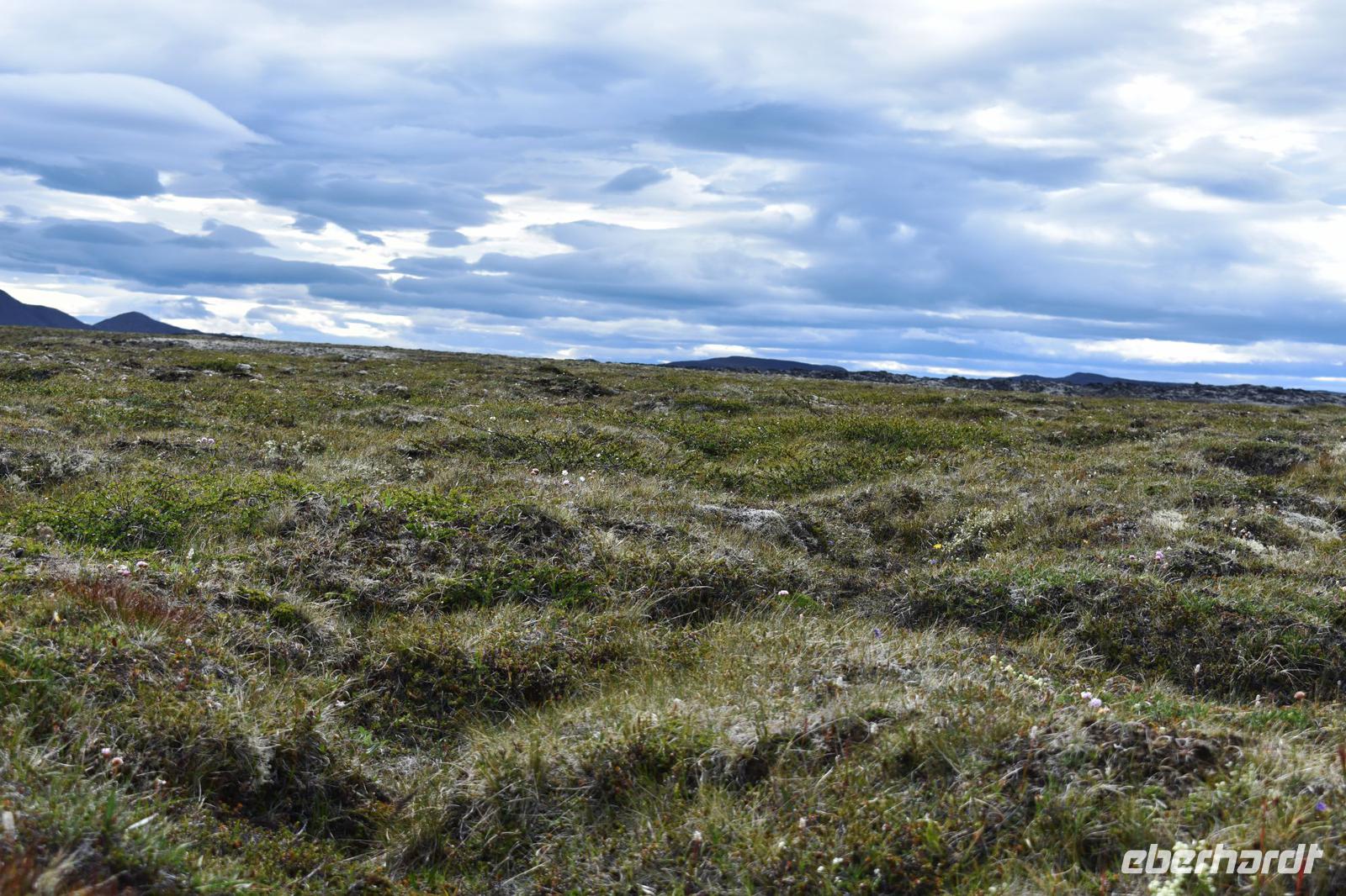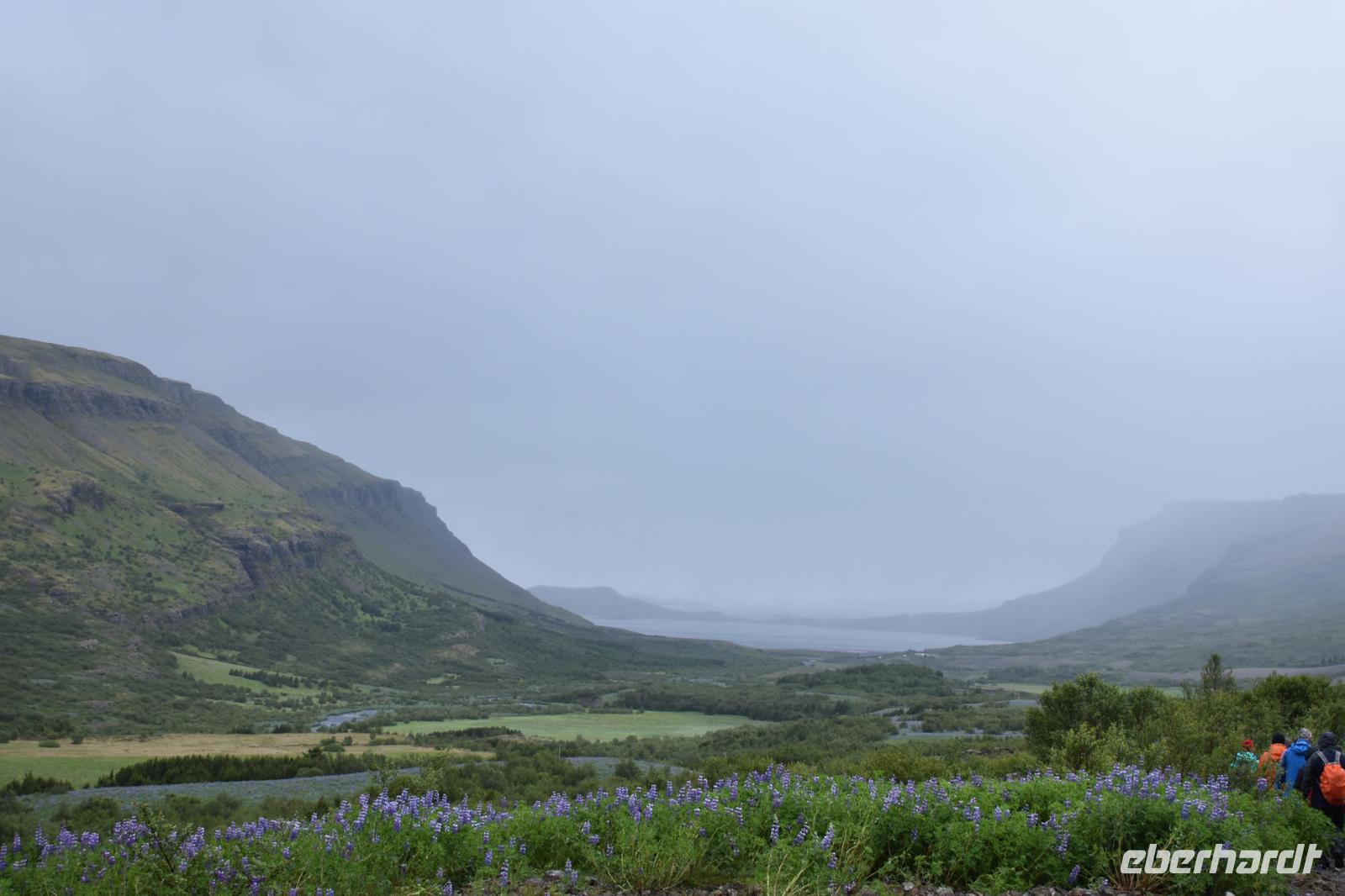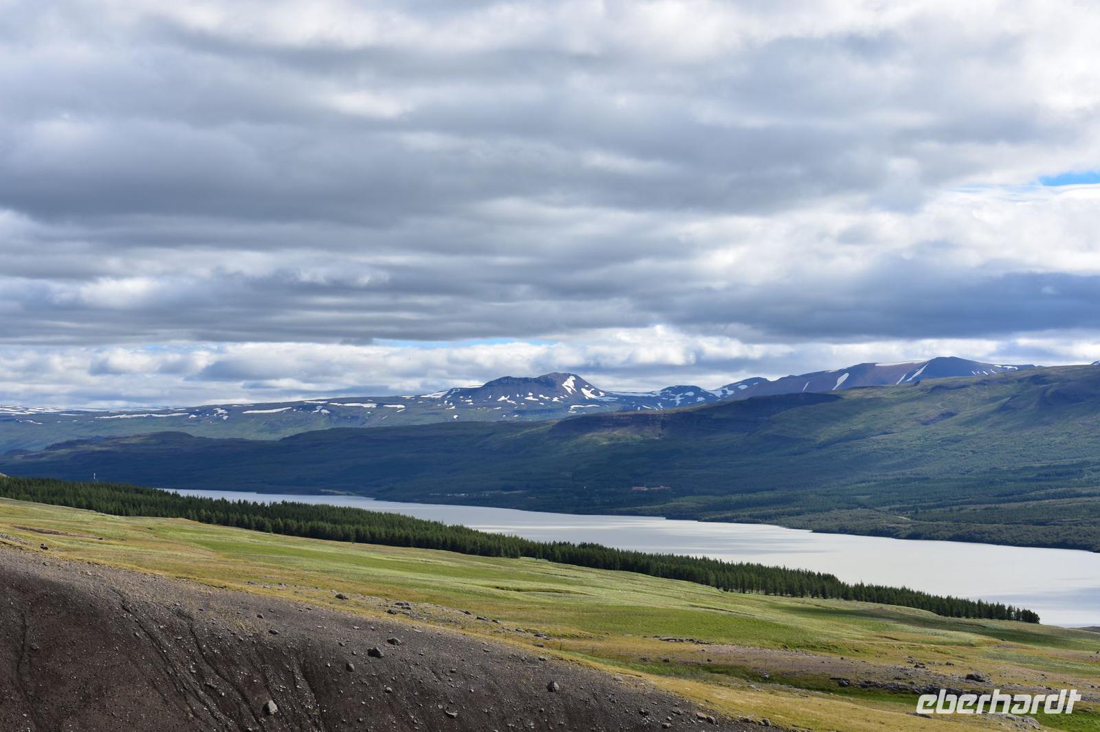 Über Vopnafjörður ging es dann weiter auf der Straße 917. Die Schotterpiste wurde immer kurviger und steiler. 14% Steigung hatten wir und es war ziemlich holprig. Noch immer lagen Schneereste an der Seite der Fahrbahn. Das Moos hier oben war stechend grün. Am Pass angekommen machten wir einen kurzen Fotostopp, hüpften aber schnell wieder in den Bus da der Wind hier oben wiedermal ziemlich stark und eisig war. Ein paar Meter weiter hatten wir einen hervorragenden Blick über die Gemeinde Fljótsdalshérað in der Region Austurland. Die Hauptstadt der Gemeinde ist Egilsstaðir, also der Platz des Egil, die wir aber erst am nächsten Tag besuchen werden. Im Gästehaus Svartiskógur fanden wir erstmal unser Plätzchen für die Nacht, gut dreißig Kilometer vor Egilsstaðir gelegen.