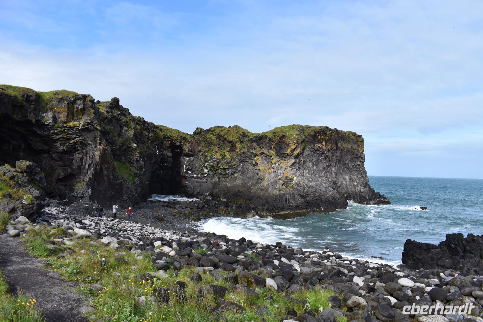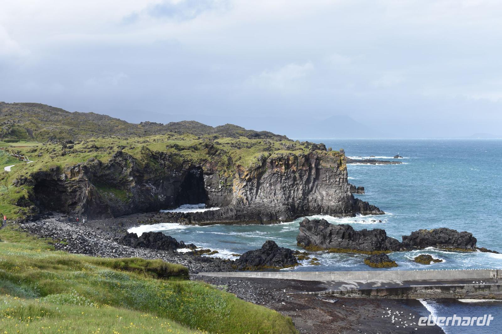 Wir fuhren weiter auf die Halbinsel Snæfellsnes und checkten erstmal in Langaholt ein. Aber eine letzte Wanderung musste noch sein. Wir gingen durch die schroffe Lavaküste von Hellnar bis zur Bárðar Saga Snæfellsáss Statue in Arnarstapi. Somit ging der erste aufregende Tag mit rauen Natur-Erlebnissen vorüber.