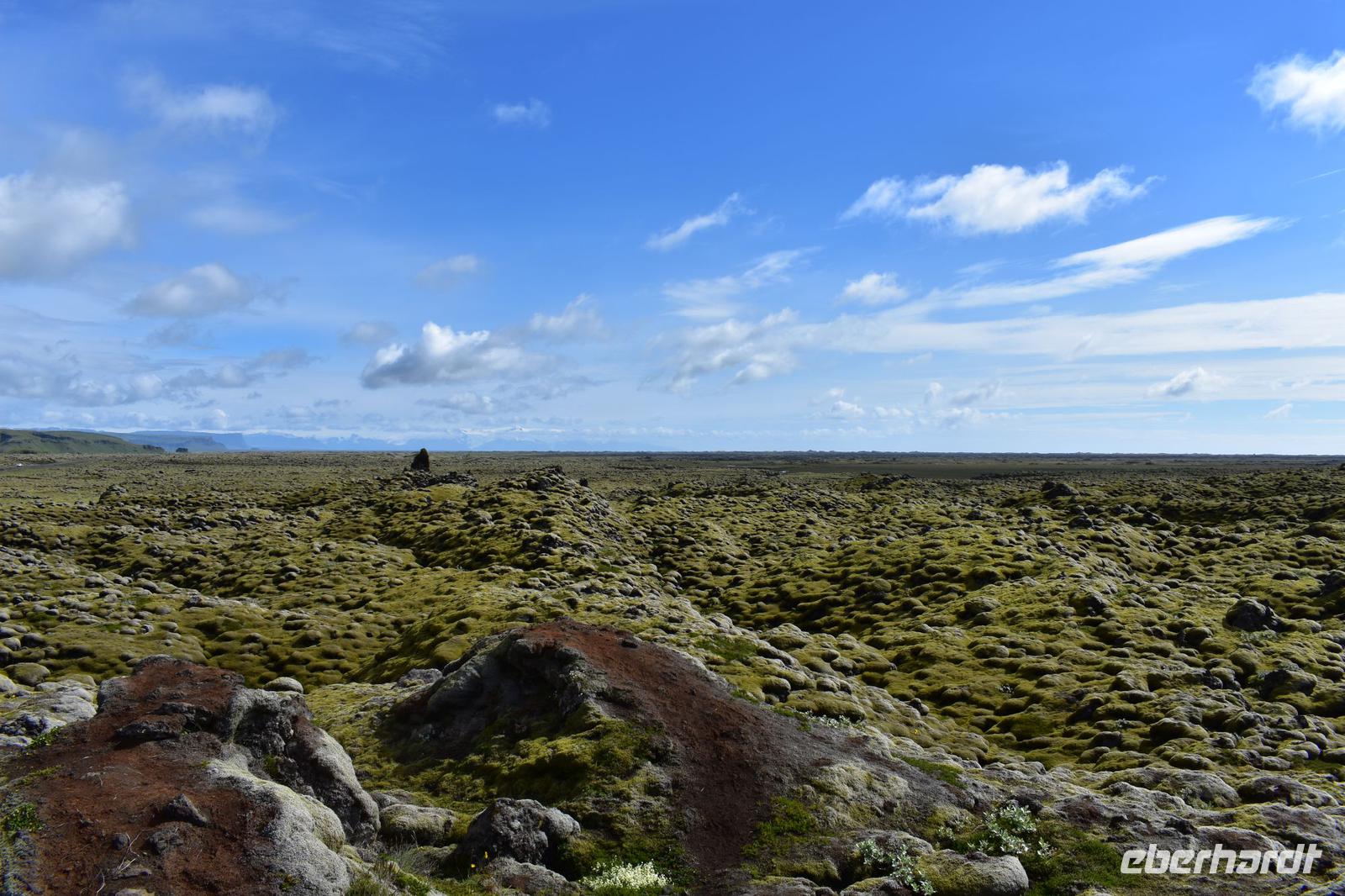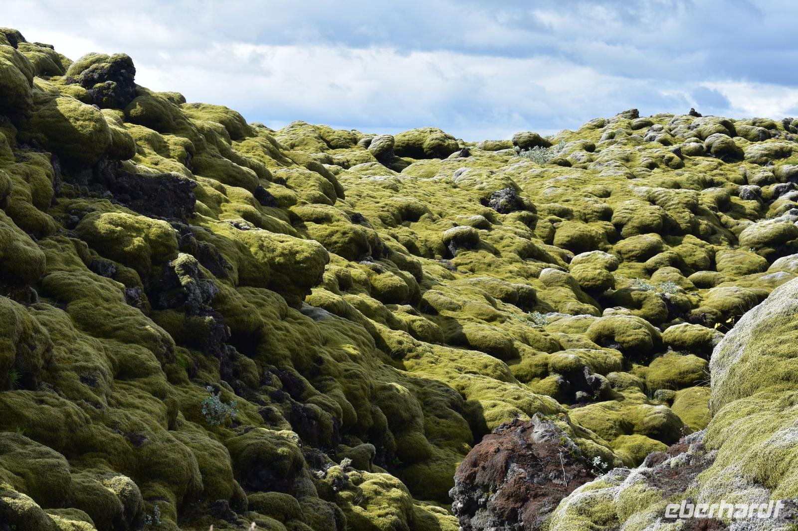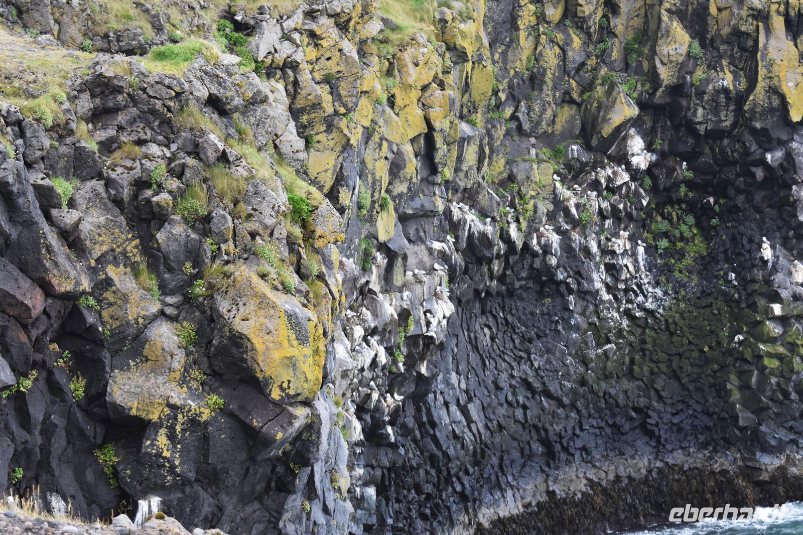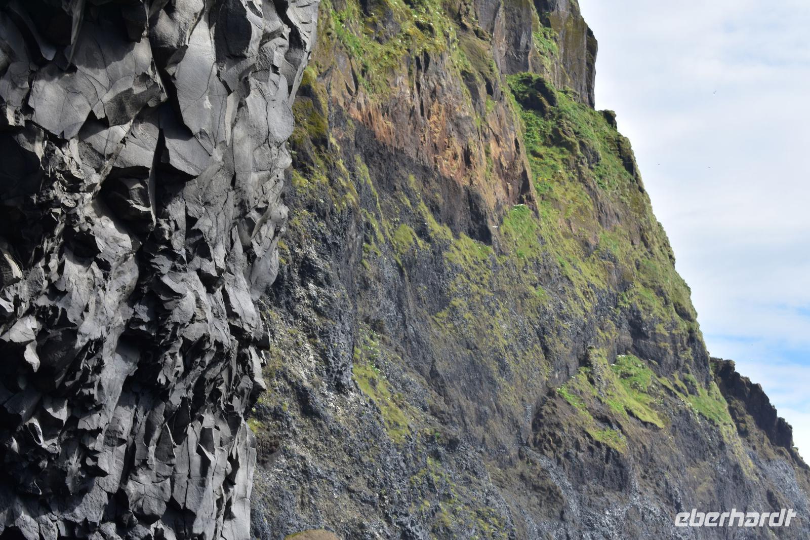 Mit dem Bus ging es an der breiten Küste entlang. Wir mussten uns nun leider von dem zauberhaften Blick auf die Gletscherzungen des Vatnajökull verabschieden. Der Küstenstreifen wurde immer breiter, die Klippen zur Rechten immer höher. Zahlreiche Wasserfälle konnten wir durch das Fenster bestaunen. Sie waren teilweise mit rost-roter Farbe untersetzt und mit saftigem Moos leuchtend-grün an den Seiten bewachsen. Wir fuhren durch alte Lavafelder die unter Tausend Jahre alt waren und lediglich mit Moos bewachsen waren.