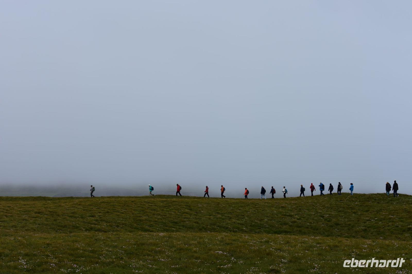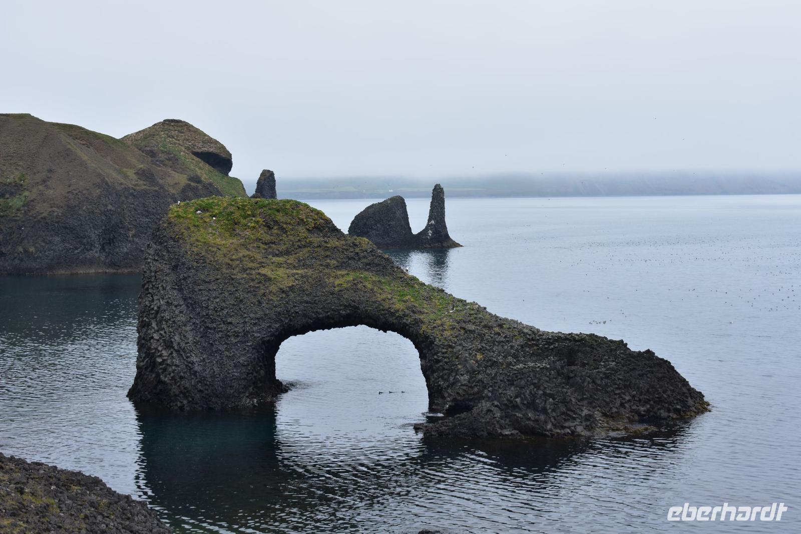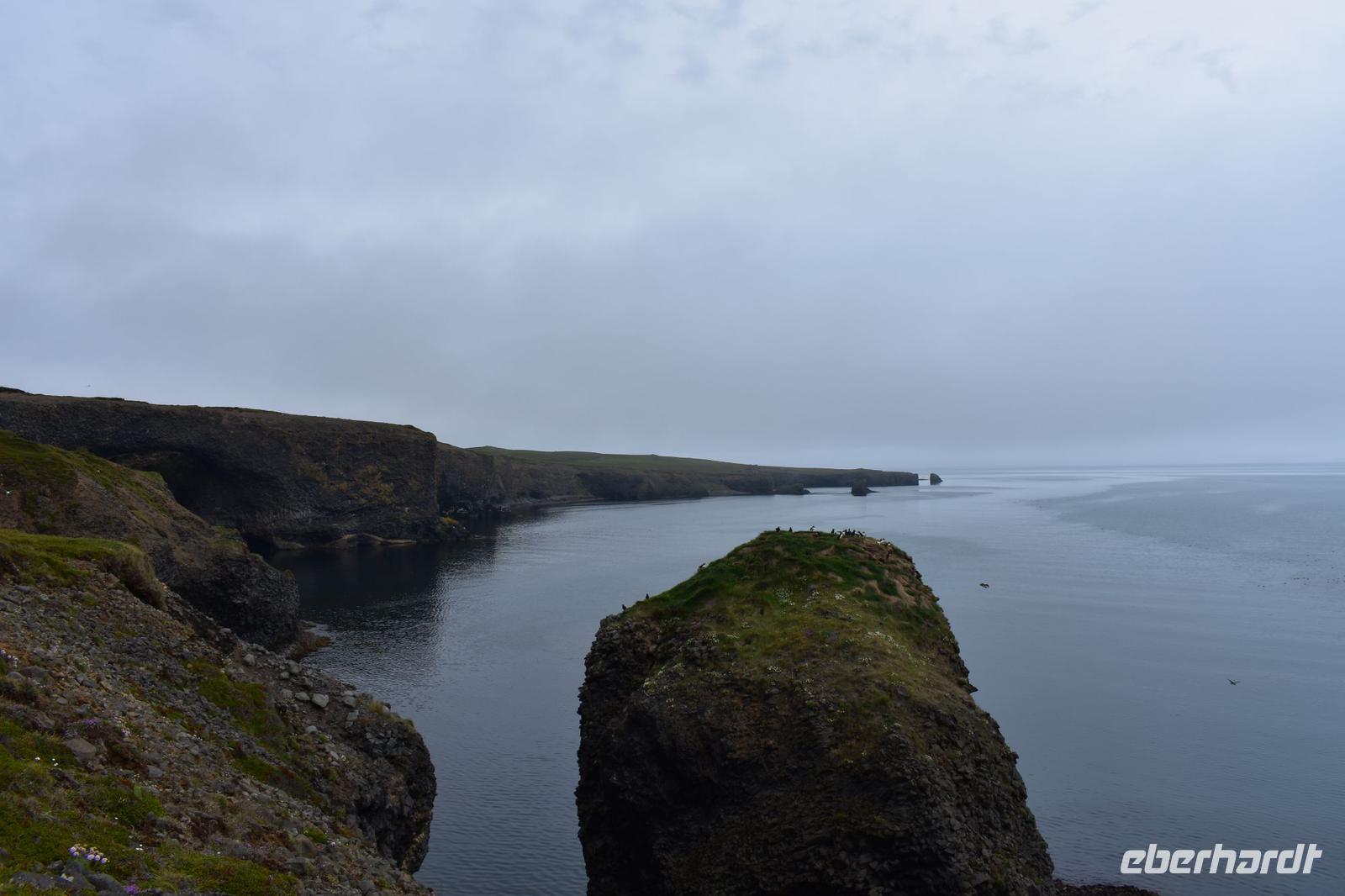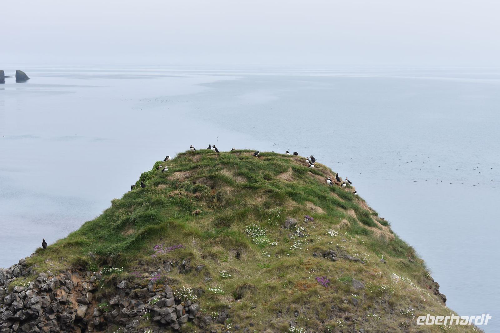 Am Morgen, bevor wir wieder weiter zogen, sahen wir uns das noch nicht ganz fertiggestellte Heimskautsgerðið an, also The Arctic Henge, was eine ähnliche Funktion wie das englische Stonehenge hat. Hier in Nordisland hat ein Künstler riesige Steinblöcke bewegen lassen um auch hier einen Steinkreis zu errichten, der die Jahreszeiten angibt und dem eine magische Aura umgibt. Nach dieser morgendlichen Besichtigung fuhren wir weiter zu der kleinen Spitze Raudanes. Es zog ein mystischer Nebel über den flachen Klippenvorsprung. Man musste vorsichtig an die Kante gehen, da es zum einen abbruchgefährdet war aber man zum anderen die Kante nur sehr schwer sehen konnte, da alles so nebelig war. Aber der Nebel verzog sich allmählig und immer wieder sah man Teile des Ozeans. Wir wanderten eine ganze Weile auf den meterhohen Klippen entlang und beobachten zahlreiche Vögel. Als wir schon fast die hälfte der Wanderung hinter uns hatten entdeckten wir dann eine Kolonie von Papageitauchern. Die kleinen Vögelchen, auch Puffin genannt, sind wirklich putzig! Wir hatten sogar großes Glück, sie ließen sich relativ nahe fotografieren und wir sind auch an einer kleinen Stadt der Puffins vorbeigekommen. Wenige Meter vor uns, auf einer Felssäule, hatten die Papageitaucher ihre Bruthöhlen gegraben.