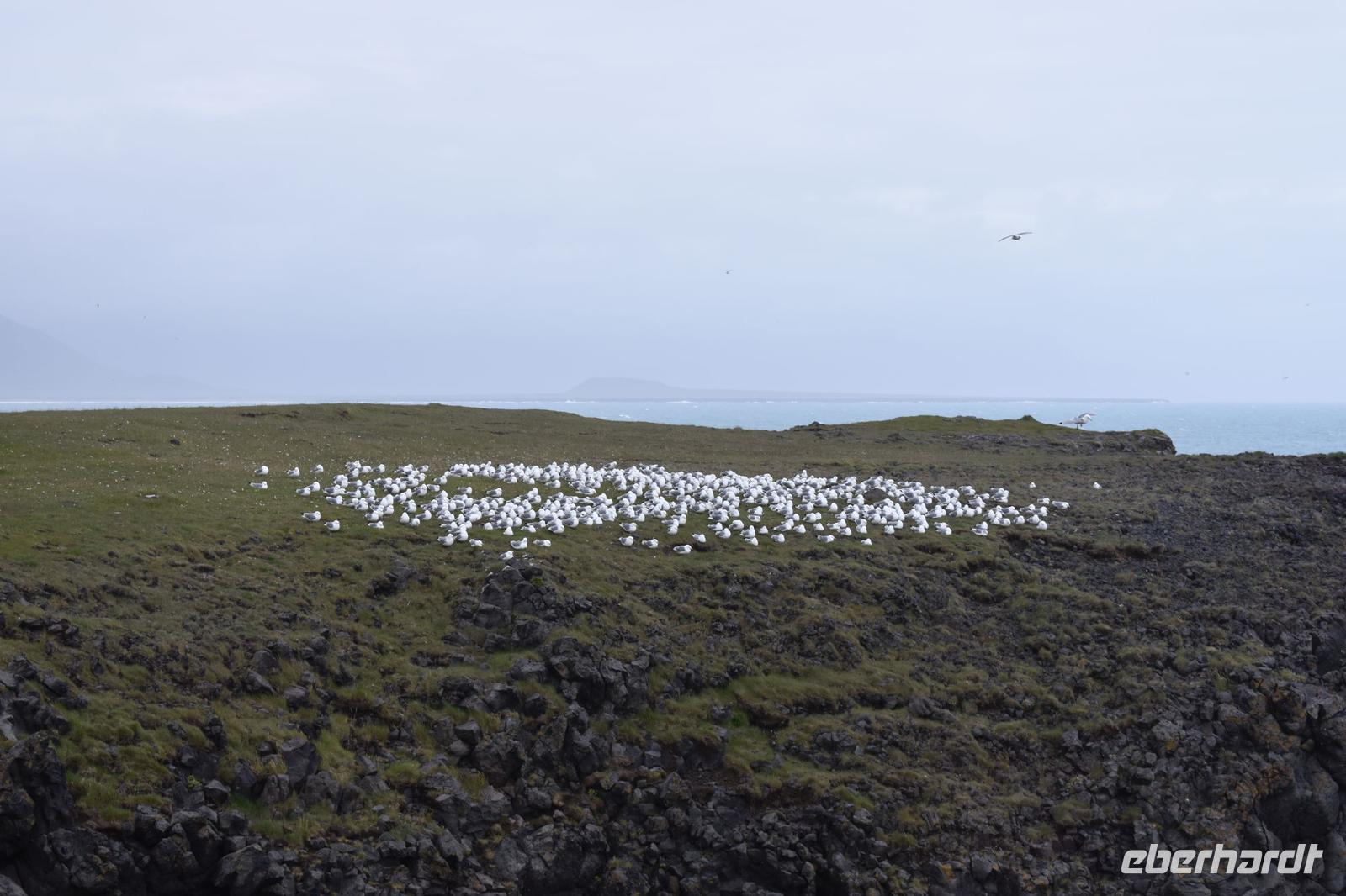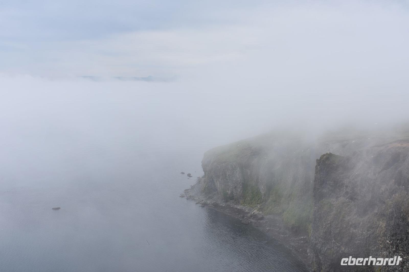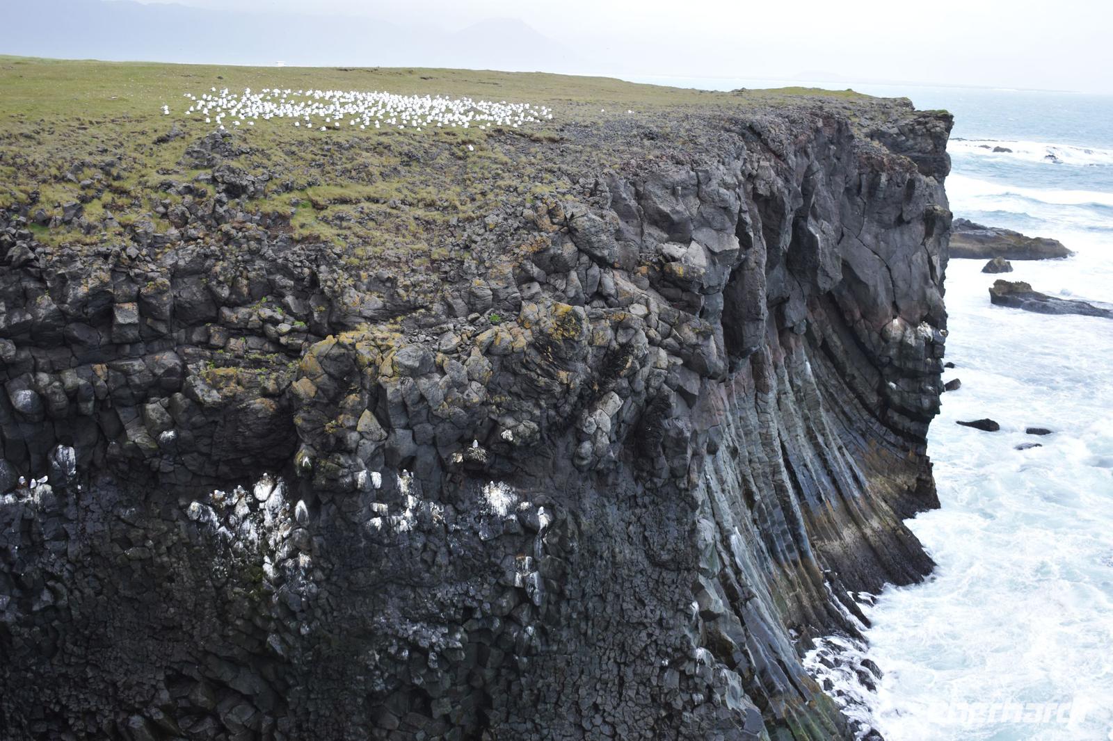 Am Morgen, bevor wir wieder weiter zogen, sahen wir uns das noch nicht ganz fertiggestellte Heimskautsgerðið an, also The Arctic Henge, was eine ähnliche Funktion wie das englische Stonehenge hat. Hier in Nordisland hat ein Künstler riesige Steinblöcke bewegen lassen um auch hier einen Steinkreis zu errichten, der die Jahreszeiten angibt und dem eine magische Aura umgibt. Nach dieser morgendlichen Besichtigung fuhren wir weiter zu der kleinen Spitze Raudanes. Es zog ein mystischer Nebel über den flachen Klippenvorsprung. Man musste vorsichtig an die Kante gehen, da es zum einen abbruchgefährdet war aber man zum anderen die Kante nur sehr schwer sehen konnte, da alles so nebelig war. Aber der Nebel verzog sich allmählig und immer wieder sah man Teile des Ozeans. Wir wanderten eine ganze Weile auf den meterhohen Klippen entlang und beobachten zahlreiche Vögel. Als wir schon fast die hälfte der Wanderung hinter uns hatten entdeckten wir dann eine Kolonie von Papageitauchern. Die kleinen Vögelchen, auch Puffin genannt, sind wirklich putzig! Wir hatten sogar großes Glück, sie ließen sich relativ nahe fotografieren und wir sind auch an einer kleinen Stadt der Puffins vorbeigekommen. Wenige Meter vor uns, auf einer Felssäule, hatten die Papageitaucher ihre Bruthöhlen gegraben.