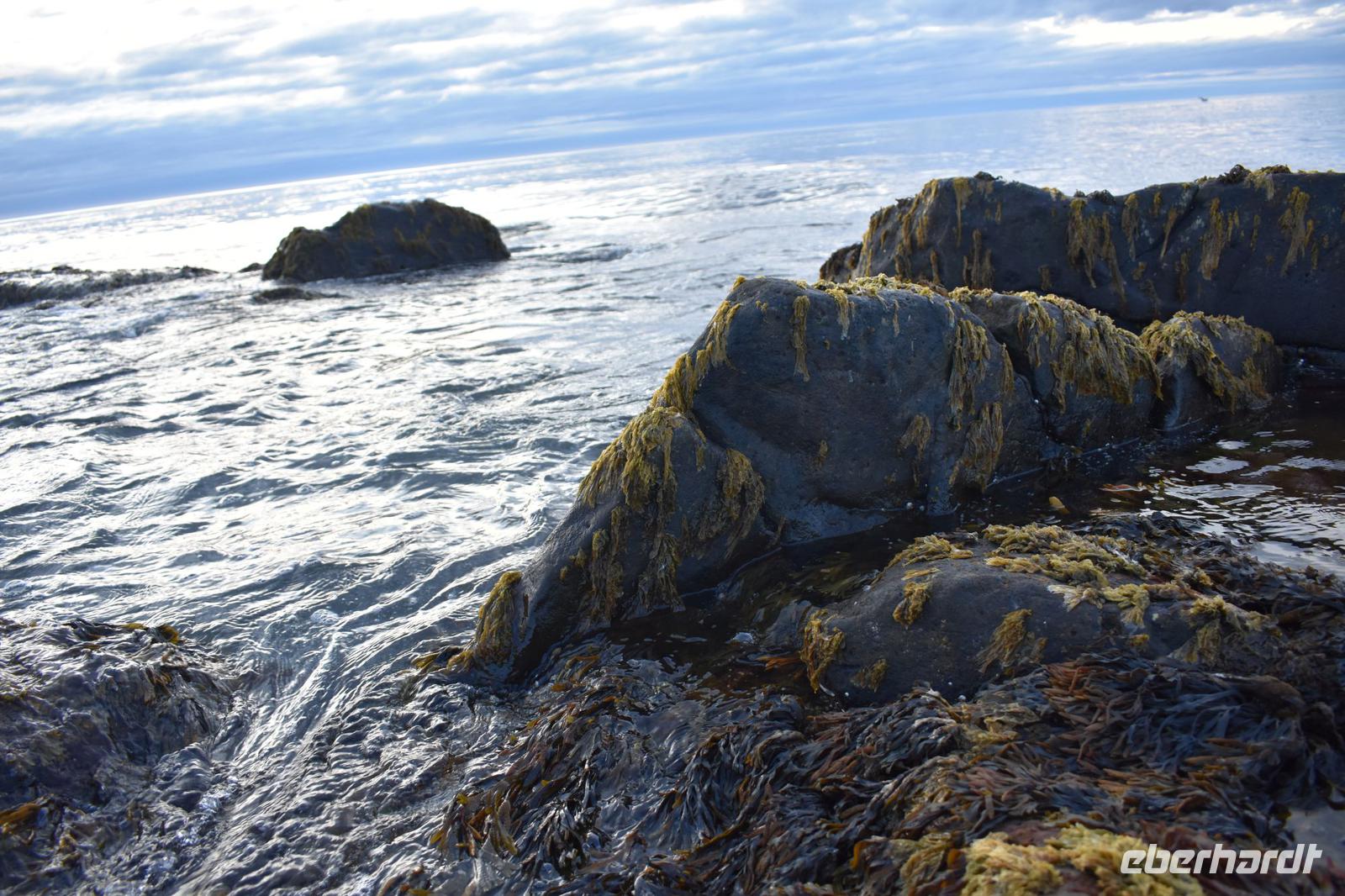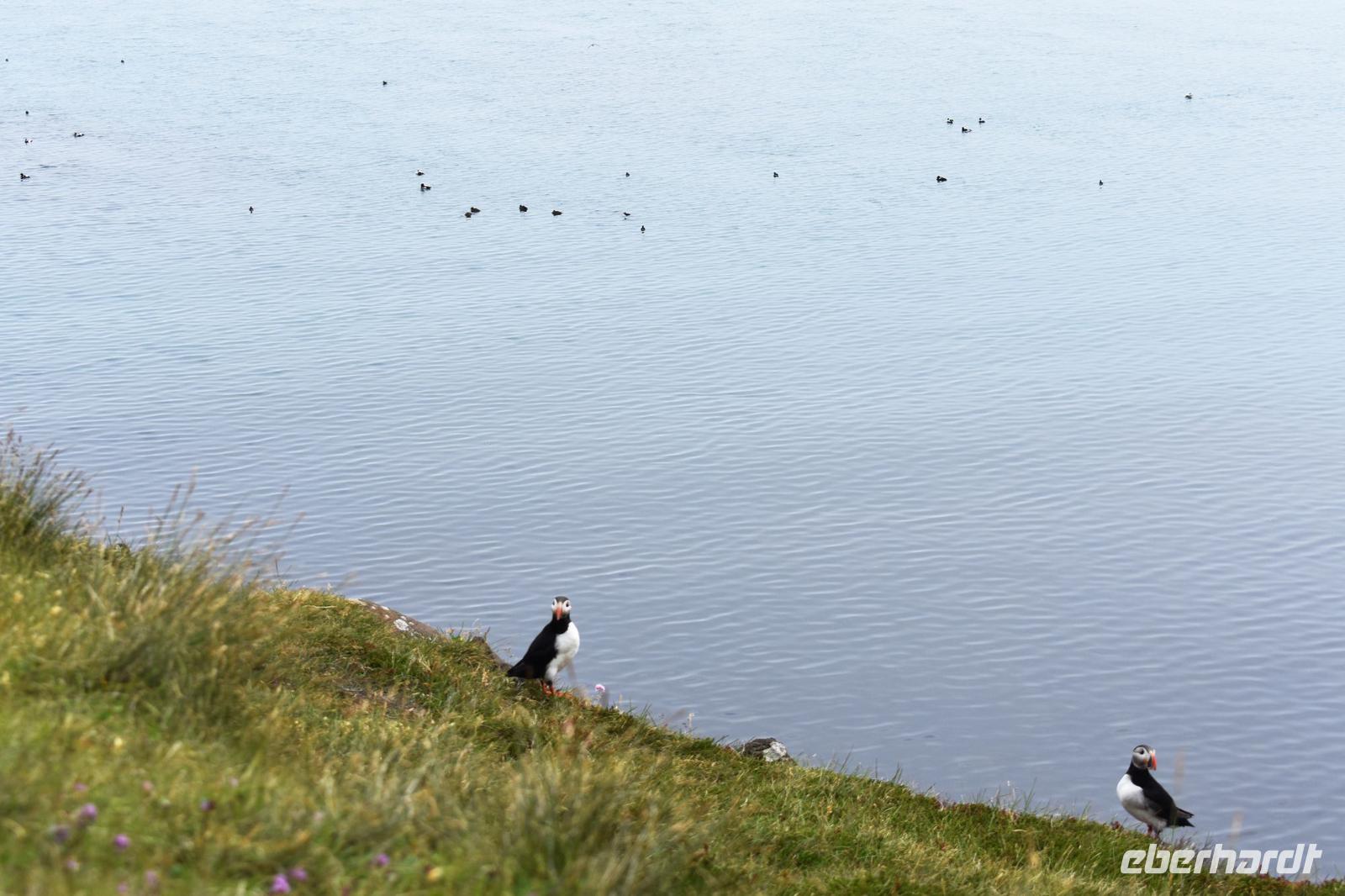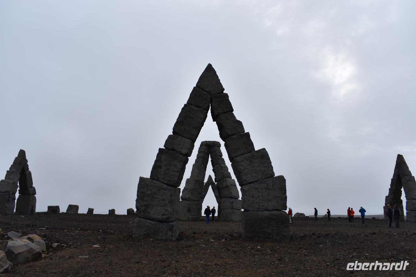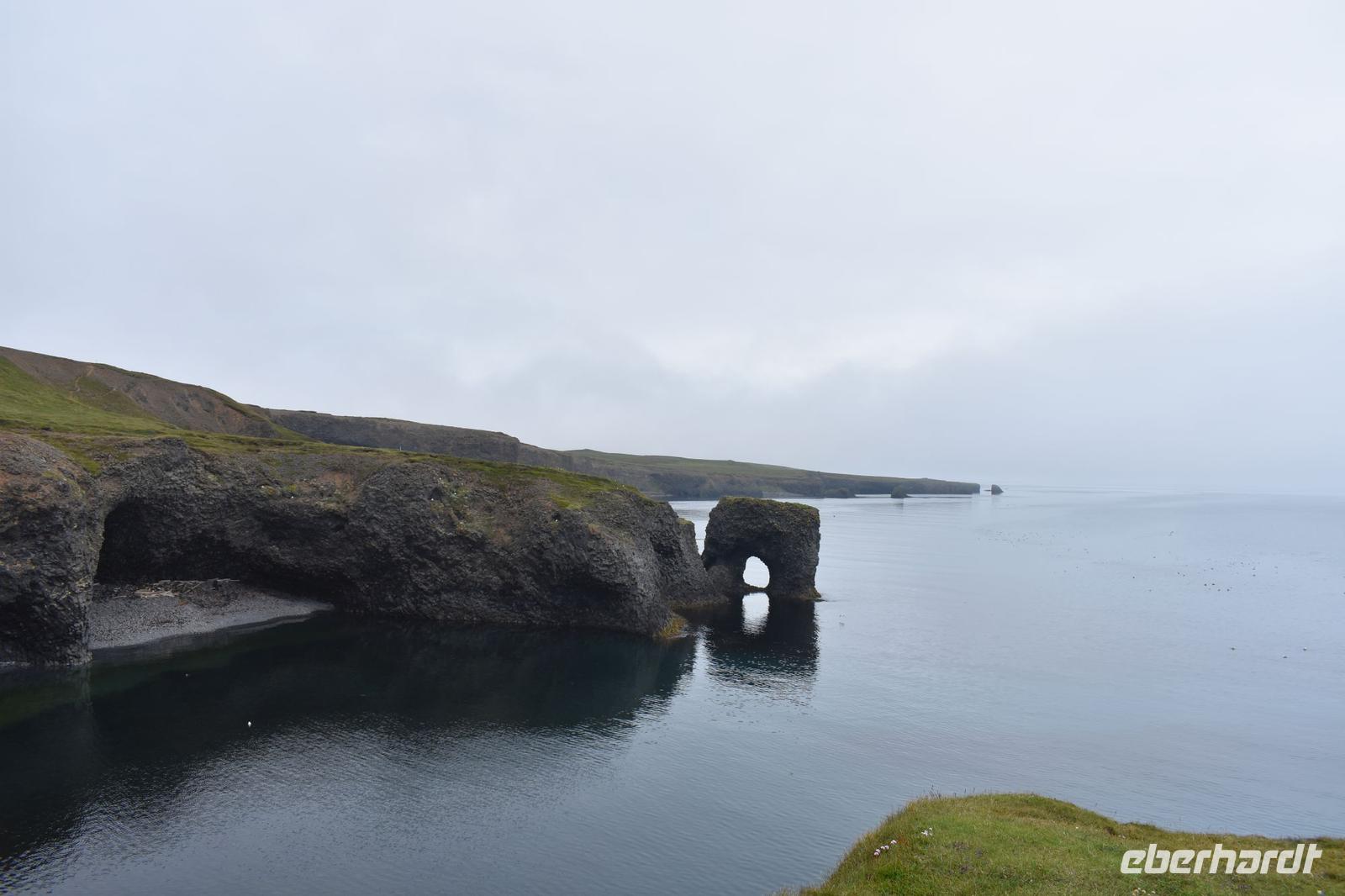 Am Morgen, bevor wir wieder weiter zogen, sahen wir uns das noch nicht ganz fertiggestellte Heimskautsgerðið an, also The Arctic Henge, was eine ähnliche Funktion wie das englische Stonehenge hat. Hier in Nordisland hat ein Künstler riesige Steinblöcke bewegen lassen um auch hier einen Steinkreis zu errichten, der die Jahreszeiten angibt und dem eine magische Aura umgibt. Nach dieser morgendlichen Besichtigung fuhren wir weiter zu der kleinen Spitze Raudanes. Es zog ein mystischer Nebel über den flachen Klippenvorsprung. Man musste vorsichtig an die Kante gehen, da es zum einen abbruchgefährdet war aber man zum anderen die Kante nur sehr schwer sehen konnte, da alles so nebelig war. Aber der Nebel verzog sich allmählig und immer wieder sah man Teile des Ozeans. Wir wanderten eine ganze Weile auf den meterhohen Klippen entlang und beobachten zahlreiche Vögel. Als wir schon fast die hälfte der Wanderung hinter uns hatten entdeckten wir dann eine Kolonie von Papageitauchern. Die kleinen Vögelchen, auch Puffin genannt, sind wirklich putzig! Wir hatten sogar großes Glück, sie ließen sich relativ nahe fotografieren und wir sind auch an einer kleinen Stadt der Puffins vorbeigekommen. Wenige Meter vor uns, auf einer Felssäule, hatten die Papageitaucher ihre Bruthöhlen gegraben.