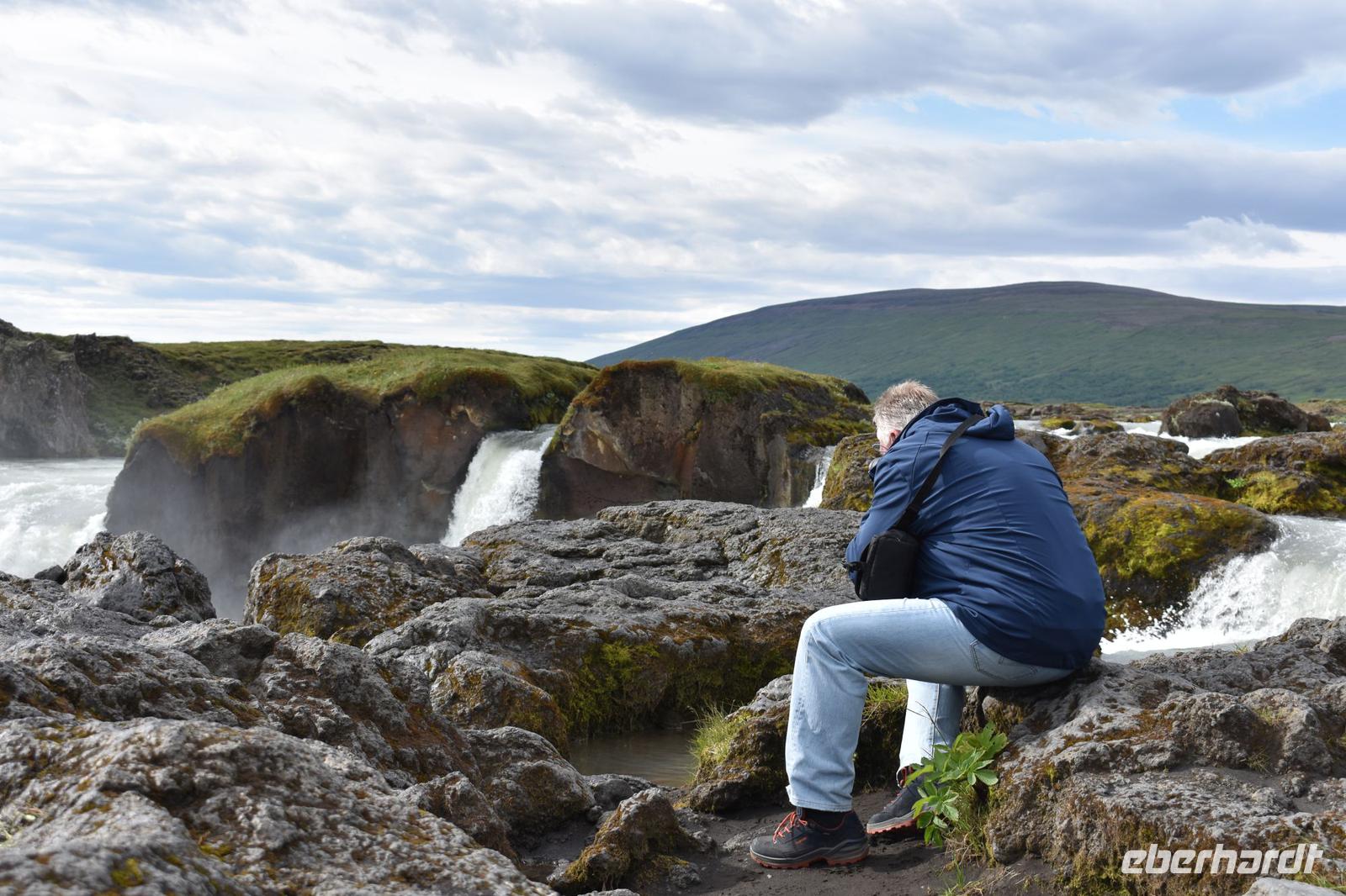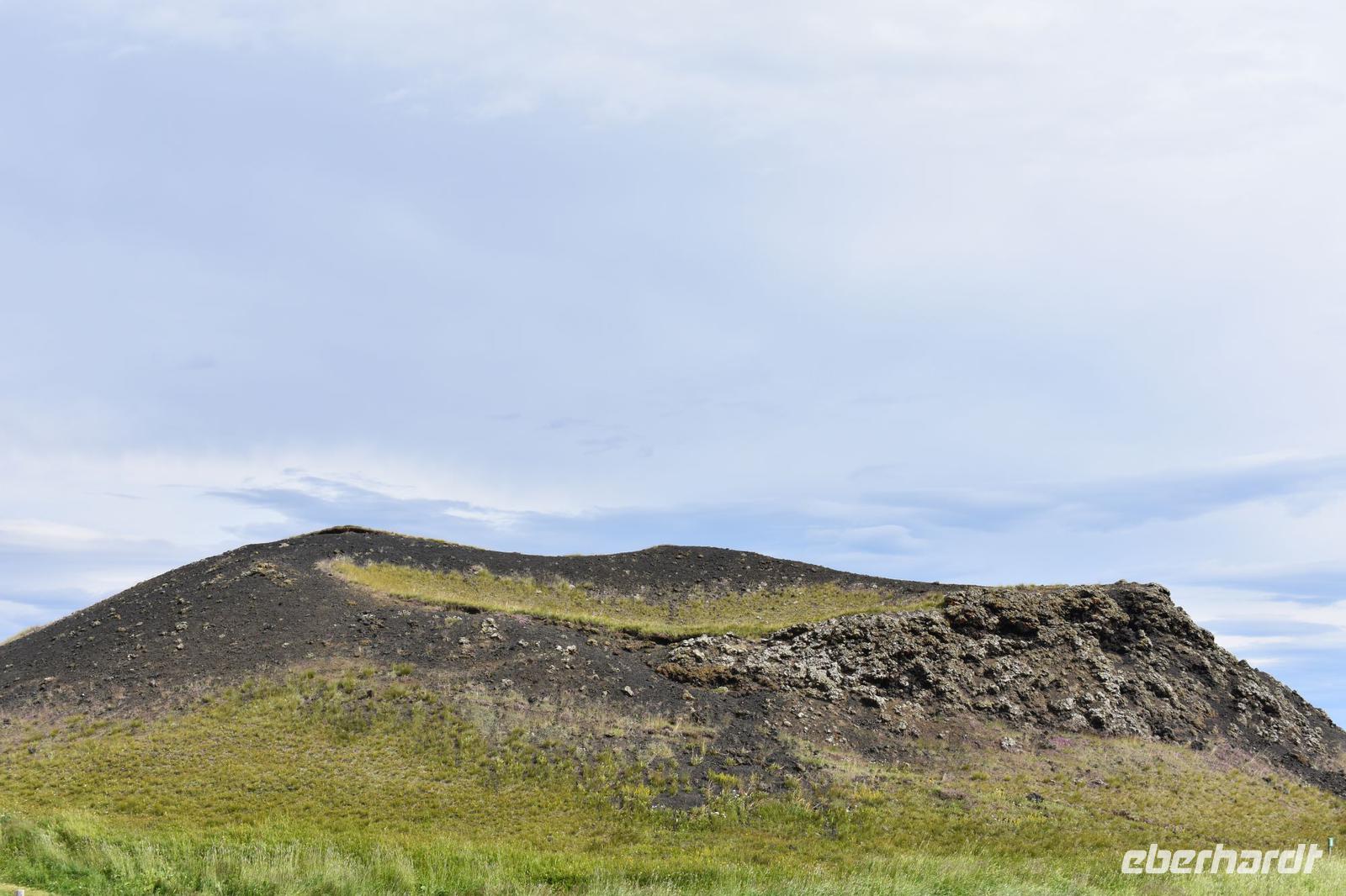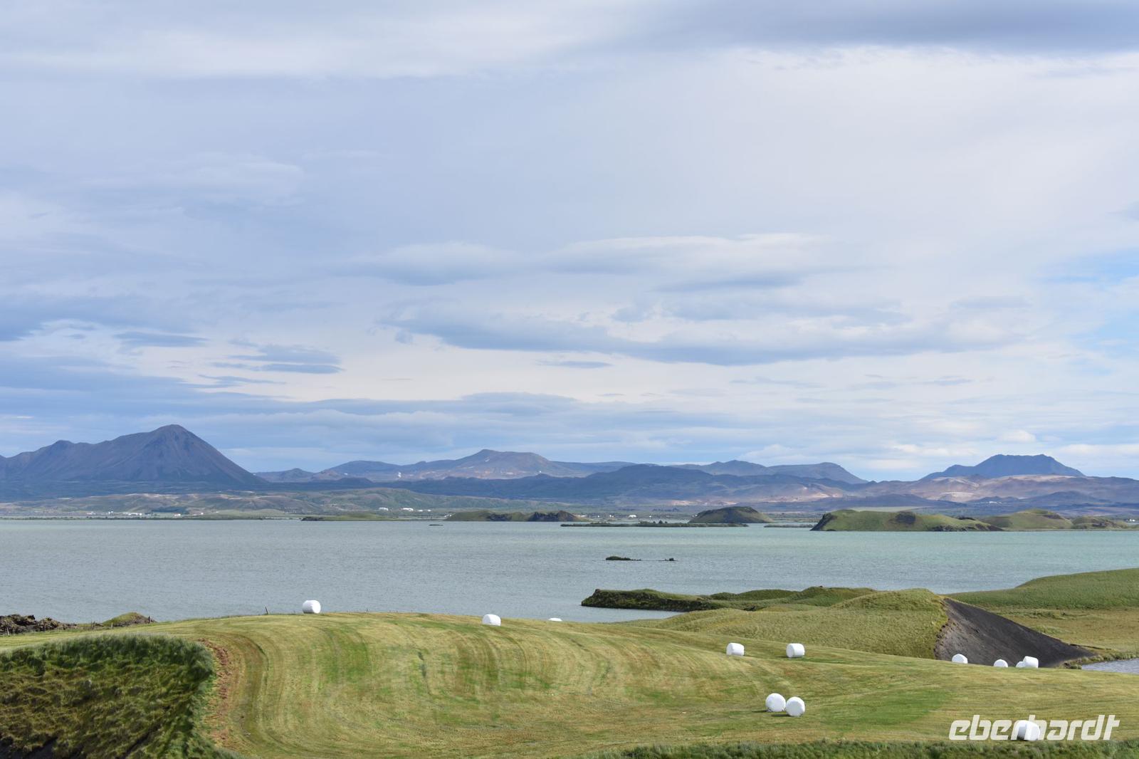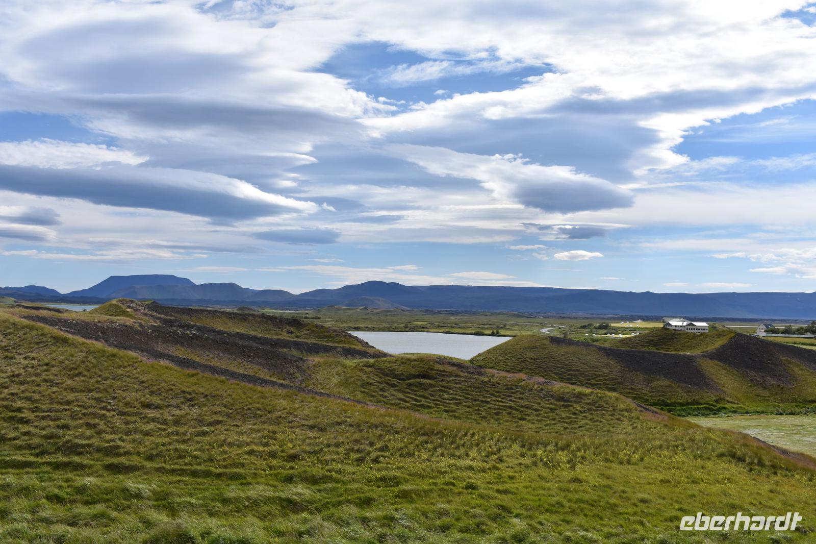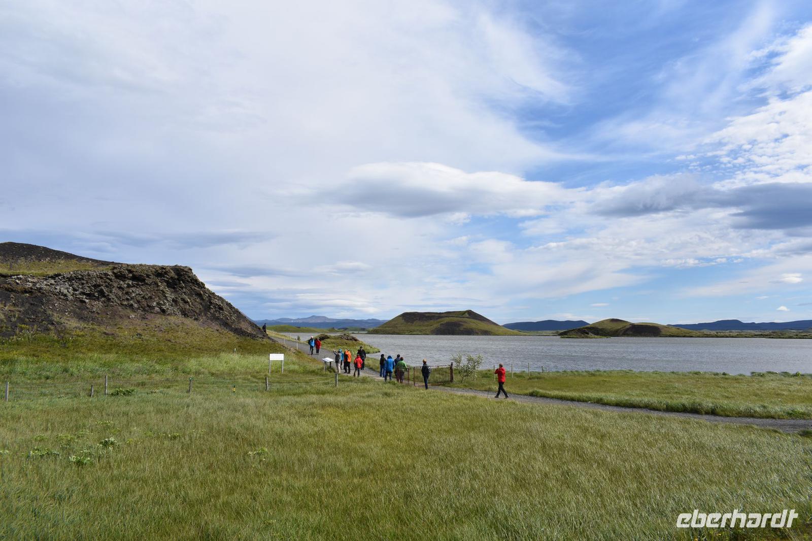 Am Morgen, nach dem Frühstück, sammelten wir unsere sieben Sachen und beluden den Bus. Wir fuhren weiter auf dem Highway Number 1 und stoppten zuerst am Götter-Wasserfall, dem Goðafoss. Ein beeindruckender Wasserfall, der tosend in die Tiefe stürzt. Vom Goðafoss ging es dann an den Mývatn-See zum Skútustaðagígar. Mývatn, die isländische Wortkombination aus Mücke und Wasser ließ nichts Gutes verheißen. Doch glücklicherweise war es Windig genug, dass uns die Mücken erspart blieben und wir so in Ruhe das Panorama und die falschen Vulcan-Krater des Skútustaðagígar genießen konnten. Auf dem Inselchen Höfði machten wir ein kleines Picknick und genossen den herrlichen Ausblick auf den See und die abstrakten Lava-Formationen. Statt der üblichen Gras-Landschaft fanden wir hier einen flachen, aber ziemlich dichten Birkenwald vor.