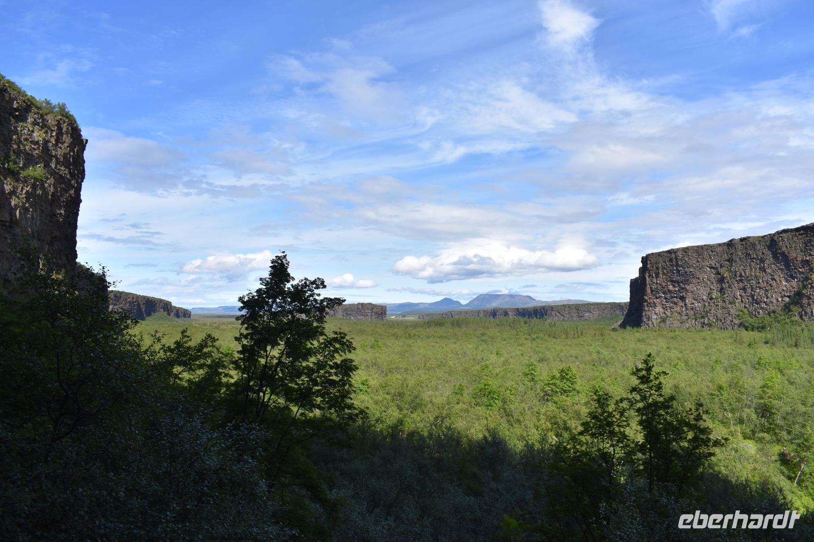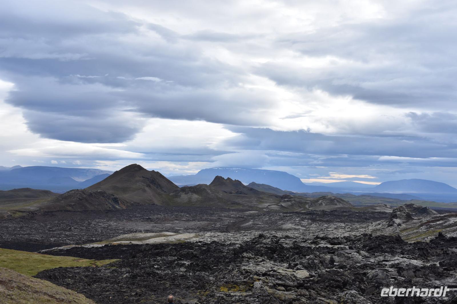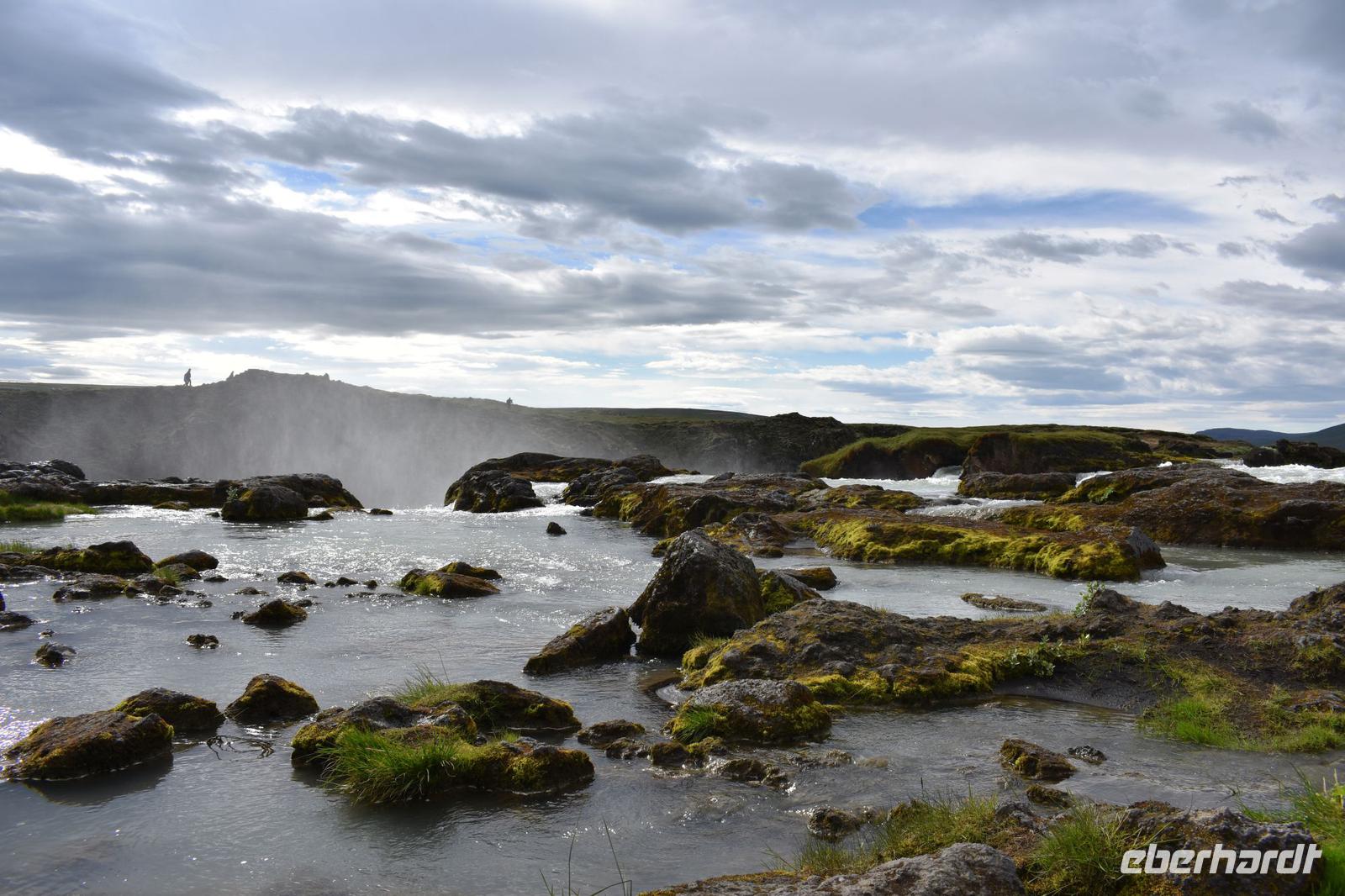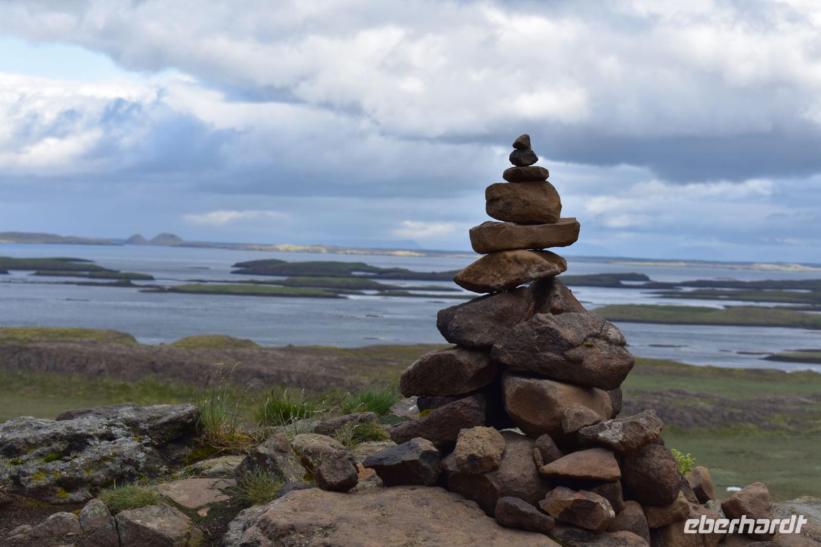 Am Morgen, nach dem Frühstück, sammelten wir unsere sieben Sachen und beluden den Bus. Wir fuhren weiter auf dem Highway Number 1 und stoppten zuerst am Götter-Wasserfall, dem Goðafoss. Ein beeindruckender Wasserfall, der tosend in die Tiefe stürzt. Vom Goðafoss ging es dann an den Mývatn-See zum Skútustaðagígar. Mývatn, die isländische Wortkombination aus Mücke und Wasser ließ nichts Gutes verheißen. Doch glücklicherweise war es Windig genug, dass uns die Mücken erspart blieben und wir so in Ruhe das Panorama und die falschen Vulcan-Krater des Skútustaðagígar genießen konnten. Auf dem Inselchen Höfði machten wir ein kleines Picknick und genossen den herrlichen Ausblick auf den See und die abstrakten Lava-Formationen. Statt der üblichen Gras-Landschaft fanden wir hier einen flachen, aber ziemlich dichten Birkenwald vor.
