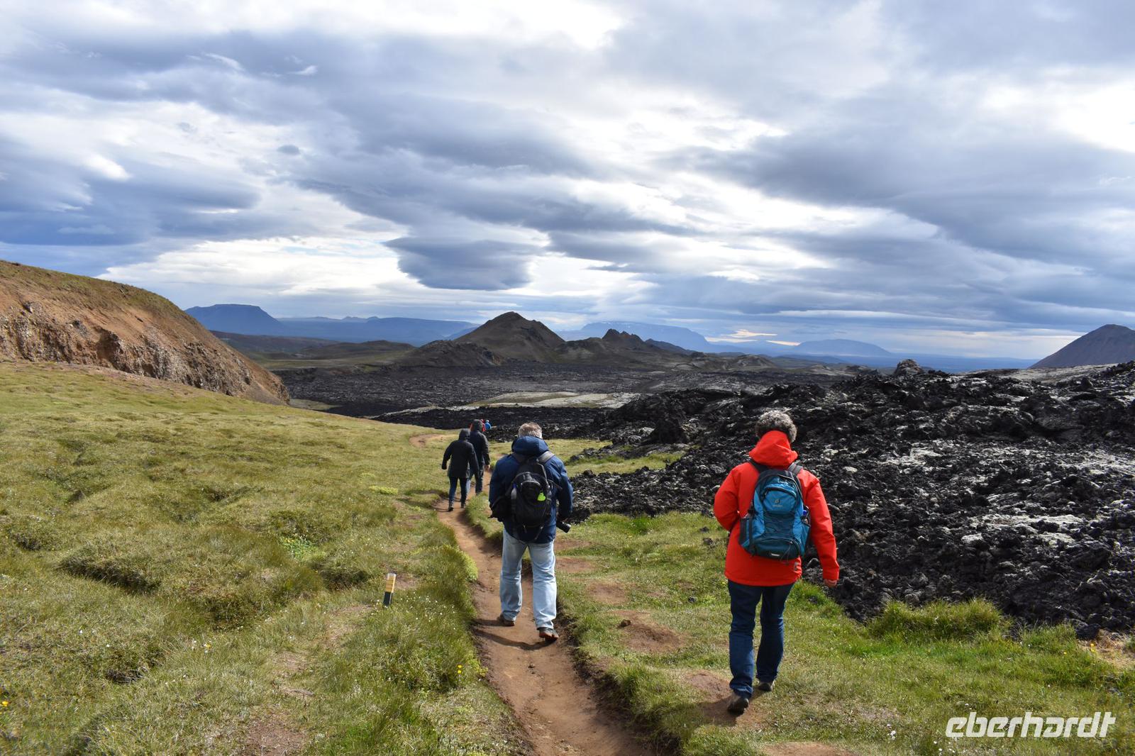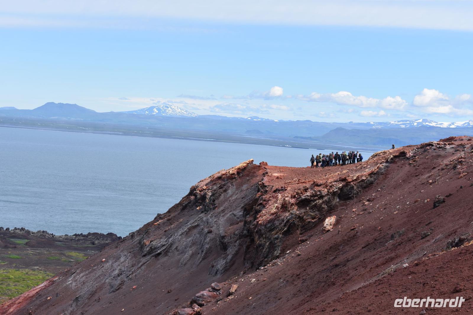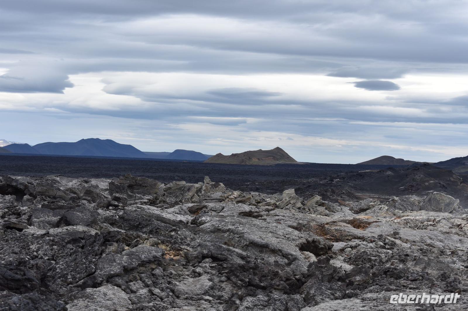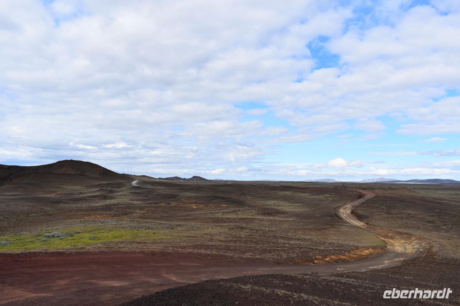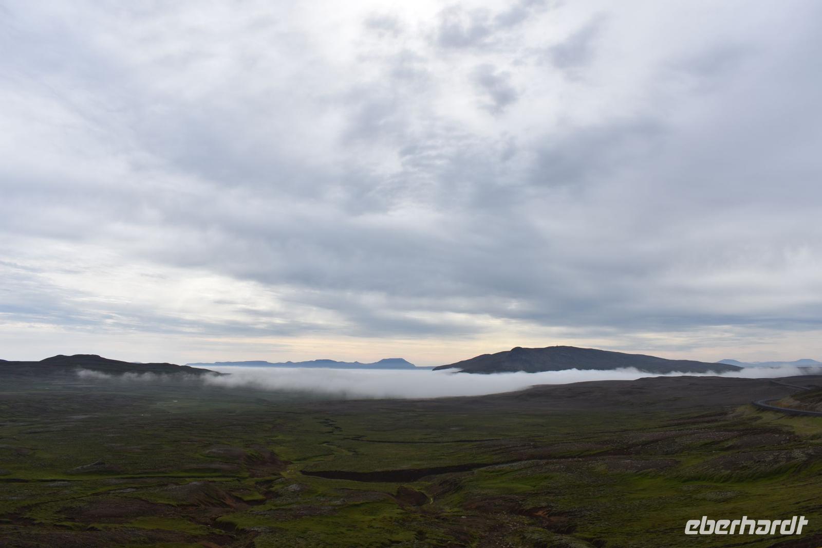 Am Morgen, nach dem Frühstück, sammelten wir unsere sieben Sachen und beluden den Bus. Wir fuhren weiter auf dem Highway Number 1 und stoppten zuerst am Götter-Wasserfall, dem Goðafoss. Ein beeindruckender Wasserfall, der tosend in die Tiefe stürzt. Vom Goðafoss ging es dann an den Mývatn-See zum Skútustaðagígar. Mývatn, die isländische Wortkombination aus Mücke und Wasser ließ nichts Gutes verheißen. Doch glücklicherweise war es Windig genug, dass uns die Mücken erspart blieben und wir so in Ruhe das Panorama und die falschen Vulcan-Krater des Skútustaðagígar genießen konnten. Auf dem Inselchen Höfði machten wir ein kleines Picknick und genossen den herrlichen Ausblick auf den See und die abstrakten Lava-Formationen. Statt der üblichen Gras-Landschaft fanden wir hier einen flachen, aber ziemlich dichten Birkenwald vor.