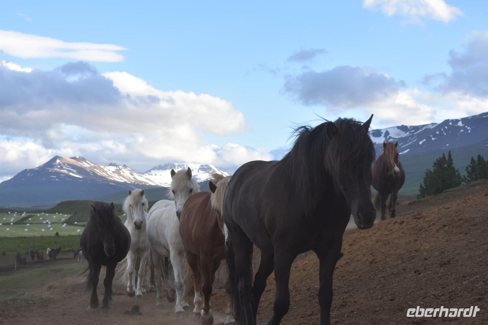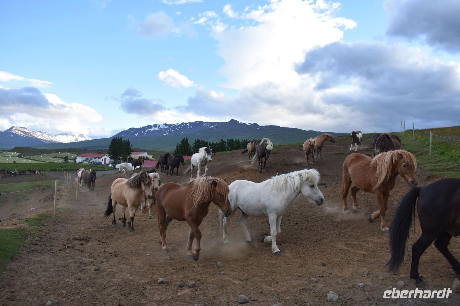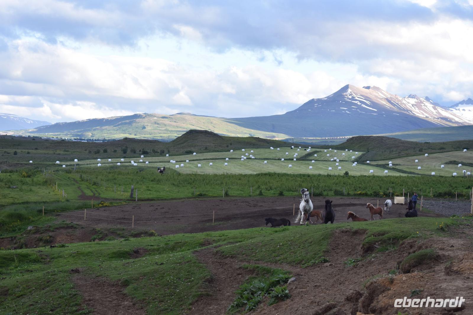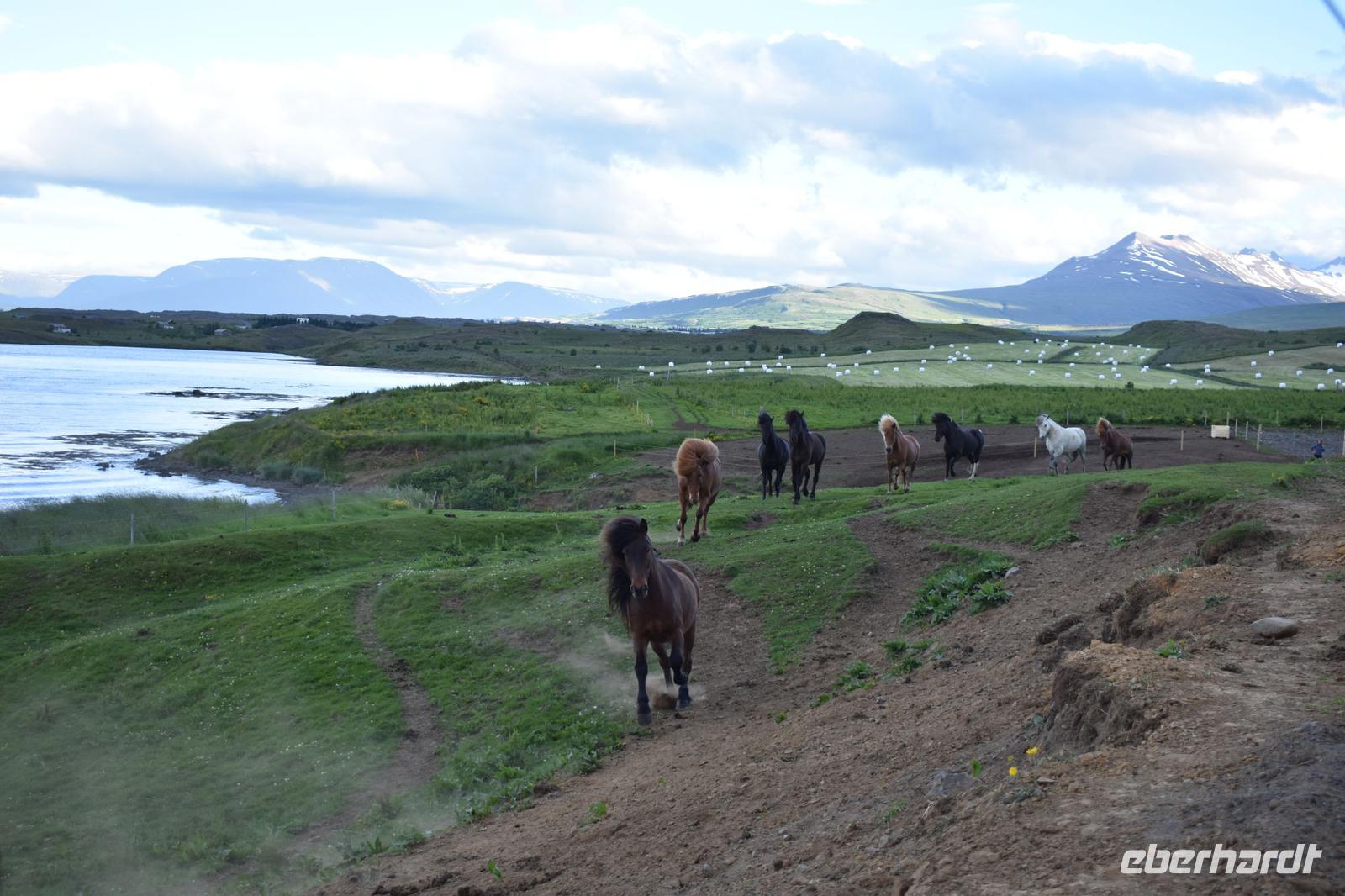 Mit einem ausgiebigen und interessanten Frühstück, wo man möglicherweise auch Papageientaucher verkosten konnte, bereiteten wir uns auf eine lange Fahrt vor. Von Langaholt ging es über die Straßen 54, 55, 54, 60, 59 und 68 bei Borðeyri wieder auf die Ringstraße Nummer 1. Dabei fuhren wir auch am Alftafjördur, dem Schwanenfjord, vorbei. An der N1 Tankstelle Staðarskáli nahe Borðeyri machten wir unsere Mittagspause und mussten erstmal unser Fahrzeug waschen, da es von oben bis unten mit Schlamm vollgespritzt war und man überhaupt nicht mehr raussehen konnte. Wir waren nun im Land der Pferdezüchter angekommen. Riesige Weiden mit Pferden sausten an der Fensterscheibe vorbei. Der nächste Halt war am Kolugljúfur Canyon und dessen Wasserfall - denn ein Wasserfall am Tag muss schon sein! Wir fuhren weiter über Húnavatn und Blönduós, bis wir nach Glaumbær kamen. Dort angekommen sahen wir uns das Byggðasafn Skagfirðinga (Regionalmuseum Skagfirðinga) an. So hatten wir einen schönen Einblick in die damaligen Behausungen der Isländer, die über Jahrhunderte in solch einfachen aber nützlichen „Erd-Häusern" dem groben Klima widerstanden. Von Glaumbær waren es nur noch zwei Stunden bis nach Akureyri. Mit fast 19.000 Einwohnern die viert größte Stadt Islands und somit die Hauptstadt des Nordens. Wir haben uns noch kurz das kleine Städtchen angesehen und spazierten vom Botanischer Garten (Lystigarður Akureyrar) zur Akureyrarkirkja (Kirche) bis zum Zentrum. Dann ging ein Stückchen weiter zum Hotel Kjarnalundur. Sowie wir ankamen mussten wir auch schon die Satteltaschen packen. Mit einem Transfer ging es auf die andere Seite der Stadt zur Skjaldarvík-Ranch. Dort warteten die Isländischen Schönheiten schon auf uns, denn zu Pferd ging es am wunderschönen Eyjafjörður-Fjord entlang. Das Wetter war super, das Panorama grandios! Die Abendsonne blitze durch die Wolkendecke hindurch und die weißen Gletscher erstrahlten in der Ferne.