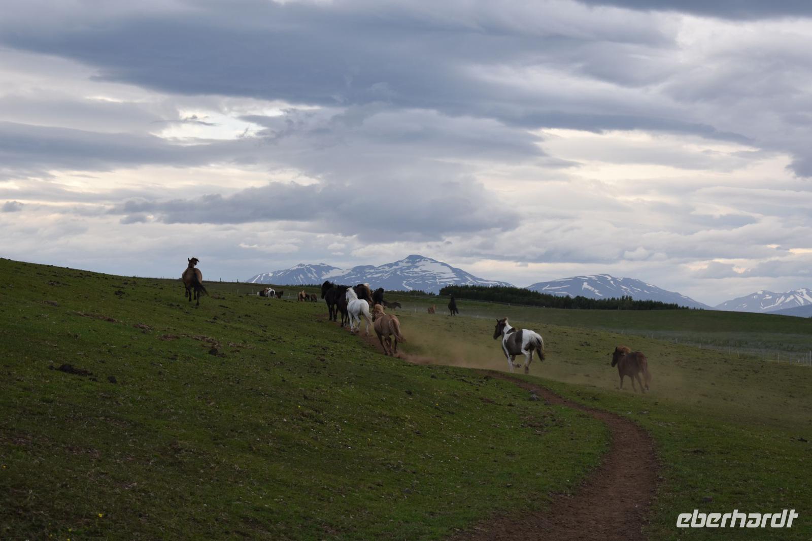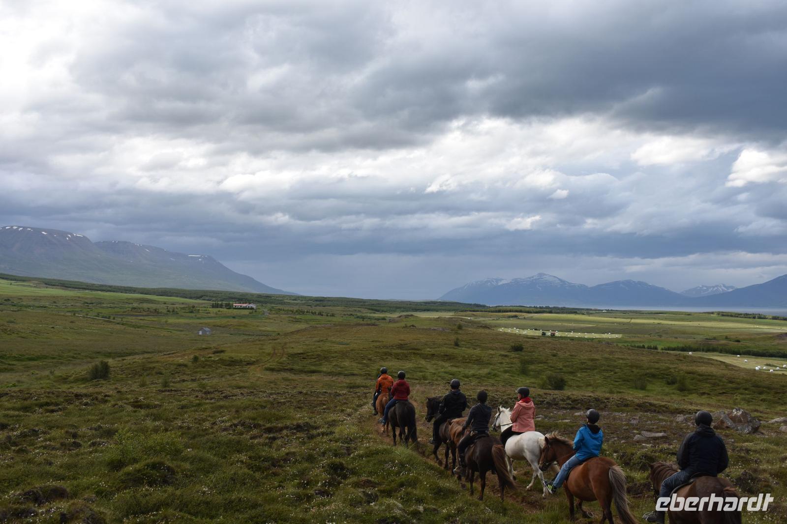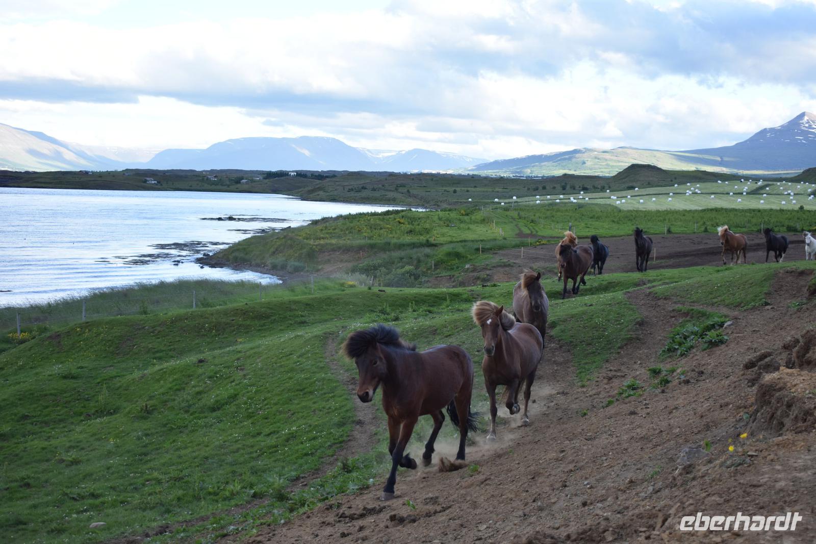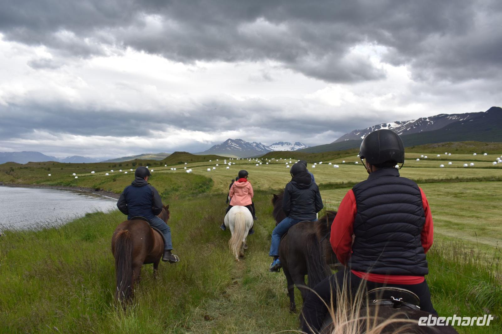 Mit einem ausgiebigen und interessanten Frühstück, wo man möglicherweise auch Papageientaucher verkosten konnte, bereiteten wir uns auf eine lange Fahrt vor. Von Langaholt ging es über die Straßen 54, 55, 54, 60, 59 und 68 bei Borðeyri wieder auf die Ringstraße Nummer 1. Dabei fuhren wir auch am Alftafjördur, dem Schwanenfjord, vorbei. An der N1 Tankstelle Staðarskáli nahe Borðeyri machten wir unsere Mittagspause und mussten erstmal unser Fahrzeug waschen, da es von oben bis unten mit Schlamm vollgespritzt war und man überhaupt nicht mehr raussehen konnte. Wir waren nun im Land der Pferdezüchter angekommen. Riesige Weiden mit Pferden sausten an der Fensterscheibe vorbei. Der nächste Halt war am Kolugljúfur Canyon und dessen Wasserfall - denn ein Wasserfall am Tag muss schon sein! Wir fuhren weiter über Húnavatn und Blönduós, bis wir nach Glaumbær kamen. Dort angekommen sahen wir uns das Byggðasafn Skagfirðinga (Regionalmuseum Skagfirðinga) an. So hatten wir einen schönen Einblick in die damaligen Behausungen der Isländer, die über Jahrhunderte in solch einfachen aber nützlichen „Erd-Häusern" dem groben Klima widerstanden. Von Glaumbær waren es nur noch zwei Stunden bis nach Akureyri. Mit fast 19.000 Einwohnern die viert größte Stadt Islands und somit die Hauptstadt des Nordens. Wir haben uns noch kurz das kleine Städtchen angesehen und spazierten vom Botanischer Garten (Lystigarður Akureyrar) zur Akureyrarkirkja (Kirche) bis zum Zentrum. Dann ging ein Stückchen weiter zum Hotel Kjarnalundur. Sowie wir ankamen mussten wir auch schon die Satteltaschen packen. Mit einem Transfer ging es auf die andere Seite der Stadt zur Skjaldarvík-Ranch. Dort warteten die Isländischen Schönheiten schon auf uns, denn zu Pferd ging es am wunderschönen Eyjafjörður-Fjord entlang. Das Wetter war super, das Panorama grandios! Die Abendsonne blitze durch die Wolkendecke hindurch und die weißen Gletscher erstrahlten in der Ferne.