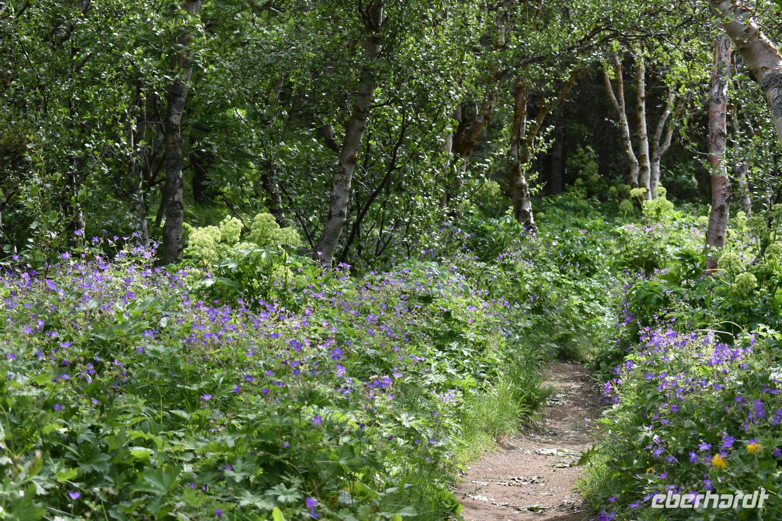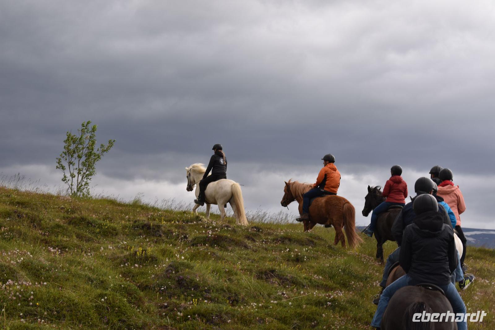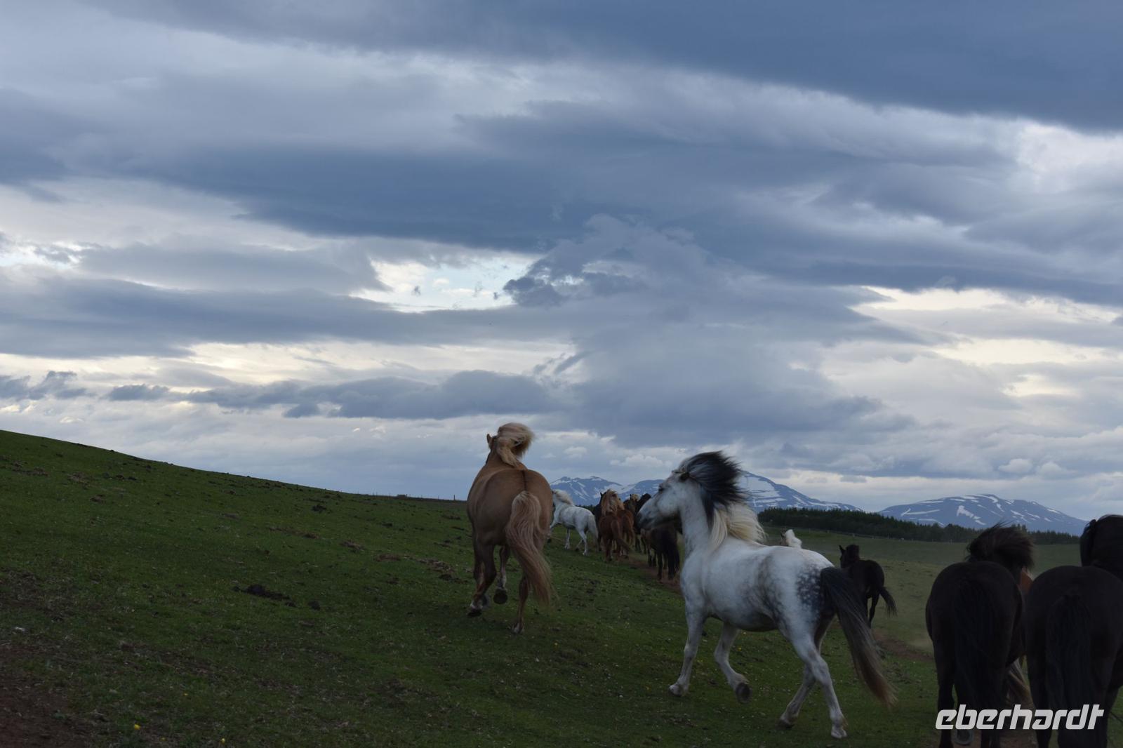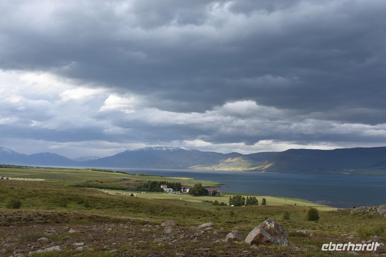 Mit einem ausgiebigen und interessanten Frühstück, wo man möglicherweise auch Papageientaucher verkosten konnte, bereiteten wir uns auf eine lange Fahrt vor. Von Langaholt ging es über die Straßen 54, 55, 54, 60, 59 und 68 bei Borðeyri wieder auf die Ringstraße Nummer 1. Dabei fuhren wir auch am Alftafjördur, dem Schwanenfjord, vorbei. An der N1 Tankstelle Staðarskáli nahe Borðeyri machten wir unsere Mittagspause und mussten erstmal unser Fahrzeug waschen, da es von oben bis unten mit Schlamm vollgespritzt war und man überhaupt nicht mehr raussehen konnte. Wir waren nun im Land der Pferdezüchter angekommen. Riesige Weiden mit Pferden sausten an der Fensterscheibe vorbei. Der nächste Halt war am Kolugljúfur Canyon und dessen Wasserfall - denn ein Wasserfall am Tag muss schon sein! Wir fuhren weiter über Húnavatn und Blönduós, bis wir nach Glaumbær kamen. Dort angekommen sahen wir uns das Byggðasafn Skagfirðinga (Regionalmuseum Skagfirðinga) an. So hatten wir einen schönen Einblick in die damaligen Behausungen der Isländer, die über Jahrhunderte in solch einfachen aber nützlichen „Erd-Häusern" dem groben Klima widerstanden. Von Glaumbær waren es nur noch zwei Stunden bis nach Akureyri. Mit fast 19.000 Einwohnern die viert größte Stadt Islands und somit die Hauptstadt des Nordens. Wir haben uns noch kurz das kleine Städtchen angesehen und spazierten vom Botanischer Garten (Lystigarður Akureyrar) zur Akureyrarkirkja (Kirche) bis zum Zentrum. Dann ging ein Stückchen weiter zum Hotel Kjarnalundur. Sowie wir ankamen mussten wir auch schon die Satteltaschen packen. Mit einem Transfer ging es auf die andere Seite der Stadt zur Skjaldarvík-Ranch. Dort warteten die Isländischen Schönheiten schon auf uns, denn zu Pferd ging es am wunderschönen Eyjafjörður-Fjord entlang. Das Wetter war super, das Panorama grandios! Die Abendsonne blitze durch die Wolkendecke hindurch und die weißen Gletscher erstrahlten in der Ferne.