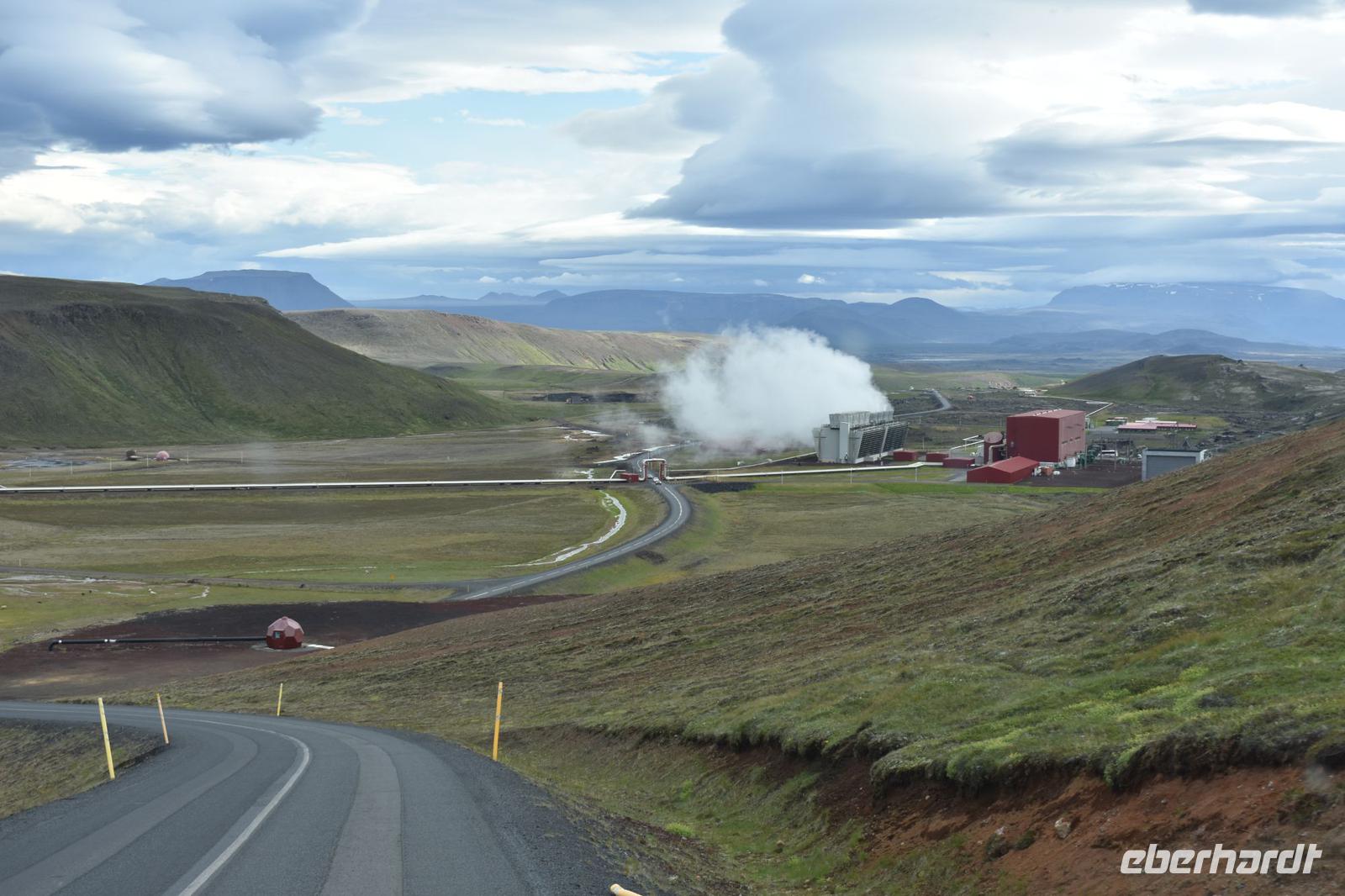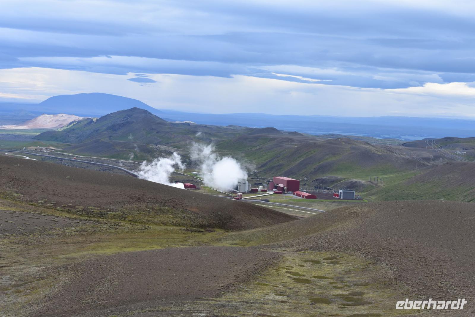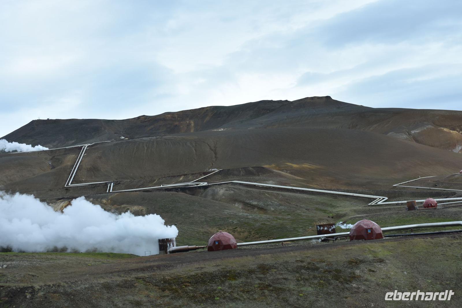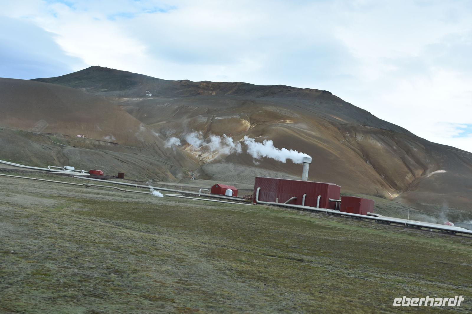 Für mich der Höhepunkt des Tages: der Besuch von Namaskardh und Krafla! Wir tauchten in eine völlig andere Welt ein. Man konnte kaum mehr glauben noch auf der Erde zu sein. Diesen Ort würde ich doch eher auf einem anderen Planeten vermuten. Überall dampfte und rauchte es. Moderne Fabriken, die von außen schon etwas spacig aussahen, sah man in dieser Mondlandschaft. Der Mensch macht sich hier die geothermalen Aktivitäten für die Energiegewinnung zu Nutze. Aber auch der penetrante Schwefelgeruch, die blubbernden Wasser- und Schlammlöcher und die gigantische Schwarze Lava die noch immer raucht und qualmt war extrem beeindruckend.