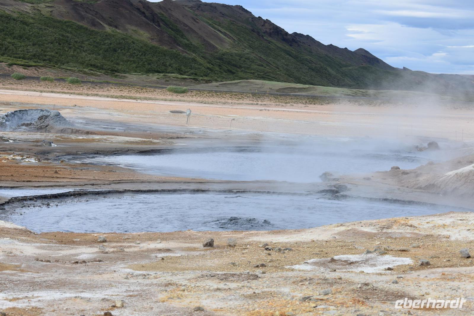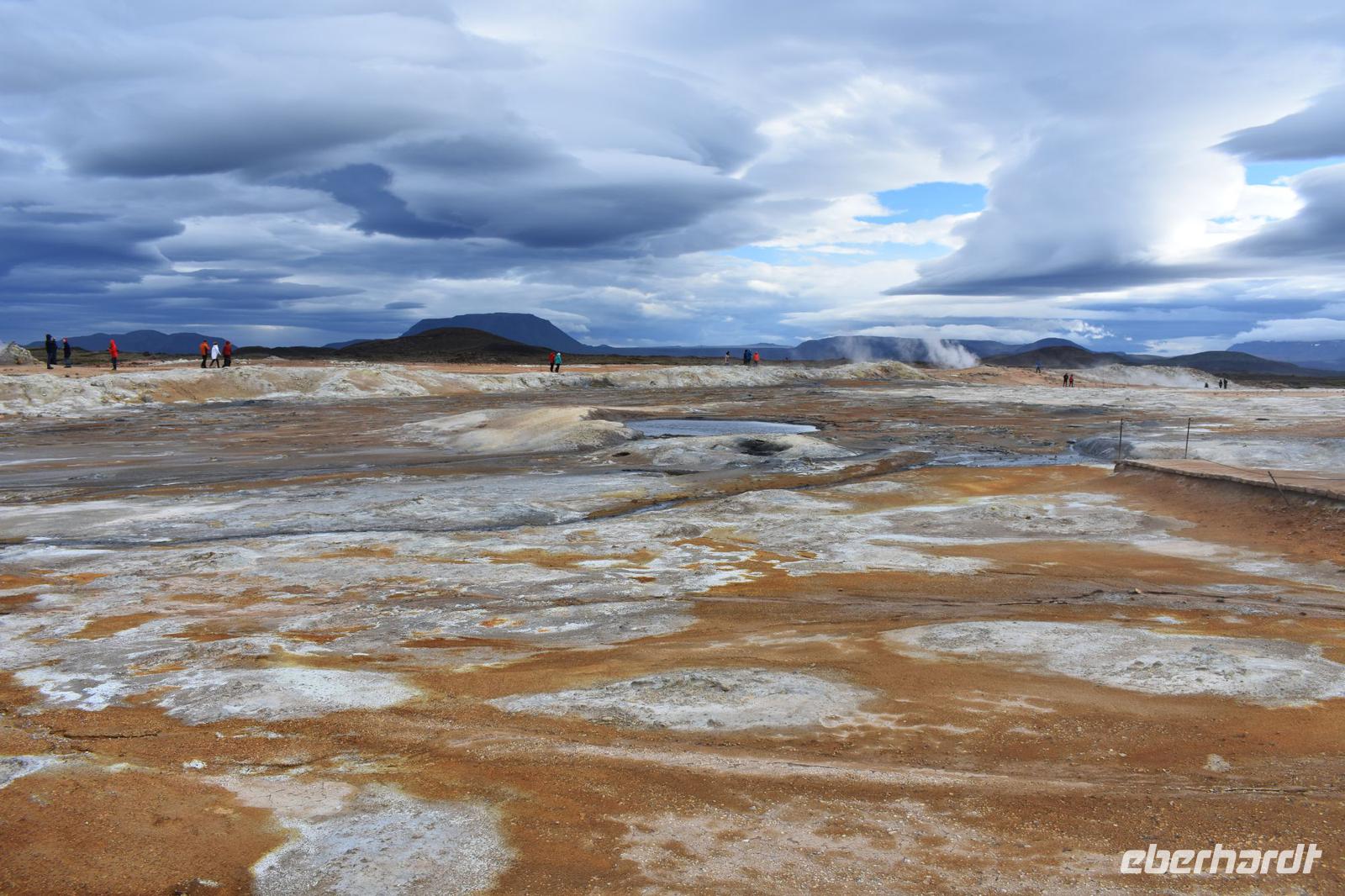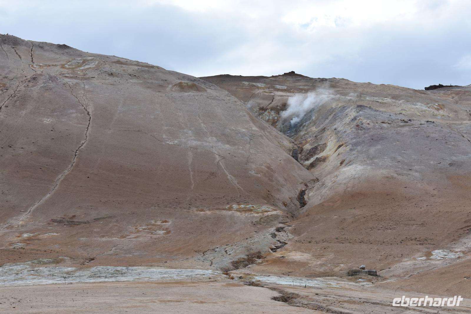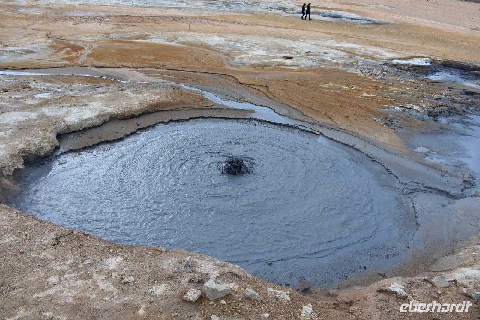 Für mich der Höhepunkt des Tages: der Besuch von Namaskardh und Krafla! Wir tauchten in eine völlig andere Welt ein. Man konnte kaum mehr glauben noch auf der Erde zu sein. Diesen Ort würde ich doch eher auf einem anderen Planeten vermuten. Überall dampfte und rauchte es. Moderne Fabriken, die von außen schon etwas spacig aussahen, sah man in dieser Mondlandschaft. Der Mensch macht sich hier die geothermalen Aktivitäten für die Energiegewinnung zu Nutze. Aber auch der penetrante Schwefelgeruch, die blubbernden Wasser- und Schlammlöcher und die gigantische Schwarze Lava die noch immer raucht und qualmt war extrem beeindruckend.