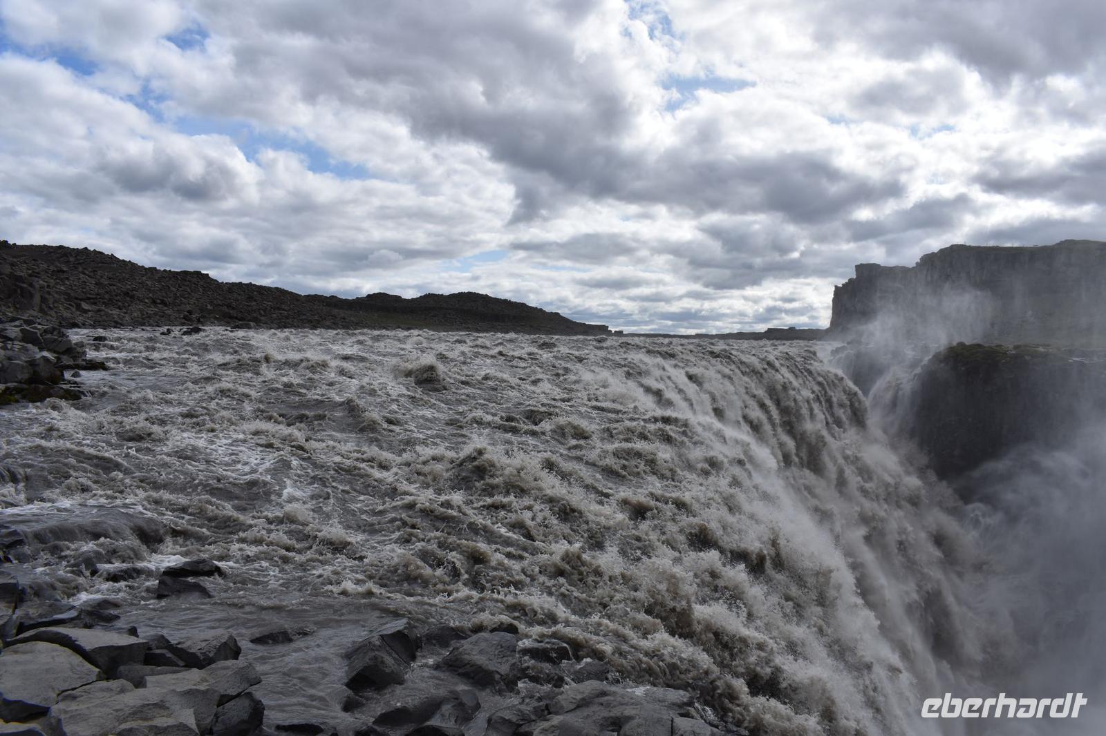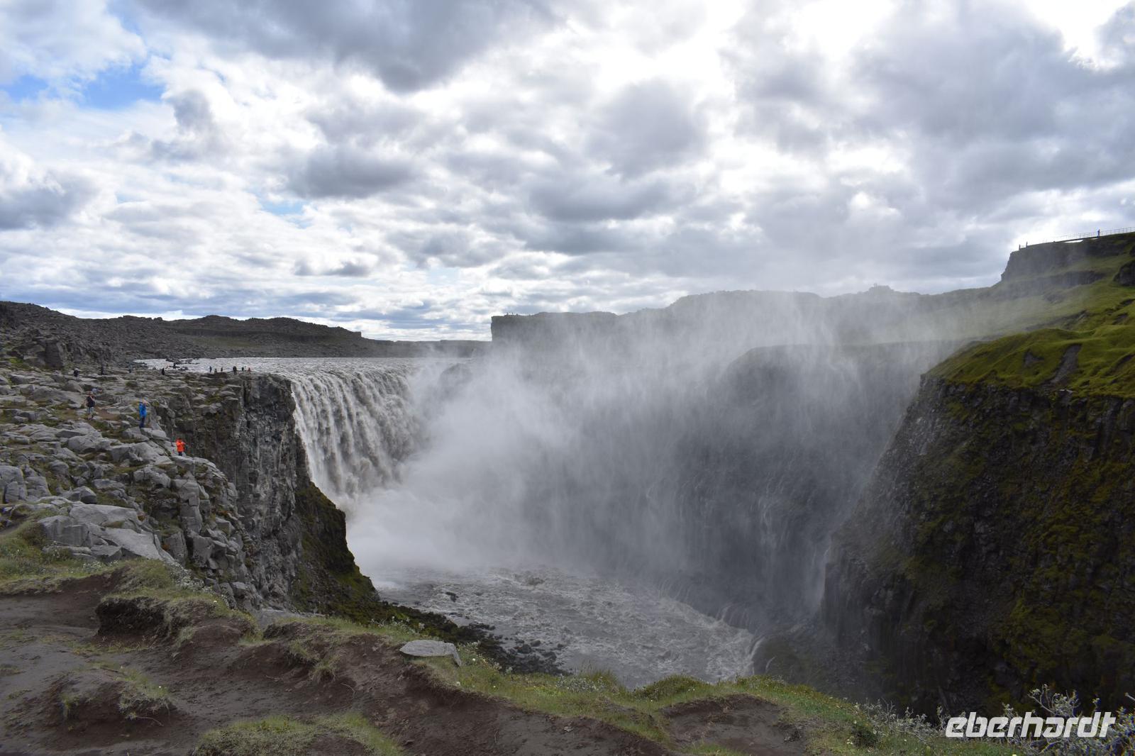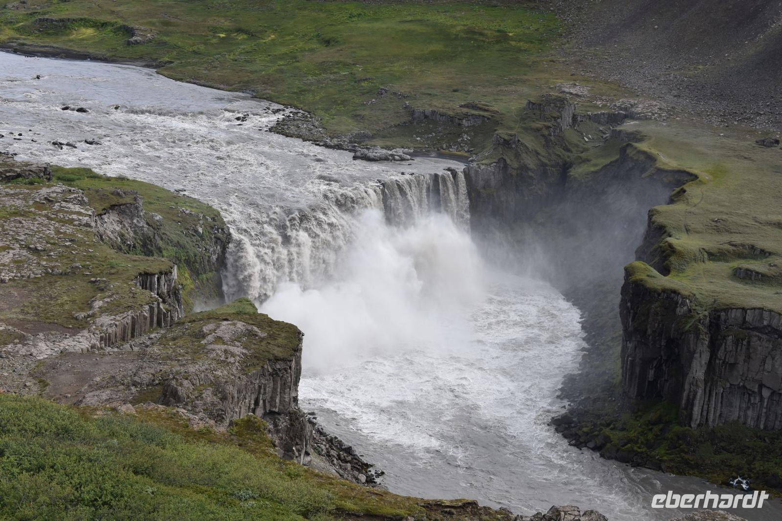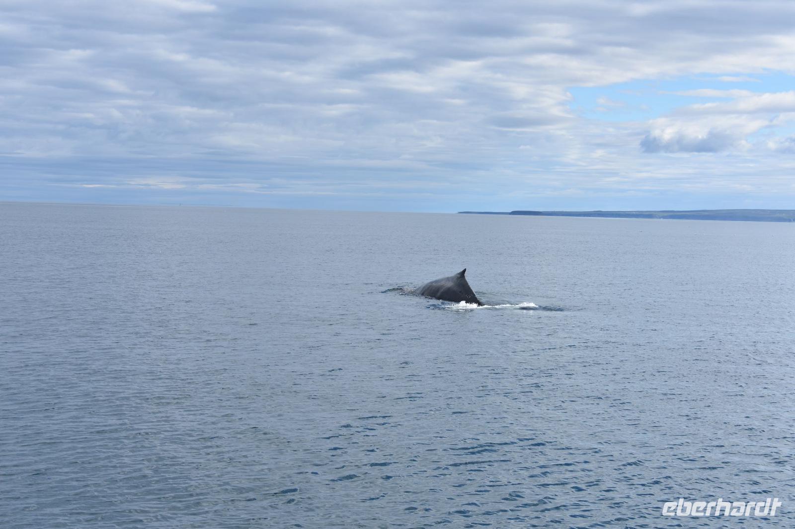 Morgens stand eine Walbeobachtung auf dem Programm. Zu Fuß gingen wir vom Hotel, dass nahe am Hafen lag, zum Wal-Shop. Nach dem das finanzielle geregelt war spazierten wir zum Boot und zogen die klobigen Overalls an. Wenig später stachen wir in See. Wir querten die Bucht vor Húsavík in Richtung der Halbinsel Flateyjarskagi. Das Meer war extrem flach und ruhig, die Sonne schien uns ins Gesicht. Auf die Wale mussten wir etwas warten, dann zeigten sie sich aber doch. Nahe den steilen Klippen waren sie auf der Jagd. Wir sahen die Rücken und Flossen der Zwerg- und Buckelwale. Ziemlich spannend und aufregend, da man nie weiß wo diese gigantischen Tiere auftauchen. Nach dieser tollen Begegnung mit den Riesen der Meere nutzten wir die Gelegenheit in Húsavík für einen Mittagssnack. Dann zogen wir weiter bis nach Ásbyrgi, wo der Sage nach Odins Pferd Sleipnir einen Huf auf die Erde setzte und einen riesigen Hufabdruck hinterließ - die Schlucht von Ásbyrgi. Dann ging es weiter zum Dettifoss, der in einem Abschnitt des Fluss Jökulsá á Fjöllum liegt, der mit 206 Kilometern Länge der zweit größte Fluss Islands ist und dem Gletscher Vatnajökull als Abfluss dient. Der Dettifoss, ein gigantischer Wasserfall mit einem reißenden Strom - einer der größten Wasserfälle Europas. Mit durchschnittlich 193 m³ por Sekunde schon ganz gewaltig. Doch war es momentan eh schon sehr nass und alle Gewässer extrem gut gefüllt, was den Dettifoss noch viel mächtiger und gewaltiger machte als er sowie schon ist. Mit lautem Donner rauschten die Wassermassen rund 45 Meter in die Tiefe.