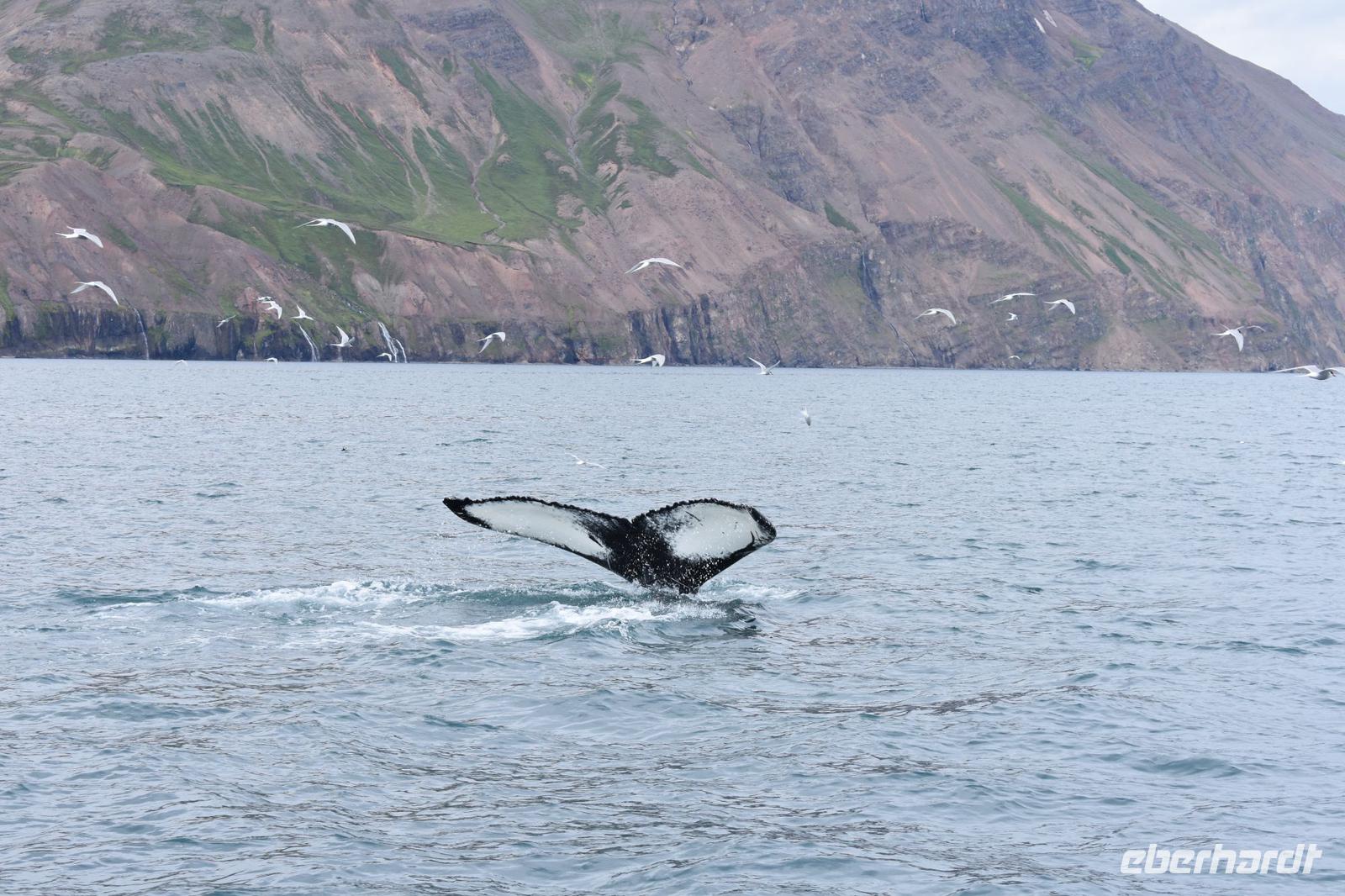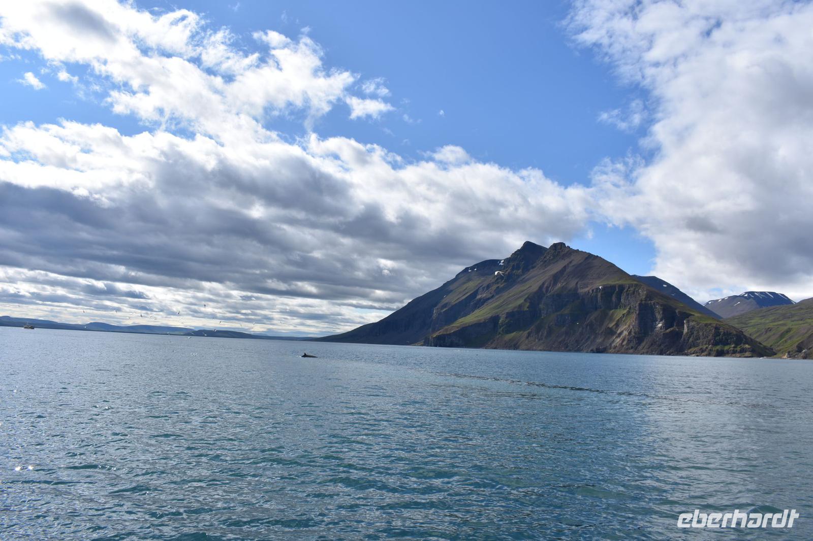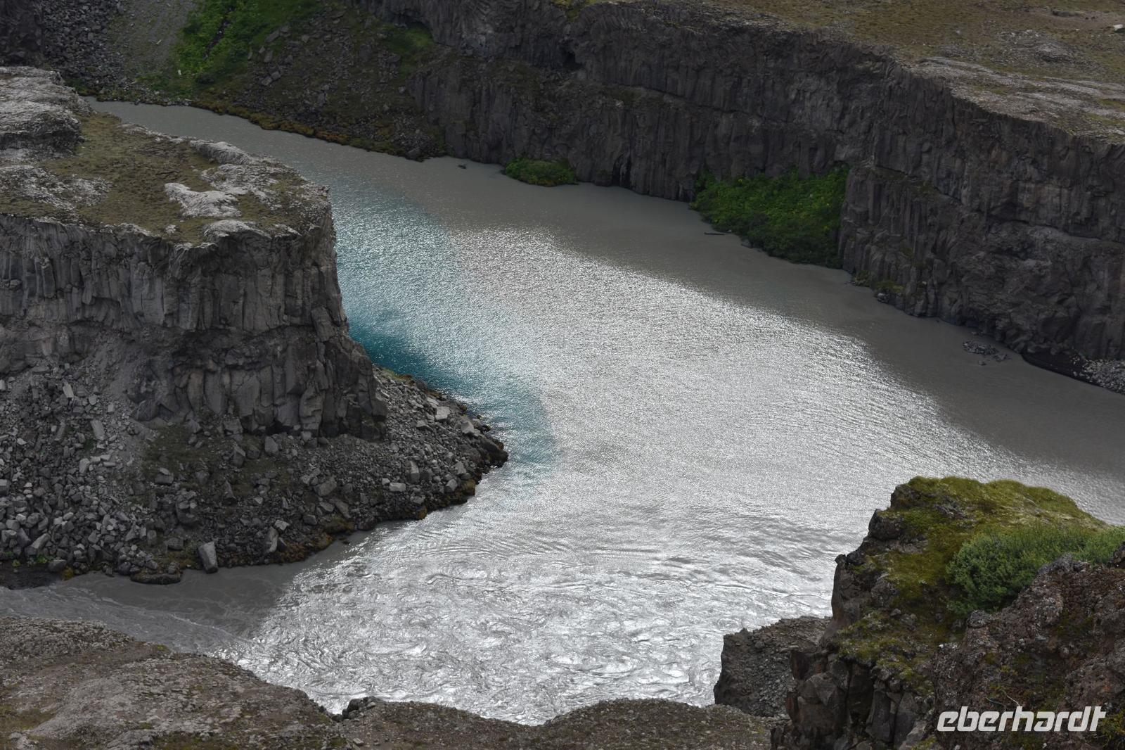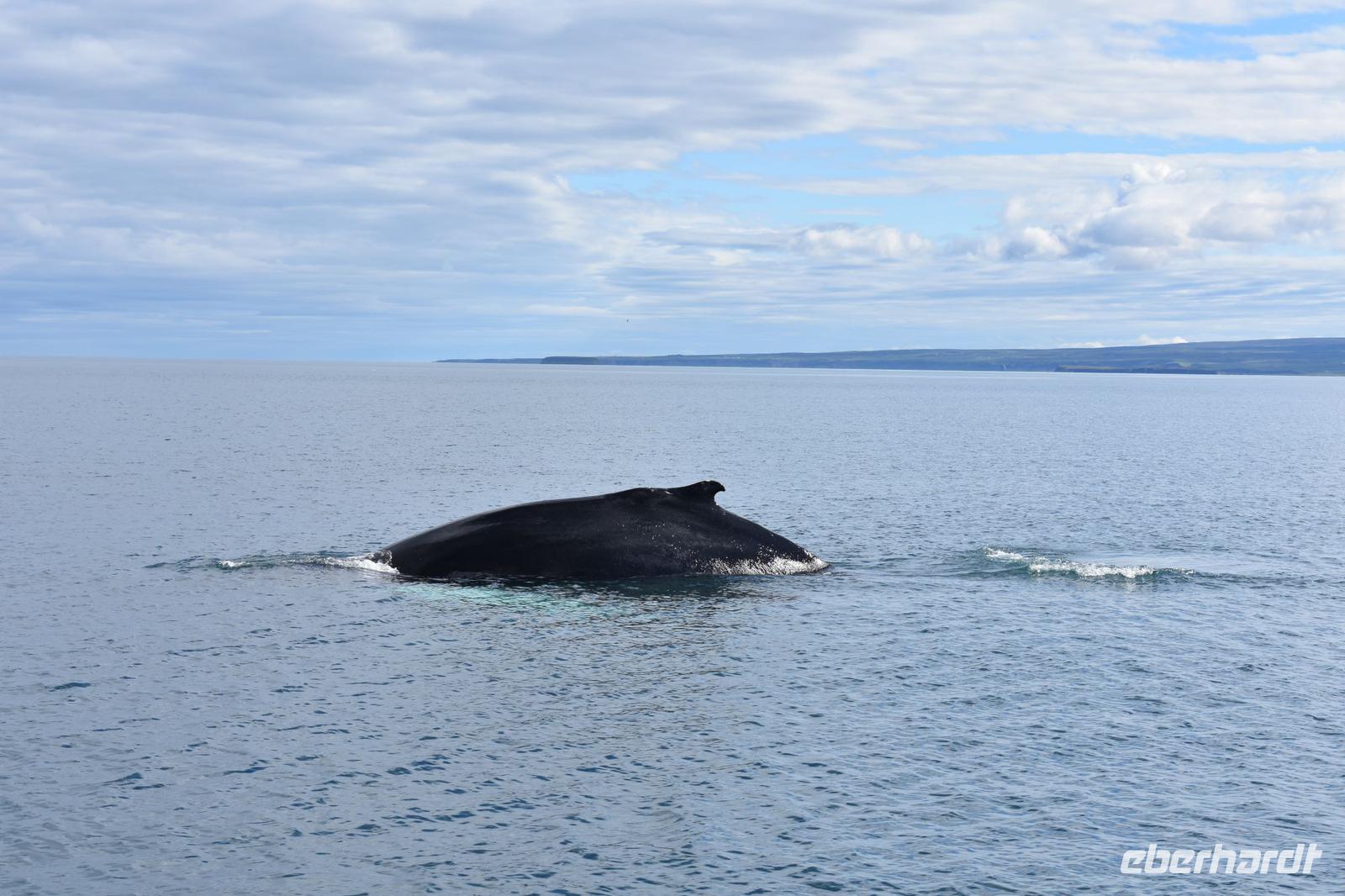 Morgens stand eine Walbeobachtung auf dem Programm. Zu Fuß gingen wir vom Hotel, dass nahe am Hafen lag, zum Wal-Shop. Nach dem das finanzielle geregelt war spazierten wir zum Boot und zogen die klobigen Overalls an. Wenig später stachen wir in See. Wir querten die Bucht vor Húsavík in Richtung der Halbinsel Flateyjarskagi. Das Meer war extrem flach und ruhig, die Sonne schien uns ins Gesicht. Auf die Wale mussten wir etwas warten, dann zeigten sie sich aber doch. Nahe den steilen Klippen waren sie auf der Jagd. Wir sahen die Rücken und Flossen der Zwerg- und Buckelwale. Ziemlich spannend und aufregend, da man nie weiß wo diese gigantischen Tiere auftauchen. Nach dieser tollen Begegnung mit den Riesen der Meere nutzten wir die Gelegenheit in Húsavík für einen Mittagssnack. Dann zogen wir weiter bis nach Ásbyrgi, wo der Sage nach Odins Pferd Sleipnir einen Huf auf die Erde setzte und einen riesigen Hufabdruck hinterließ - die Schlucht von Ásbyrgi. Dann ging es weiter zum Dettifoss, der in einem Abschnitt des Fluss Jökulsá á Fjöllum liegt, der mit 206 Kilometern Länge der zweit größte Fluss Islands ist und dem Gletscher Vatnajökull als Abfluss dient. Der Dettifoss, ein gigantischer Wasserfall mit einem reißenden Strom - einer der größten Wasserfälle Europas. Mit durchschnittlich 193 m³ por Sekunde schon ganz gewaltig. Doch war es momentan eh schon sehr nass und alle Gewässer extrem gut gefüllt, was den Dettifoss noch viel mächtiger und gewaltiger machte als er sowie schon ist. Mit lautem Donner rauschten die Wassermassen rund 45 Meter in die Tiefe.