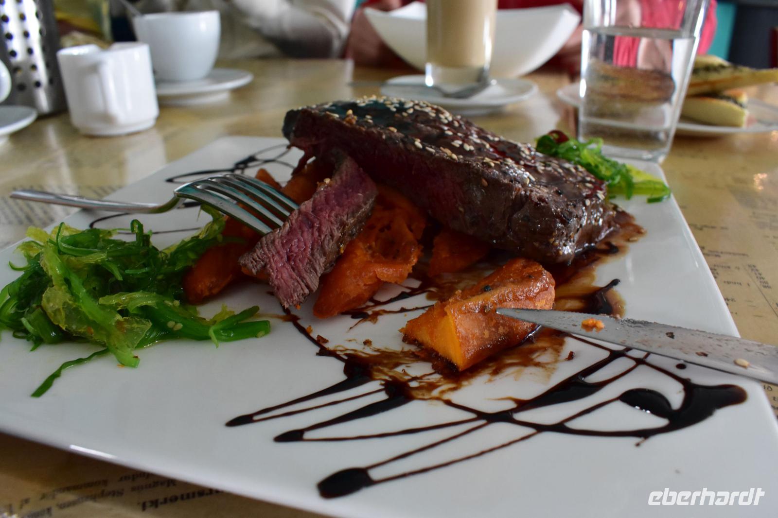 Zum Mittagessen stoppten wir im kleinen Örtchen Langanesbyggð bei Þórshöfn und aßen im Restaurant Báran. Ein paar von uns probierten hier ein Stück Walsteak, was als Delikatesse gilt und das es auch nicht in allen Restaurants gibt - zum Glück! So bleibt es ein kostbares Stück Nahrung was entsprechend wertgeschätzt wird.