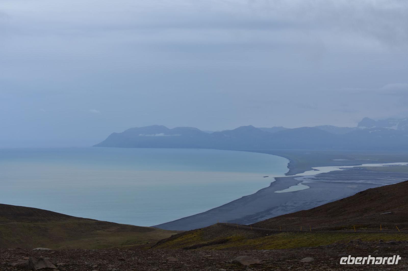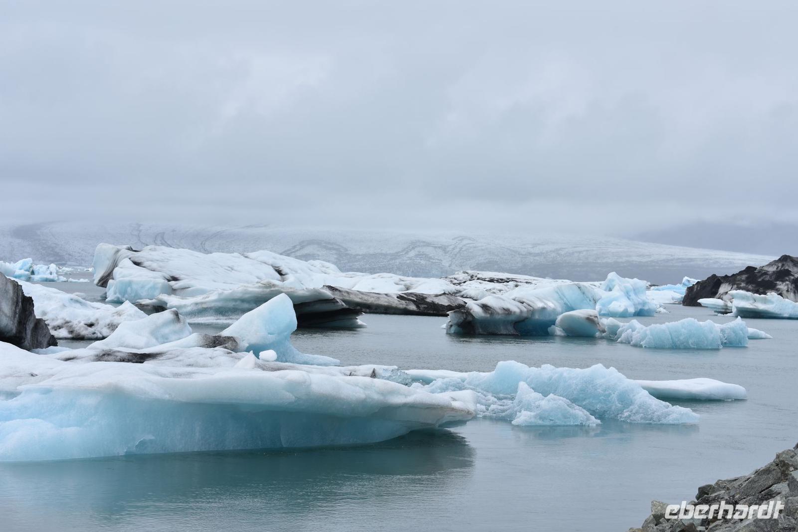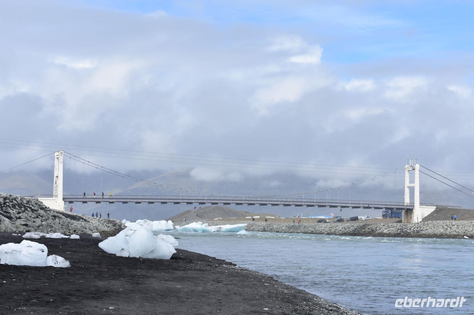 Wir verließen den Fischerort Fáskrúðsfjörður und fuhren erst mal rund 200 Kilometer in den Südwesten. Wir kamen an Djúpivogur und an einer Lagune vorbei, in der tausende von Schwänen leben. Die breite Wasseroberfläche war überseht mit zahlreichen weißen Punkten, soweit man gucken konnte. Wir kamen nach Höfn, wo wir uns stärken konnten. Von hier war es nun nicht mehr weit zum Jökulsárlón Gletschersee, den wir natürlich auf keinen Fall auslassen konnten. Gigantische Eisschollen trieben hier im Wasser und machten sich langsam auf den Weg um ins Meer gespült zu werden. Wir fuhren dann auch noch mal über die Hängebrücke um am schwarzen Strand die herangespülten Eisdiamanten zu bewundern.