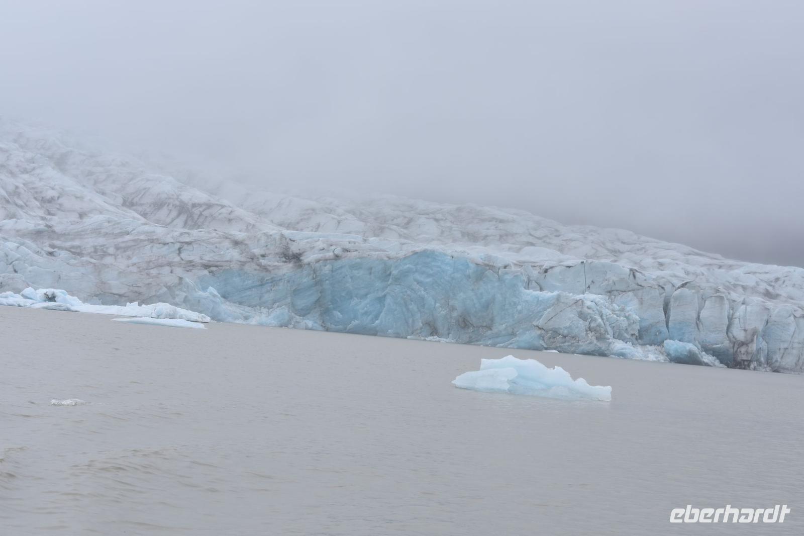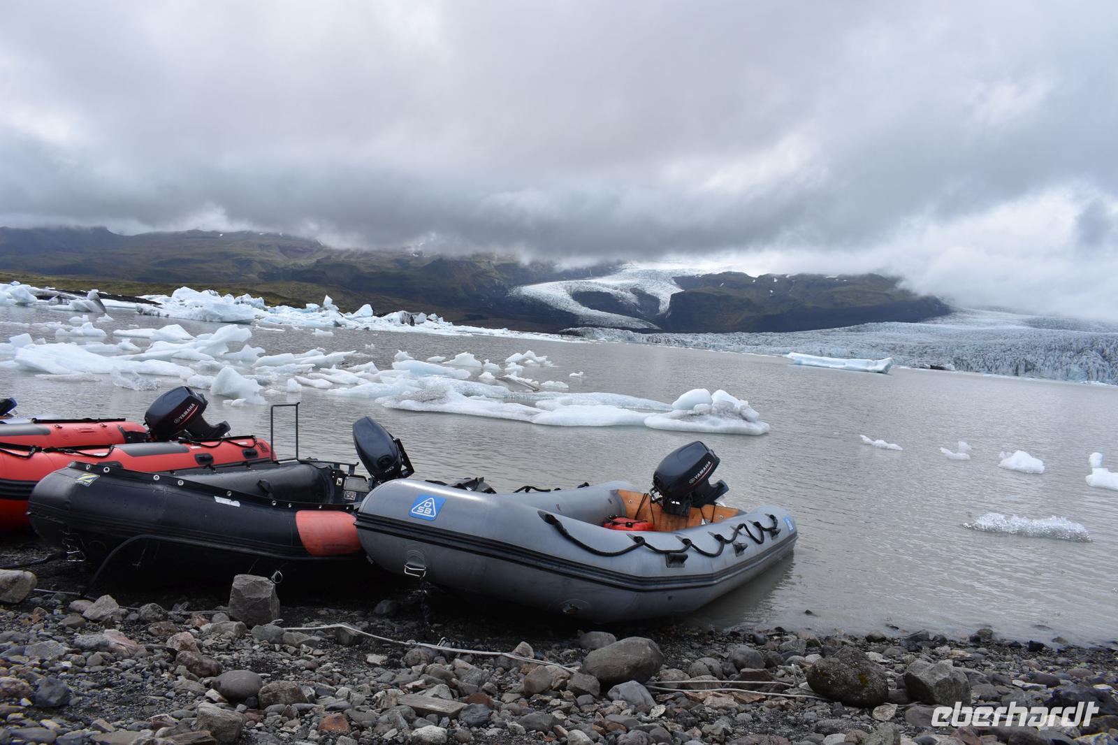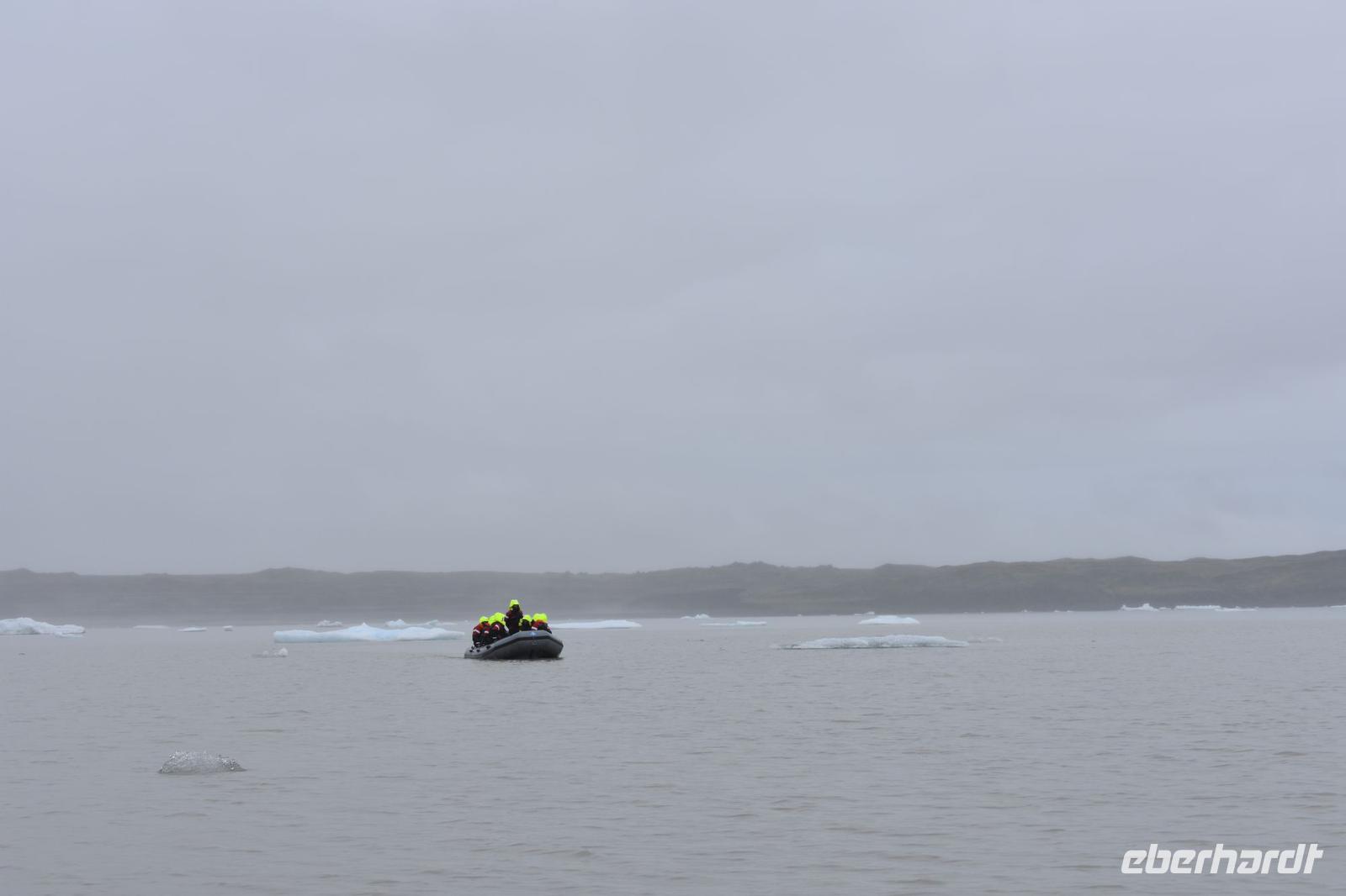 Nach diesem beeindruckenden Fotostopp fuhren wir ein paar Minuten weiter zum Fjallsarlon wo wir uns für eine Bootstour angemeldet hatten. Wir bekamen große, schwere Jacken die uns gegen Wind und Kälte schützen sollten. Wir mussten ein paar Meter zur Lagune gehen, als wir dort ankamen setzte leichter Nieselregen ein. Wir gingen an Bord der Schlauchboote und machte uns für die Fahrt bereit. Der Regen wurde stärker - die Sicht war nun absolut miserabel. Unsere Hosen waren nach wenigen Minuten pitschnass. Aber das hat uns nicht davonabgehalten diese Naturgewalt aus der Nähe zu betrachten. Auf dem Rückweg kam sogar wieder die Sonne durch, die Sicht verbesserte sich und der Gletscher zeigte uns seine ganze Schönheit. Das kompakte, dichte Eis strahlte in seinem leuchtendem Blau uns entgegen. Da nun die Sonne wieder schien und unsere Bootsfahrt beendet war, stießen wir mit einer Flasche Brennevin, mit Gletscher-Eis gekühlt, auf Island an.