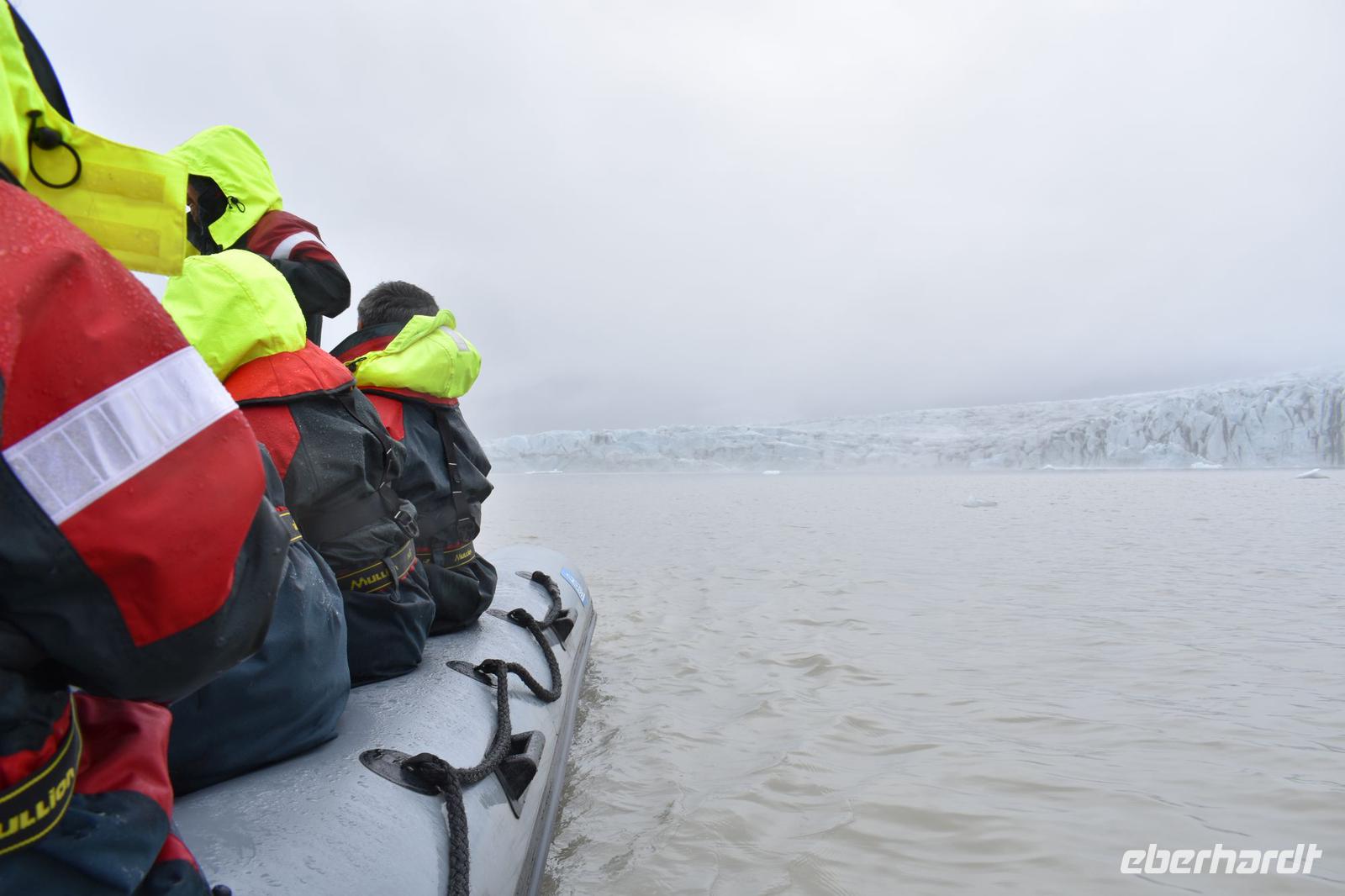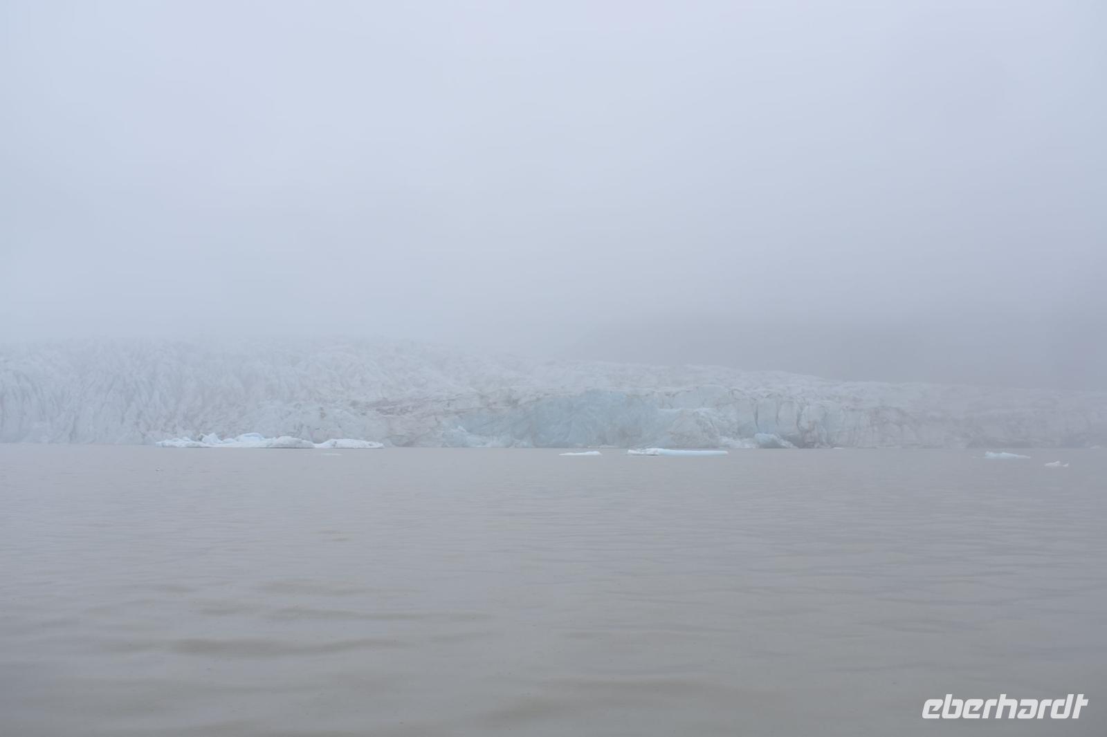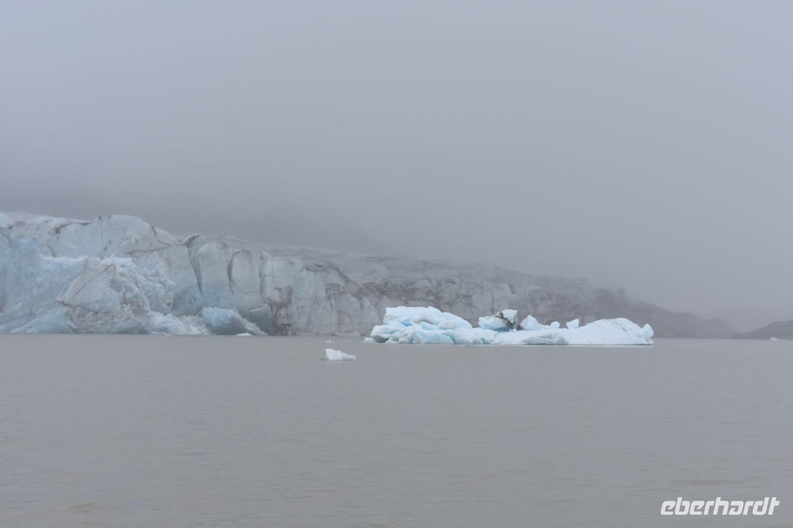 Nach diesem beeindruckenden Fotostopp fuhren wir ein paar Minuten weiter zum Fjallsarlon wo wir uns für eine Bootstour angemeldet hatten. Wir bekamen große, schwere Jacken die uns gegen Wind und Kälte schützen sollten. Wir mussten ein paar Meter zur Lagune gehen, als wir dort ankamen setzte leichter Nieselregen ein. Wir gingen an Bord der Schlauchboote und machte uns für die Fahrt bereit. Der Regen wurde stärker - die Sicht war nun absolut miserabel. Unsere Hosen waren nach wenigen Minuten pitschnass. Aber das hat uns nicht davonabgehalten diese Naturgewalt aus der Nähe zu betrachten. Auf dem Rückweg kam sogar wieder die Sonne durch, die Sicht verbesserte sich und der Gletscher zeigte uns seine ganze Schönheit. Das kompakte, dichte Eis strahlte in seinem leuchtendem Blau uns entgegen. Da nun die Sonne wieder schien und unsere Bootsfahrt beendet war, stießen wir mit einer Flasche Brennevin, mit Gletscher-Eis gekühlt, auf Island an.