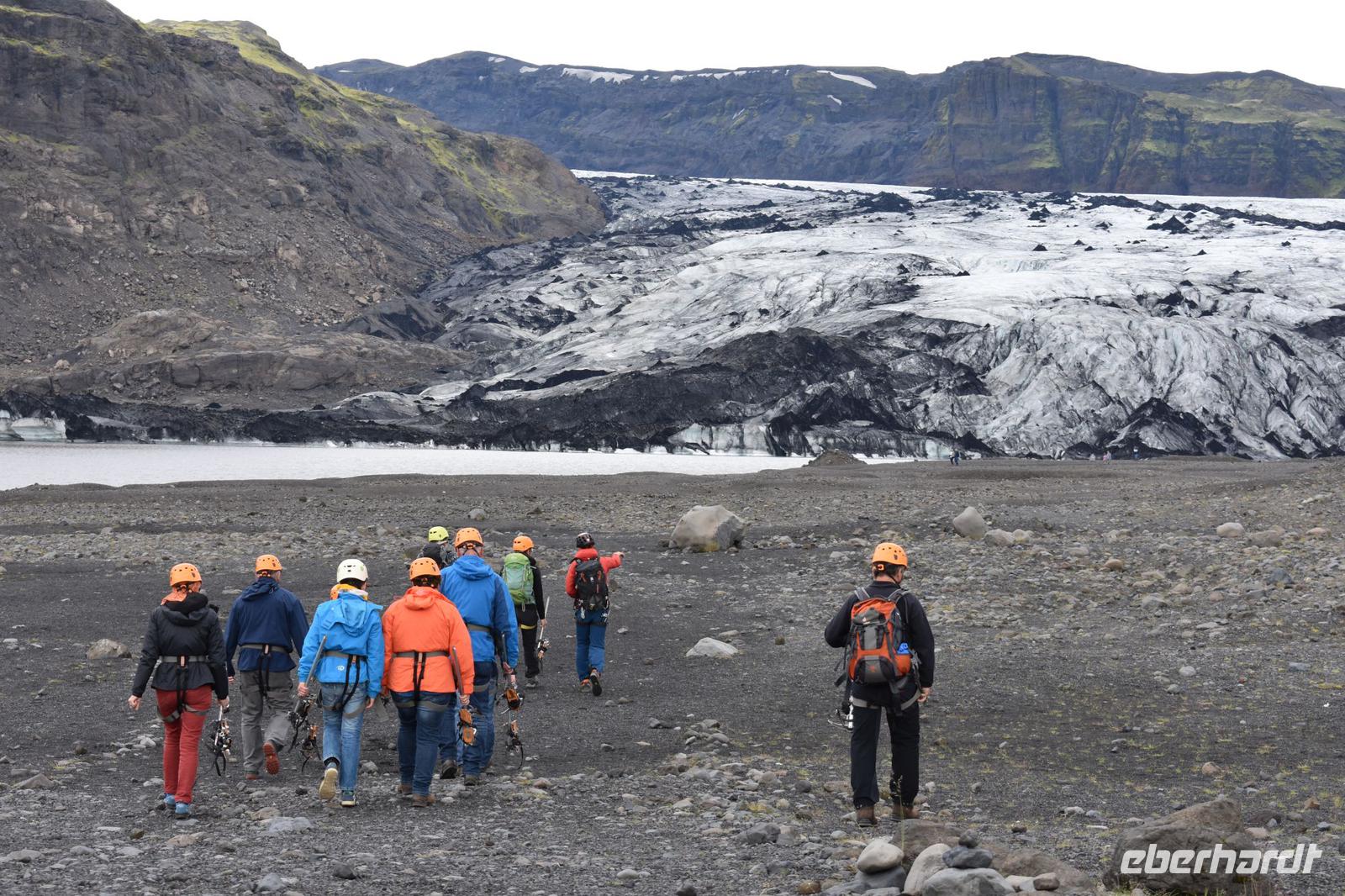 Dann setzten wir unseren Naturerlebnis-Urlaub fort und fuhren zum Fuße des Sólheimajökull. Dort angekommen mussten wir unsere Ausrüstung erweitern. Wir legten den Klettergurt an, passten unsere Helme an, richteten die Steigeisen ein und schnappten unseren Eispickel. Dann ging es durch den Kies zum Gletscher. Die Montage der Steigeisen unter unseren Füßen war gar nicht so einfach, gelang dann aber doch. Dann ging es ins Eis! Mann musste schon etwas fester auftreten, damit die Spikes sich auch im Eis verkrallen konnten. Nach ein paar vorsichtigen Schritten wurde es allmählig immer besser. Auf dem Rückweg dann eine kleine Unachtsamkeit! Man stürzte schneller als man gucken konnte. Zwei von uns hat es auf das Eis geschmettert und sie trugen ein paar schmerzhafte Verletzungen davon. Schürfwunden, Blutungen, zahlreiche blaue Flecke, ein angeschwollenes Knie und ein verknackster Knöchel waren die Folgen. Glücklicherweise waren die beiden hart im nehmen und schafften es nach kurzer, erster Versorgung, mit Unterstützung vom Gletscher hinunter. Doch die Folgen des Sturzes sind mit Sicherheit noch ein paar Monate zu spüren.