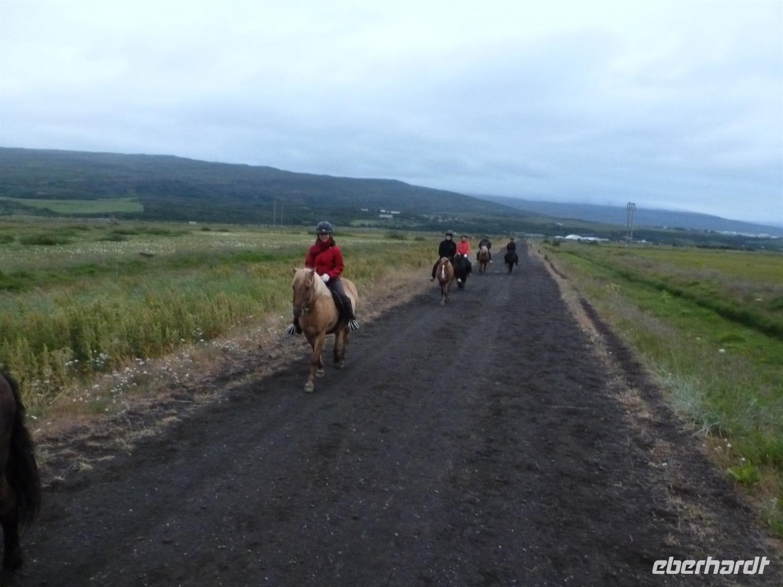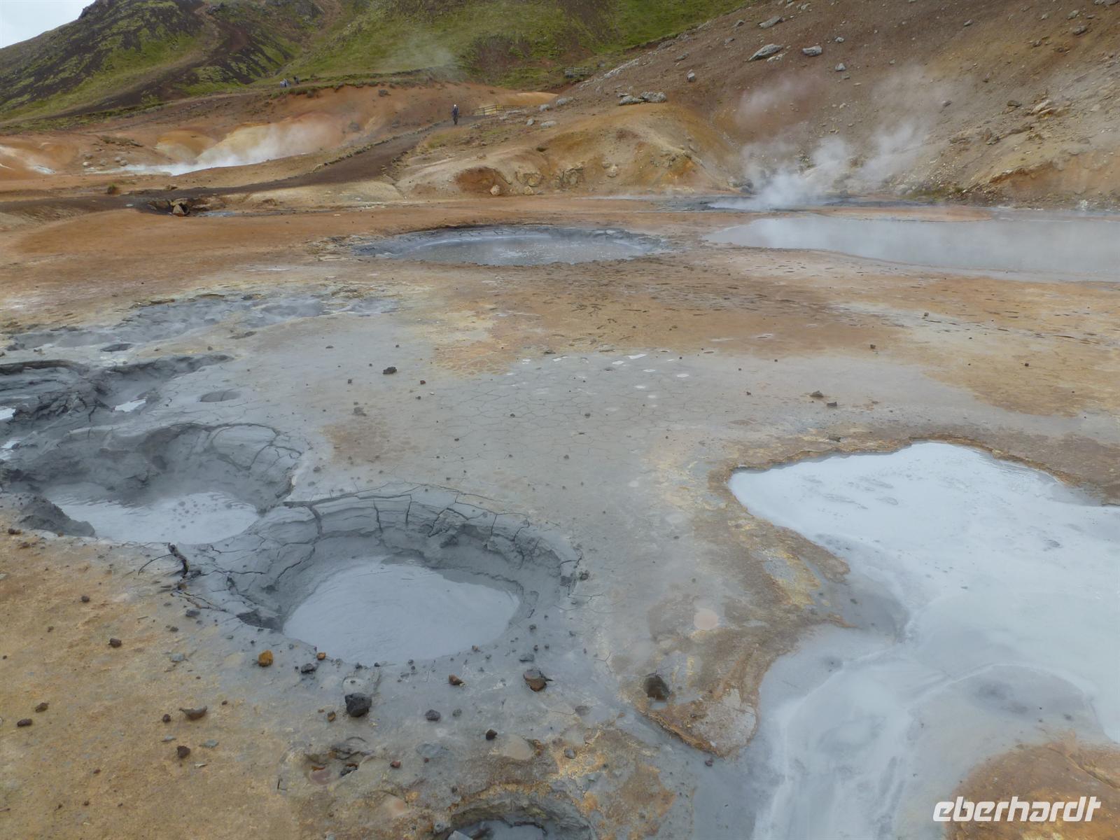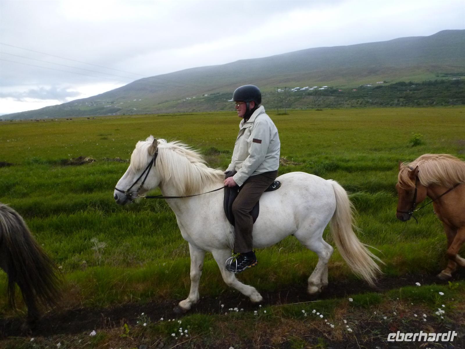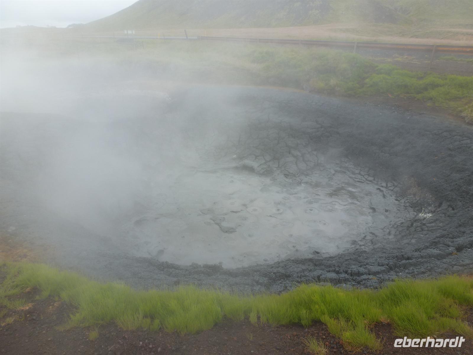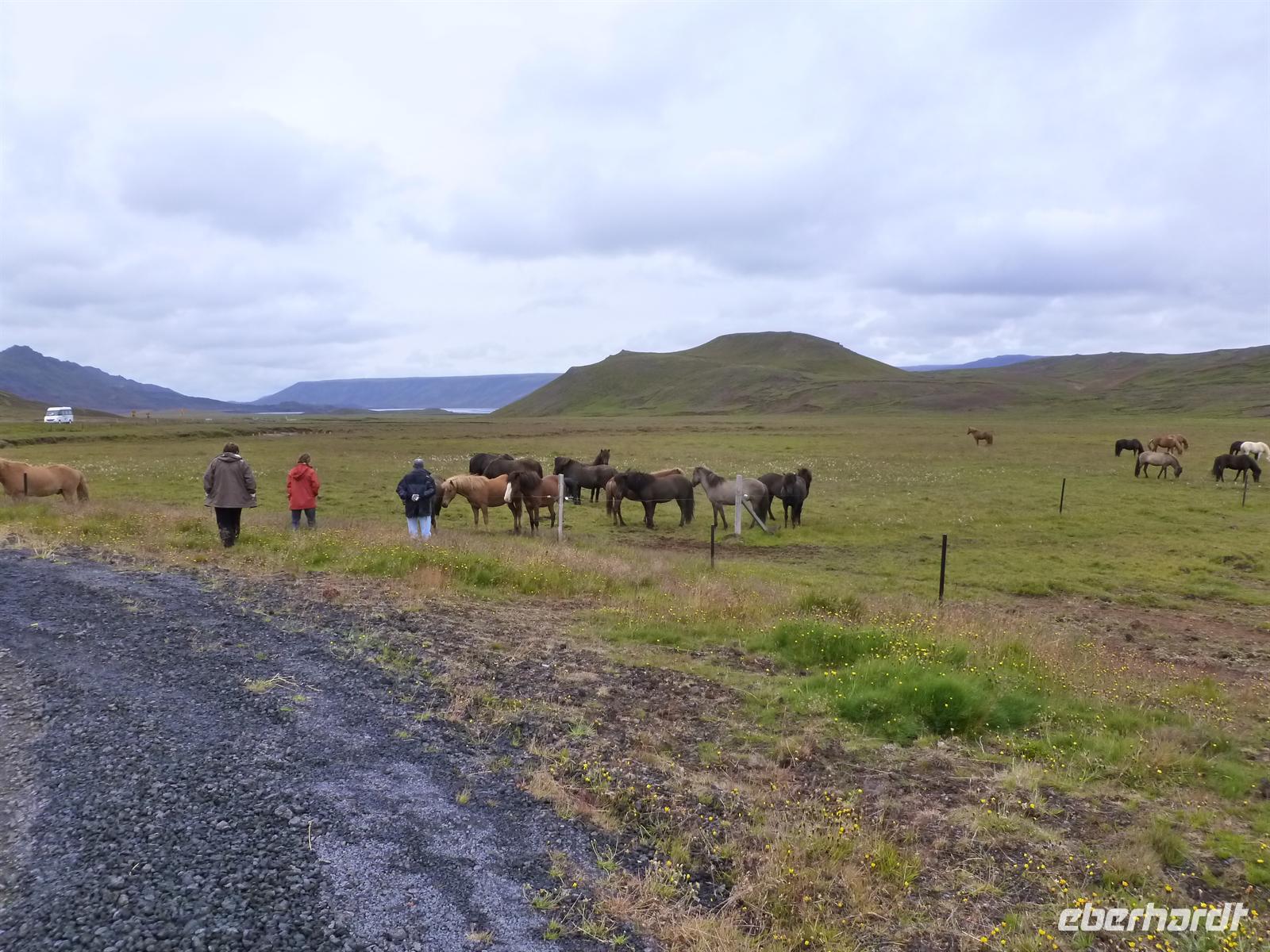 Heute erwarteten uns viele Höhepunkte: Als erstes sind wir am Vormittag zum erst vor 28 Jahren ausgebrochenen Vulkan Krafla gefahren und sind durch das so junge spektakuläre Lavafeld gewandert, wo es an vielen Stellen immer noch gedampft hat. Es war so faszinierend und wir haben auch schon die ersten brodelnden Schwefel-Schlammtöpfe gesehen. Nachher ging es weiter zu einem riesengroßen Krater eines Vulkans, welcher im Jahre 1726 ausgebrochen ist und jetzt mit Wasser gefüllt ist. Und dann fuhren wir durch diese bizarre Vulkanlandschaft mit den vielen dampfenden Stellen und einem großen Thermalkraftwerk zu den „Schlammtöpfen“ - da brodelt wirklich der Schlamm an so vielen Stellen und es zischt aus der Erde - wir waren erstaunt über soviel Aktivität in unserer Erde. Mit ziemlich schlammigen Schuhen ging es weiter zum Naturbad Myvatn. Hier machten wir eine lange Mittagspause und viele Gäste genossen ein Bad im heißen Thermalwasser - es war traumhaft in dem schönen warmen Wasser unter freiem Himmel zu baden! Aber schließlich mussten wir weiter den der „Trollpark“ Dimmuborgir wartete auf uns - diese vielen meterhohen Felsen treten alle wie kleine Trolle aus der vulkanischen Erde hervor und lassen diese Landschaft wie ein Trollpark aussehen - dieser kleine Spaziergang wurde durch ein kleines Trompetenkonzert von unserem tollen Guide Snorri perfektioniert - da konnte uns selbst der Regen nichts abhaben. Als vorletzer Stopp kam im Anschluss die kleine Halbinsel in Myvatn See mit den Pseudokratern - auch hier war es wunderschön und die Sonne kam auch wieder raus. Diese Krater sind entstanden als heiße Lava in den See gelaufen ist und das Wasser eingeschlossen hat und dieses dann aufgrund der Hitze „explodiert“ ist und der Dampf mit hohem Druckentflohen ist und so diese Krater gebildet hat. Ja und nun war unser Tag inmitten der brodelnden aktiven Vulkanlandschaft im Norden Islands schon fast vorbei, bevor wir auf dem Heimweg noch den beeindruckenden Wasserfall Godafoss besuchten und ein paar schöne Bilder am „Götterwasserfall“ machten. Schließlich erreichten wir am Abend wieder unser Hotel des Vortages und verbrachten einen tollen Abend im Restaurant Rob 23, wo wir mit leckeren Fischköstlichkeiten verwöhnt wurden. Den Abend rundete für die meisten Gäste ein abendlicher Ausritt mit den bekannten Islandpferden ab. Wir waren ganz schön aufgeregt vor diesem Ausflug, aber die Tiere waren brav und sind mit uns am Fluß entlang geritten und so konnten wir diese wunderbare Landschaft vom Pferd aus genießen!