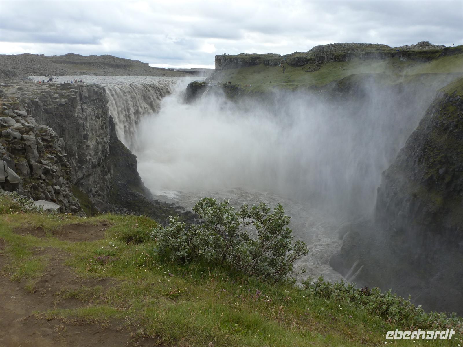 In dem Ort dreht sich alles ums Whale watching - wir beobachteten all die Boote die in die Bucht des Eyjafjoerdur rausfuhren um die „Giganten der Meere“ zu besuchen. Wir schauten uns das Dörfchen an und fuhren weiter zum nördlichsten Punkt unserer Reise, wo der Wind uns ganz schön um die Nase blies. Wir hatten so gute Sicht dass wir sogar die Insel Grimsey, welche auf dem Polarkreis liegt sehen konnten. Weiter ging es nach Asbyrgi, wo wir die bizarre Felsenschlucht bei einem Spaziergang erkundeten und Snorri diesen Ausflug mit einem Trompetenaufritt inmitten der gigantischen Schlucht perfekt machte. Das war ein wunderbarer Klang vor den Echofelsen - wie schön! Wir machten nach dem Spaziergang eine kleine Mittagspause ganz in der Nähe an einer Raststätte, bevor wir durch karges Hochland weiter in Richtung Dettifoss fuhren. Und dann waren wir da - an dem mächtigsten Wasserfall Europas! Und es war wirklich unglaublich, Wassermassen des Gletscherflusses stürzten in die Tiefe und wir waren ganz nah dabei! Wahnsinn! Am Nachmittag fuhren wir dann immer weiter durch diese „Mondlandschaft“ auf Geröllstraßen zum höchstgelegenen Bauernhof Islands und ließen uns dort die leckeren Waffeln schmecken und erfreuten uns an den Fuchsbabys und dem Lämmchen im Garten! Nach dieser Rast stoppten wir bei einer starken Briese am „schönsten Ort Islands“ mit einem tollen Blick auf diese wirklich karge aber wunderschöne Landschaft im Hochland auf circa 500 Meter Höhe, bevor wir schließlich wieder die Ringstraße Nr. 1 erreichten und die Schotterpiste hinter uns ließen. Am Abend erreichten wir unser tolles Hotel in Hallormssadur an der Ostküste - genial gelegen direkt am Lögurinn See mit tollem Buffet am Abend und einem beheizten Pool im Garten mit Blick auf die traumhafte Landschaft mit Wäldern, See und Bergen!