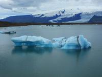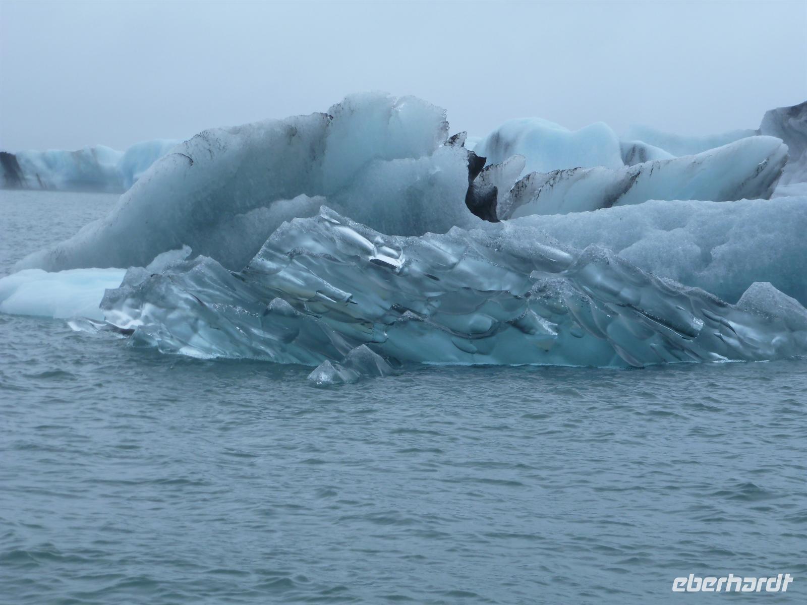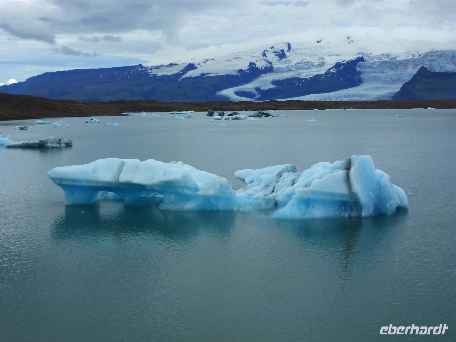 Hier schwimmen riesige Eisbrocken, die von der Gletscherzunge des Breidamerkurjökull (eine Gletscherzunge des Vatnajökull) abgebrochen oder gekalbt sind, in der Lagune. Wir sind mit einem Amphibienfahrzeug, welches gleichzeitig ein Boot ist, durch die Lagune gefahren und haben die Eisbrocken bestaunt. Nachher ging es hoch auf den Gletscher. Wir wurden in einem „Monsterjeep“ - ein sehr komfortabler 4x4 Jeep unterhalb des Gletschers abgeholt und sind über eine Schotterpiste auf den Berg hoch zum Skalafellsjökull gefahren. Dort oben haben wir leider im strömenden Regen Skianzüge, Helm und Stiefel bekommen und sind dann mit Motorschlitten raus auf den Gletscher.